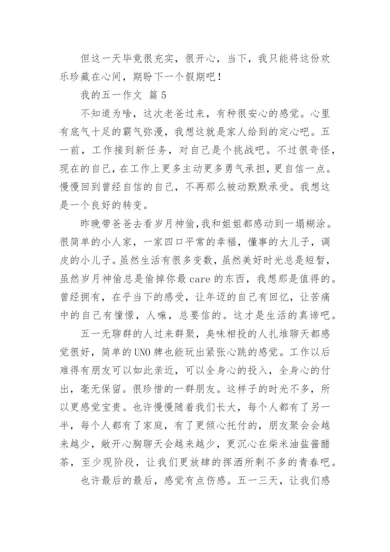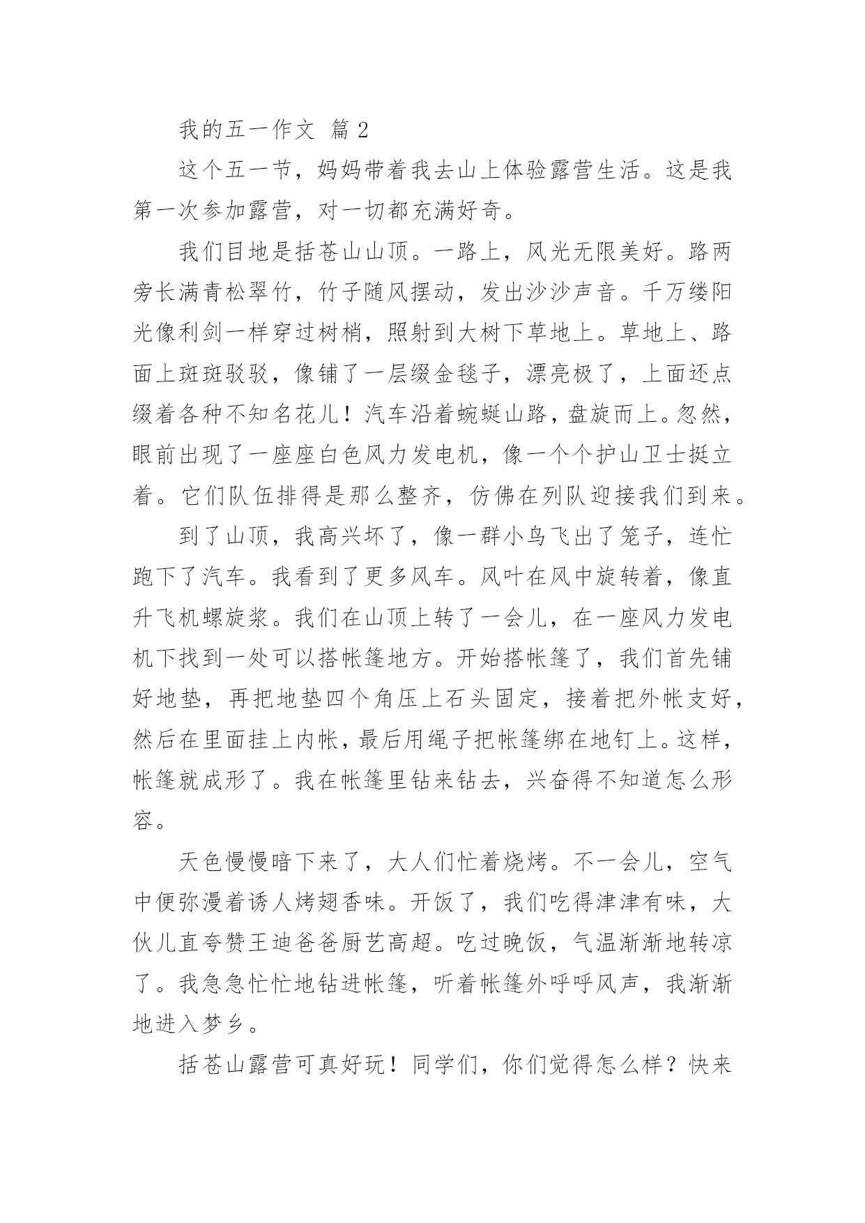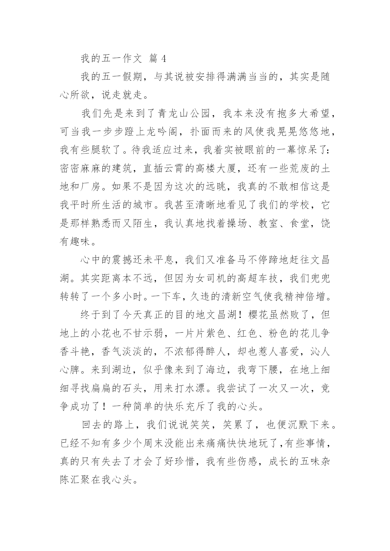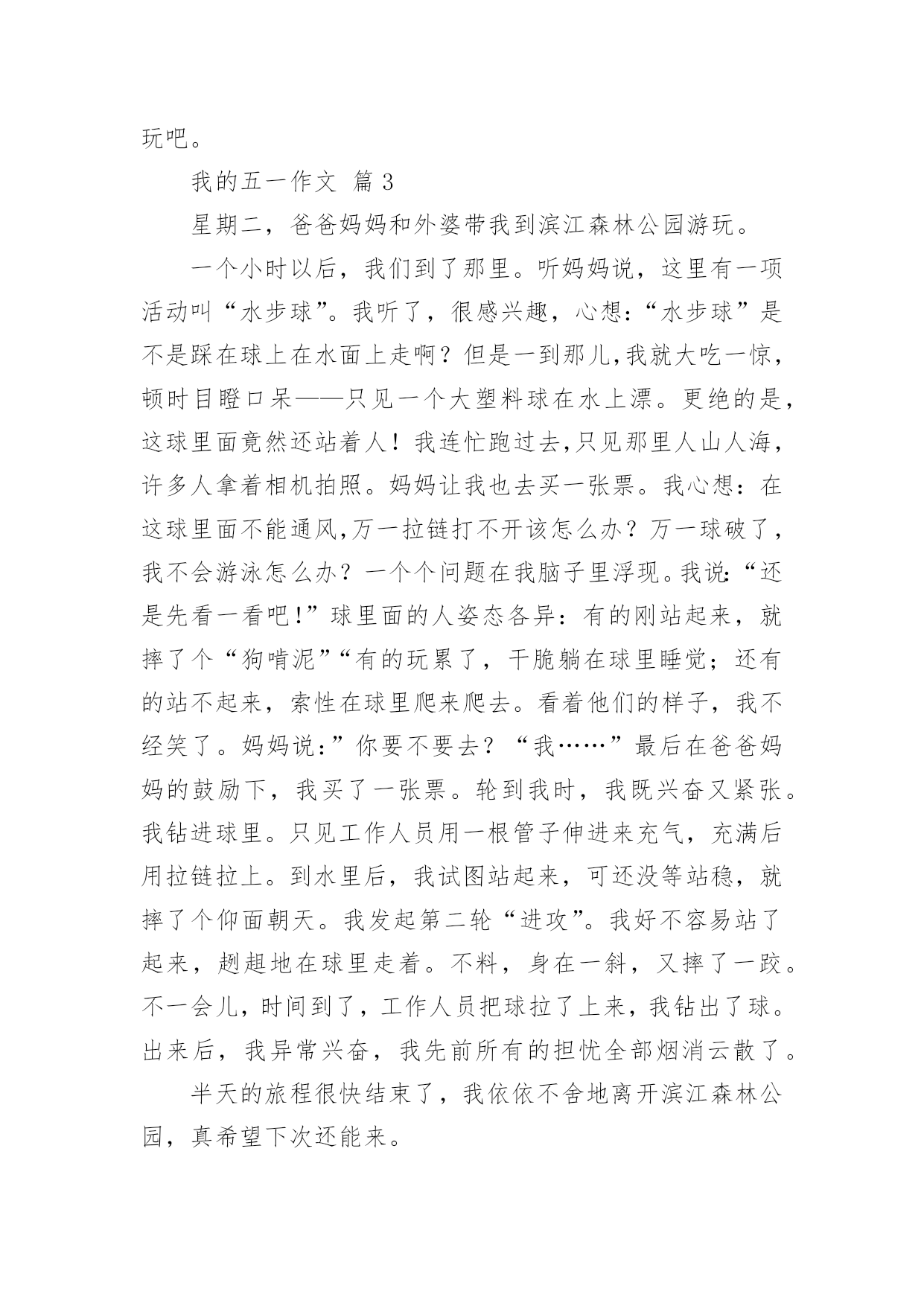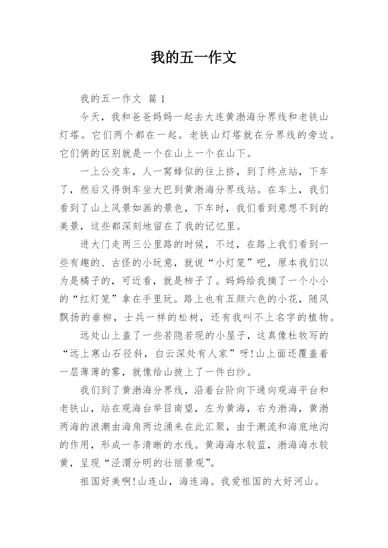 我的五一作文 我的五一作文篇1今天,我和爸爸妈妈一起去大连黄渤海分界线和老铁山灯塔。它们两个都在一起。老铁山灯塔就在分界线的旁边。它们俩的区别就是一个在山上一个在山下。一上公交车,人一窝蜂似的往上挤,到了终点站,下车了,然后又得倒车坐大巴到黄渤海分界线站。在车上,我们看到了山上风景如画的景色,下车时,我们看到意想不到的美景,这些都深刻地留在了我的记忆里。进大门走两三公里路的时候,不过,在路上我们看到一些有趣的、古怪的小玩意,就说“小灯笼”吧,原本我们以为是橘子的,可近看,就是柿子了。妈妈给我摘了一个小小的“红灯笼”拿在手里玩。路上也有五颜六色的小花,随风飘扬的垂柳,士兵一样的松树,还有我叫不上名字的植物。远处山上盖了一些若隐若现的小屋子,这真像杜牧写的“远上寒山石径斜,白云深处有人家”呀!山上面还覆盖着一层薄薄的雾,就像给山披上了一件白纱。我们到了黄渤海分界线,沿着台阶向下通向观海平台和老铁山,站在观海台举目南望,左为黄海,右为渤海,黄渤两海的浪潮由海角两边涌来在此汇聚,由于潮流和海底地沟的作用,形成一条清晰的水线。黄海海水较蓝,渤海海水较黄,呈现“泾渭分明的壮丽景观”。祖国好美啊!山连山,海连海。我爱祖国的大好河山。我的五一作文篇2这个五一节,妈妈带着我去山上体验露营生活。这是我第一次参加露营,对一切都充满好奇。我们目地是括苍山山顶。一路上,风光无限美好。路两旁长满青松翠竹,竹子随风摆动,发出沙沙声音。千万缕阳光像利剑一样穿过树梢,照射到大树下草地上。草地上、路面上斑斑驳驳,像铺了一层缀金毯子,漂亮极了,上面还点缀着各种不知名花儿!汽车沿着蜿蜒山路,盘旋而上。忽然,眼前出现了一座座白色风力发电机,像一个个护山卫士挺立着。它们队伍排得是那么整齐,仿佛在列队迎接我们到来。到了山顶,我高兴坏了,像一群小鸟飞出了笼子,连忙跑下了汽车。我看到了更多风车。风叶在风中旋转着,像直升飞机螺旋浆。我们在山顶上转了一会儿,在一座风力发电机下找到一处可以搭帐篷地方。开始搭帐篷了,我们首先铺好地垫,再把地垫四个角压上石头固定,接着把外帐支好,然后在里面挂上内帐,最后用绳子把帐篷绑在地钉上。这样,帐篷就成形了。我在帐篷里钻来钻去,兴奋得不知道怎么形容。天色慢慢暗下来了,大人们忙着烧烤。不一会儿,空气中便弥漫着诱人烤翅香味。开饭了,我们吃得津津有味,大伙儿直夸赞王迪爸爸厨艺高超。吃过晚饭,气温渐渐地转凉了。我急急忙忙地钻进帐篷,听着帐篷外呼呼风声,我渐渐地进入梦乡。括苍山露营可真好玩!同学们,你们觉得怎么样?快来玩吧。我的五一作文篇3星期二,爸爸妈妈和外婆带我到滨江森林公园游玩。一个小时以后,我们到了那里。听妈妈说,这里有一项活动叫“水步球”。我听了,很感兴趣,心想:“水步球”是不是踩在球上在水面上走啊?但是一到那儿,我就大吃一惊,顿时目瞪口呆——只见一个大塑料球在水上漂。更绝的是,这球里面竟然还站着人!我连忙跑过去,只见那里人山人海,许多人拿着相机拍照。妈妈让我也去买一张票。我心想:在这球里面不能通风,万一拉链打不开该怎么办?万一球破了,我不会游泳怎么办?一个个问题在我脑子里浮现。我说:“还是先看一看吧!”球里面的人姿态各异:有的刚站起来,就摔了个“狗啃泥”“有的玩累了,干脆躺在球里睡觉;还有的站不起来,索性在球里爬来爬去。看着他们的样子,我不经笑了。妈妈说:”你要不要去?“我……”最后在爸爸妈妈的鼓励下,我买了一张票。轮到我时,我既兴奋又紧张。我钻进球里。只见工作人员用一根管子伸进来充气,充满后用拉链拉上。到水里后,我试图站起来,可还没等站稳,就摔了个仰面朝天。我发起第二轮“进攻”。我好不容易站了起来,趔趄地在球里走着。不料,身在一斜,又摔了一跤。不一会儿,时间到了,工作人员把球拉了上来,我钻出了球。出来后,我异常兴奋,我先前所有的担忧全部烟消云散了。半天的旅程很快结束了,我依依不舍地离开滨江森林公园,真希望下次还能来。我的五一作文篇4我的五一假期,与其说被安排得满满当当的,其实是随心所欲,说走就走。我们先是来到了青龙山公园,我本来没有抱多大希望,可当我一步步蹬上龙吟阁,扑面而来的风使我晃晃悠悠地,我有些腿软了。待我适应过来,我着实被眼前的一幕惊呆了:密密麻麻的建筑,直插云霄的高楼大厦,还有一些荒废的土地和厂房。如果不是因为这次的远眺,我真的不敢相信这是我平时所生活的城市。我甚至清晰地看见了我们的学校,它是那样熟悉而又陌生,我认真地找着操场、教室、食堂,饶有趣味。心中的震撼还未平息,我们又准备马不停蹄地赶往文昌湖。其实距离本不远,但因为女司机的高超车技,我们兜兜转转了一个多小时。一下车,久违的清新空气使我精神倍增。终于到了今天真正的目的地文昌湖!樱花虽然败了,但地上的小花也不甘示弱,一片片紫色、红色、粉色的花儿争香斗艳,香气淡淡的,不浓郁得醉人,