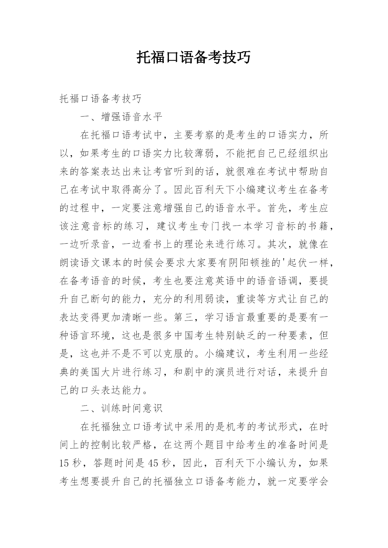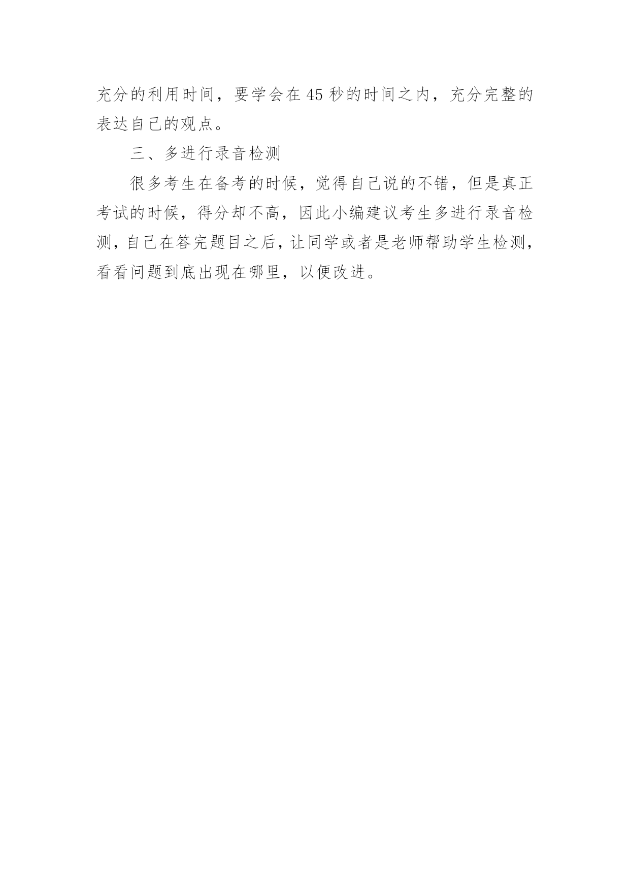 托福口语备考技巧 托福口语备考技巧一、增强语音水平在托福口语考试中,主要考察的是考生的口语实力,所以,如果考生的口语实力比较薄弱,不能把自己已经组织出来的答案表达出来让考官听到的话,就很难在考试中帮助自己在考试中取得高分了。因此百利天下小编建议考生在备考的过程中,一定要注意增强自己的语音水平。首先,考生应该注意音标的练习,建议考生专门找一本学习音标的书籍,一边听录音,一边看书上的理论来进行练习。其次,就像在朗读语文课本的时候会要求大家要有阴阳顿挫的'起伏一样,在备考语音的时候,考生也要注意英语中的语音语调,要提升自己断句的能力,充分的利用弱读,重读等方式让自己的表达变得更加清晰一些。第三,学习语言最重要的是要有一种语言环境,这也是很多中国考生特别缺乏的一种要素,但是,这也并不是不可以克服的。小编建议,考生利用一些经典的美国大片进行练习,和剧中的演员进行对话,来提升自己的口头表达能力。二、训练时间意识在托福独立口语考试中采用的是机考的考试形式,在时间上的控制比较严格,在这两个题目中给考生的准备时间是15秒,答题时间是45秒,因此,百利天下小编认为,如果考生想要提升自己的托福独立口语备考能力,就一定要学会充分的利用时间,要学会在45秒的时间之内,充分完整的表达自己的观点。三、多进行录音检测很多考生在备考的时候,觉得自己说的不错,但是真正考试的时候,得分却不高,因此小编建议考生多进行录音检测,自己在答完题目之后,让同学或者是老师帮助学生检测,看看问题到底出现在哪里,以便改进。