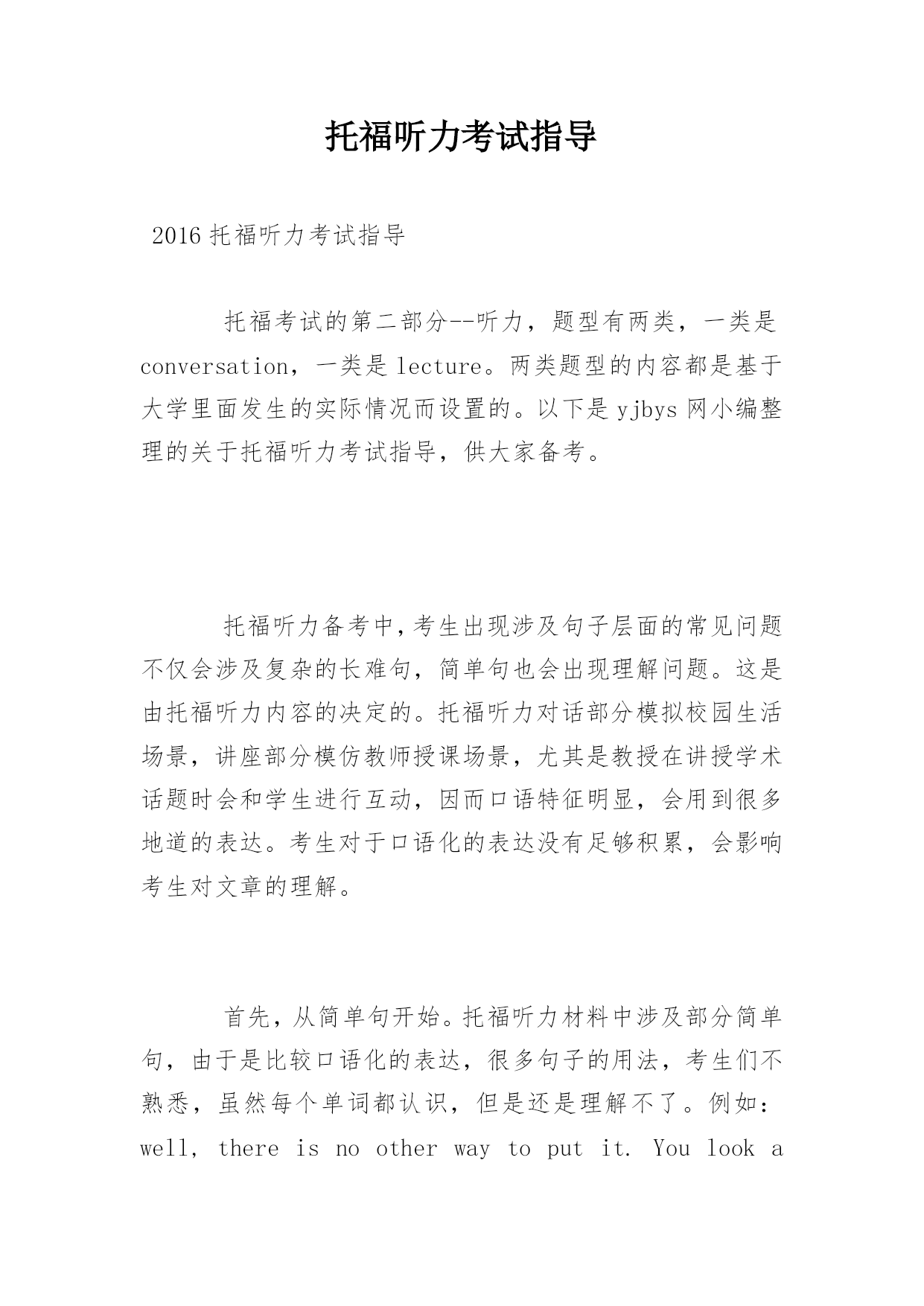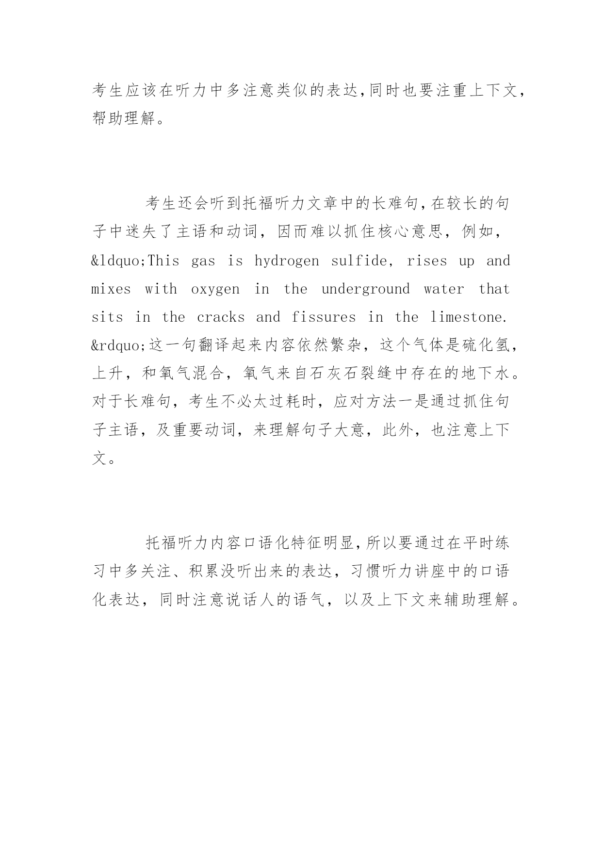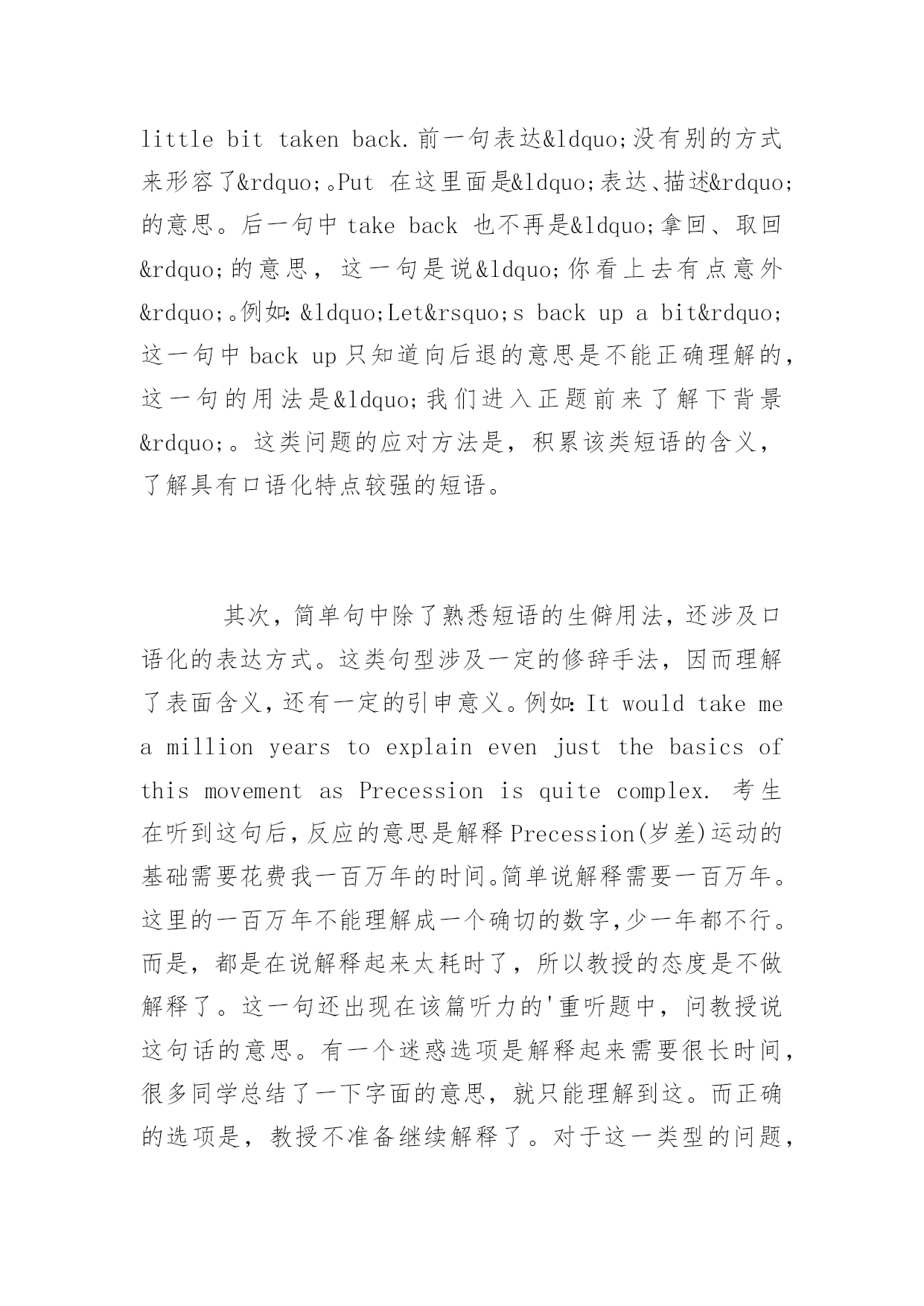 托福听力考试指导 2016托福听力考试指导 托福考试的第二部分--听力,题型有两类,一类是conversation,一类是lecture。两类题型的内容都是基于大学里面发生的实际情况而设置的。以下是yjbys网小编整理的关于托福听力考试指导,供大家备考。 托福听力备考中,考生出现涉及句子层面的常见问题不仅会涉及复杂的长难句,简单句也会出现理解问题。这是由托福听力内容的决定的。托福听力对话部分模拟校园生活场景,讲座部分模仿教师授课场景,尤其是教授在讲授学术话题时会和学生进行互动,因而口语特征明显,会用到很多地道的表达。考生对于口语化的表达没有足够积累,会影响考生对文章的理解。 首先,从简单句开始。托福听力材料中涉及部分简单句,由于是比较口语化的表达,很多句子的用法,考生们不熟悉,虽然每个单词都认识,但是还是理解不了。例如:well,thereisnootherwaytoputit.Youlookalittlebittakenback.前一句表达“没有别的方式来形容了”。Put在这里面是“表达、描述”的意思。后一句中takeback也不再是“拿回、取回”的意思,这一句是说“你看上去有点意外”。例如:“Let’sbackupabit”这一句中backup只知道向后退的意思是不能正确理解的,这一句的用法是“我们进入正题前来了解下背景”。这类问题的应对方法是,积累该类短语的含义,了解具有口语化特点较强的短语。 其次,简单句中除了熟悉短语的生僻用法,还涉及口语化的表达方式。这类句型涉及一定的修辞手法,因而理解了表面含义,还有一定的引申意义。例如:ItwouldtakemeamillionyearstoexplainevenjustthebasicsofthismovementasPrecessionisquitecomplex.考生在听到这句后,反应的意思是解释Precession(岁差)运动的基础需要花费我一百万年的时间。简单说解释需要一百万年。这里的一百万年不能理解成一个确切的数字,少一年都不行。而是,都是在说解释起来太耗时了,所以教授的态度是不做解释了。这一句还出现在该篇听力的'重听题中,问教授说这句话的意思。有一个迷惑选项是解释起来需要很长时间,很多同学总结了一下字面的意思,就只能理解到这。而正确的选项是,教授不准备继续解释了。对于这一类型的问题,考生应该在听力中多注意类似的表达,同时也要注重上下文,帮助理解。 考生还会听到托福听力文章中的长难句,在较长的句子中迷失了主语和动词,因而难以抓住核心意思,例如,“Thisgasishydrogensulfide,risesupandmixeswithoxygenintheundergroundwaterthatsitsinthecracksandfissuresinthelimestone.”这一句翻译起来内容依然繁杂,这个气体是硫化氢,上升,和氧气混合,氧气来自石灰石裂缝中存在的地下水。对于长难句,考生不必太过耗时,应对方法一是通过抓住句子主语,及重要动词,来理解句子大意,此外,也注意上下文。 托福听力内容口语化特征明显,所以要通过在平时练习中多关注、积累没听出来的表达,习惯听力讲座中的口语化表达,同时注意说话人的语气,以及上下文来辅助理解。