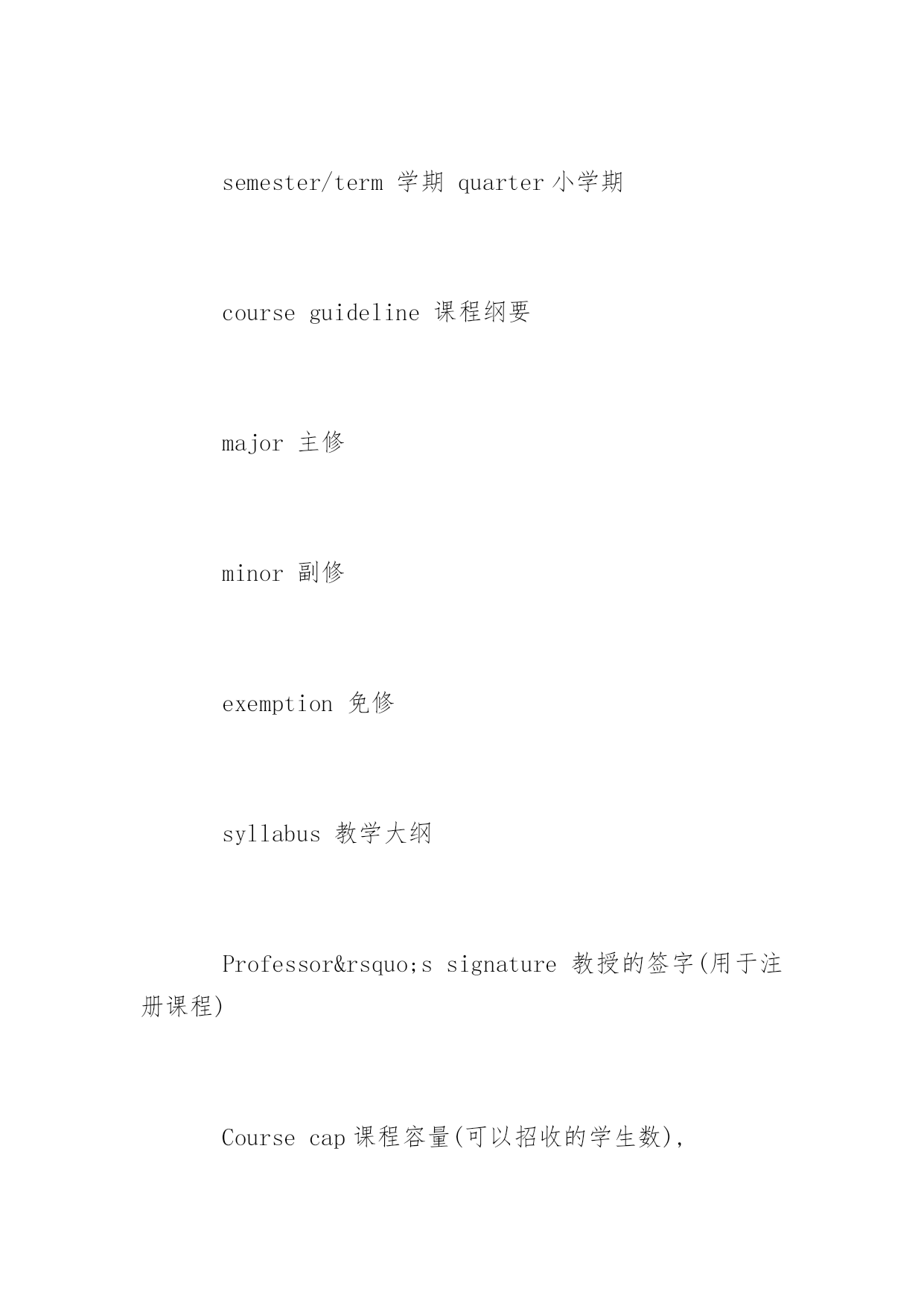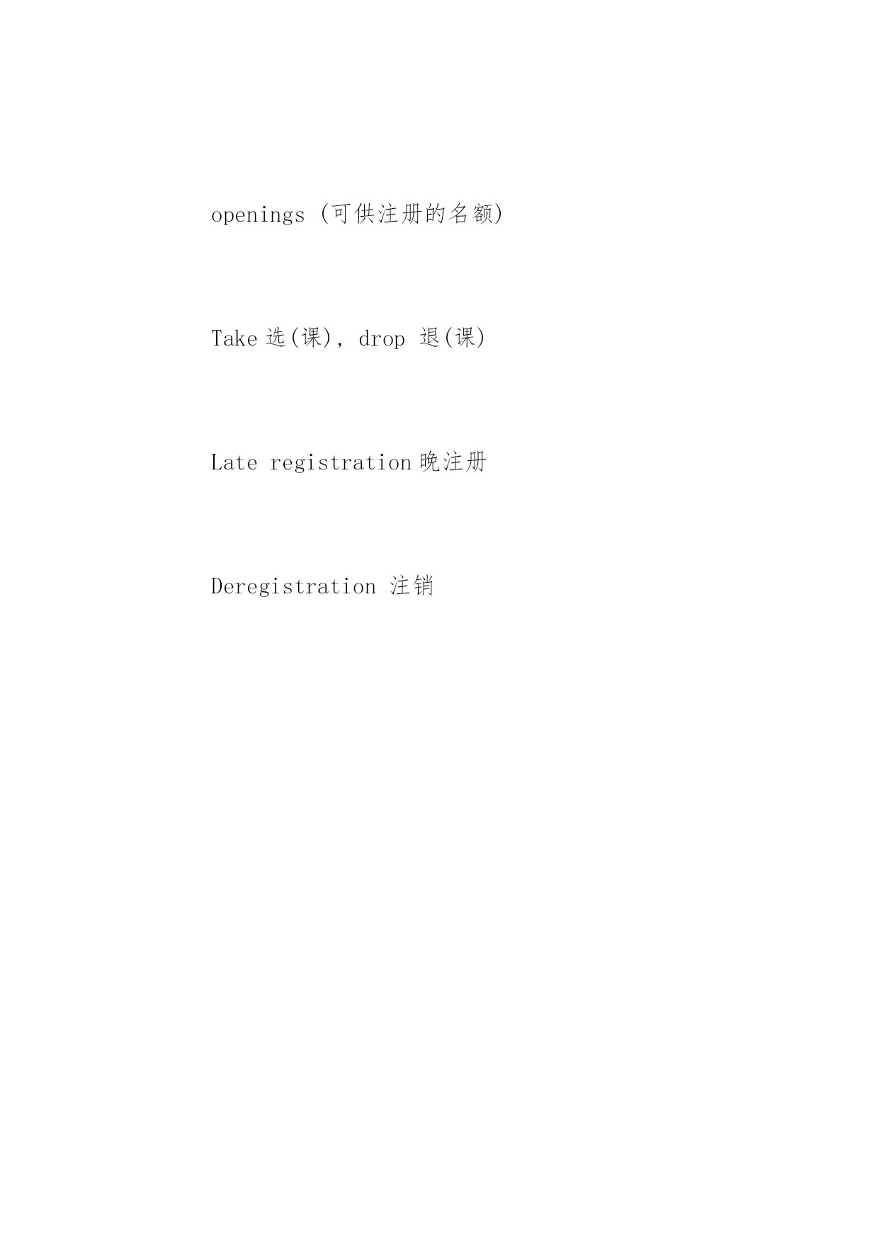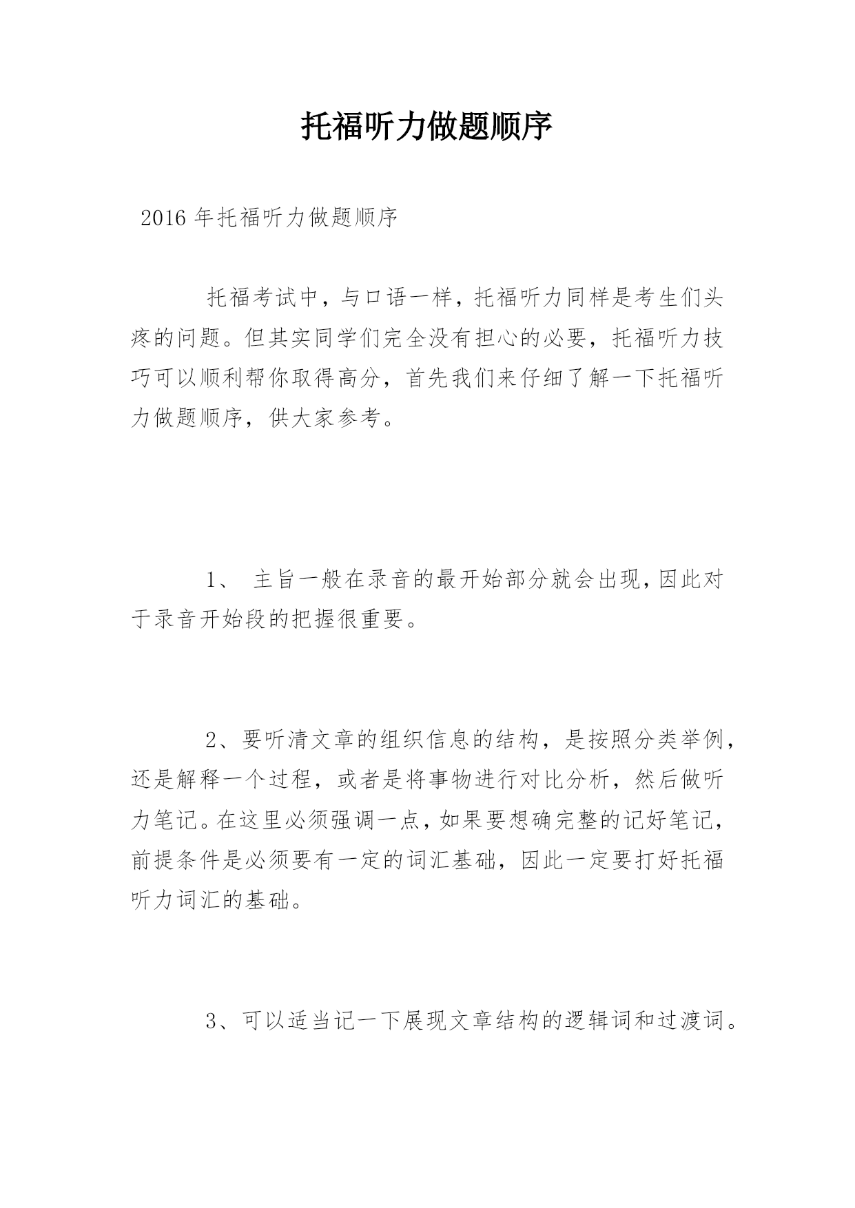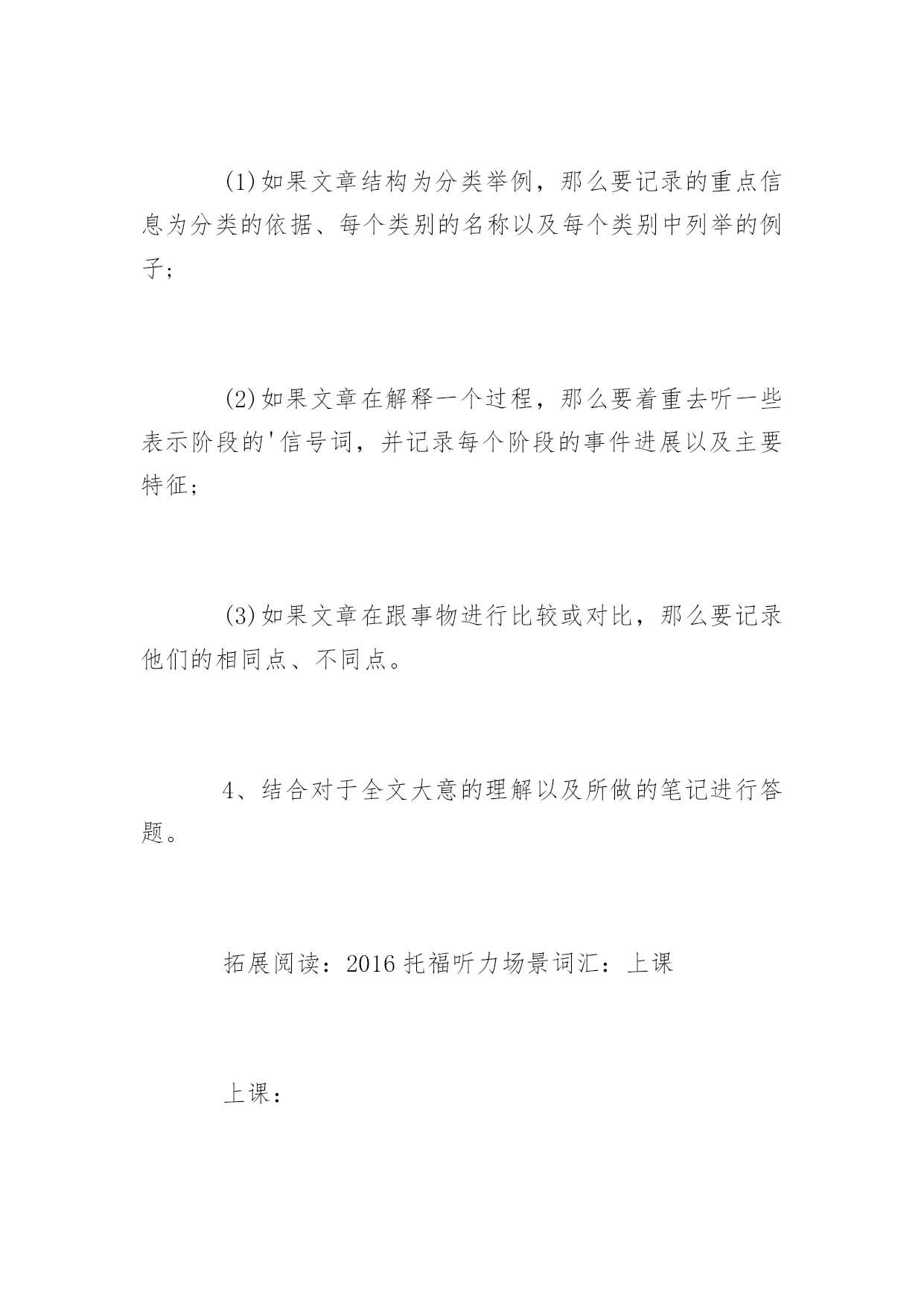 托福听力做题顺序 2016年托福听力做题顺序 托福考试中,与口语一样,托福听力同样是考生们头疼的问题。但其实同学们完全没有担心的必要,托福听力技巧可以顺利帮你取得高分,首先我们来仔细了解一下托福听力做题顺序,供大家参考。 1、主旨一般在录音的最开始部分就会出现,因此对于录音开始段的把握很重要。 2、要听清文章的组织信息的结构,是按照分类举例,还是解释一个过程,或者是将事物进行对比分析,然后做听力笔记。在这里必须强调一点,如果要想确完整的记好笔记,前提条件是必须要有一定的词汇基础,因此一定要打好托福听力词汇的基础。 3、可以适当记一下展现文章结构的逻辑词和过渡词。 (1)如果文章结构为分类举例,那么要记录的重点信息为分类的依据、每个类别的名称以及每个类别中列举的例子; (2)如果文章在解释一个过程,那么要着重去听一些表示阶段的'信号词,并记录每个阶段的事件进展以及主要特征; (3)如果文章在跟事物进行比较或对比,那么要记录他们的相同点、不同点。 4、结合对于全文大意的理解以及所做的笔记进行答题。 拓展阅读:2016托福听力场景词汇:上课 上课: Attendclass上课 Missclass缺课 Skipclass逃课 Syllabus教学大纲 Requiredtextbook要求的课本 Attendance出勤 Gradingsystem打分体系 Classparticipation课堂参与 semester/term学期quarter小学期 courseguideline课程纲要 major主修 minor副修 exemption免修 syllabus教学大纲 Professor’ssignature教授的签字(用于注册课程) Coursecap课程容量(可以招收的学生数), openings(可供注册的名额) Take选(课),drop退(课) Lateregistration晚注册 Deregistration注销