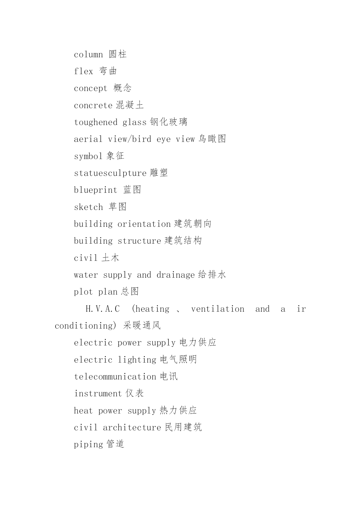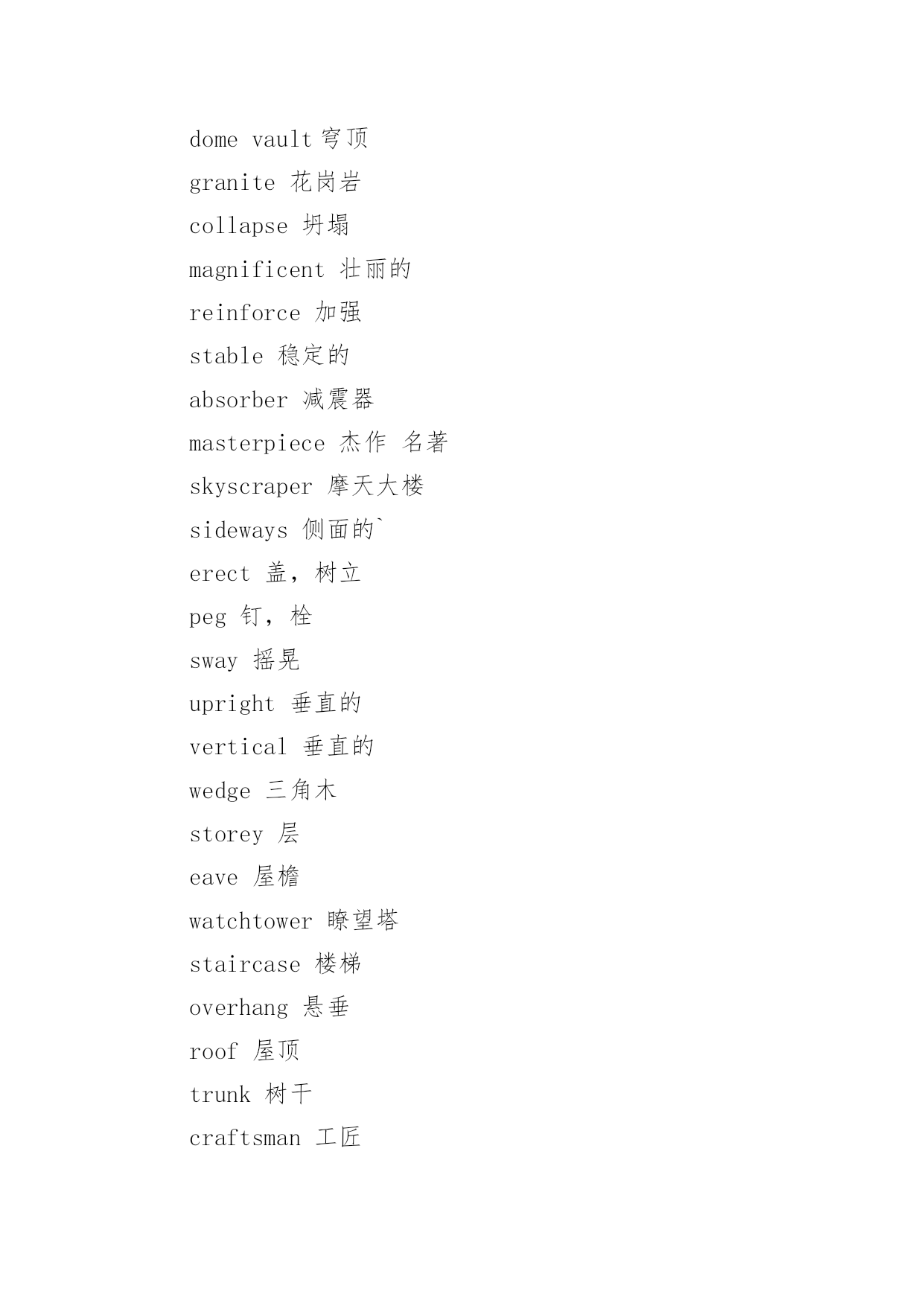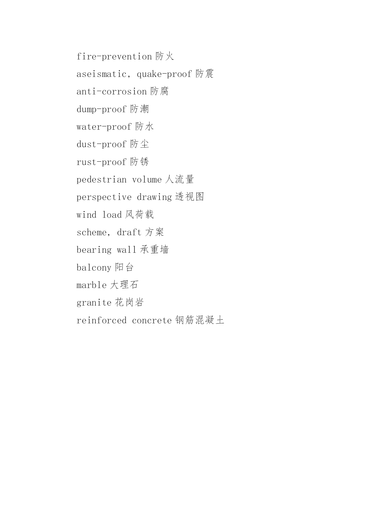 托福建筑学词汇 托福建筑学词汇architect建筑师architecture建筑学arch拱形baroquestyle巴洛克rococostyle洛可可pillarpost柱bartendon钢筋construction建造icon肖像,画像statue雕像dam坝tunnel隧道pyramid金字塔canyon、gorge峡谷monument纪念碑church教堂abbey教堂landmark路标里程碑suspensionbridge悬浮桥beam梁domevault穹顶granite花岗岩collapse坍塌magnificent壮丽的reinforce加强stable稳定的absorber减震器masterpiece杰作名著skyscraper摩天大楼sideways侧面的`erect盖,树立peg钉,栓sway摇晃upright垂直的vertical垂直的wedge三角木storey层eave屋檐watchtower瞭望塔staircase楼梯overhang悬垂roof屋顶trunk树干craftsman工匠column圆柱flex弯曲concept概念concrete混凝土toughenedglass钢化玻璃aerialview/birdeyeview鸟瞰图symbol象征statuesculpture雕塑blueprint蓝图sketch草图buildingorientation建筑朝向buildingstructure建筑结构civil土木watersupplyanddrainage给排水plotplan总图H.V.A.C(heating、ventilationandairconditioning)采暖通风electricpowersupply电力供应electriclighting电气照明telecommunication电讯instrument仪表heatpowersupply热力供应civilarchitecture民用建筑piping管道fire-prevention防火aseismatic,quake-proof防震anti-corrosion防腐dump-proof防潮water-proof防水dust-proof防尘rust-proof防锈pedestrianvolume人流量perspectivedrawing透视图windload风荷载scheme,draft方案bearingwall承重墙balcony阳台marble大理石granite花岗岩reinforcedconcrete钢筋混凝土