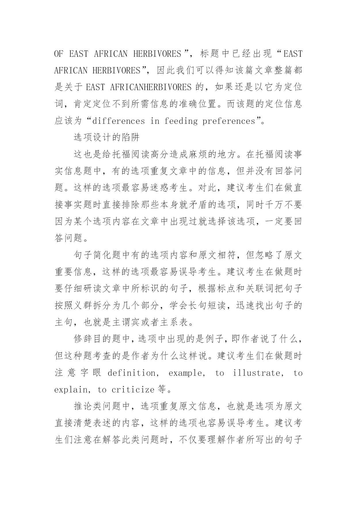 托福阅读陷阱盘点 2017年托福阅读陷阱盘点新托福由四部分组成,分别是阅读(Reading)、听力(Listening)、口试(Speaking)、写作(Writing)。每部分满分30分,整个试题满分120分。以下是yjbys网小编整理的关于托福阅读陷阱盘点,供大家备考。托福阅读词汇题考察词汇生僻义,熟词僻义托福阅读词汇题在每篇托福阅读中出现1-4次,可见这个题型多么重要,一些托福词汇量较高的考生喜欢直接选出题干词的同义词作为最终答案,但是没有考虑词汇的语境含义。这个题目的保险做法是联系上下文解题,只是费力一些。考生为了避免这个答题误区可以在复习中及时整理这类的词,比如“calling”词的常用含义为“呼喊、召唤”,而托福阅读中则可能考到该词的“职业、天职”的含义。欲应对此“陷阱”,建议考生们在选出答案后把答案放回原文进行检验。托福阅读题干陷阱,看错题在托福阅读题目中最容易看错题的是否定事实信息题。在题干中这类题目会出现大写的“NOT”要么会出现大写的“EXCEPT”,如果考生没有看到,由于从三个符号题意的选项中选出一个的难度降低,考生很可能做出错误的选择。比如:Accordingtothepassage,whichofthefollowingisNOTtrueofX?Theauthor’sdeionofXmentionsallofthefollowingEXCEPT而考生们在做题过程中往往会遗忘掉题干中的“NOT”和“EXCEPT”,选出一个和文章内容相符的选项,最终在不知不觉中已经丢掉唾手可得的分数。建议考生考试时一定要细心、镇静,尤其要特别注意这种题型中的“NOT”或“EXCEPT”,并且谨记:这种题目的答案要么是选项内容原文没提到,要么根据原文内容选项是错误的。定位信息不准,浪费答题时间,增加错误率托福阅读题的定位其实不难,但前提是定位信息要选准,也就是定位的.点要对。通常情况下我们优先选择作为定位信息的是:专有名词、术语、物质名词、特殊名称等,但在做题过程中要具体情况具体分析,考生们千万不可以一刀切。如OGPracticeTest2的第七题中题干为“Paragraph2suggeststhatwhichofthefollowingisoneofthemostimportantfactorsindeterminingdifferencesinfeedingpreferencesofEastAfricanherbivores?”该题干中有专有名词“EastAfrican”,如果考生们用该词定位,肯定会导致无法定位到该题对应文章内容的准确位置。无法准确定位,必然耗时,而且影响考试心情。实际上考生们在考试时应该注意该篇文章的标题为“FEEDINGHABITSOFEASTAFRICANHERBIVORES”,标题中已经出现“EASTAFRICANHERBIVORES”,因此我们可以得知该篇文章整篇都是关于EASTAFRICANHERBIVORES的,如果还是以它为定位词,肯定定位不到所需信息的准确位置。而该题的定位信息应该为“differencesinfeedingpreferences”。选项设计的陷阱这也是给托福阅读高分造成麻烦的地方。在托福阅读事实信息题中,有的选项重复文章中的信息,但并没有回答问题。这样的选项最容易迷惑考生。对此,建议考生们在做直接事实题时直接排除那些本身就矛盾的选项,同时千万不要因为某个选项内容在文章中出现过就选择该选项,一定要回答问题。句子简化题中有的选项内容和原文相符,但忽略了原文重要信息,这样的选项最容易误导考生。建议考生在做题时要仔细研读文章中所标识的句子,根据标点和关联词把句子按照义群拆分为几个部分,学会长句短读,迅速找出句子的主句,也就是主谓宾或者主系表。修辞目的题中,选项中出现的是例子,即作者说了什么,但这种题考查的是作者为什么这样说。建议考生们在做题时注意字眼definition,example,toillustrate,toexplain,tocriticize等。推论类问题中,选项重复原文信息,也就是选项为原文直接清楚表述的内容,这样的选项也容易误导考生。建议考生们注意在解答此类问题时,不仅要理解作者所写出的句子的字面意思,还必须搞清楚这些句子之间的逻辑性暗示。正确答案一定是从原文中已经给出的内容推论出来的。