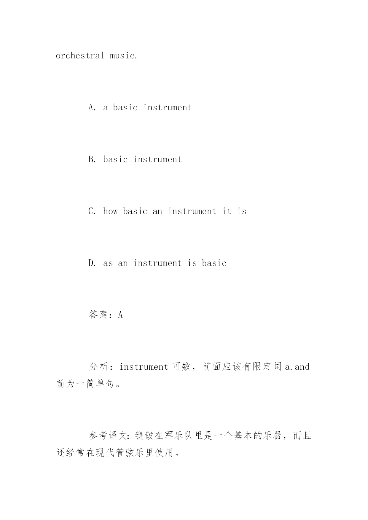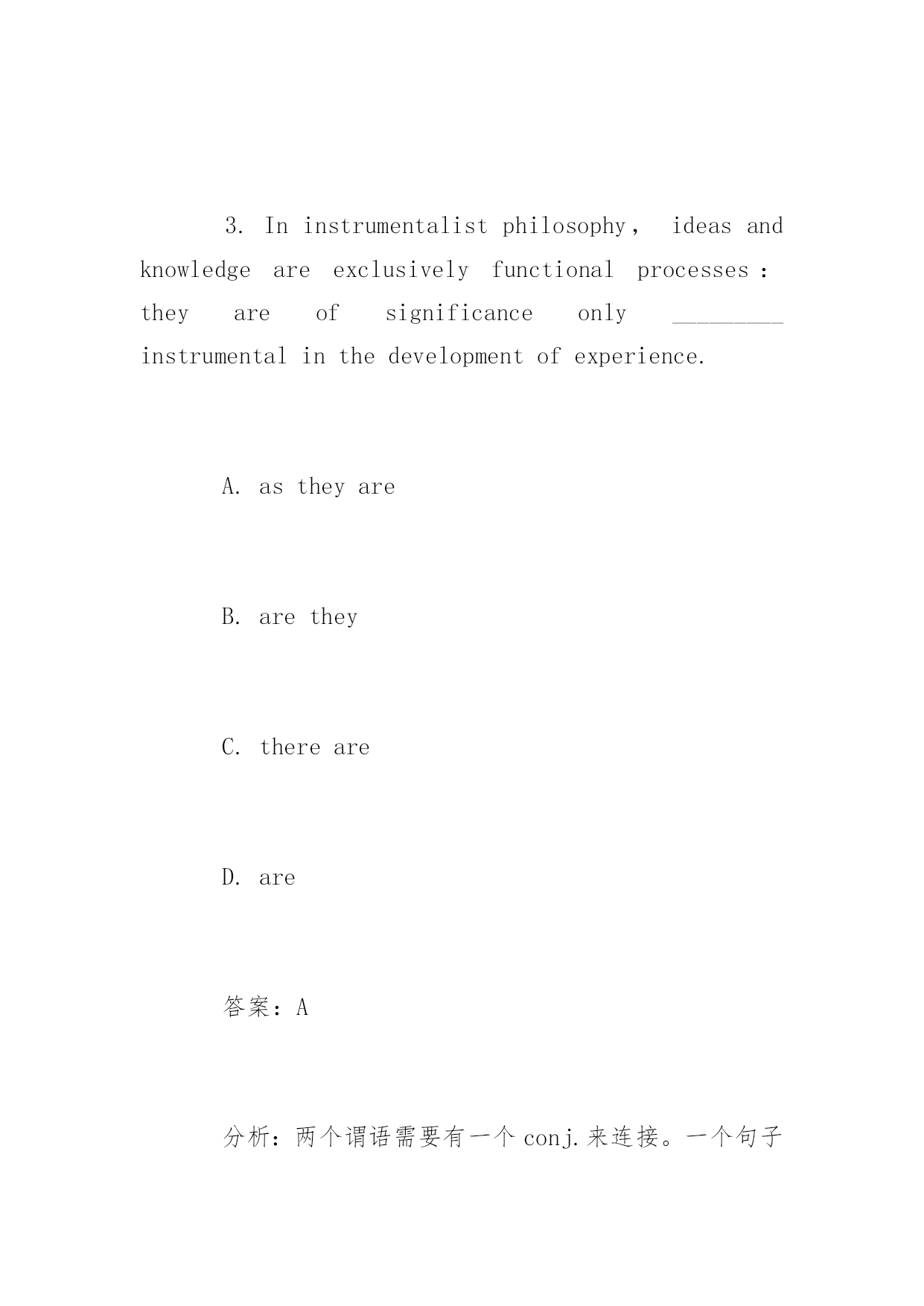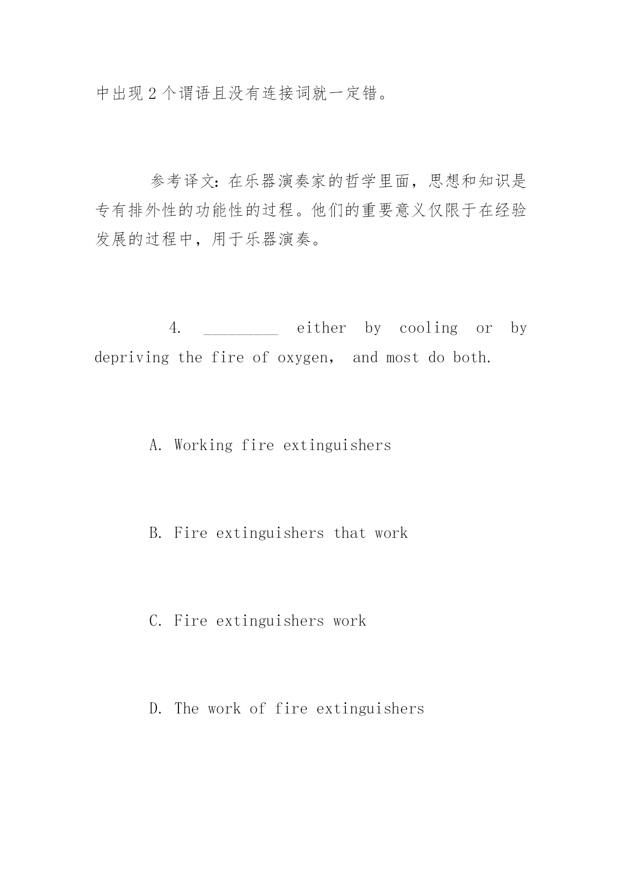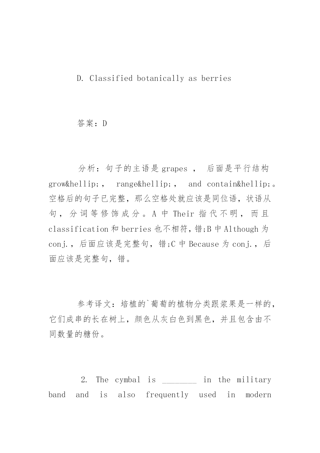 托福语法考试练习题及答案 2017年托福语法考试练习题及答案 万事万物皆有法,英语当然也不例外。下面是小编整理的2017年托福语法考试练习题及答案,希望对大家有用,更多消息请关注应届毕业生网。 1._________,domesticatedgrapesgrowinclusters,rangeincolorfrompalegreentoblack,andcontainsugarinvaryingquantities. A.Theirbotanicalclassificationasberries B.Althoughtheirbotanicalclassificationasberries C.Becauseberriesbeingtheirbotanicalclassification D.Classifiedbotanicallyasberries 答案:D 分析:句子的主语是grapes,后面是平行结构grow…,range…,andcontain…。空格后的句子已完整,那么空格处就应该是同位语,状语从句,分词等修饰成分。A中Their指代不明,而且classification和berries也不相符,错;B中Although为conj.,后面应该是完整句,错;C中Because为conj.,后面应该是完整句,错。 参考译文:培植的`葡萄的植物分类跟浆果是一样的,它们成串的长在树上,颜色从灰白色到黑色,并且包含由不同数量的糖份。 2.Thecymbalis________inthemilitarybandandisalsofrequentlyusedinmodernorchestralmusic. A.abasicinstrument B.basicinstrument C.howbasicaninstrumentitis D.asaninstrumentisbasic 答案:A 分析:instrument可数,前面应该有限定词a.and前为一简单句。 参考译文:铙钹在军乐队里是一个基本的乐器,而且还经常在现代管弦乐里使用。 3.Ininstrumentalistphilosophy,ideasandknowledgeareexclusivelyfunctionalprocesses:theyareofsignificanceonly_________instrumentalinthedevelopmentofexperience. A.astheyare B.arethey C.thereare D.are 答案:A 分析:两个谓语需要有一个conj.来连接。一个句子中出现2个谓语且没有连接词就一定错。 参考译文:在乐器演奏家的哲学里面,思想和知识是专有排外性的功能性的过程。他们的重要意义仅限于在经验发展的过程中,用于乐器演奏。 4._________eitherbycoolingorbydeprivingthefireofoxygen,andmostdoboth. A.Workingfireextinguishers B.Fireextinguishersthatwork C.Fireextinguisherswork D.Theworkoffireextinguishers 答案:C 分析:空格中缺主谓。A中没有谓语;B中that多余,因为句中只有一个谓语;D也没有谓语。 参考译文:灭火器的通过冷却或者减少火中的氧气的方法工作的,大多数时候两个方法都会用到。 5.Theintroductionofmass-productionmethodsenabledmanypeople_________andgavethemanunprecedentedamountofmobility. A.topurchasetheirownautomobiles B.theirowntopurchaseautomobiles C.totheirownpurchaseautomobiles D.owntheirautomobilestopurchase 答案:A 分析:为固定结构enablesbtodosth. 参考译文:规模生产方法的产生,使得人们能够买自己的车,并获得了空前的灵活性。
