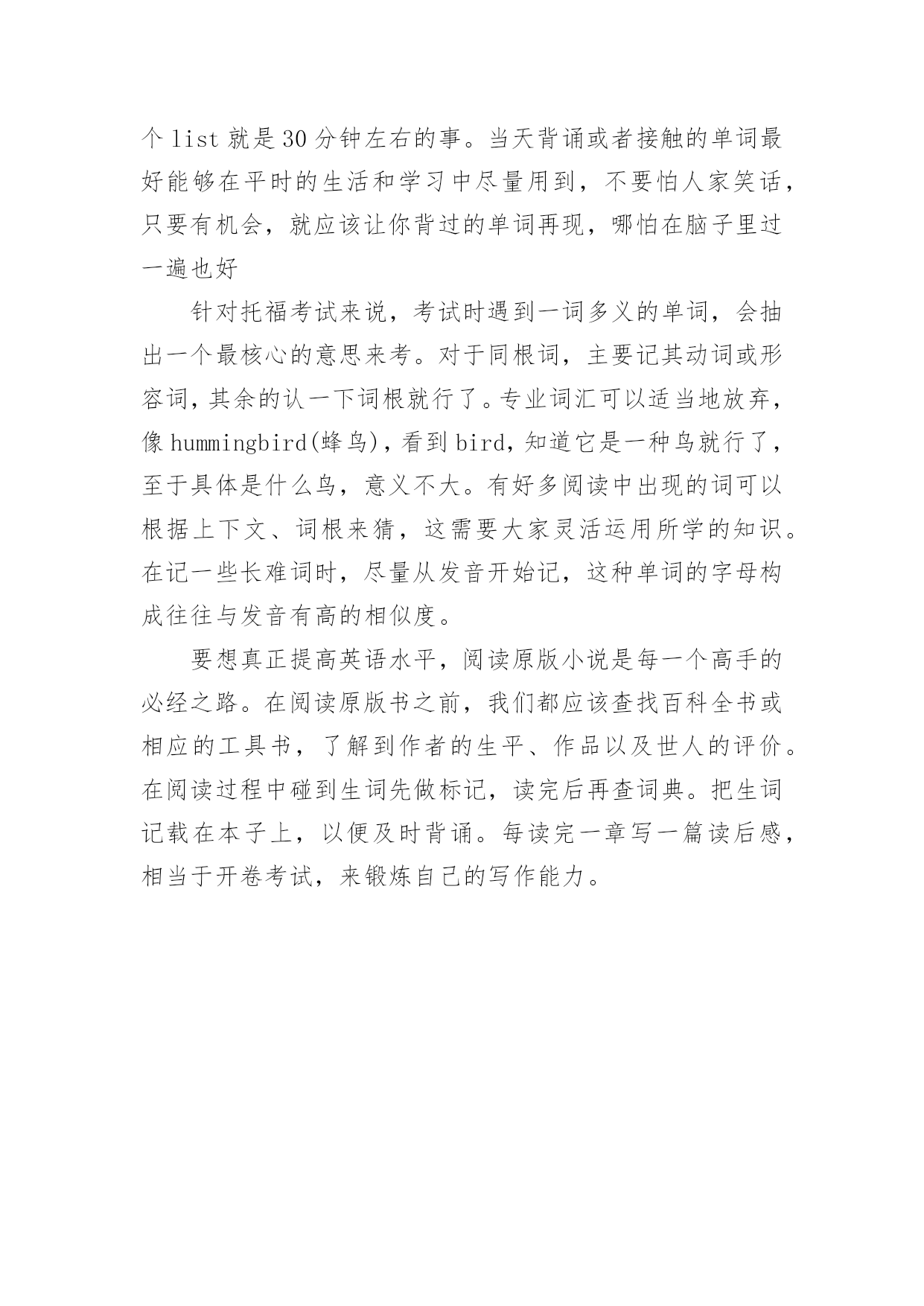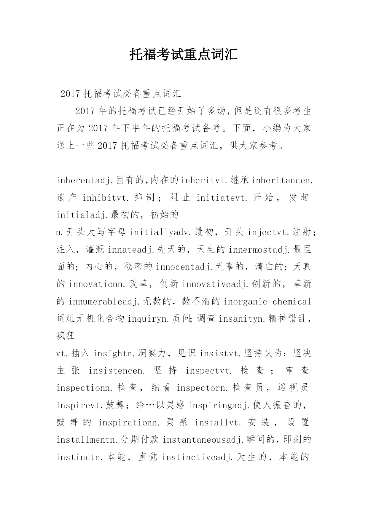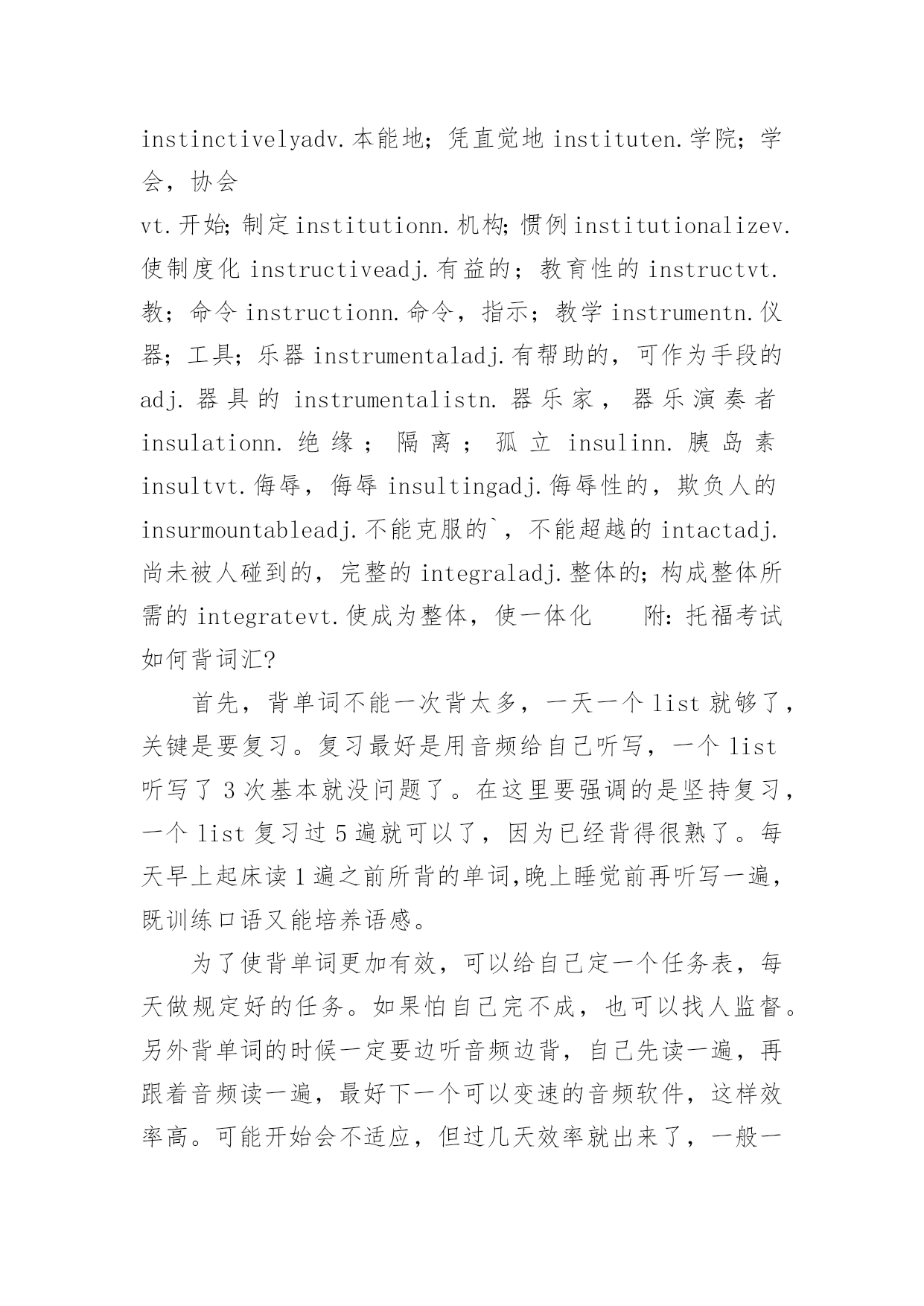 托福考试重点词汇 2017托福考试必备重点词汇2017年的托福考试已经开始了多场,但是还有很多考生正在为2017年下半年的托福考试备考。下面,小编为大家送上一些2017托福考试必备重点词汇,供大家参考。inherentadj.固有的,内在的inheritvt.继承inheritancen.遗产inhibitvt.抑制;阻止initiatevt.开始,发起initialadj.最初的,初始的n.开头大写字母initiallyadv.最初,开头injectvt.注射;注入,灌溉innateadj.先天的,天生的innermostadj.最里面的;内心的,秘密的innocentadj.无辜的,清白的;天真的innovationn.改革,创新innovativeadj.创新的,革新的innumerableadj.无数的,数不清的inorganicchemical词组无机化合物inquiryn.质问;调查insanityn.精神错乱,疯狂vt.插入insightn.洞察力,见识insistvt.坚持认为;坚决主张insistencen.坚持inspectvt.检查;审查inspectionn.检查,细看inspectorn.检查员,巡视员inspirevt.鼓舞;给…以灵感inspiringadj.使人振奋的,鼓舞的inspirationn.灵感installvt.安装,设置installmentn.分期付款instantaneousadj.瞬间的,即刻的instinctn.本能,直觉instinctiveadj.天生的,本能的instinctivelyadv.本能地;凭直觉地instituten.学院;学会,协会vt.开始;制定institutionn.机构;惯例institutionalizev.使制度化instructiveadj.有益的;教育性的instructvt.教;命令instructionn.命令,指示;教学instrumentn.仪器;工具;乐器instrumentaladj.有帮助的,可作为手段的adj.器具的instrumentalistn.器乐家,器乐演奏者insulationn.绝缘;隔离;孤立insulinn.胰岛素insultvt.侮辱,侮辱insultingadj.侮辱性的,欺负人的insurmountableadj.不能克服的`,不能超越的intactadj.尚未被人碰到的,完整的integraladj.整体的;构成整体所需的integratevt.使成为整体,使一体化附:托福考试如何背词汇?首先,背单词不能一次背太多,一天一个list就够了,关键是要复习。复习最好是用音频给自己听写,一个list听写了3次基本就没问题了。在这里要强调的是坚持复习,一个list复习过5遍就可以了,因为已经背得很熟了。每天早上起床读1遍之前所背的单词,晚上睡觉前再听写一遍,既训练口语又能培养语感。为了使背单词更加有效,可以给自己定一个任务表,每天做规定好的任务。如果怕自己完不成,也可以找人监督。另外背单词的时候一定要边听音频边背,自己先读一遍,再跟着音频读一遍,最好下一个可以变速的音频软件,这样效率高。可能开始会不适应,但过几天效率就出来了,一般一个list就是30分钟左右的事。当天背诵或者接触的单词最好能够在平时的生活和学习中尽量用到,不要怕人家笑话,只要有机会,就应该让你背过的单词再现,哪怕在脑子里过一遍也好针对托福考试来说,考试时遇到一词多义的单词,会抽出一个最核心的意思来考。对于同根词,主要记其动词或形容词,其余的认一下词根就行了。专业词汇可以适当地放弃,像hummingbird(蜂鸟),看到bird,知道它是一种鸟就行了,至于具体是什么鸟,意义不大。有好多阅读中出现的词可以根据上下文、词根来猜,这需要大家灵活运用所学的知识。在记一些长难词时,尽量从发音开始记,这种单词的字母构成往往与发音有高的相似度。要想真正提高英语水平,阅读原版小说是每一个高手的必经之路。在阅读原版书之前,我们都应该查找百科全书或相应的工具书,了解到作者的生平、作品以及世人的评价。在阅读过程中碰到生词先做标记,读完后再查词典。把生词记载在本子上,以便及时背诵。每读完一章写一篇读后感,相当于开卷考试,来锻炼自己的写作能力。
