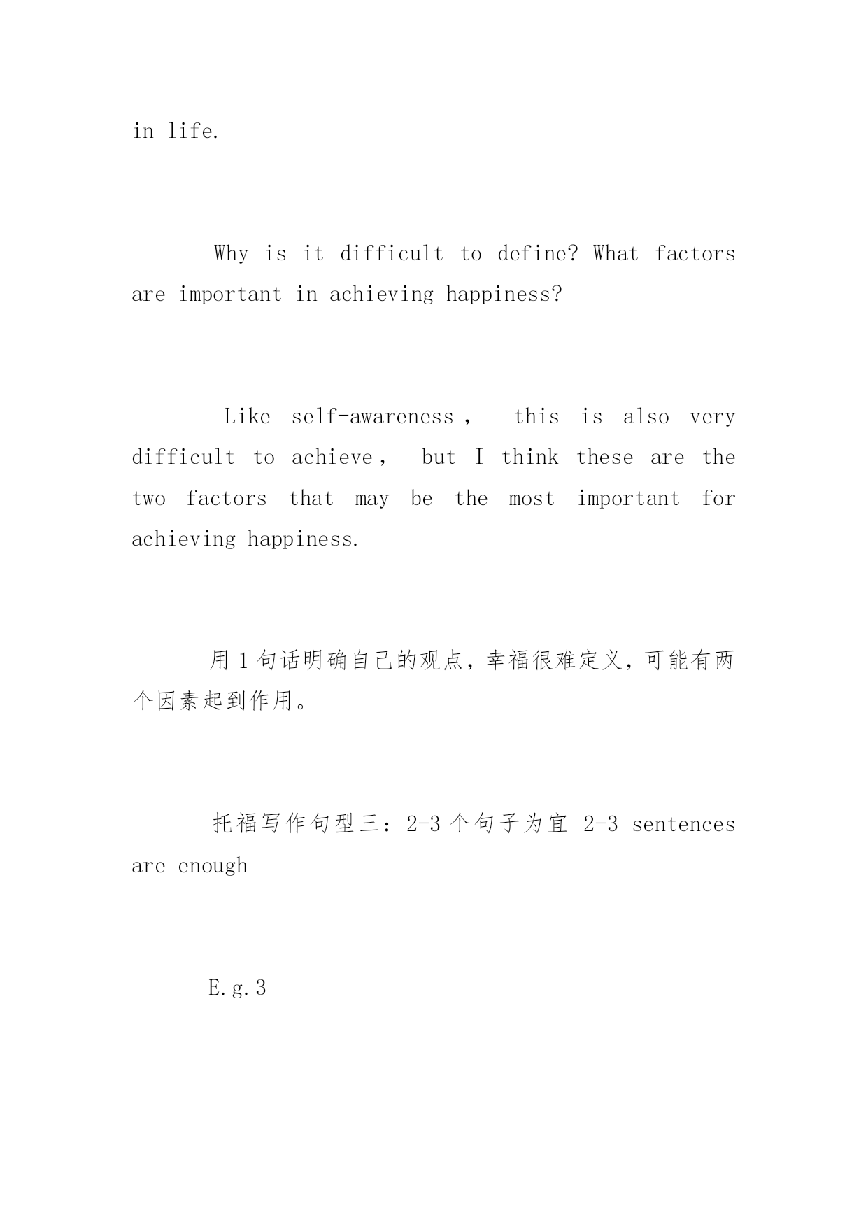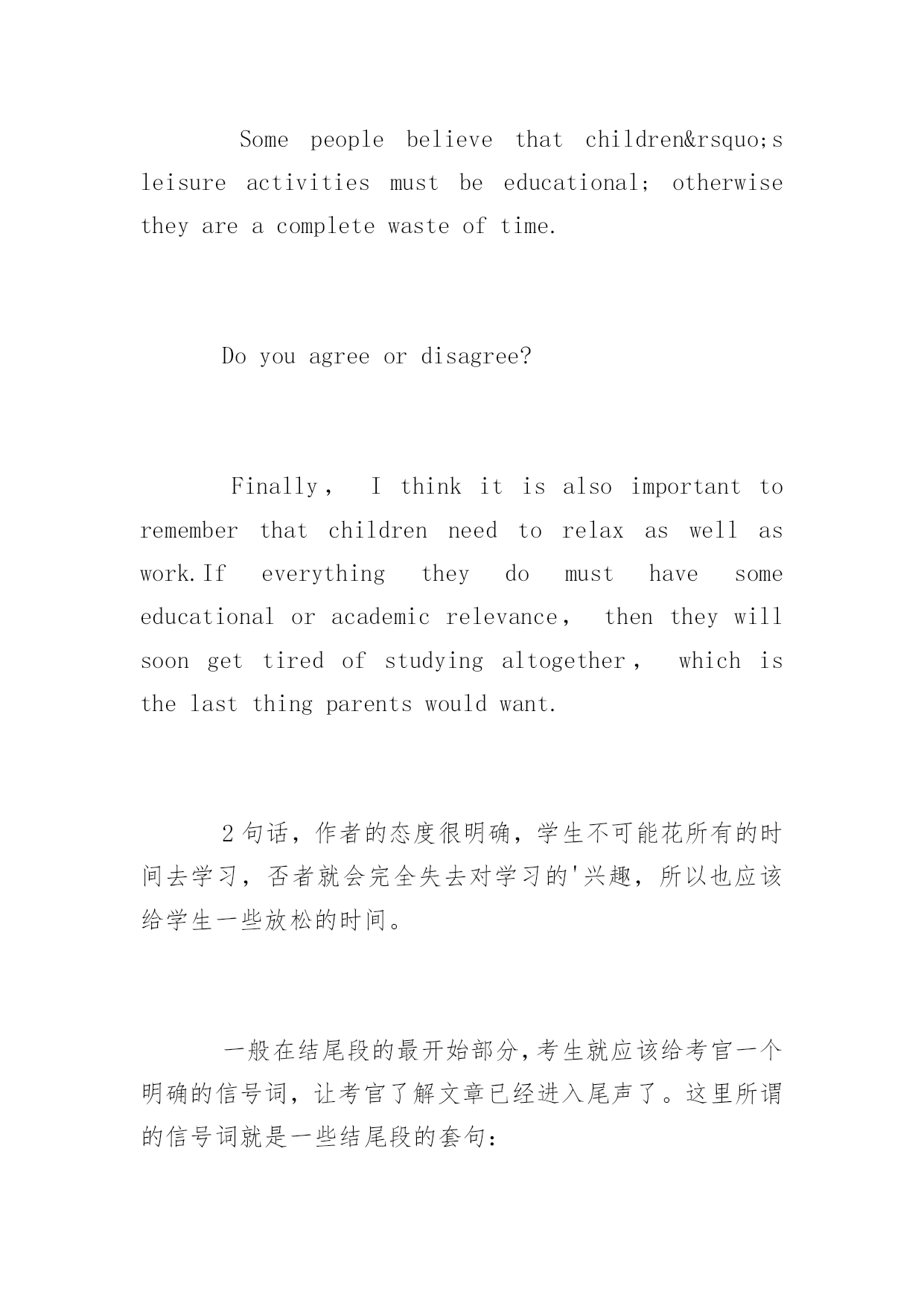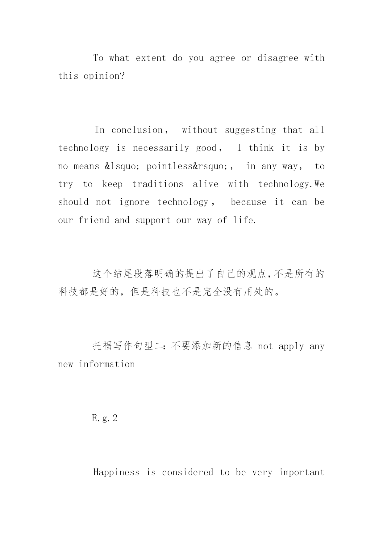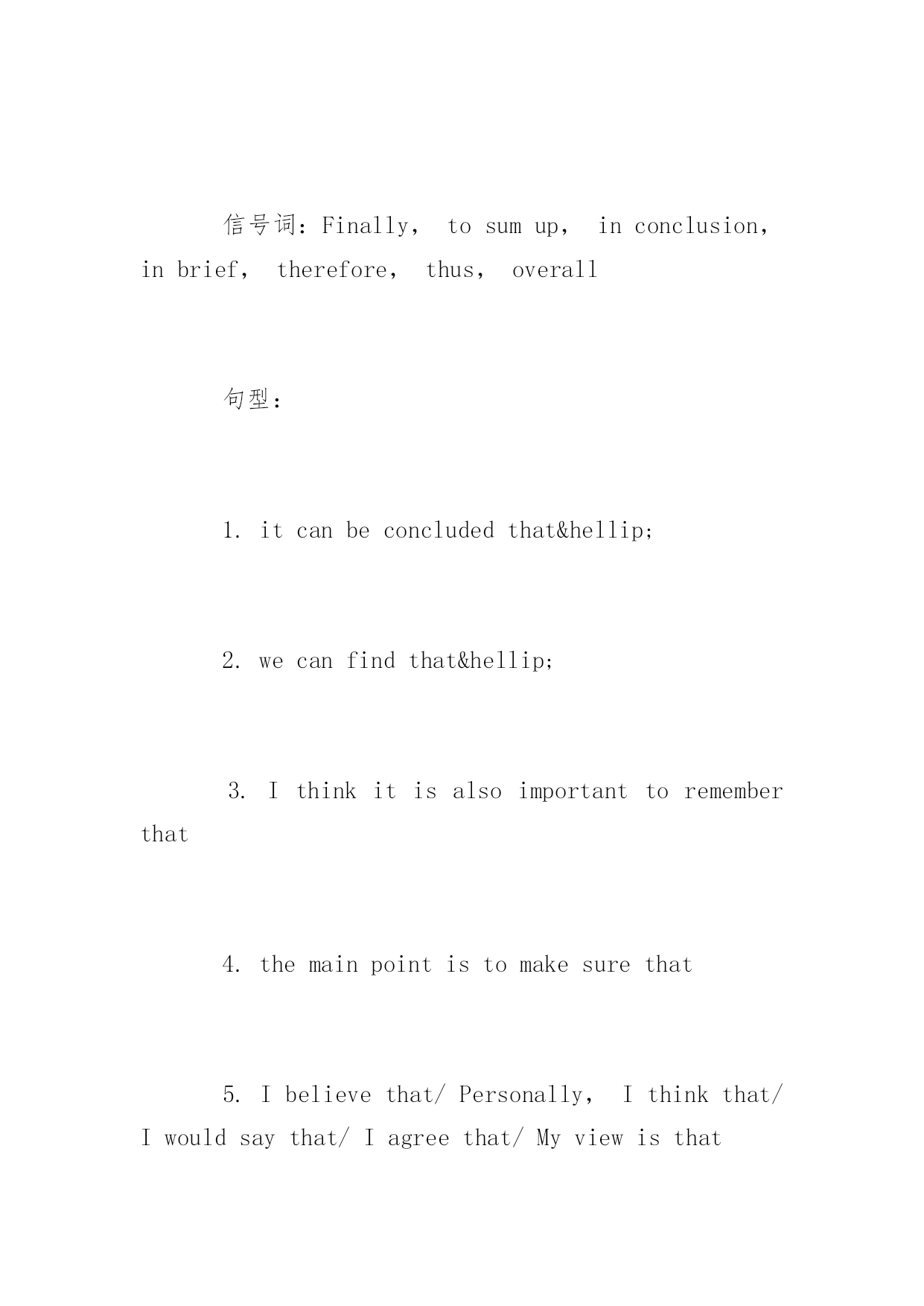 托福写作高分句型 2016托福写作高分句型 托福作文也需要不断的练习与积累,为了帮助考生们更加有效的备考托福,yjbys网小编为大家提供“托福写作高分句型写法,希望考生们能有所收获。 托福写作句型一:回答问题answerthequestion E.g.1 Whenacountrydevelopsitstechnology;thetraditionalskillsandwaysoflifedieout.Itispointlesstotryandkeepthemalive. Towhatextentdoyouagreeordisagreewiththisopinion? Inconclusion,withoutsuggestingthatalltechnologyisnecessarilygood,Ithinkitisbynomeans‘pointless’,inanyway,totrytokeeptraditionsalivewithtechnology.Weshouldnotignoretechnology,becauseitcanbeourfriendandsupportourwayoflife. 这个结尾段落明确的提出了自己的观点,不是所有的科技都是好的,但是科技也不是完全没有用处的。 托福写作句型二:不要添加新的信息notapplyanynewinformation E.g.2 Happinessisconsideredtobeveryimportantinlife. Whyisitdifficulttodefine?Whatfactorsareimportantinachievinghappiness? Likeself-awareness,thisisalsoverydifficulttoachieve,butIthinkthesearethetwofactorsthatmaybethemostimportantforachievinghappiness. 用1句话明确自己的观点,幸福很难定义,可能有两个因素起到作用。 托福写作句型三:2-3个句子为宜2-3sentencesareenough E.g.3 Somepeoplebelievethatchildren’sleisureactivitiesmustbeeducational;otherwisetheyareacompletewasteoftime. Doyouagreeordisagree? Finally,Ithinkitisalsoimportanttorememberthatchildrenneedtorelaxaswellaswork.Ifeverythingtheydomusthavesomeeducationaloracademicrelevance,thentheywillsoongettiredofstudyingaltogether,whichisthelastthingparentswouldwant. 2句话,作者的态度很明确,学生不可能花所有的时间去学习,否者就会完全失去对学习的'兴趣,所以也应该给学生一些放松的时间。 一般在结尾段的最开始部分,考生就应该给考官一个明确的信号词,让考官了解文章已经进入尾声了。这里所谓的信号词就是一些结尾段的套句: 信号词:Finally,tosumup,inconclusion,inbrief,therefore,thus,overall 句型: 1.itcanbeconcludedthat… 2.wecanfindthat… 3.Ithinkitisalsoimportanttorememberthat 4.themainpointistomakesurethat 5.Ibelievethat/Personally,Ithinkthat/Iwouldsaythat/Iagreethat/Myviewisthat