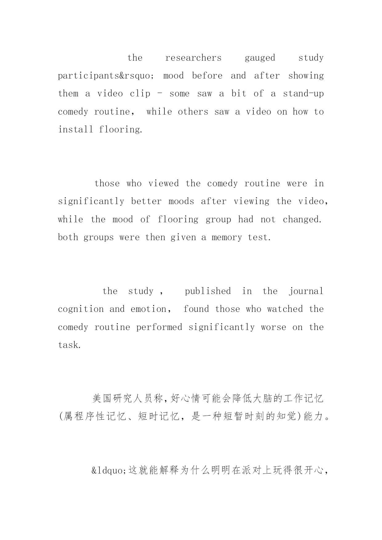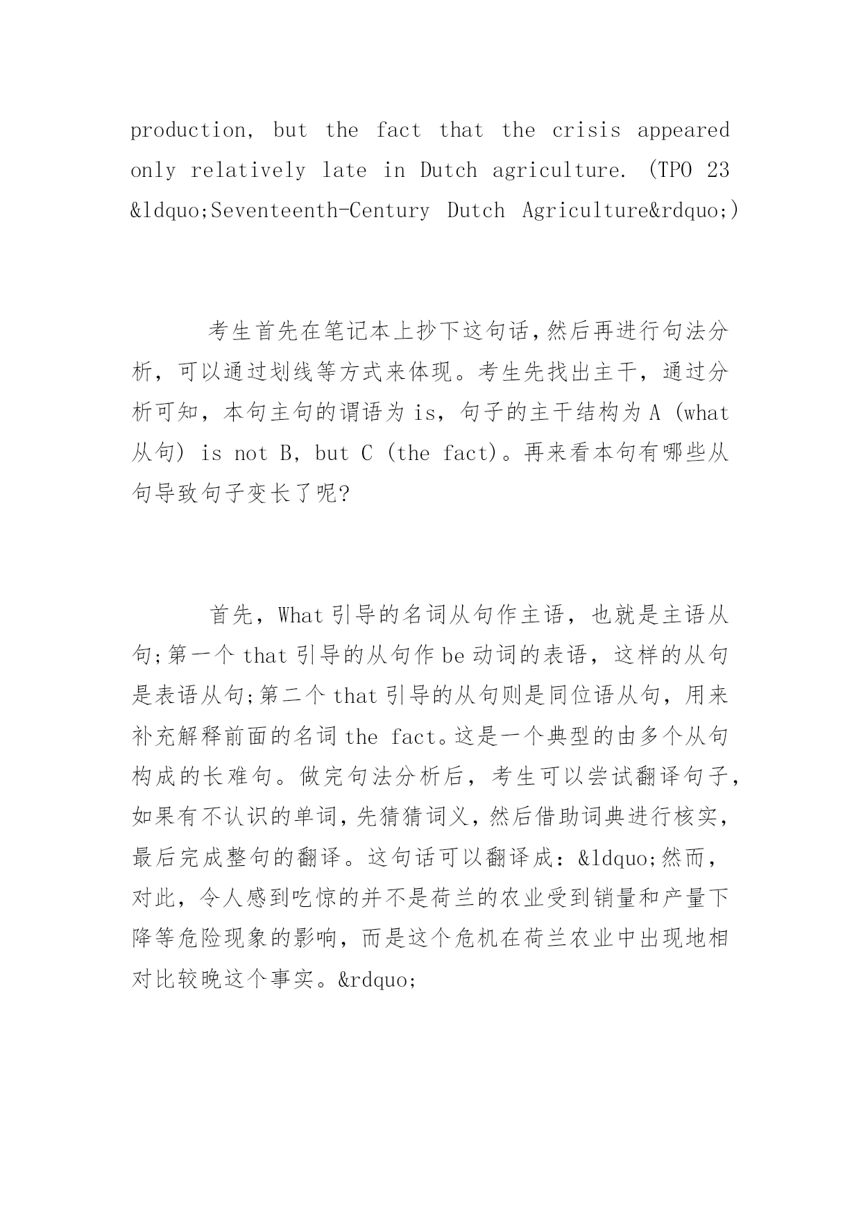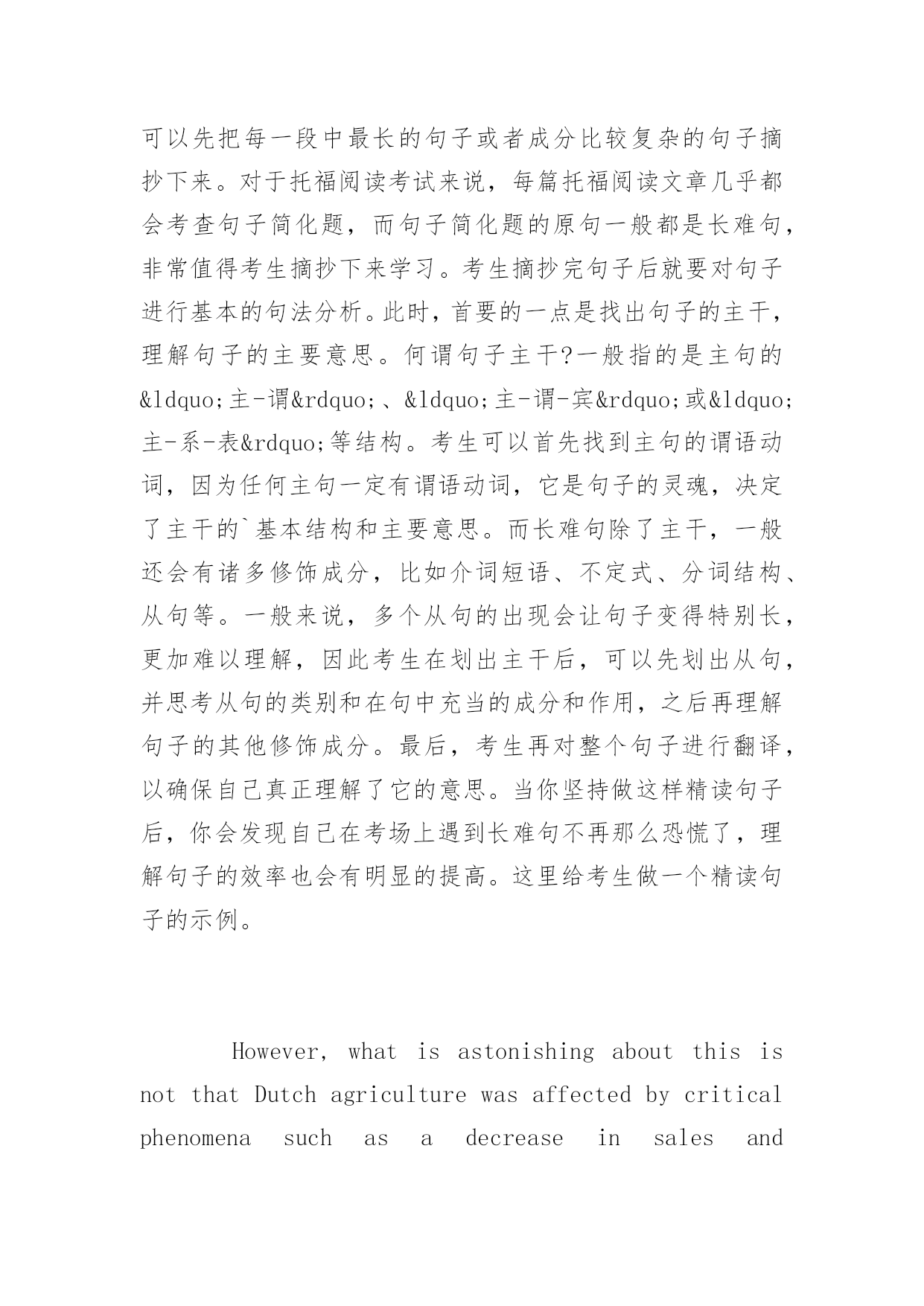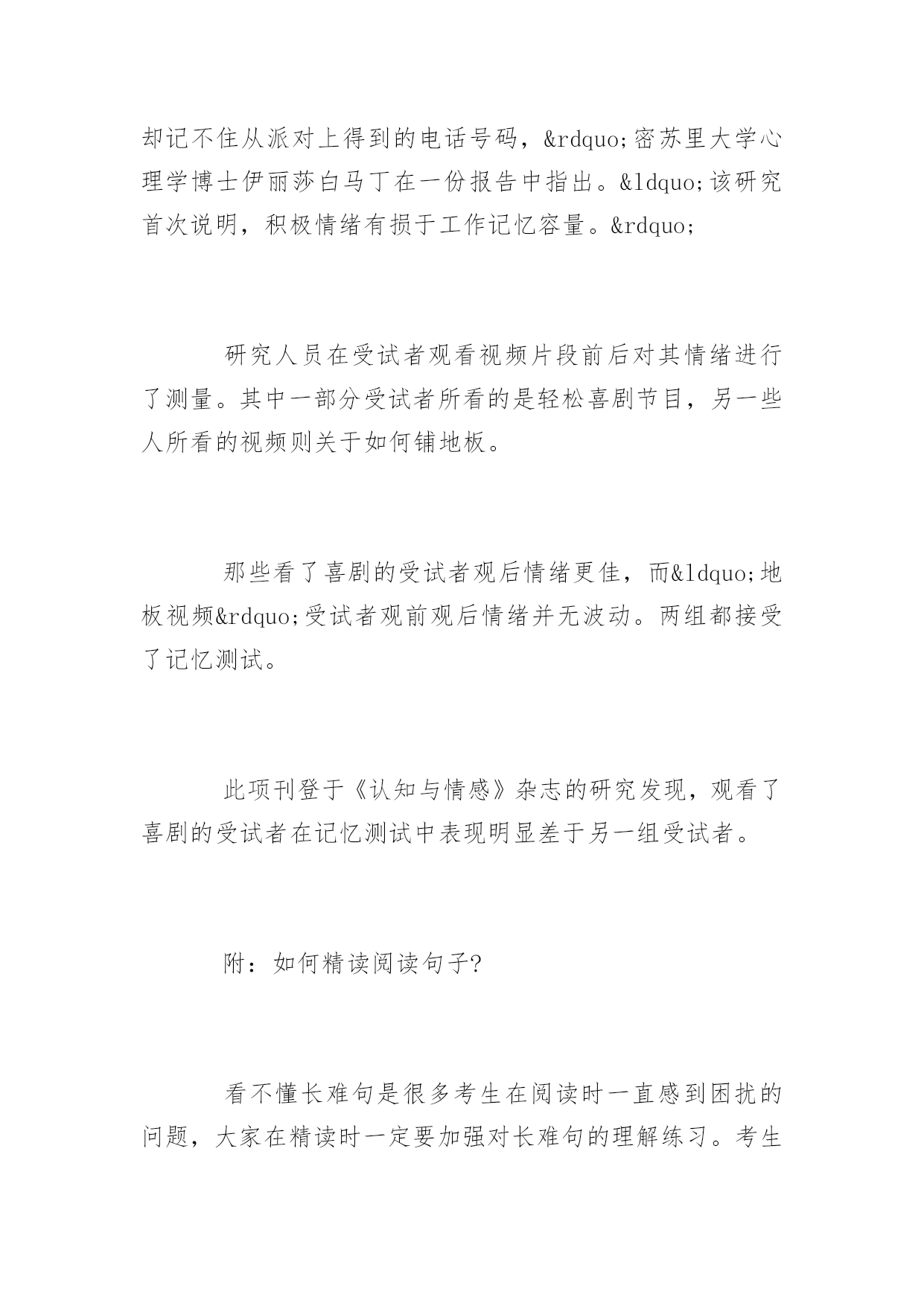 托福阅读理解文章《如何保持好记忆力》 2017托福阅读理解文章《如何保持好记忆力》 对于托福考生来说,想要在托福考试中拿到比较理想的阅读理解分数,关键就是练习,下面,小编送给大家一篇2017托福阅读理解文章,希望对大家有所帮助。 beinginagoodmooddecreasesthebrain'sworkingmemory,usresearcherssay. “thisexplainswhyyoumightnotbeabletorememberaphonenumberyougetatapartywhenyouarehavingagoodtime,”elizabethmartin,adoctoralstudentofpsychologyattheuniversityofmissouri,saysinastatement.“thisresearchisthefirsttoshowthatpositivemoodcannegativelyimpactworkingmemorystoragecapacity.” theresearchersgaugedstudyparticipants’moodbeforeandaftershowingthemavideoclip-somesawabitofastand-upcomedyroutine,whileotherssawavideoonhowtoinstallflooring. thosewhoviewedthecomedyroutinewereinsignificantlybettermoodsafterviewingthevideo,whilethemoodofflooringgrouphadnotchanged.bothgroupswerethengivenamemorytest. thestudy,publishedinthejournalcognitionandemotion,foundthosewhowatchedthecomedyroutineperformedsignificantlyworseonthetask. 美国研究人员称,好心情可能会降低大脑的工作记忆(属程序性记忆、短时记忆,是一种短暂时刻的知觉)能力。 “这就能解释为什么明明在派对上玩得很开心,却记不住从派对上得到的电话号码,”密苏里大学心理学博士伊丽莎白马丁在一份报告中指出。“该研究首次说明,积极情绪有损于工作记忆容量。” 研究人员在受试者观看视频片段前后对其情绪进行了测量。其中一部分受试者所看的是轻松喜剧节目,另一些人所看的视频则关于如何铺地板。 那些看了喜剧的受试者观后情绪更佳,而“地板视频”受试者观前观后情绪并无波动。两组都接受了记忆测试。 此项刊登于《认知与情感》杂志的研究发现,观看了喜剧的受试者在记忆测试中表现明显差于另一组受试者。 附:如何精读阅读句子? 看不懂长难句是很多考生在阅读时一直感到困扰的问题,大家在精读时一定要加强对长难句的理解练习。考生可以先把每一段中最长的句子或者成分比较复杂的句子摘抄下来。对于托福阅读考试来说,每篇托福阅读文章几乎都会考查句子简化题,而句子简化题的原句一般都是长难句,非常值得考生摘抄下来学习。考生摘抄完句子后就要对句子进行基本的句法分析。此时,首要的一点是找出句子的主干,理解句子的主要意思。何谓句子主干?一般指的是主句的“主-谓”、“主-谓-宾”或“主-系-表”等结构。考生可以首先找到主句的谓语动词,因为任何主句一定有谓语动词,它是句子的灵魂,决定了主干的`基本结构和主要意思。而长难句除了主干,一般还会有诸多修饰成分,比如介词短语、不定式、分词结构、从句等。一般来说,多个从句的出现会让句子变得特别长,更加难以理解,因此考生在划出主干后,可以先划出从句,并思考从句的类别和在句中充当的成分和作用,之后再理解句子的其他修饰成分。最后,考生再对整个句子进行翻译,以确保自己真正理解了它的意思。当你坚持做这样精读句子后,你会发现自己在考场上遇到长难句不再那么恐慌了,理解句子的效率也会有明显的提高。这里给考生做一个精读句子的示例。 However,whatisastonishingaboutthisisnotthatDutchagriculturewasaffectedbycriticalphenomenasuchasadecreaseinsalesandproduction,butthefactthatthecrisisappearedonlyrelativelyl