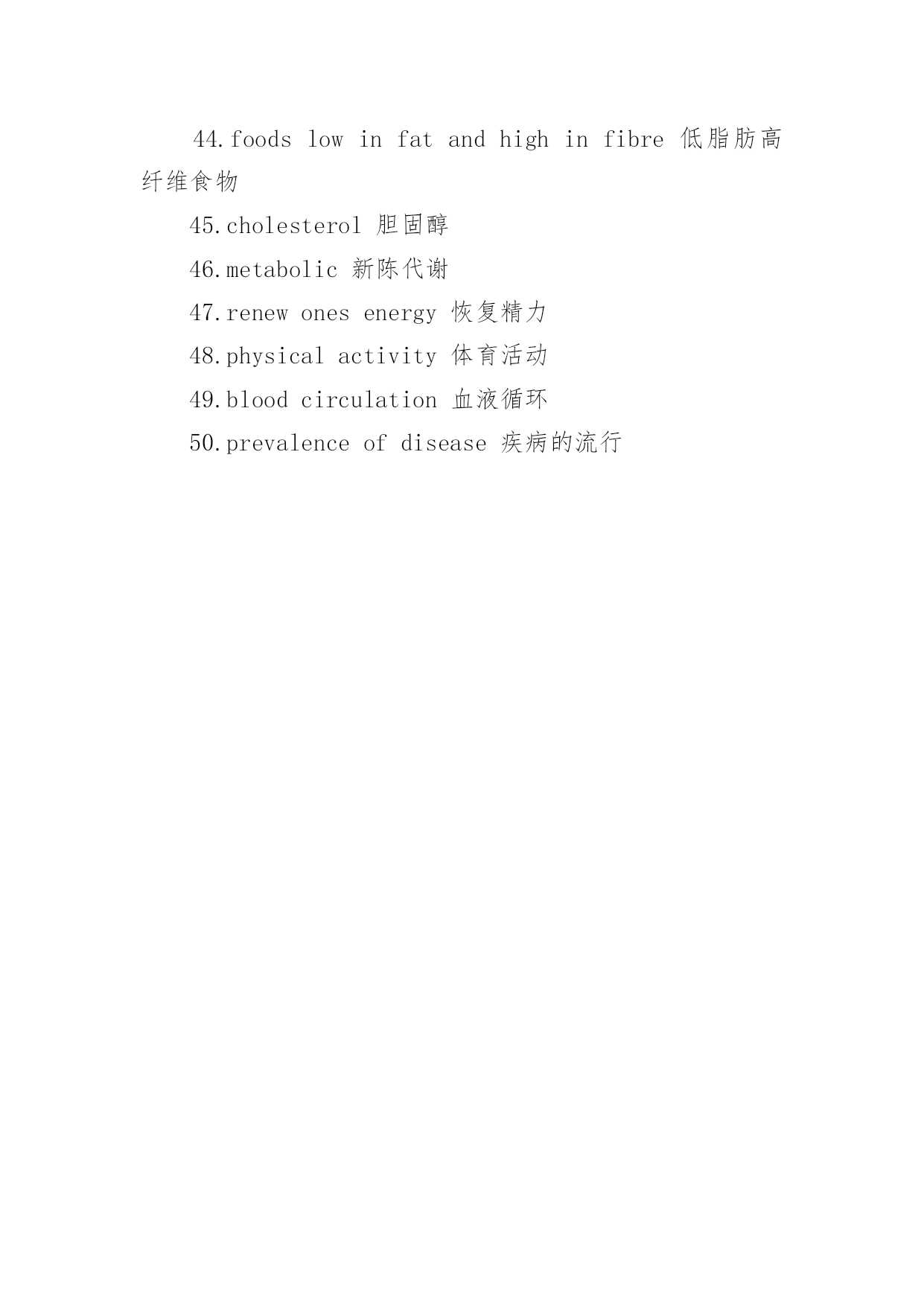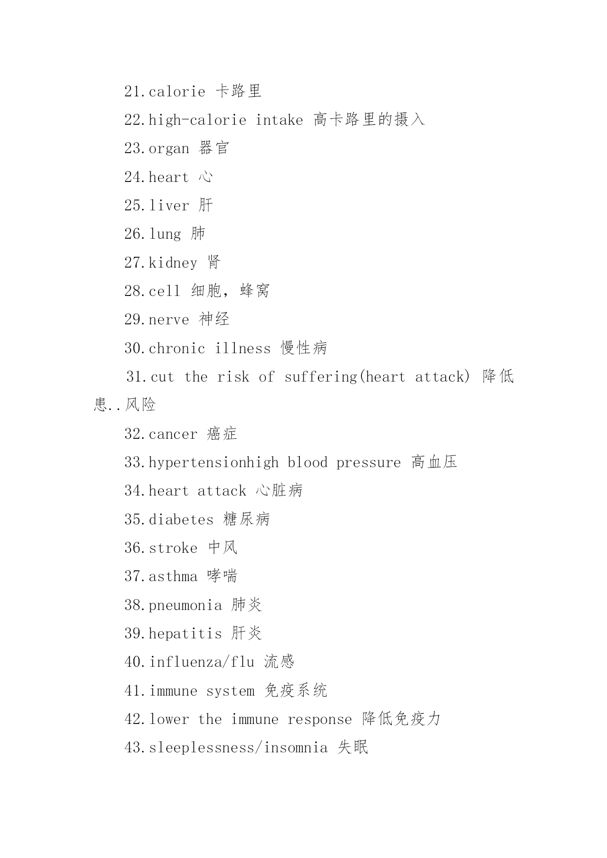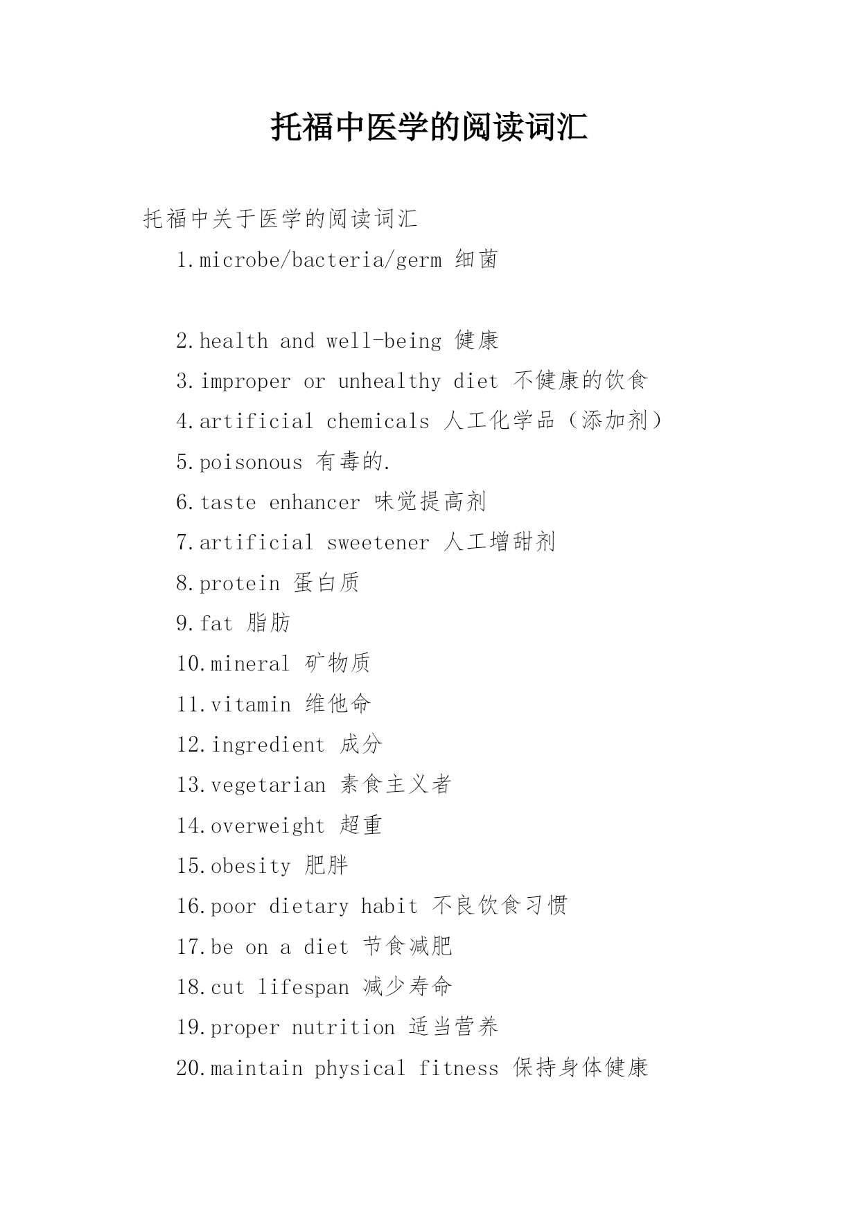 托福中医学的阅读词汇 托福中关于医学的阅读词汇1.microbe/bacteria/germ细菌2.healthandwell-being健康3.improperorunhealthydiet不健康的饮食4.artificialchemicals人工化学品(添加剂)5.poisonous有毒的.6.tasteenhancer味觉提高剂7.artificialsweetener人工增甜剂8.protein蛋白质9.fat脂肪10.mineral矿物质11.vitamin维他命12.ingredient成分13.vegetarian素食主义者14.overweight超重15.obesity肥胖16.poordietaryhabit不良饮食习惯17.beonadiet节食减肥18.cutlifespan减少寿命19.propernutrition适当营养20.maintainphysicalfitness保持身体健康21.calorie卡路里22.high-calorieintake高卡路里的摄入23.organ器官24.heart心25.liver肝26.lung肺27.kidney肾28.cell细胞,蜂窝29.nerve神经30.chronicillness慢性病31.cuttheriskofsuffering(heartattack)降低患..风险32.cancer癌症33.hypertensionhighbloodpressure高血压34.heartattack心脏病35.diabetes糖尿病36.stroke中风37.asthma哮喘38.pneumonia肺炎39.hepatitis肝炎40.influenza/flu流感41.immunesystem免疫系统42.lowertheimmuneresponse降低免疫力43.sleeplessness/insomnia失眠44.foodslowinfatandhighinfibre低脂肪高纤维食物45.cholesterol胆固醇46.metabolic新陈代谢47.renewonesenergy恢复精力48.physicalactivity体育活动49.bloodcirculation血液循环50.prevalenceofdisease疾病的流行