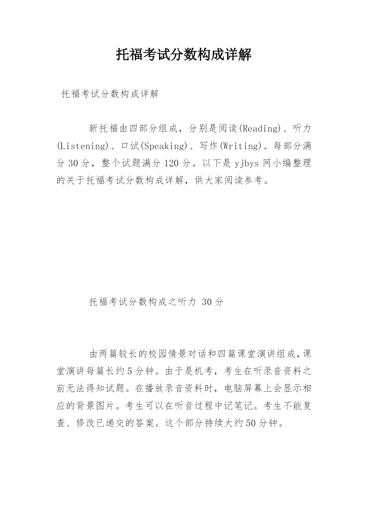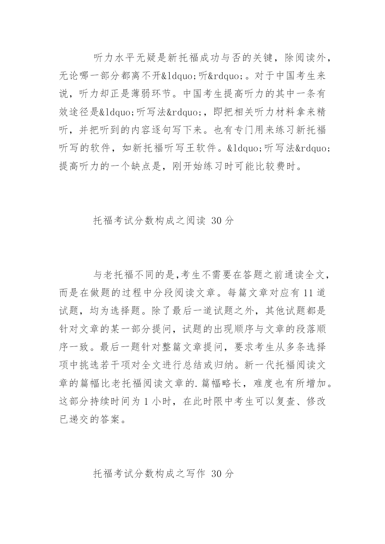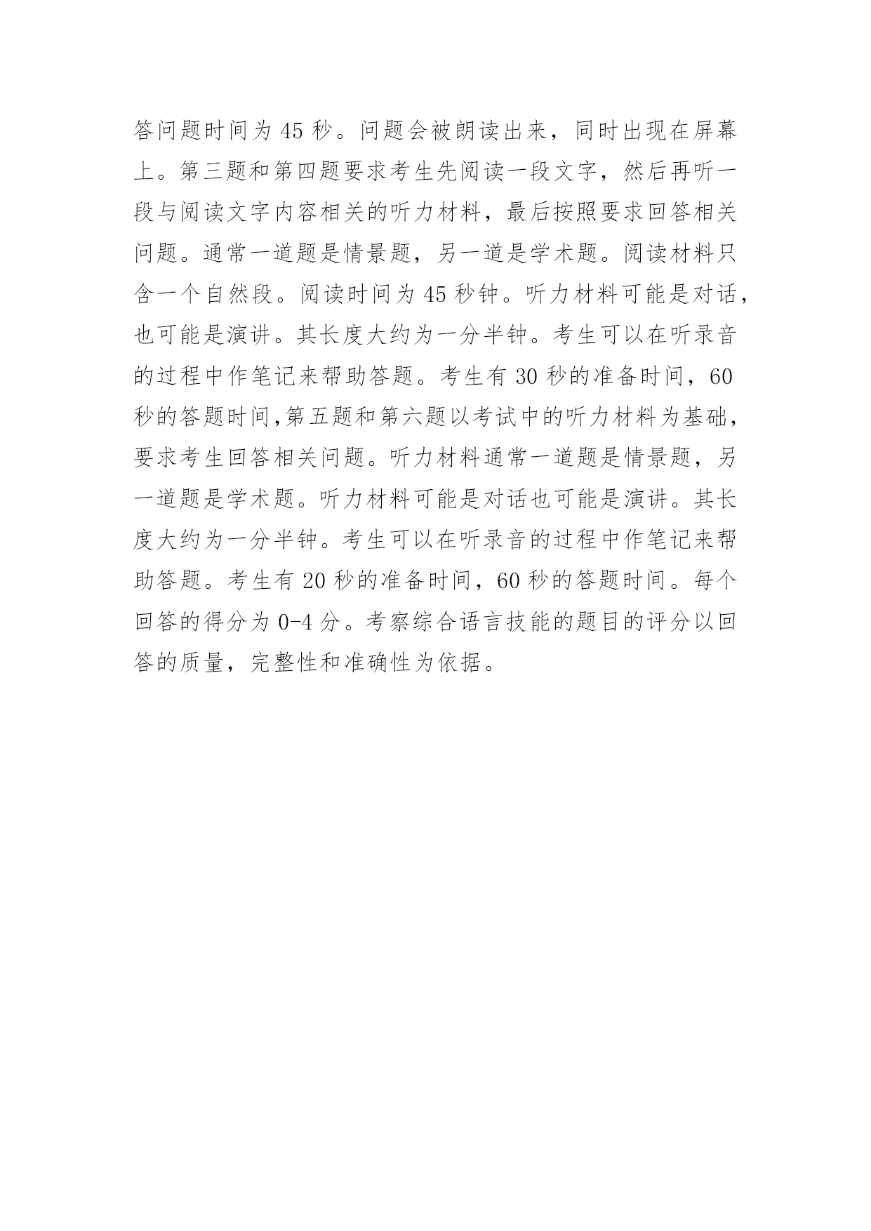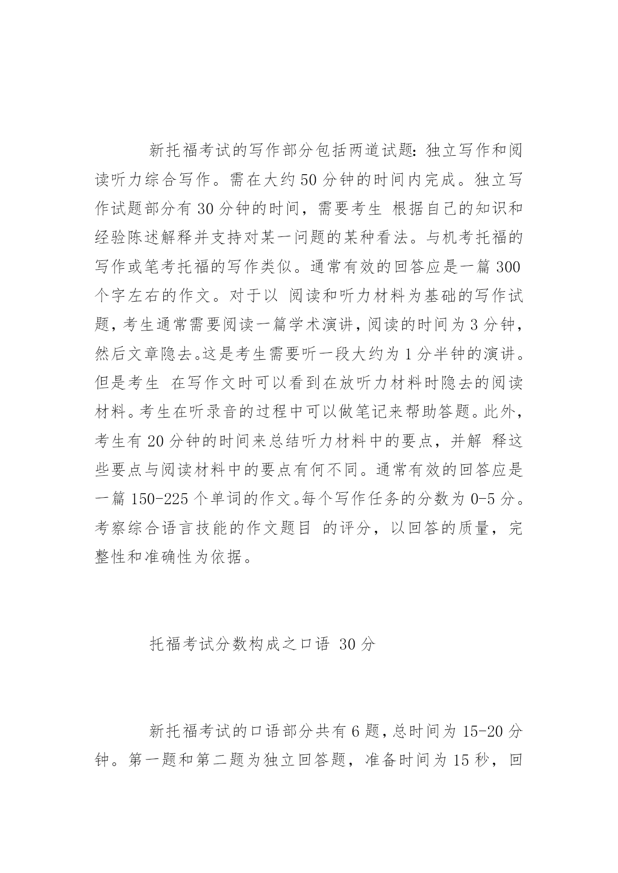 托福考试分数构成详解 托福考试分数构成详解 新托福由四部分组成,分别是阅读(Reading)、听力(Listening)、口试(Speaking)、写作(Writing)。每部分满分30分,整个试题满分120分。以下是yjbys网小编整理的关于托福考试分数构成详解,供大家阅读参考。 托福考试分数构成之听力30分 由两篇较长的校园情景对话和四篇课堂演讲组成,课堂演讲每篇长约5分钟。由于是机考,考生在听录音资料之前无法得知试题。在播放录音资料时,电脑屏幕上会显示相应的背景图片。考生可以在听音过程中记笔记。考生不能复查、修改已递交的答案。这个部分持续大约50分钟。 听力水平无疑是新托福成功与否的关键,除阅读外,无论哪一部分都离不开“听”。对于中国考生来说,听力却正是薄弱环节。中国考生提高听力的其中一条有效途径是“听写法”,即把相关听力材料拿来精听,并把听到的内容逐句写下来。也有专门用来练习新托福听写的软件,如新托福听写王软件。“听写法”提高听力的一个缺点是,刚开始练习时可能比较费时。 托福考试分数构成之阅读30分 与老托福不同的是,考生不需要在答题之前通读全文,而是在做题的过程中分段阅读文章。每篇文章对应有11道试题,均为选择题。除了最后一道试题之外,其他试题都是针对文章的某一部分提问,试题的出现顺序与文章的段落顺序一致。最后一题针对整篇文章提问,要求考生从多条选择项中挑选若干项对全文进行总结或归纳。新一代托福阅读文章的篇幅比老托福阅读文章的.篇幅略长,难度也有所增加。这部分持续时间为1小时,在此时限中考生可以复查、修改已递交的答案。 托福考试分数构成之写作30分 新托福考试的写作部分包括两道试题:独立写作和阅读听力综合写作。需在大约50分钟的时间内完成。独立写作试题部分有30分钟的时间,需要考生根据自己的知识和经验陈述解释并支持对某一问题的某种看法。与机考托福的写作或笔考托福的写作类似。通常有效的回答应是一篇300个字左右的作文。对于以阅读和听力材料为基础的写作试题,考生通常需要阅读一篇学术演讲,阅读的时间为3分钟,然后文章隐去。这是考生需要听一段大约为1分半钟的演讲。但是考生在写作文时可以看到在放听力材料时隐去的阅读材料。考生在听录音的过程中可以做笔记来帮助答题。此外,考生有20分钟的时间来总结听力材料中的要点,并解释这些要点与阅读材料中的要点有何不同。通常有效的回答应是一篇150-225个单词的作文。每个写作任务的分数为0-5分。考察综合语言技能的作文题目的评分,以回答的质量,完整性和准确性为依据。 托福考试分数构成之口语30分 新托福考试的口语部分共有6题,总时间为15-20分钟。第一题和第二题为独立回答题,准备时间为15秒,回答问题时间为45秒。问题会被朗读出来,同时出现在屏幕上。第三题和第四题要求考生先阅读一段文字,然后再听一段与阅读文字内容相关的听力材料,最后按照要求回答相关问题。通常一道题是情景题,另一道是学术题。阅读材料只含一个自然段。阅读时间为45秒钟。听力材料可能是对话,也可能是演讲。其长度大约为一分半钟。考生可以在听录音的过程中作笔记来帮助答题。考生有30秒的准备时间,60秒的答题时间,第五题和第六题以考试中的听力材料为基础,要求考生回答相关问题。听力材料通常一道题是情景题,另一道题是学术题。听力材料可能是对话也可能是演讲。其长度大约为一分半钟。考生可以在听录音的过程中作笔记来帮助答题。考生有20秒的准备时间,60秒的答题时间。每个回答的得分为0-4分。考察综合语言技能的题目的评分以回答的质量,完整性和准确性为依据。