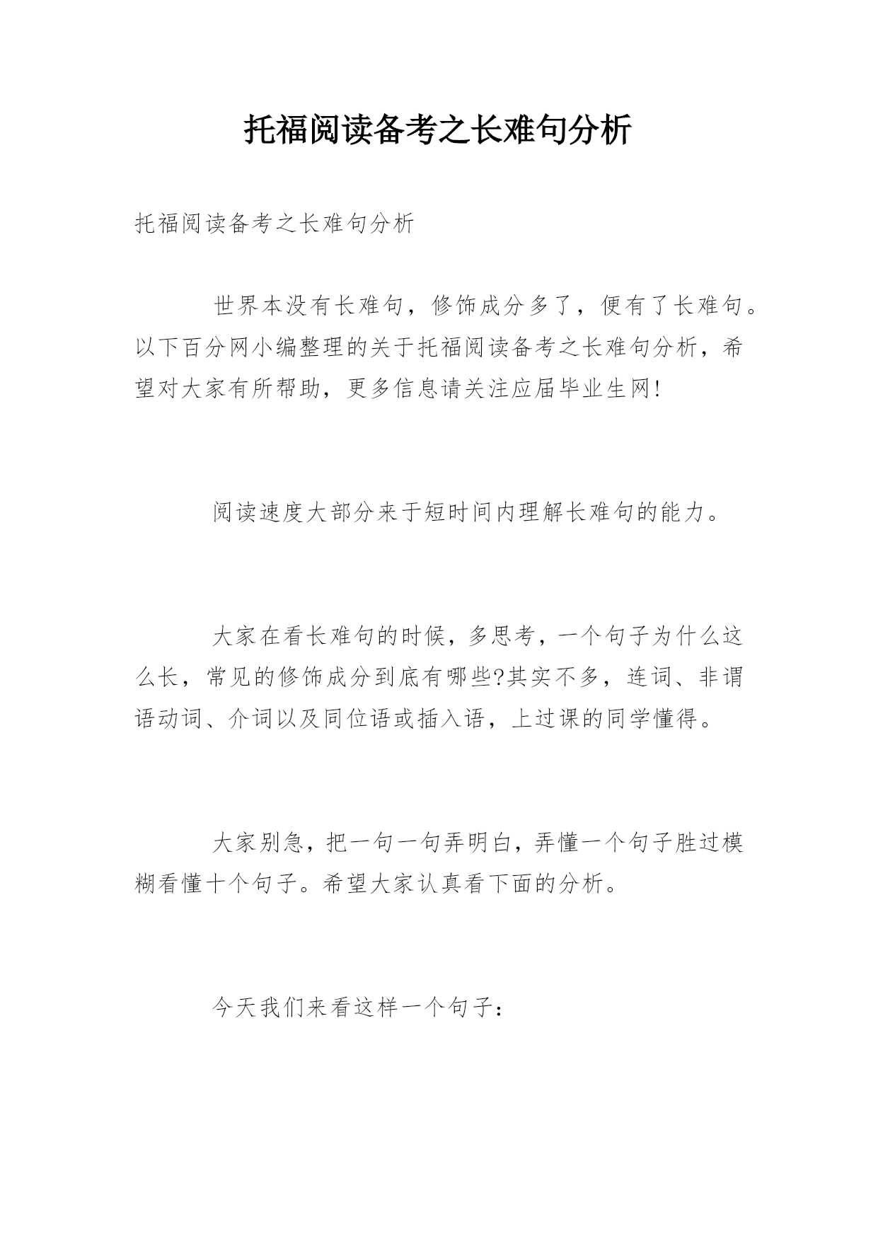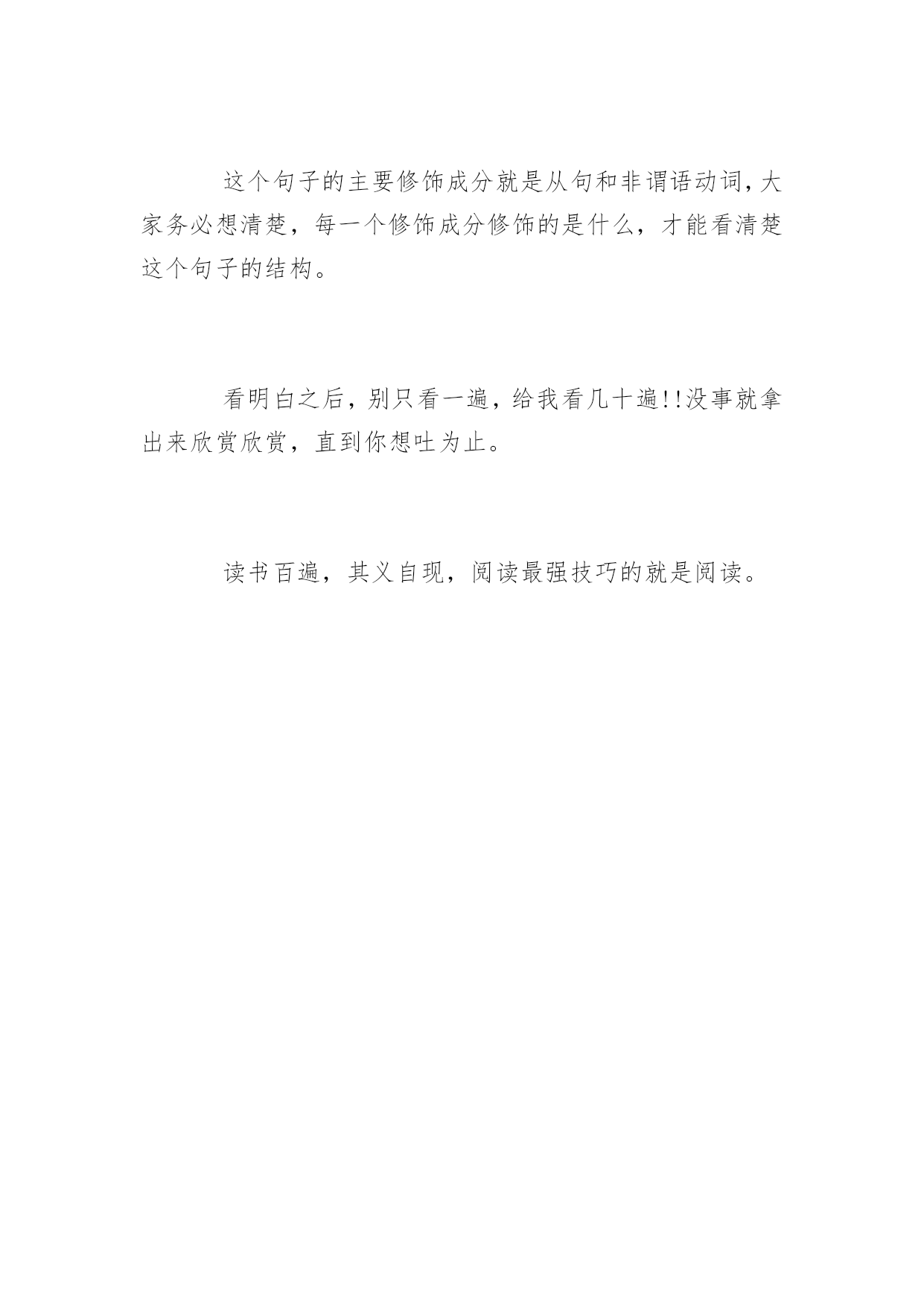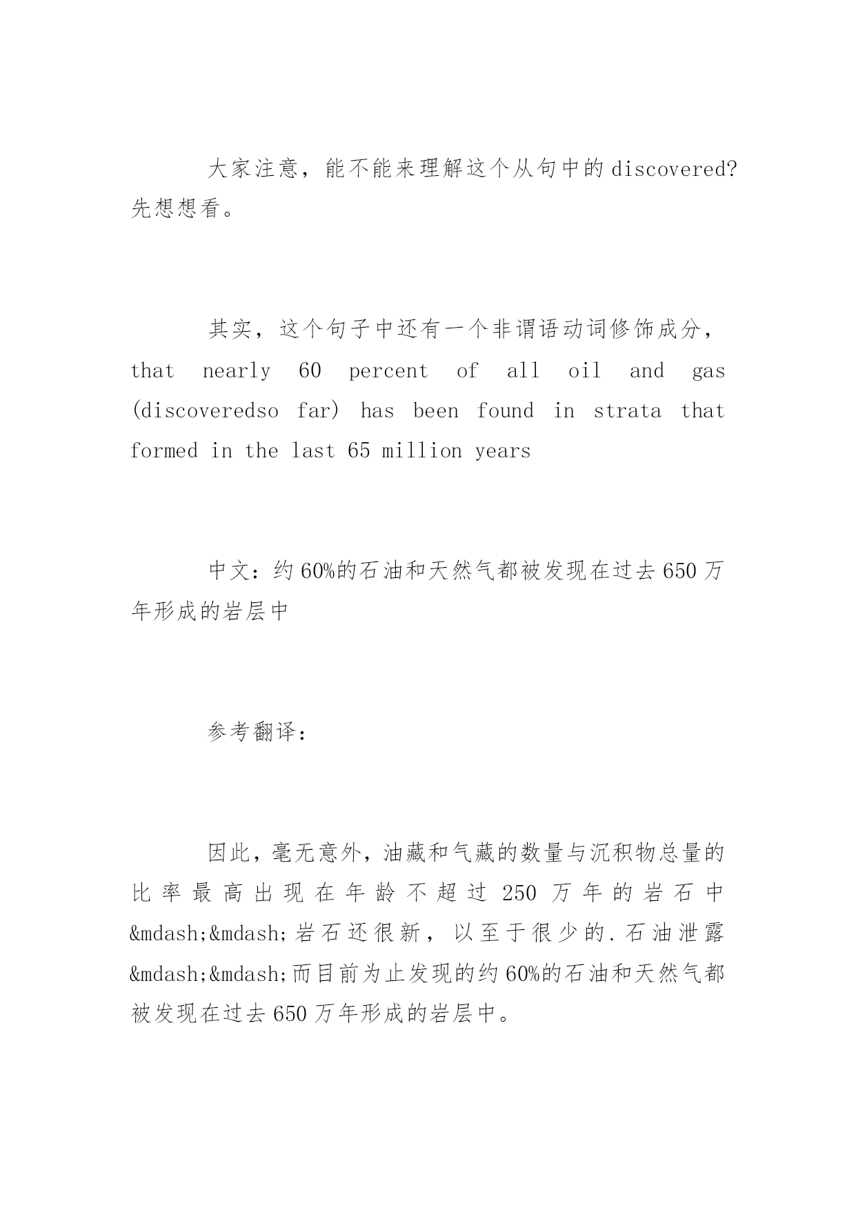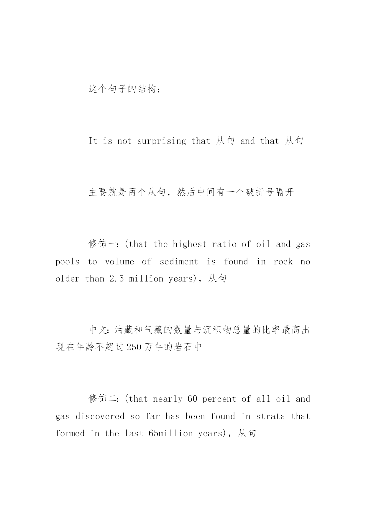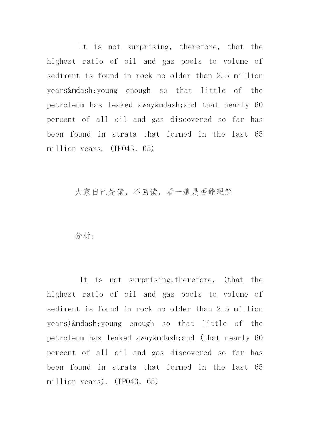 托福阅读备考之长难句分析 托福阅读备考之长难句分析 世界本没有长难句,修饰成分多了,便有了长难句。以下百分网小编整理的关于托福阅读备考之长难句分析,希望对大家有所帮助,更多信息请关注应届毕业生网! 阅读速度大部分来于短时间内理解长难句的能力。 大家在看长难句的时候,多思考,一个句子为什么这么长,常见的修饰成分到底有哪些?其实不多,连词、非谓语动词、介词以及同位语或插入语,上过课的同学懂得。 大家别急,把一句一句弄明白,弄懂一个句子胜过模糊看懂十个句子。希望大家认真看下面的分析。 今天我们来看这样一个句子: Itisnotsurprising,therefore,thatthehighestratioofoilandgaspoolstovolumeofsedimentisfoundinrocknoolderthan2.5millionyears—youngenoughsothatlittleofthepetroleumhasleakedaway—andthatnearly60percentofalloilandgasdiscoveredsofarhasbeenfoundinstratathatformedinthelast65millionyears.(TPO43,65) 大家自己先读,不回读,看一遍是否能理解 分析: Itisnotsurprising,therefore,(thatthehighestratioofoilandgaspoolstovolumeofsedimentisfoundinrocknoolderthan2.5millionyears)—youngenoughsothatlittleofthepetroleumhasleakedaway—and(thatnearly60percentofalloilandgasdiscoveredsofarhasbeenfoundinstratathatformedinthelast65millionyears).(TPO43,65) 这个句子的结构: Itisnotsurprisingthat从句andthat从句 主要就是两个从句,然后中间有一个破折号隔开 修饰一:(thatthehighestratioofoilandgaspoolstovolumeofsedimentisfoundinrocknoolderthan2.5millionyears),从句 中文:油藏和气藏的数量与沉积物总量的比率最高出现在年龄不超过250万年的岩石中 修饰二:(thatnearly60percentofalloilandgasdiscoveredsofarhasbeenfoundinstratathatformedinthelast65millionyears),从句 大家注意,能不能来理解这个从句中的discovered?先想想看。 其实,这个句子中还有一个非谓语动词修饰成分,thatnearly60percentofalloilandgas(discoveredsofar)hasbeenfoundinstratathatformedinthelast65millionyears 中文:约60%的石油和天然气都被发现在过去650万年形成的岩层中 参考翻译: 因此,毫无意外,油藏和气藏的数量与沉积物总量的比率最高出现在年龄不超过250万年的岩石中——岩石还很新,以至于很少的.石油泄露——而目前为止发现的约60%的石油和天然气都被发现在过去650万年形成的岩层中。 这个句子的主要修饰成分就是从句和非谓语动词,大家务必想清楚,每一个修饰成分修饰的是什么,才能看清楚这个句子的结构。 看明白之后,别只看一遍,给我看几十遍!!没事就拿出来欣赏欣赏,直到你想吐为止。 读书百遍,其义自现,阅读最强技巧的就是阅读。