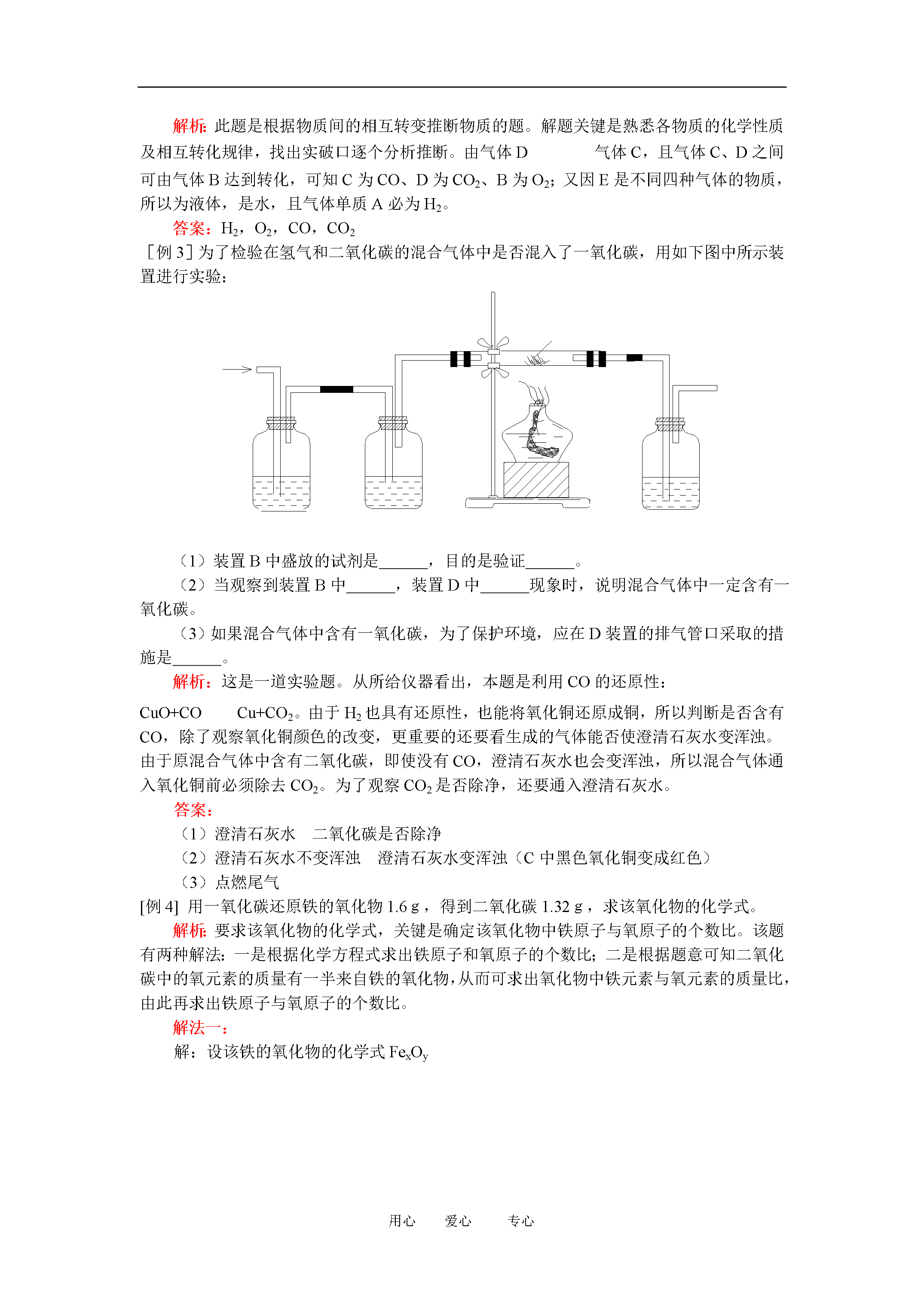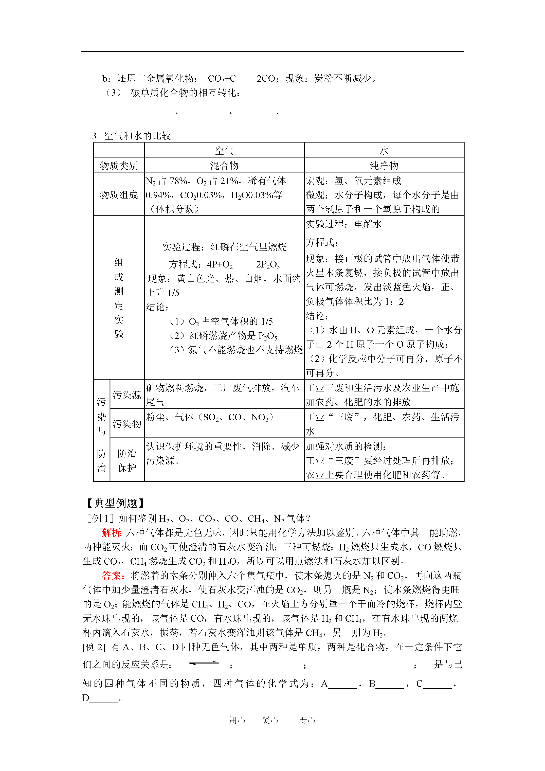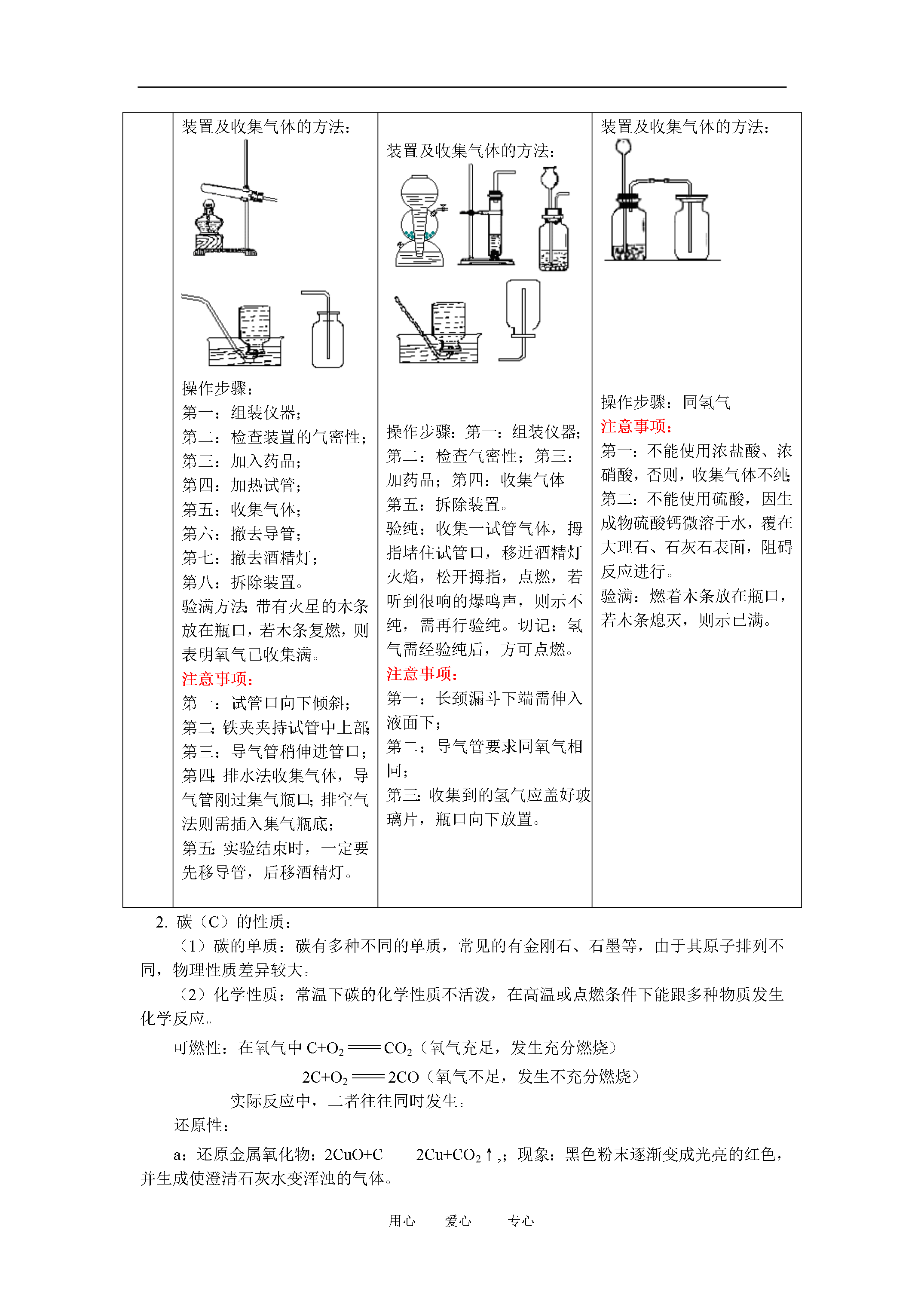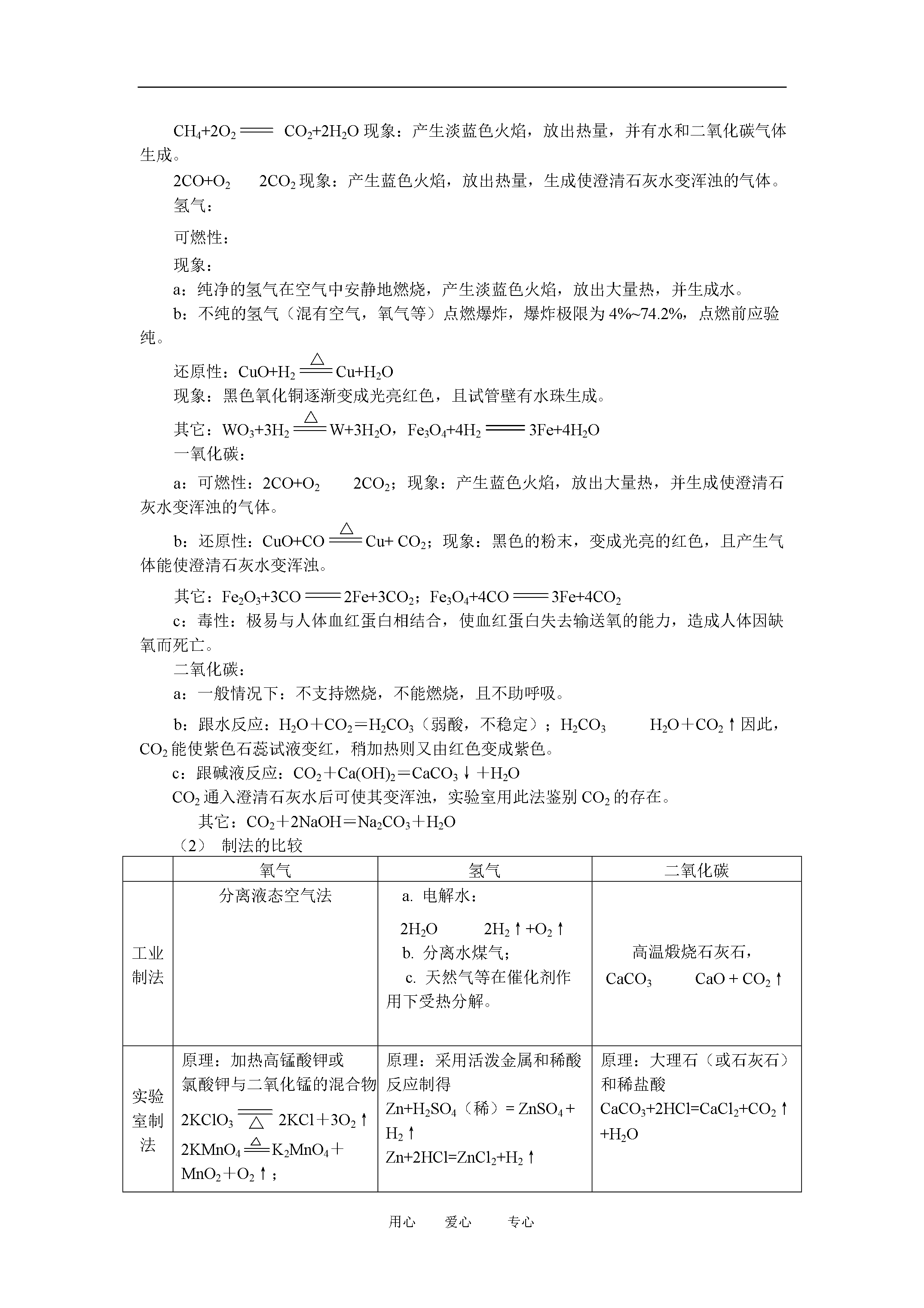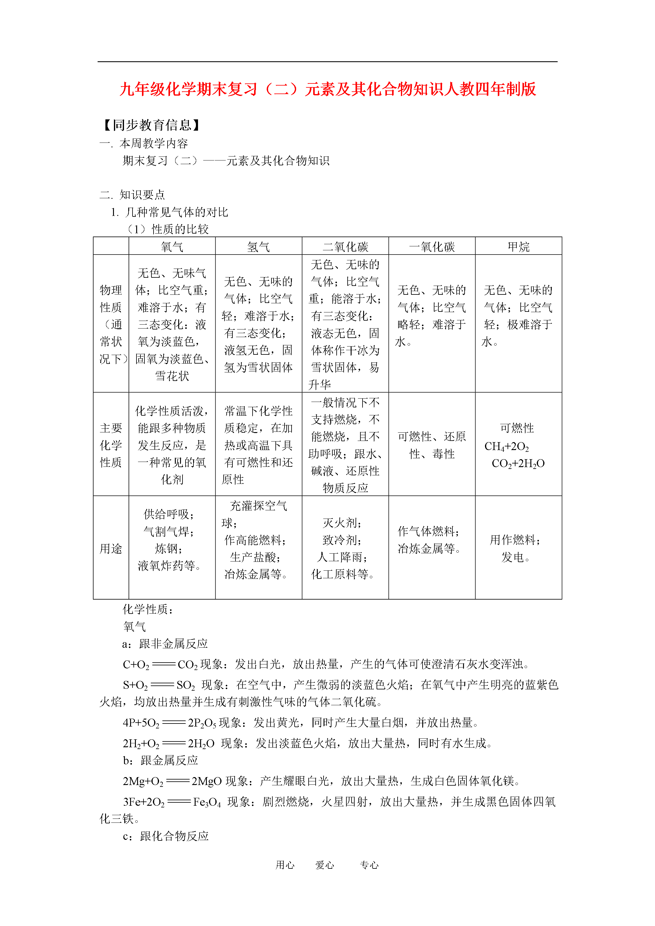 用心爱心专心九年级化学期末复习(二)元素及其化合物知识人教四年制版【同步教育信息】一.本周教学内容期末复习(二)——元素及其化合物知识二.知识要点1.几种常见气体的对比(1)性质的比较氧气氢气二氧化碳一氧化碳甲烷物理性质(通常状况下)无色、无味气体;比空气重;难溶于水;有三态变化:液氧为淡蓝色,固氧为淡蓝色、雪花状无色、无味的气体;比空气轻;难溶于水;有三态变化;液氢无色,固氢为雪状固体无色、无味的气体;比空气重;能溶于水;有三态变化:液态无色,固体称作干冰为雪状固体,易升华无色、无味的气体;比空气略轻;难溶于水。无色、无味的气体;比空气轻;极难溶于水。主要化学性质化学性质活泼,能跟多种物质发生反应,是一种常见的氧化剂常温下化学性质稳定,在加热或高温下具有可燃性和还原性一般情况下不支持燃烧,不能燃烧,且不助呼吸;跟水、碱液、还原性物质反应可燃性、还原性、毒性可燃性CH4+2O2CO2+2H2O用途供给呼吸;气割气焊;炼钢;液氧炸药等。充灌探空气球;作高能燃料;生产盐酸;冶炼金属等。灭火剂;致冷剂;人工降雨;化工原料等。作气体燃料;冶炼金属等。用作燃料;发电。化学性质:氧气a:跟非金属反应C+O2CO2现象:发出白光,放出热量,产生的气体可使澄清石灰水变浑浊。S+O2SO2现象:在空气中,产生微弱的淡蓝色火焰;在氧气中产生明亮的蓝紫色火焰,均放出热量并生成有刺激性气味的气体二氧化硫。4P+5O22P2O5现象:发出黄光,同时产生大量白烟,并放出热量。2H2+O22H2O现象:发出淡蓝色火焰,放出大量热,同时有水生成。b:跟金属反应2Mg+O22MgO现象:产生耀眼白光,放出大量热,生成白色固体氧化镁。3Fe+2O2Fe3O4现象:剧烈燃烧,火星四射,放出大量热,并生成黑色固体四氧化三铁。c:跟化合物反应CH4+2O2CO2+2H2O现象:产生淡蓝色火焰,放出热量,并有水和二氧化碳气体生成。2CO+O22CO2现象:产生蓝色火焰,放出热量,生成使澄清石灰水变浑浊的气体。氢气:可燃性:现象:a:纯净的氢气在空气中安静地燃烧,产生淡蓝色火焰,放出大量热,并生成水。b:不纯的氢气(混有空气,氧气等)点燃爆炸,爆炸极限为4%~74.2%,点燃前应验纯。还原性:CuO+H2Cu+H2O现象:黑色氧化铜逐渐变成光亮红色,且试管壁有水珠生成。其它:WO3+3H2W+3H2O,Fe3O4+4H23Fe+4H2O一氧化碳:a:可燃性:2CO+O22CO2;现象:产生蓝色火焰,放出大量热,并生成使澄清石灰水变浑浊的气体。b:还原性:CuO+COCu+CO2;现象:黑色的粉末,变成光亮的红色,且产生气体能使澄清石灰水变浑浊。其它:Fe2O3+3CO2Fe+3CO2;Fe3O4+4CO3Fe+4CO2c:毒性:极易与人体血红蛋白相结合,使血红蛋白失去输送氧的能力,造成人体因缺氧而死亡。二氧化碳:a:一般情况下:不支持燃烧,不能燃烧,且不助呼吸。b:跟水反应:H2O+CO2=H2CO3(弱酸,不稳定);H2CO3H2O+CO2↑因此,CO2能使紫色石蕊试液变红,稍加热则又由红色变成紫色。c:跟碱液反应:CO2+Ca(OH)2=CaCO3↓+H2OCO2通入澄清石灰水后可使其变浑浊,实验室用此法鉴别CO2的存在。其它:CO2+2NaOH=Na2CO3+H2O(2)制法的比较氧气氢气二氧化碳工业制法分离液态空气法a.电解水:2H2O2H2↑+O2↑b.分离水煤气;c.天然气等在催化剂作用下受热分解。高温煅烧石灰石,CaCO3CaO+CO2↑实验室制法原理:加热高锰酸钾或氯酸钾与二氧化锰的混合物2KClO32KCl+3O2↑2KMnO4K2MnO4+MnO2+O2↑;装置及收集气体的方法:操作步骤:第一:组装仪器;第二:检查装置的气密性;第三:加入药品;第四:加热试管;第五:收集气体;第六:撤去导管;第七:撤去酒精灯;第八:拆除装置。验满方法:带有火星的木条放在瓶口,若木条复燃,则表明氧气已收集满。注意事项:第一:试管口向下倾斜;第二:铁夹夹持试管中上部;第三:导气管稍伸进管口;第四:排水法收集气体,导气管刚过集气瓶口;排空气法则需插入集气瓶底;第五:实验结束时,一定要先移导管,后移酒精灯。原理:采用活泼金属和稀酸反应制得Zn+H2SO4(稀)=ZnSO4+H2↑Zn+2HCl=ZnCl2+H2↑装置及收集气体的方法:操作步骤:第一:组装仪器;第二:检查气密性;第三:加药品;第四:收集气体第五:拆除装置。验纯:收集一试管气体,拇指堵住试管口,移近酒精灯火焰,松开拇指,点燃,若听到很响的爆鸣声,则示不纯,需再行验纯。切记:氢气需经验纯后,方可点燃。注意事项:第一:长颈漏斗下端需伸入液面下;第二:导气管要求同氧气相同;第三:收集到的氢气应盖好玻璃片,瓶口向下放置。原