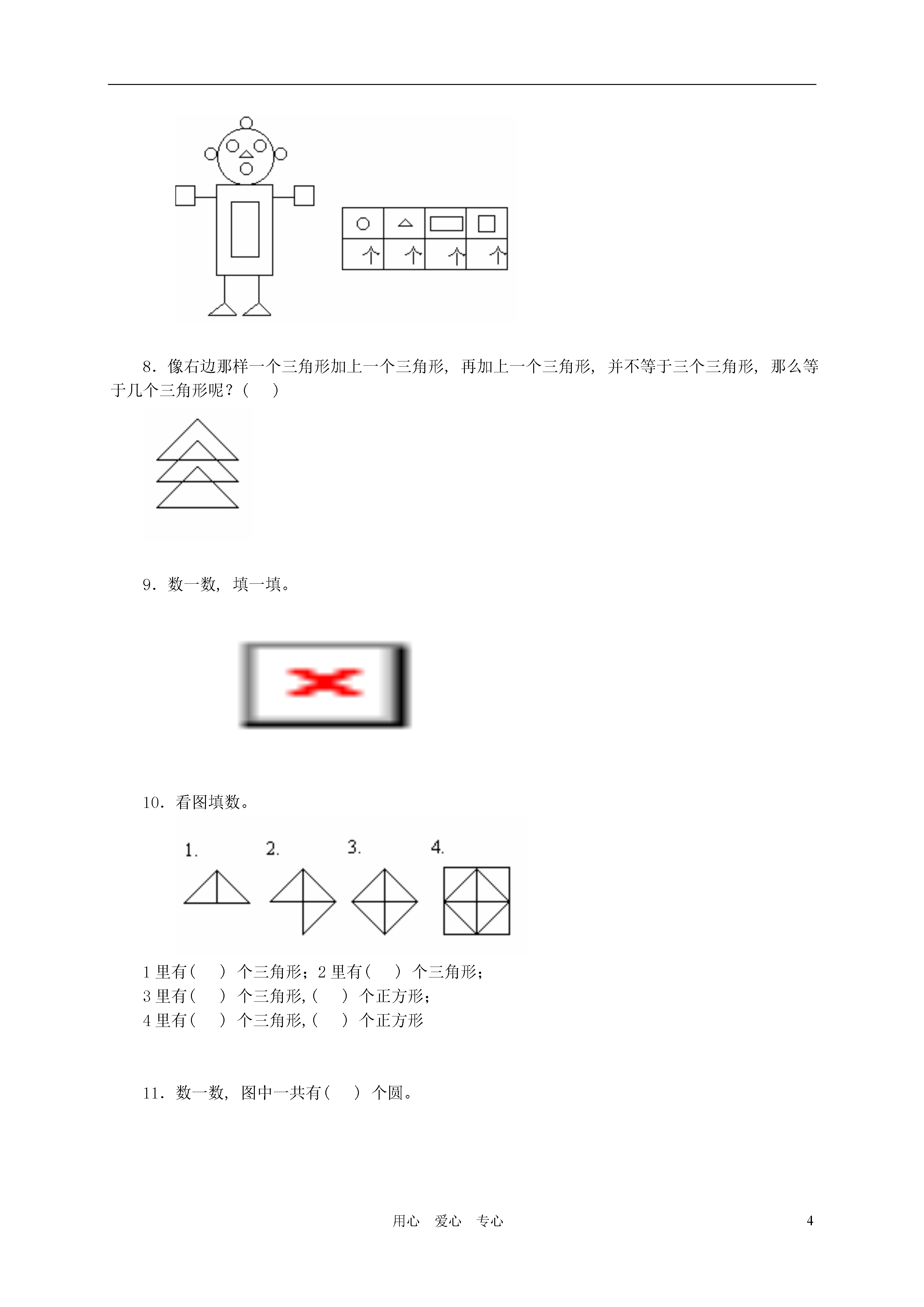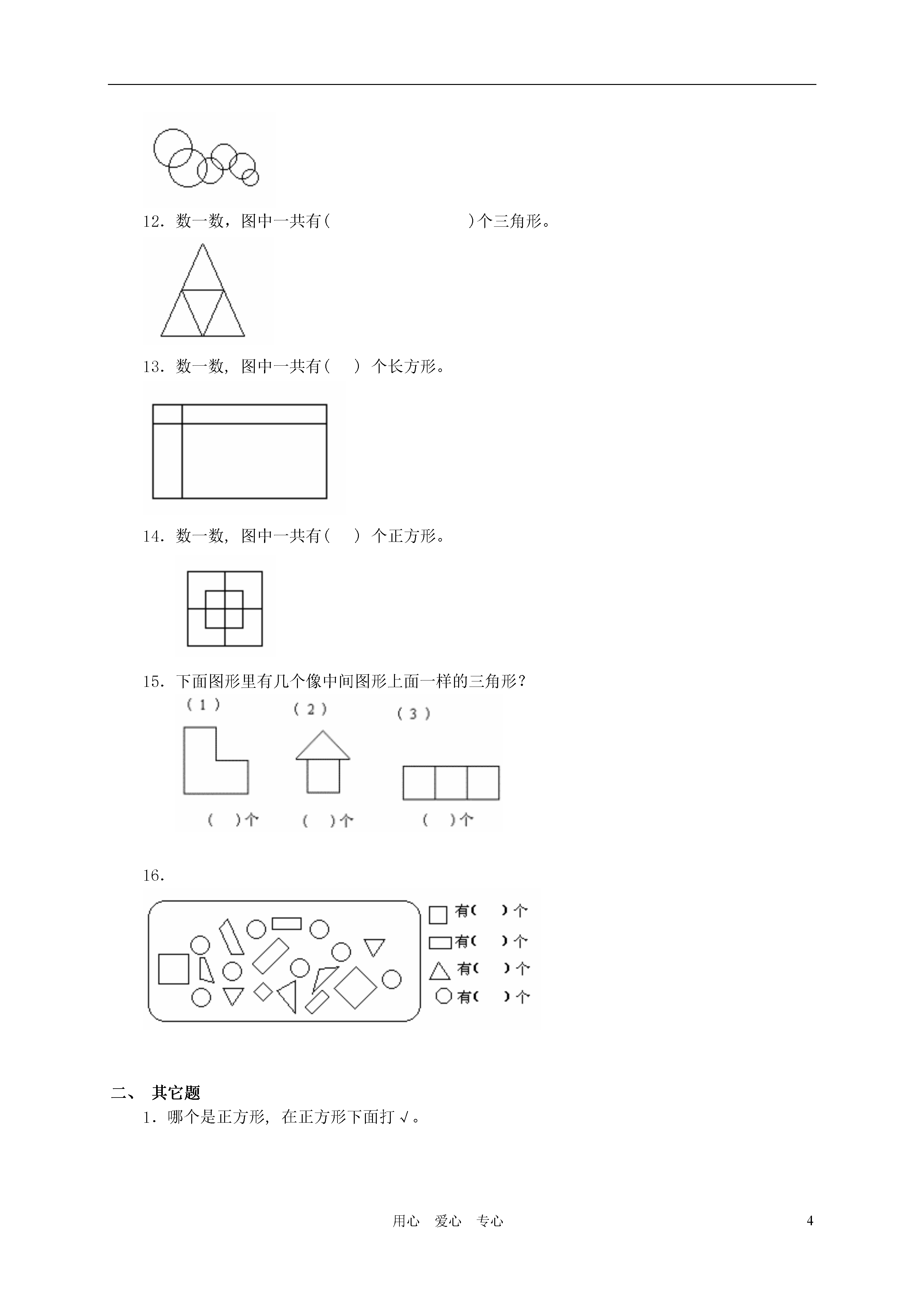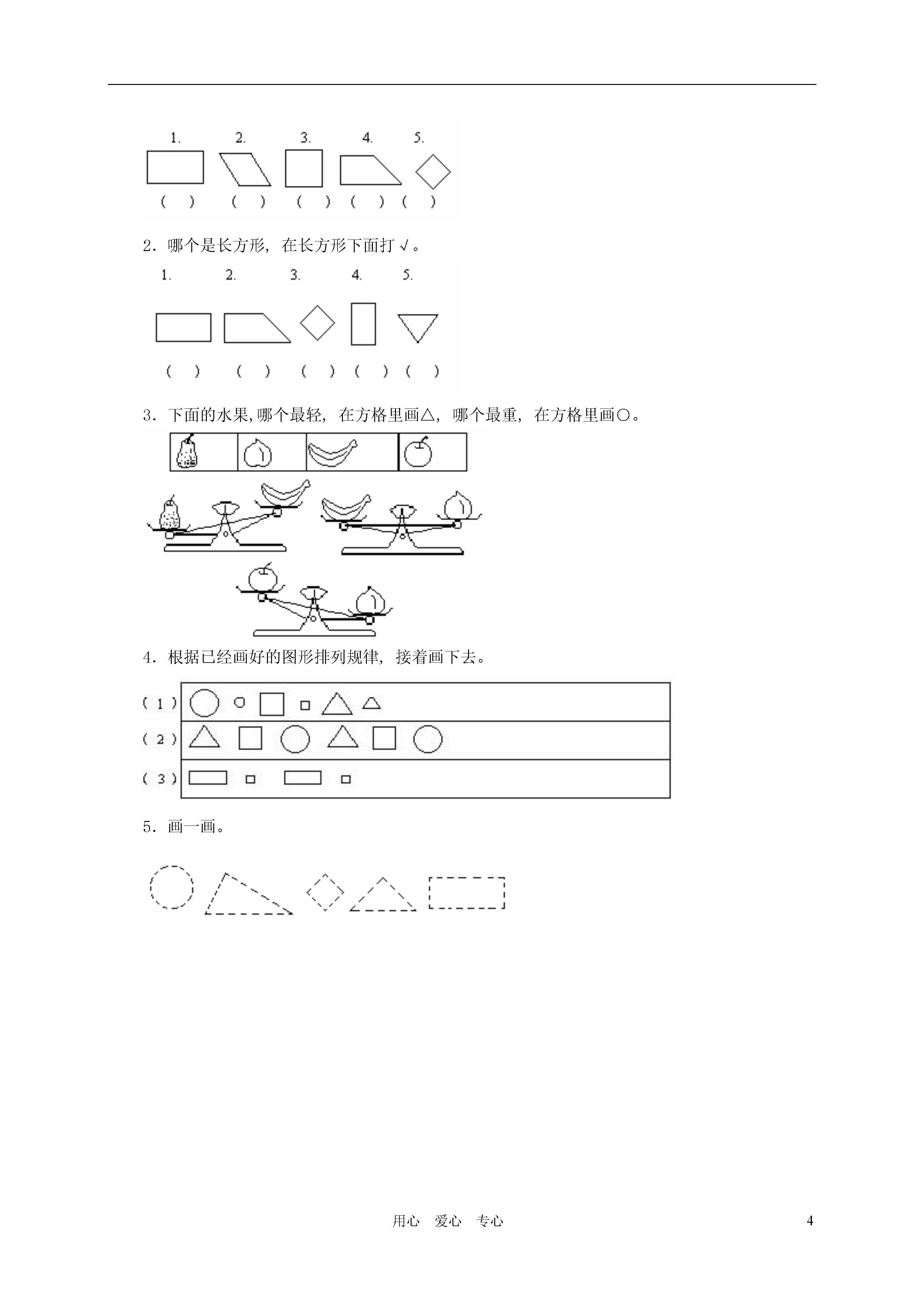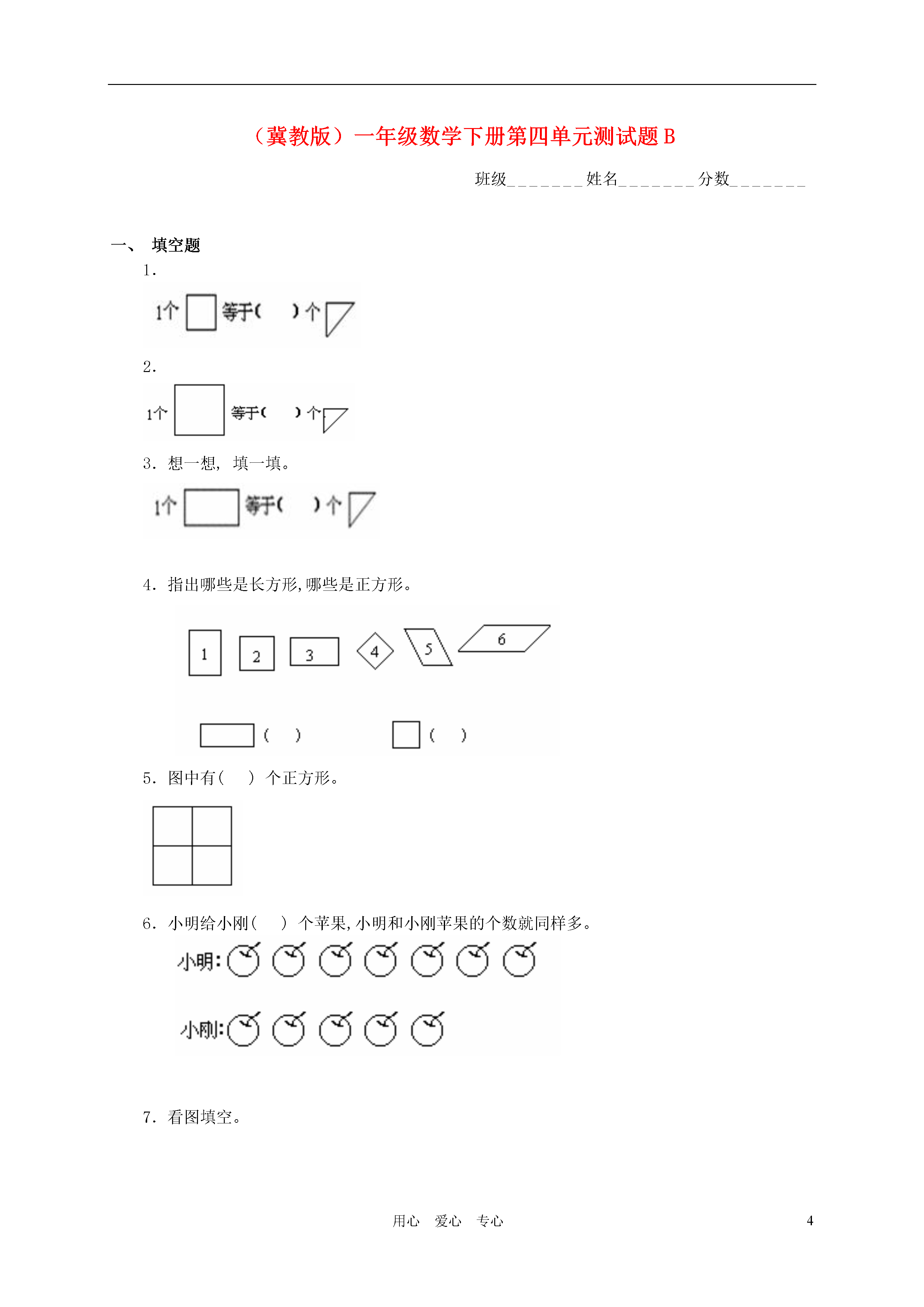 4用心爱心专心(冀教版)一年级数学下册第四单元测试题B班级_______姓名_______分数_______一、填空题1.2.3.想一想,填一填。4.指出哪些是长方形,哪些是正方形。5.图中有()个正方形。6.小明给小刚()个苹果,小明和小刚苹果的个数就同样多。7.看图填空。8.像右边那样一个三角形加上一个三角形,再加上一个三角形,并不等于三个三角形,那么等于几个三角形呢?()9.数一数,填一填。10.看图填数。1里有()个三角形;2里有()个三角形;3里有()个三角形,()个正方形;4里有()个三角形,()个正方形11.数一数,图中一共有()个圆。12.数一数,图中一共有()个三角形。13.数一数,图中一共有()个长方形。14.数一数,图中一共有()个正方形。15.下面图形里有几个像中间图形上面一样的三角形?16.二、其它题1.哪个是正方形,在正方形下面打√。2.哪个是长方形,在长方形下面打√。3.下面的水果,哪个最轻,在方格里画△,哪个最重,在方格里画○。4.根据已经画好的图形排列规律,接着画下去。5.画一画。