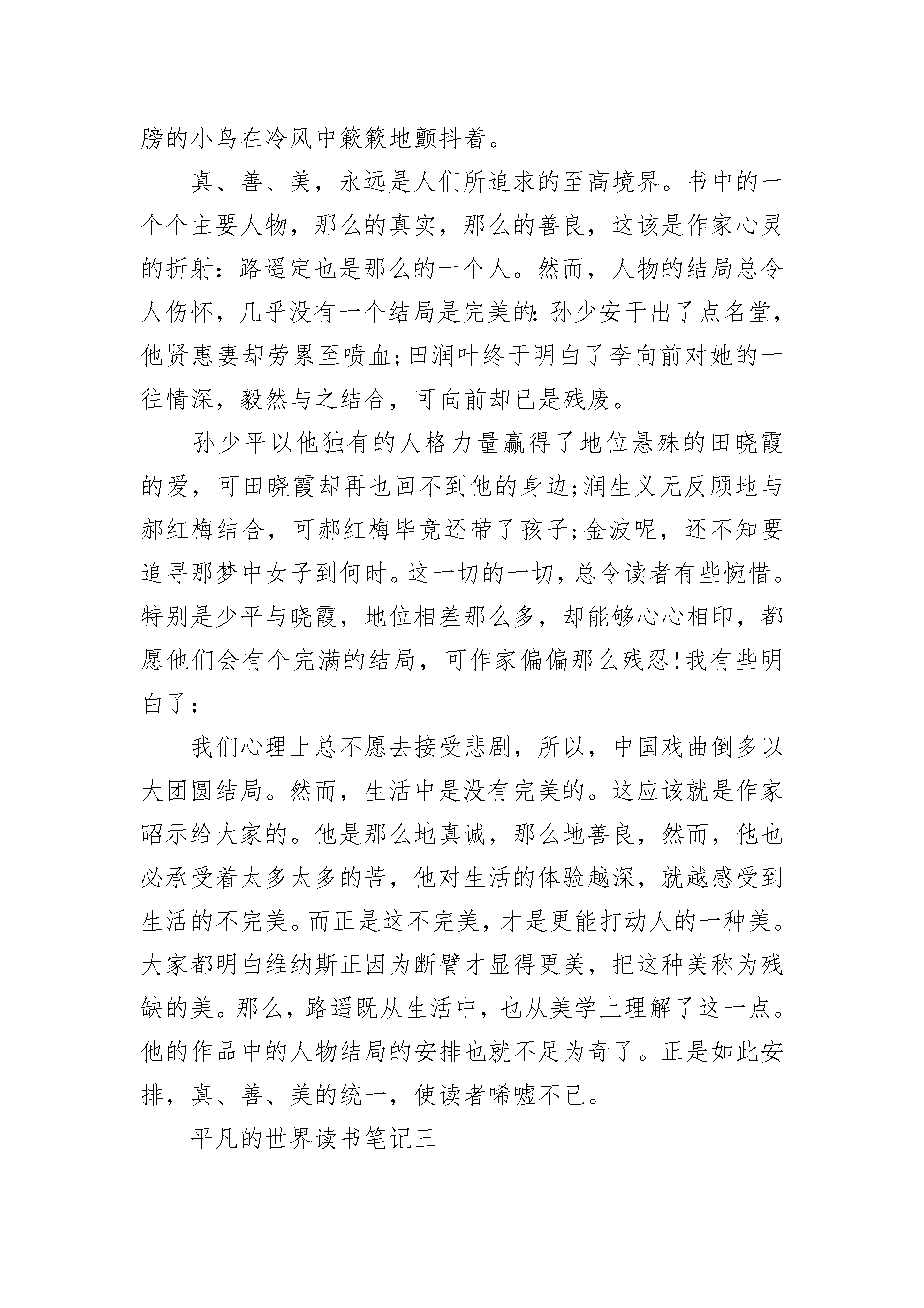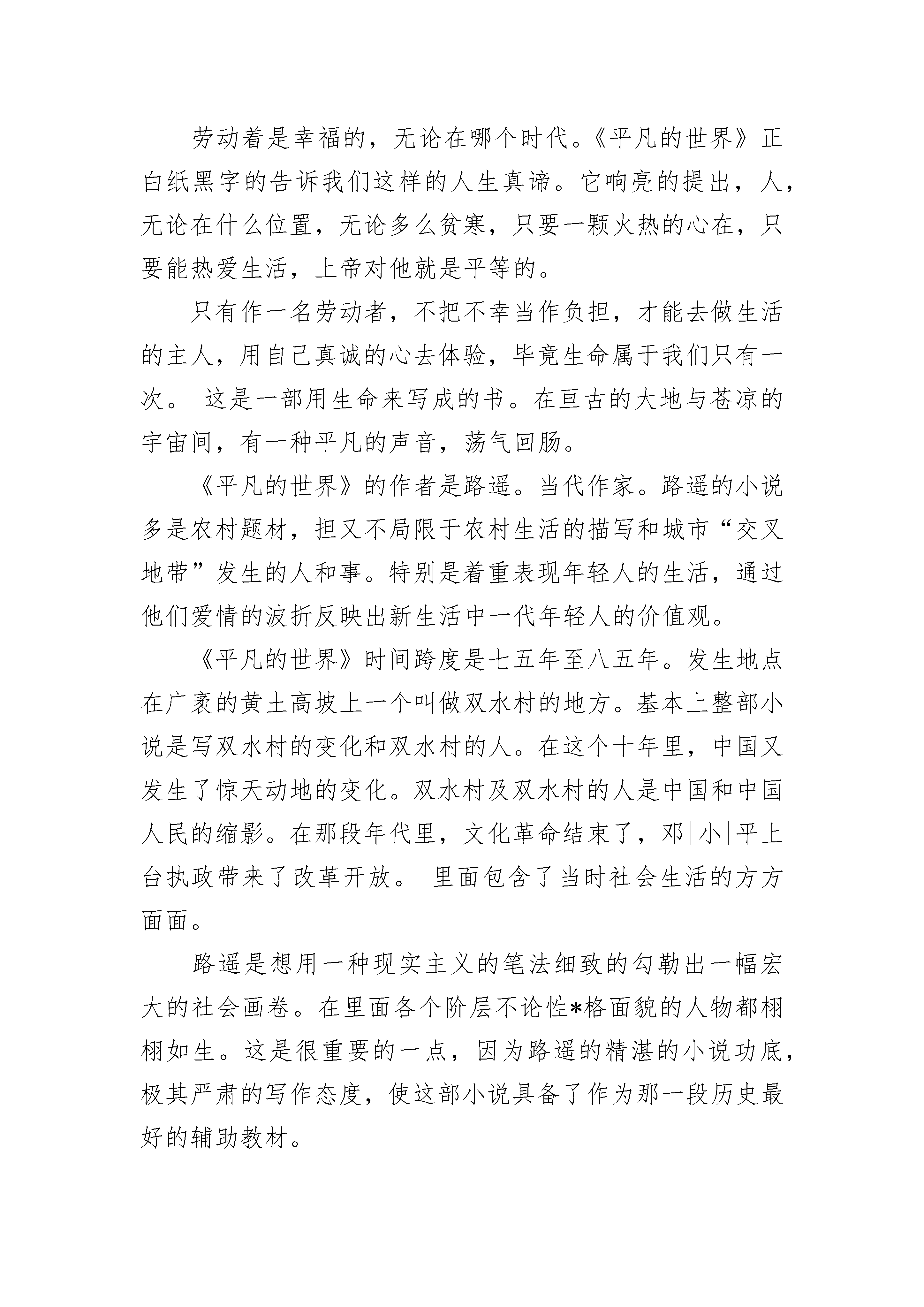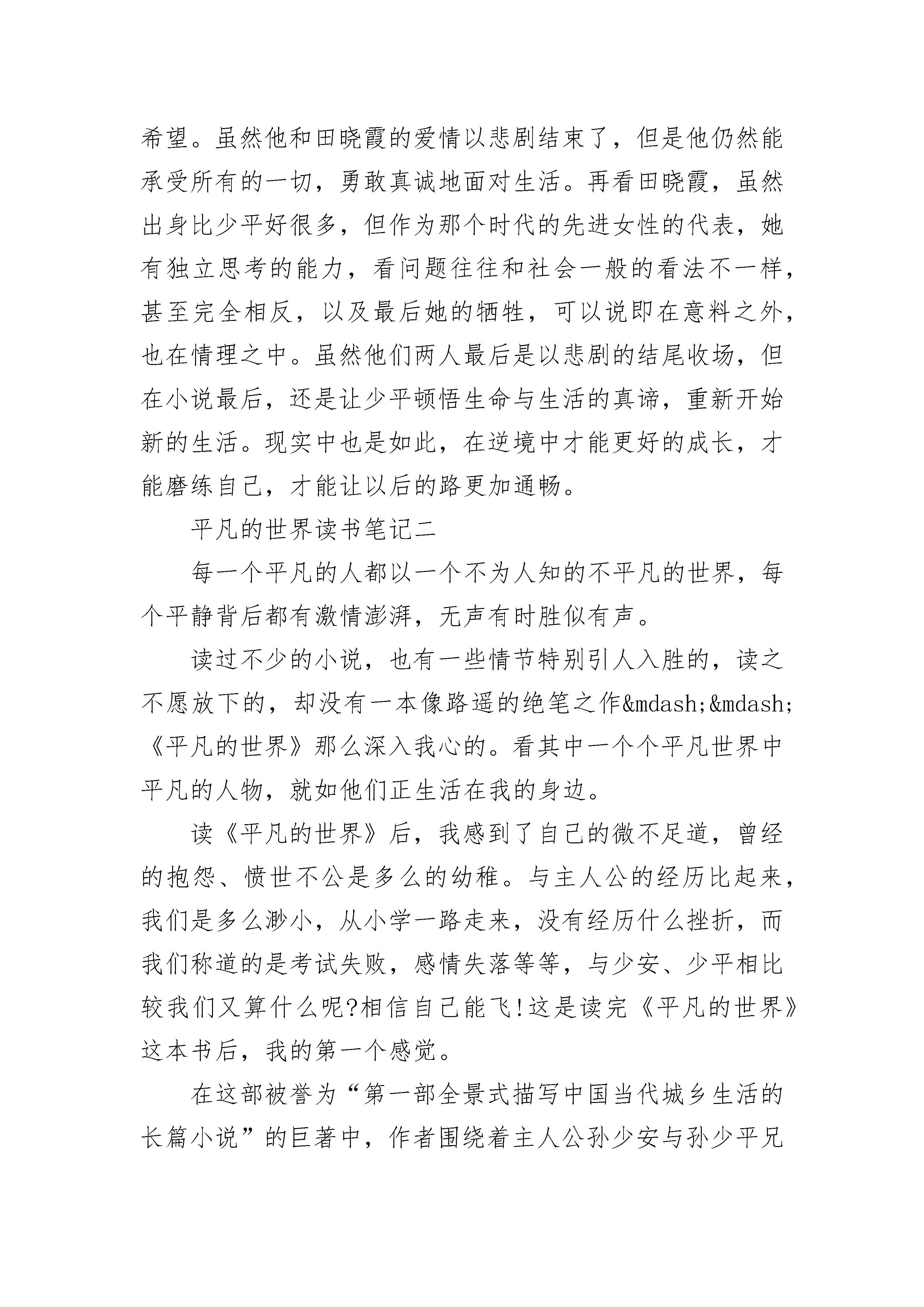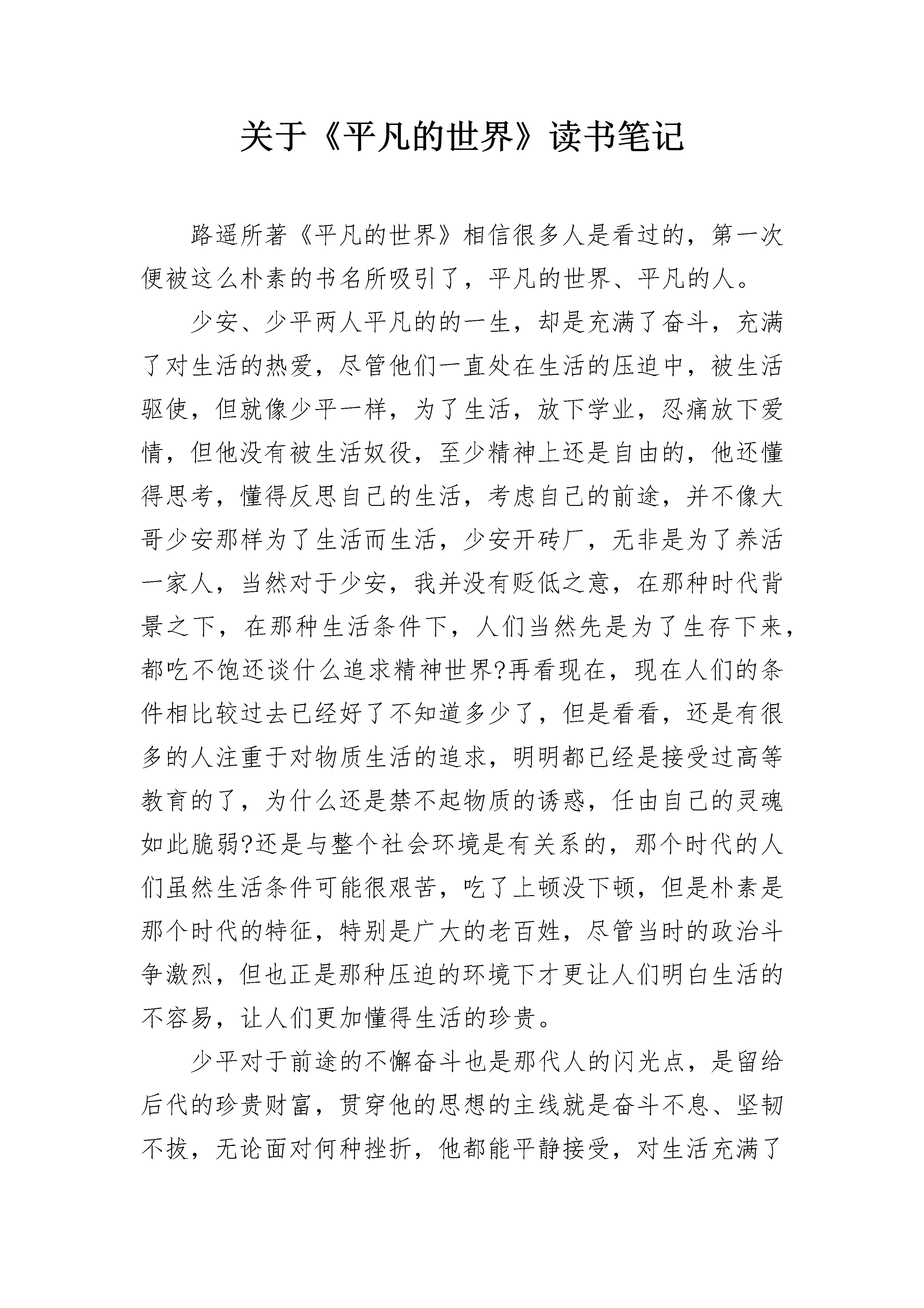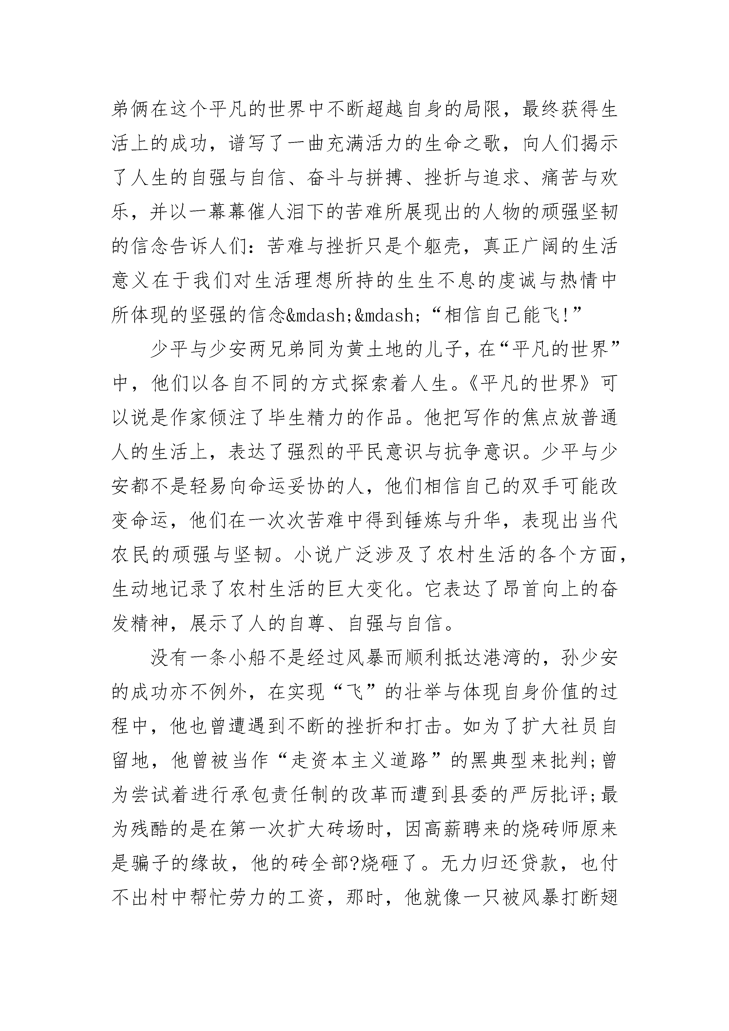 关于《平凡的世界》读书笔记路遥所著《平凡的世界》相信很多人是看过的,第一次便被这么朴素的书名所吸引了,平凡的世界、平凡的人。少安、少平两人平凡的的一生,却是充满了奋斗,充满了对生活的热爱,尽管他们一直处在生活的压迫中,被生活驱使,但就像少平一样,为了生活,放下学业,忍痛放下爱情,但他没有被生活奴役,至少精神上还是自由的,他还懂得思考,懂得反思自己的生活,考虑自己的前途,并不像大哥少安那样为了生活而生活,少安开砖厂,无非是为了养活一家人,当然对于少安,我并没有贬低之意,在那种时代背景之下,在那种生活条件下,人们当然先是为了生存下来,都吃不饱还谈什么追求精神世界?再看现在,现在人们的条件相比较过去已经好了不知道多少了,但是看看,还是有很多的人注重于对物质生活的追求,明明都已经是接受过高等教育的了,为什么还是禁不起物质的诱惑,任由自己的灵魂如此脆弱?还是与整个社会环境是有关系的,那个时代的人们虽然生活条件可能很艰苦,吃了上顿没下顿,但是朴素是那个时代的特征,特别是广大的老百姓,尽管当时的政治斗争激烈,但也正是那种压迫的环境下才更让人们明白生活的不容易,让人们更加懂得生活的珍贵。少平对于前途的不懈奋斗也是那代人的闪光点,是留给后代的珍贵财富,贯穿他的思想的主线就是奋斗不息、坚韧不拔,无论面对何种挫折,他都能平静接受,对生活充满了希望。虽然他和田晓霞的爱情以悲剧结束了,但是他仍然能承受所有的一切,勇敢真诚地面对生活。再看田晓霞,虽然出身比少平好很多,但作为那个时代的先进女性的代表,她有独立思考的能力,看问题往往和社会一般的看法不一样,甚至完全相反,以及最后她的牺牲,可以说即在意料之外,也在情理之中。虽然他们两人最后是以悲剧的结尾收场,但在小说最后,还是让少平顿悟生命与生活的真谛,重新开始新的生活。现实中也是如此,在逆境中才能更好的成长,才能磨练自己,才能让以后的路更加通畅。平凡的世界读书笔记二每一个平凡的人都以一个不为人知的不平凡的世界,每个平静背后都有激情澎湃,无声有时胜似有声。读过不少的小说,也有一些情节特别引人入胜的,读之不愿放下的,却没有一本像路遥的绝笔之作——《平凡的世界》那么深入我心的。看其中一个个平凡世界中平凡的人物,就如他们正生活在我的身边。读《平凡的世界》后,我感到了自己的微不足道,曾经的抱怨、愤世不公是多么的幼稚。与主人公的经历比起来,我们是多么渺小,从小学一路走来,没有经历什么挫折,而我们称道的是考试失败,感情失落等等,与少安、少平相比较我们又算什么呢?相信自己能飞!这是读完《平凡的世界》这本书后,我的第一个感觉。在这部被誉为“第一部全景式描写中国当代城乡生活的长篇小说”的巨著中,作者围绕着主人公孙少安与孙少平兄弟俩在这个平凡的世界中不断超越自身的局限,最终获得生活上的成功,谱写了一曲充满活力的生命之歌,向人们揭示了人生的自强与自信、奋斗与拼搏、挫折与追求、痛苦与欢乐,并以一幕幕催人泪下的苦难所展现出的人物的顽强坚韧的信念告诉人们:苦难与挫折只是个躯壳,真正广阔的生活意义在于我们对生活理想所持的生生不息的虔诚与热情中所体现的坚强的信念——“相信自己能飞!”少平与少安两兄弟同为黄土地的儿子,在“平凡的世界”中,他们以各自不同的方式探索着人生。《平凡的世界》可以说是作家倾注了毕生精力的作品。他把写作的焦点放普通人的生活上,表达了强烈的平民意识与抗争意识。少平与少安都不是轻易向命运妥协的人,他们相信自己的双手可能改变命运,他们在一次次苦难中得到锤炼与升华,表现出当代农民的顽强与坚韧。小说广泛涉及了农村生活的各个方面,生动地记录了农村生活的巨大变化。它表达了昂首向上的奋发精神,展示了人的自尊、自强与自信。没有一条小船不是经过风暴而顺利抵达港湾的,孙少安的成功亦不例外,在实现“飞”的壮举与体现自身价值的过程中,他也曾遭遇到不断的挫折和打击。如为了扩大社员自留地,他曾被当作“走资本主义道路”的黑典型来批判;曾为尝试着进行承包责任制的改革而遭到县委的严厉批评;最为残酷的是在第一次扩大砖场时,因高薪聘来的烧砖师原来是骗子的缘故,他的砖全部?烧砸了。无力归还贷款,也付不出村中帮忙劳力的工资,那时,他就像一只被风暴打断翅膀的小鸟在冷风中簌簌地颤抖着。真、善、美,永远是人们所追求的至高境界。书中的一个个主要人物,那么的真实,那么的善良,这该是作家心灵的折射:路遥定也是那么的一个人。然而,人物的结局总令人伤怀,几乎没有一个结局是完美的:孙少安干出了点名堂,他贤惠妻却劳累至喷血;田润叶终于明白了李向前对她的一往情深,毅然与之结合,可向前却已是残废。孙少平以他独有的人格力量赢得了地位悬殊的田晓霞的爱,可田晓霞却再也回不到他的身边;润生义无反顾地与郝红梅结合,可郝红梅毕竟还带了孩子;金波呢,还