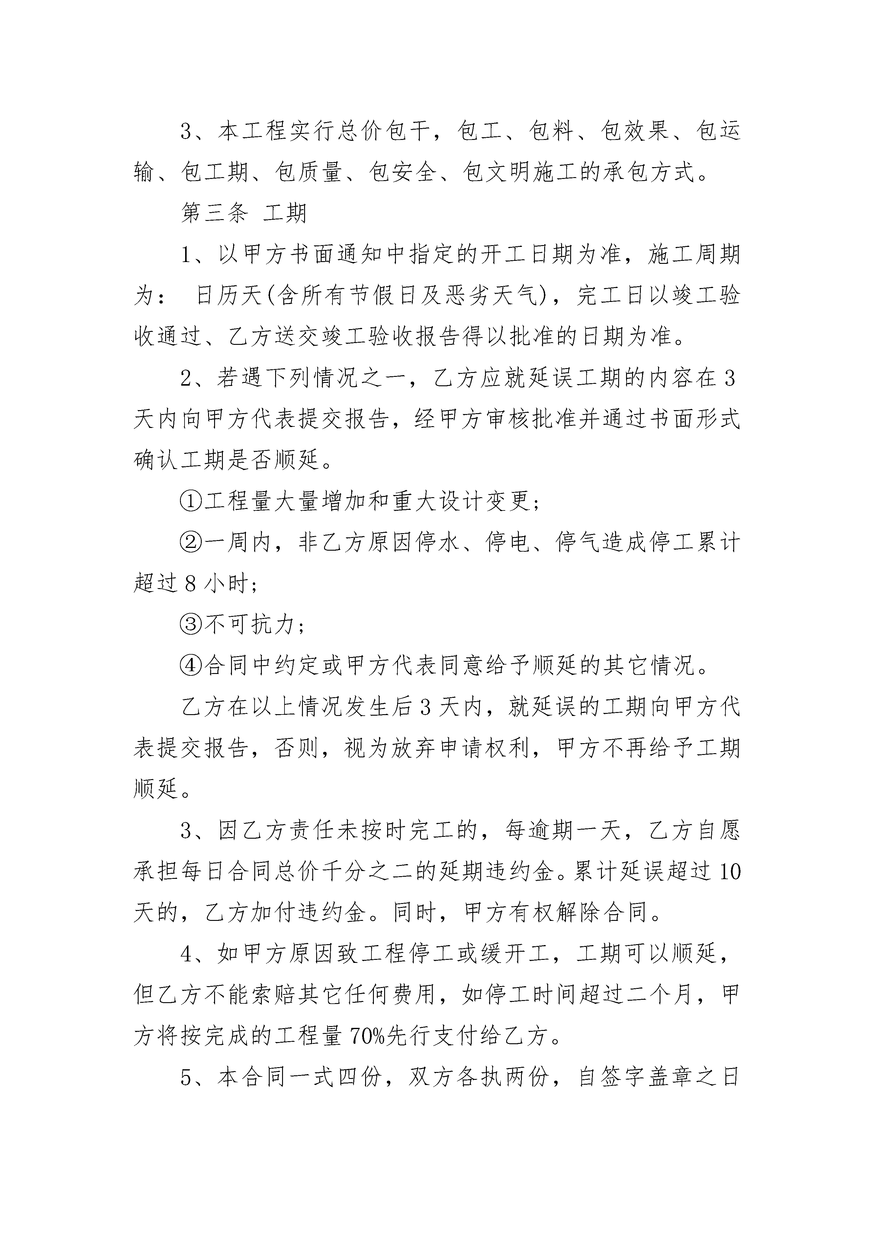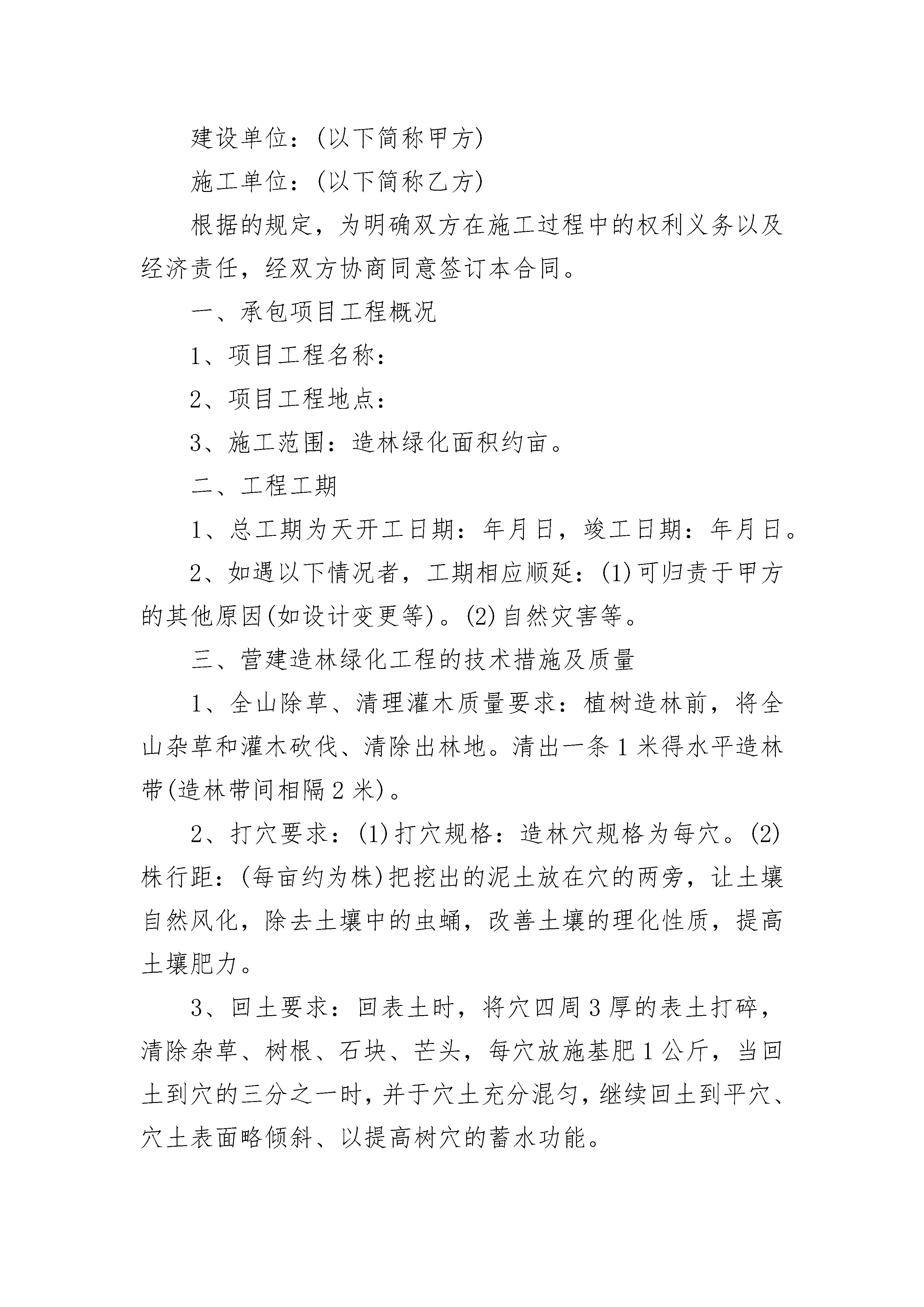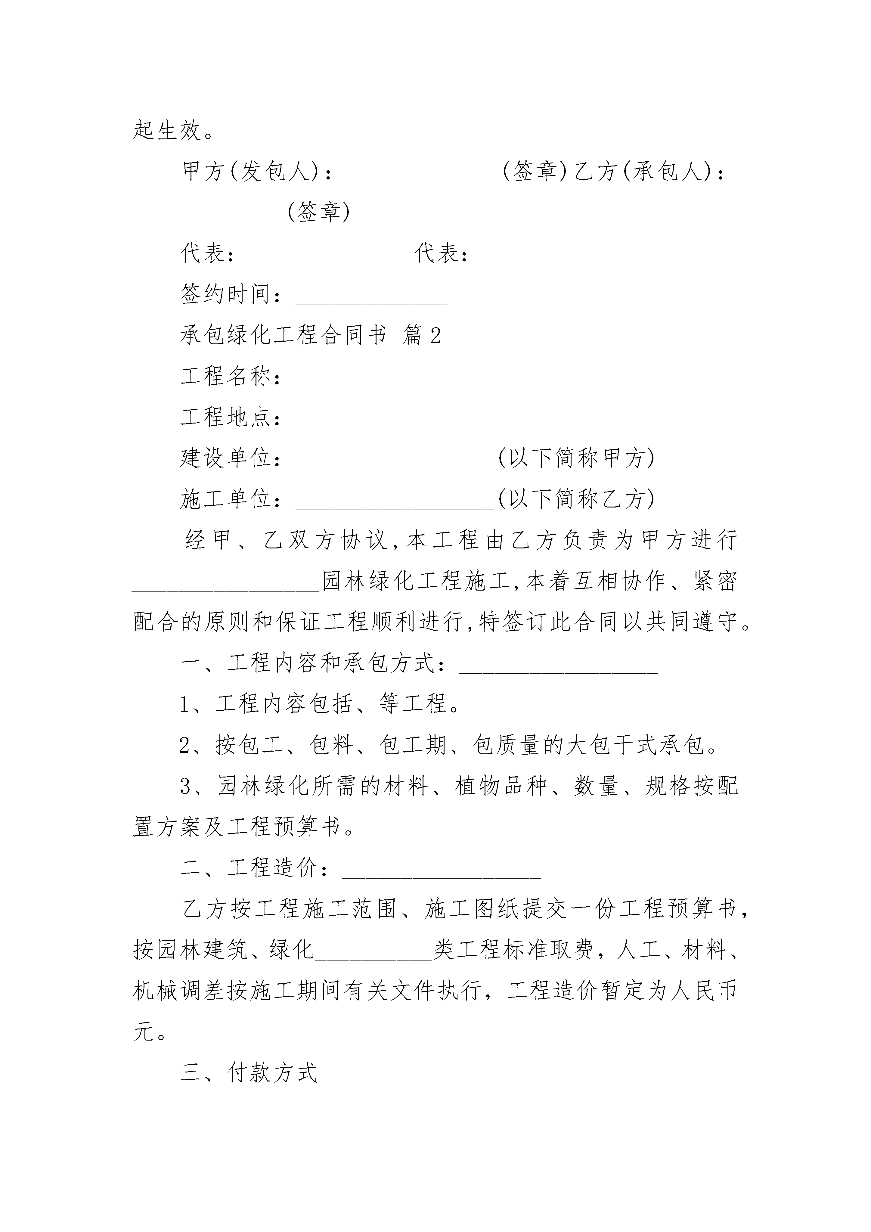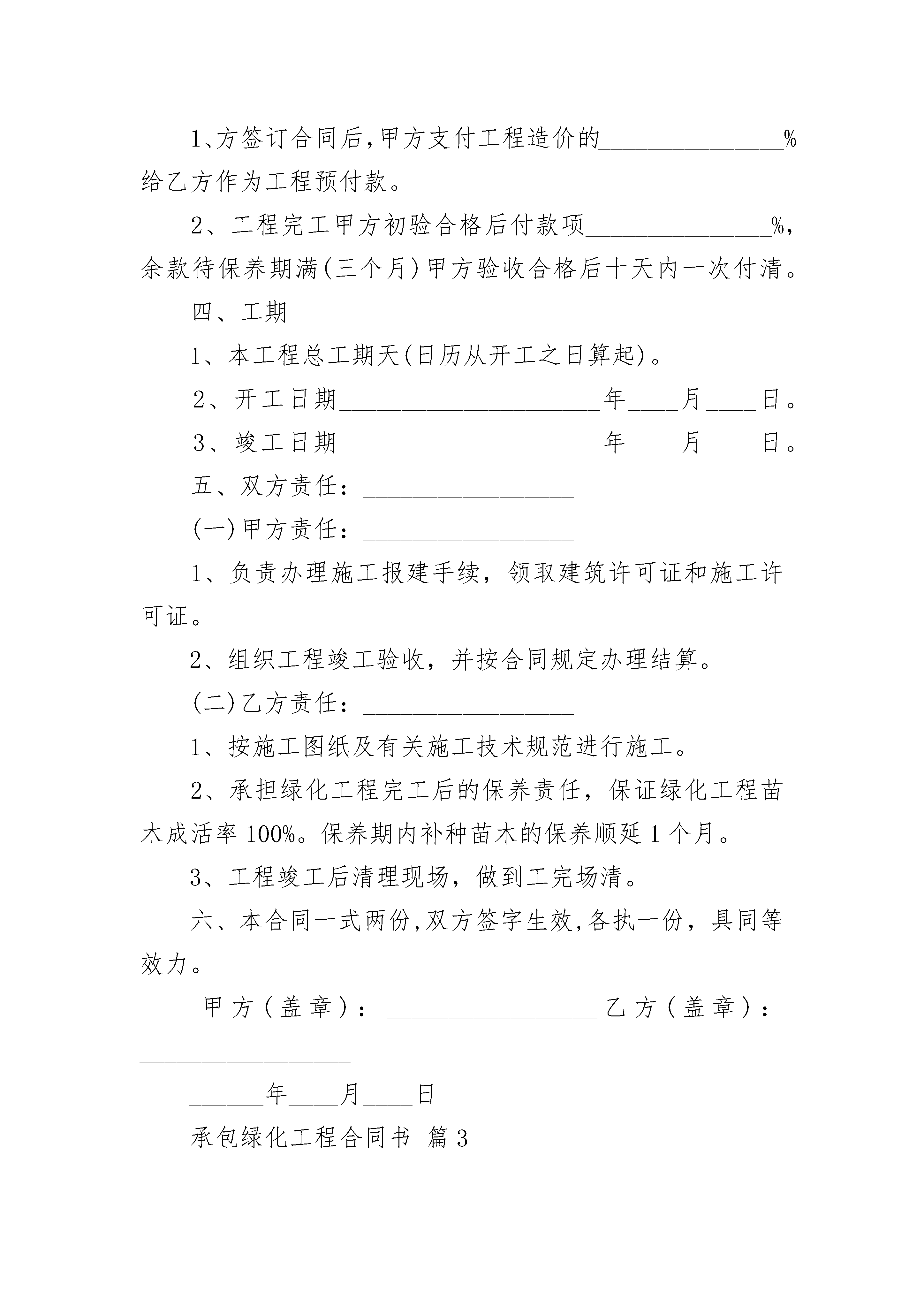 承包绿化工程合同书承包绿化工程合同书(精选24篇)承包绿化工程合同书篇1甲方(发包人):_____________乙方(承包人):____________依照《中华人民共和国民法典》及其他有关法律、行政法规,遵循平等、自愿、公平和诚实信用的原则,双方就本工程施工事项协商一致,订立本合同。第一条工程概况工程名称:___________工程地点:___________工程内容:小区施工图范围景观绿化和招标文件中所有的平基土石方、种植土回填及换填、造型,灌木、乔木植物种植,建筑铺贴及水电、灯具安装等施工图所示全部施工内容以及与本工程相关的政府部门的报验工作。第二条承包范围及承包方式(根据招标文件写)1、本次承包范围为:小区景观绿化施工图纸范围内容;2、工作内容包含完成本工程一切所需的劳务及材料,包括供料制作、运输、安装、产品保护、竣工前清洁、验收、保险、竣工资料、维修服务等,不但包括已指示或指明的主要机械及设备,并且包括整项施工安装工程得以正常操作所需的一切附带零件、所需的劳务,无论此类劳务零件是否在合同文件、工程量清单中表述。3、本工程实行总价包干,包工、包料、包效果、包运输、包工期、包质量、包安全、包文明施工的承包方式。第三条工期1、以甲方书面通知中指定的开工日期为准,施工周期为:日历天(含所有节假日及恶劣天气),完工日以竣工验收通过、乙方送交竣工验收报告得以批准的日期为准。2、若遇下列情况之一,乙方应就延误工期的内容在3天内向甲方代表提交报告,经甲方审核批准并通过书面形式确认工期是否顺延。①工程量大量增加和重大设计变更;②一周内,非乙方原因停水、停电、停气造成停工累计超过8小时;③不可抗力;④合同中约定或甲方代表同意给予顺延的其它情况。乙方在以上情况发生后3天内,就延误的工期向甲方代表提交报告,否则,视为放弃申请权利,甲方不再给予工期顺延。3、因乙方责任未按时完工的,每逾期一天,乙方自愿承担每日合同总价千分之二的延期违约金。累计延误超过10天的,乙方加付违约金。同时,甲方有权解除合同。4、如甲方原因致工程停工或缓开工,工期可以顺延,但乙方不能索赔其它任何费用,如停工时间超过二个月,甲方将按完成的工程量70%先行支付给乙方。5、本合同一式四份,双方各执两份,自签字盖章之日起生效。甲方(发包人):_____________(签章)乙方(承包人):_____________(签章)代表:_____________代表:_____________签约时间:_____________承包绿化工程合同书篇2工程名称:_________________工程地点:_________________建设单位:_________________(以下简称甲方)施工单位:_________________(以下简称乙方)经甲、乙双方协议,本工程由乙方负责为甲方进行________________园林绿化工程施工,本着互相协作、紧密配合的原则和保证工程顺利进行,特签订此合同以共同遵守。一、工程内容和承包方式:_________________1、工程内容包括、等工程。2、按包工、包料、包工期、包质量的大包干式承包。3、园林绿化所需的材料、植物品种、数量、规格按配置方案及工程预算书。二、工程造价:_________________乙方按工程施工范围、施工图纸提交一份工程预算书,按园林建筑、绿化__________类工程标准取费,人工、材料、机械调差按施工期间有关文件执行,工程造价暂定为人民币元。三、付款方式1、方签订合同后,甲方支付工程造价的_______________%给乙方作为工程预付款。2、工程完工甲方初验合格后付款项_______________%,余款待保养期满(三个月)甲方验收合格后十天内一次付清。四、工期1、本工程总工期天(日历从开工之日算起)。2、开工日期_____________________年____月____日。3、竣工日期_____________________年____月____日。五、双方责任:_________________(一)甲方责任:_________________1、负责办理施工报建手续,领取建筑许可证和施工许可证。2、组织工程竣工验收,并按合同规定办理结算。(二)乙方责任:_________________1、按施工图纸及有关施工技术规范进行施工。2、承担绿化工程完工后的保养责任,保证绿化工程苗木成活率100%。保养期内补种苗木的保养顺延1个月。3、工程竣工后清理现场,做到工完场清。六、本合同一式两份,双方签字生效,各执一份,具同等效力。甲方(盖章):_________________乙方(盖章):_______________________年____月____日承包绿化工程合同书篇3建设单位:(