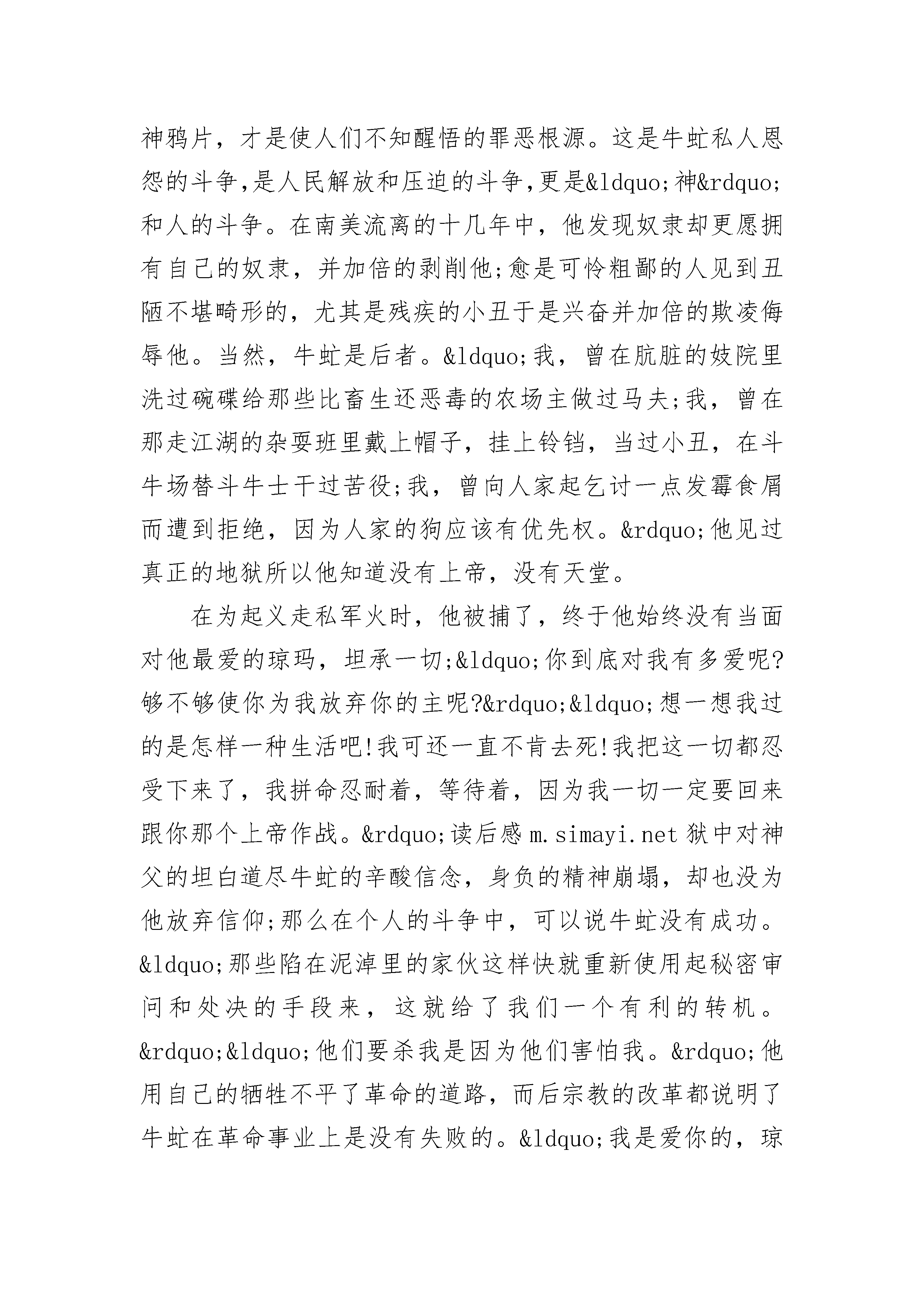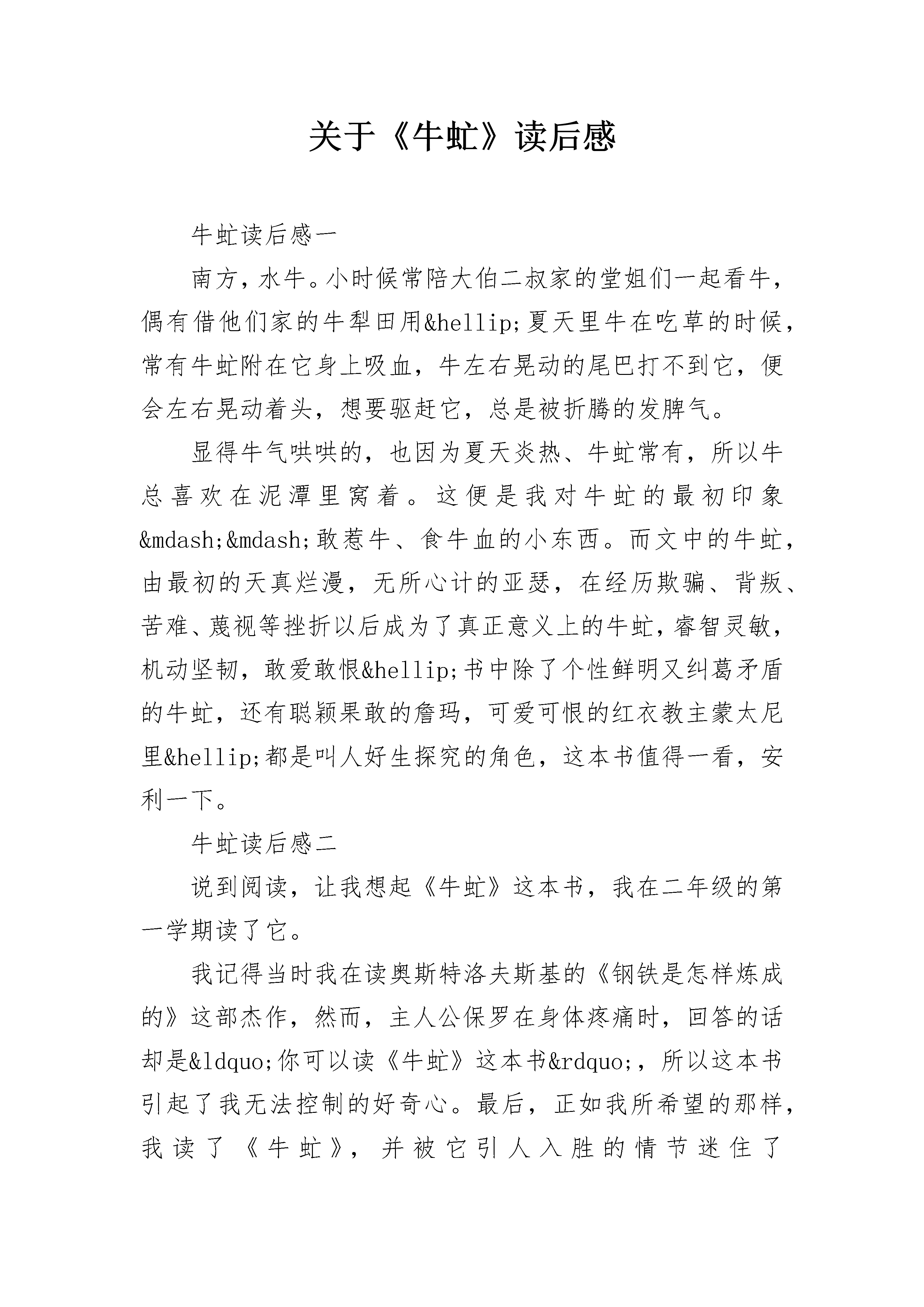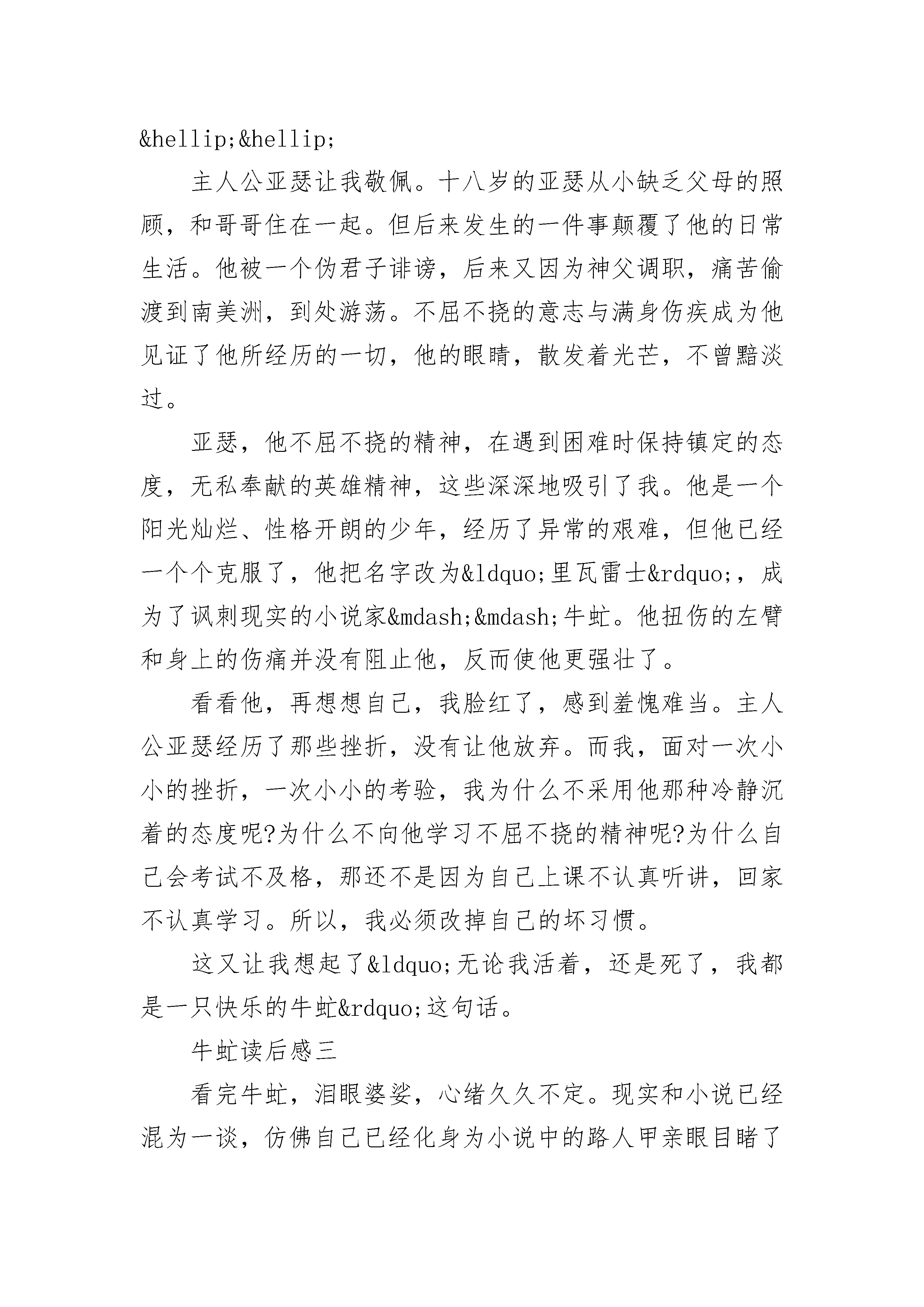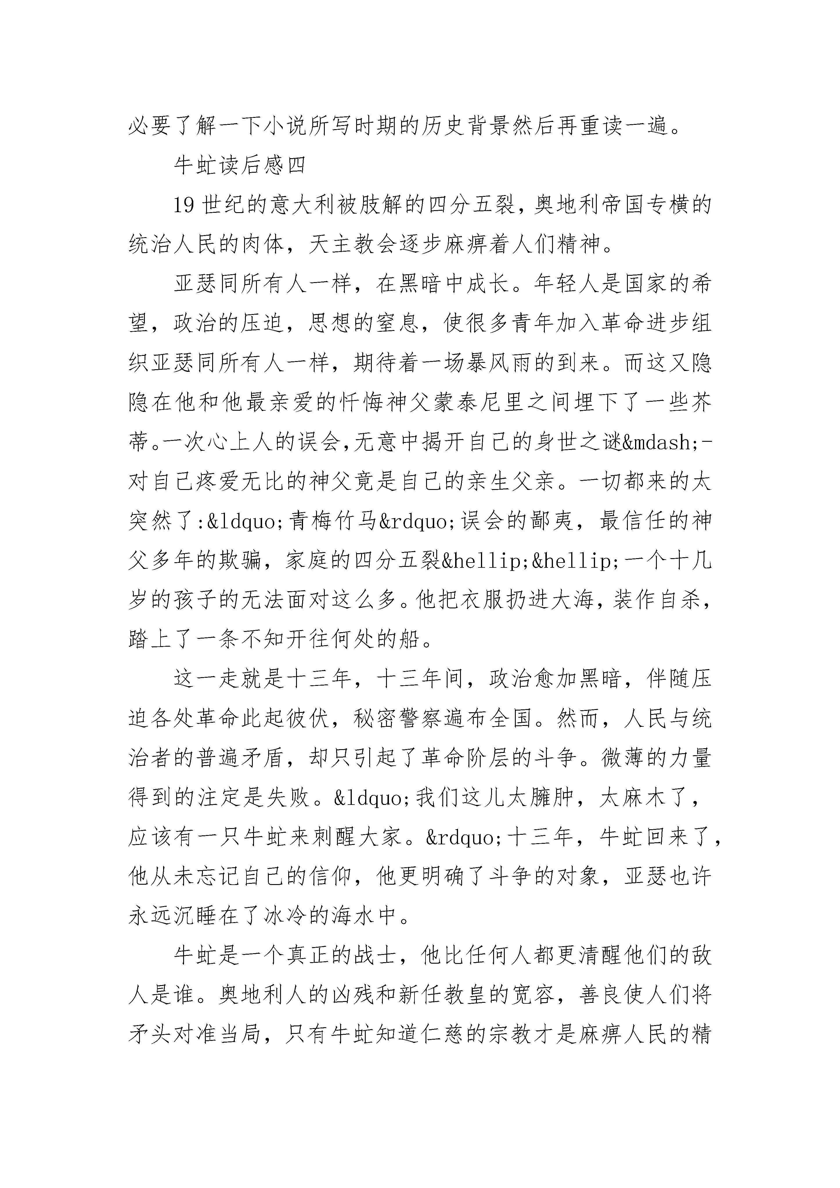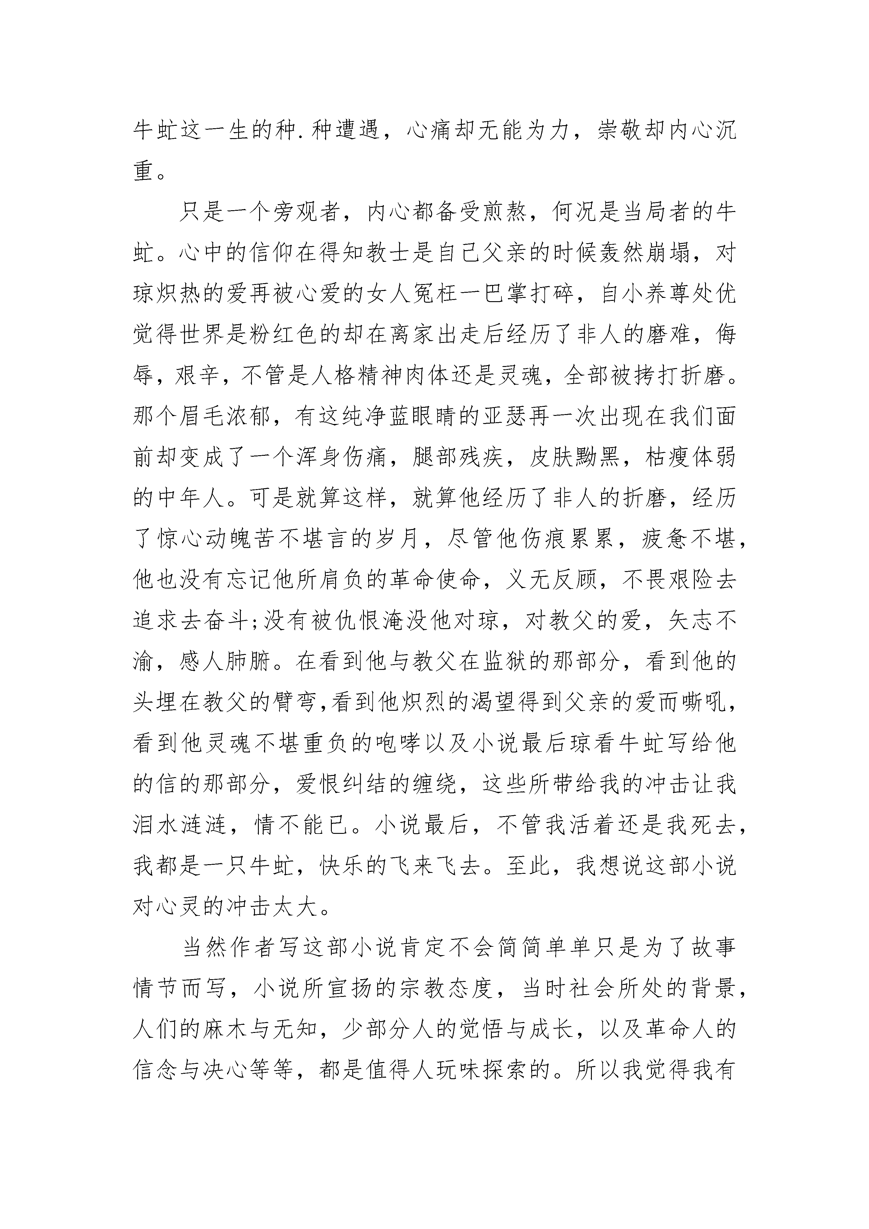 关于《牛虻》读后感牛虻读后感一南方,水牛。小时候常陪大伯二叔家的堂姐们一起看牛,偶有借他们家的牛犁田用…夏天里牛在吃草的时候,常有牛虻附在它身上吸血,牛左右晃动的尾巴打不到它,便会左右晃动着头,想要驱赶它,总是被折腾的发脾气。显得牛气哄哄的,也因为夏天炎热、牛虻常有,所以牛总喜欢在泥潭里窝着。这便是我对牛虻的最初印象——敢惹牛、食牛血的小东西。而文中的牛虻,由最初的天真烂漫,无所心计的亚瑟,在经历欺骗、背叛、苦难、蔑视等挫折以后成为了真正意义上的牛虻,睿智灵敏,机动坚韧,敢爱敢恨…书中除了个性鲜明又纠葛矛盾的牛虻,还有聪颖果敢的詹玛,可爱可恨的红衣教主蒙太尼里…都是叫人好生探究的角色,这本书值得一看,安利一下。牛虻读后感二说到阅读,让我想起《牛虻》这本书,我在二年级的第一学期读了它。我记得当时我在读奥斯特洛夫斯基的《钢铁是怎样炼成的》这部杰作,然而,主人公保罗在身体疼痛时,回答的话却是“你可以读《牛虻》这本书”,所以这本书引起了我无法控制的好奇心。最后,正如我所希望的那样,我读了《牛虻》,并被它引人入胜的情节迷住了……主人公亚瑟让我敬佩。十八岁的亚瑟从小缺乏父母的照顾,和哥哥住在一起。但后来发生的一件事颠覆了他的日常生活。他被一个伪君子诽谤,后来又因为神父调职,痛苦偷渡到南美洲,到处游荡。不屈不挠的意志与满身伤疾成为他见证了他所经历的一切,他的眼睛,散发着光芒,不曾黯淡过。亚瑟,他不屈不挠的精神,在遇到困难时保持镇定的态度,无私奉献的英雄精神,这些深深地吸引了我。他是一个阳光灿烂、性格开朗的少年,经历了异常的艰难,但他已经一个个克服了,他把名字改为“里瓦雷士”,成为了讽刺现实的小说家——牛虻。他扭伤的左臂和身上的伤痛并没有阻止他,反而使他更强壮了。看看他,再想想自己,我脸红了,感到羞愧难当。主人公亚瑟经历了那些挫折,没有让他放弃。而我,面对一次小小的挫折,一次小小的考验,我为什么不采用他那种冷静沉着的态度呢?为什么不向他学习不屈不挠的精神呢?为什么自己会考试不及格,那还不是因为自己上课不认真听讲,回家不认真学习。所以,我必须改掉自己的坏习惯。这又让我想起了“无论我活着,还是死了,我都是一只快乐的牛虻”这句话。牛虻读后感三看完牛虻,泪眼婆娑,心绪久久不定。现实和小说已经混为一谈,仿佛自己已经化身为小说中的路人甲亲眼目睹了牛虻这一生的种.种遭遇,心痛却无能为力,崇敬却内心沉重。只是一个旁观者,内心都备受煎熬,何况是当局者的牛虻。心中的信仰在得知教士是自己父亲的时候轰然崩塌,对琼炽热的爱再被心爱的女人冤枉一巴掌打碎,自小养尊处优觉得世界是粉红色的却在离家出走后经历了非人的磨难,侮辱,艰辛,不管是人格精神肉体还是灵魂,全部被拷打折磨。那个眉毛浓郁,有这纯净蓝眼睛的亚瑟再一次出现在我们面前却变成了一个浑身伤痛,腿部残疾,皮肤黝黑,枯瘦体弱的中年人。可是就算这样,就算他经历了非人的折磨,经历了惊心动魄苦不堪言的岁月,尽管他伤痕累累,疲惫不堪,他也没有忘记他所肩负的革命使命,义无反顾,不畏艰险去追求去奋斗;没有被仇恨淹没他对琼,对教父的爱,矢志不渝,感人肺腑。在看到他与教父在监狱的那部分,看到他的头埋在教父的臂弯,看到他炽烈的渴望得到父亲的爱而嘶吼,看到他灵魂不堪重负的咆哮以及小说最后琼看牛虻写给他的信的那部分,爱恨纠结的缠绕,这些所带给我的冲击让我泪水涟涟,情不能已。小说最后,不管我活着还是我死去,我都是一只牛虻,快乐的飞来飞去。至此,我想说这部小说对心灵的冲击太大。当然作者写这部小说肯定不会简简单单只是为了故事情节而写,小说所宣扬的宗教态度,当时社会所处的背景,人们的麻木与无知,少部分人的觉悟与成长,以及革命人的信念与决心等等,都是值得人玩味探索的。所以我觉得我有必要了解一下小说所写时期的历史背景然后再重读一遍。牛虻读后感四19世纪的意大利被肢解的四分五裂,奥地利帝国专横的统治人民的肉体,天主教会逐步麻痹着人们精神。亚瑟同所有人一样,在黑暗中成长。年轻人是国家的希望,政治的压迫,思想的窒息,使很多青年加入革命进步组织亚瑟同所有人一样,期待着一场暴风雨的到来。而这又隐隐在他和他最亲爱的忏悔神父蒙泰尼里之间埋下了一些芥蒂。一次心上人的误会,无意中揭开自己的身世之谜—-对自己疼爱无比的神父竟是自己的亲生父亲。一切都来的太突然了:“青梅竹马”误会的鄙夷,最信任的神父多年的欺骗,家庭的四分五裂……一个十几岁的孩子的无法面对这么多。他把衣服扔进大海,装作自杀,踏上了一条不知开往何处的船。这一走就