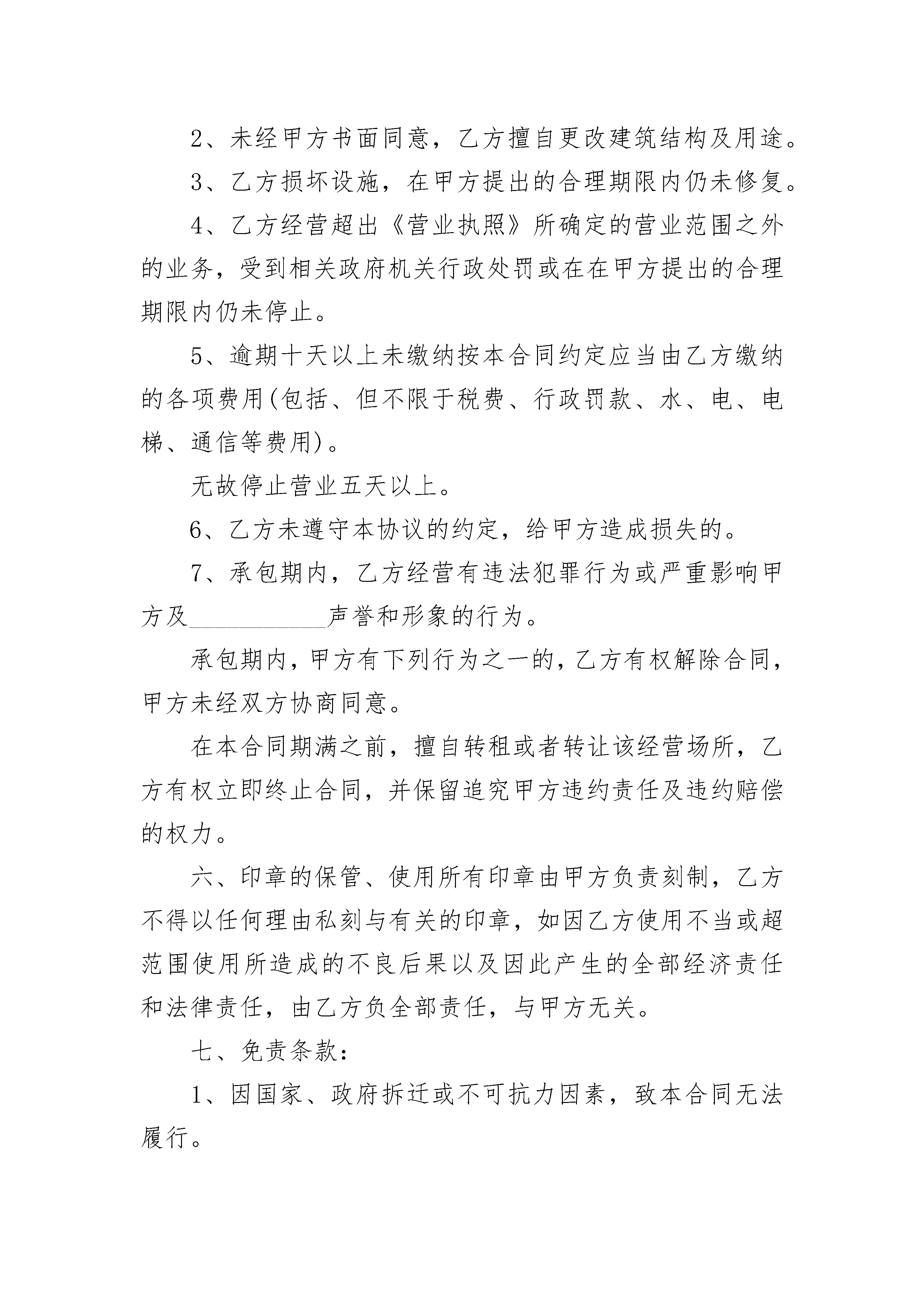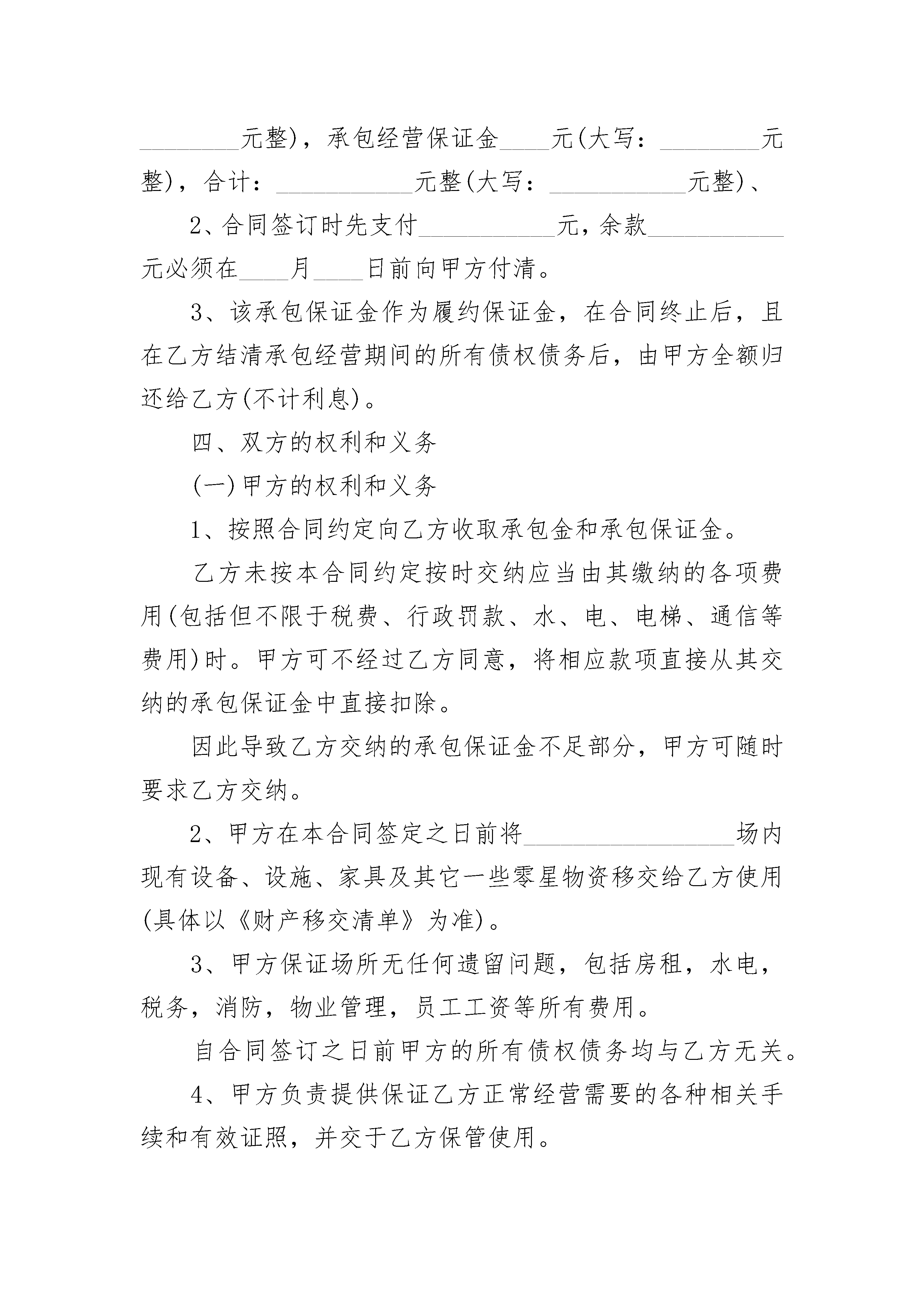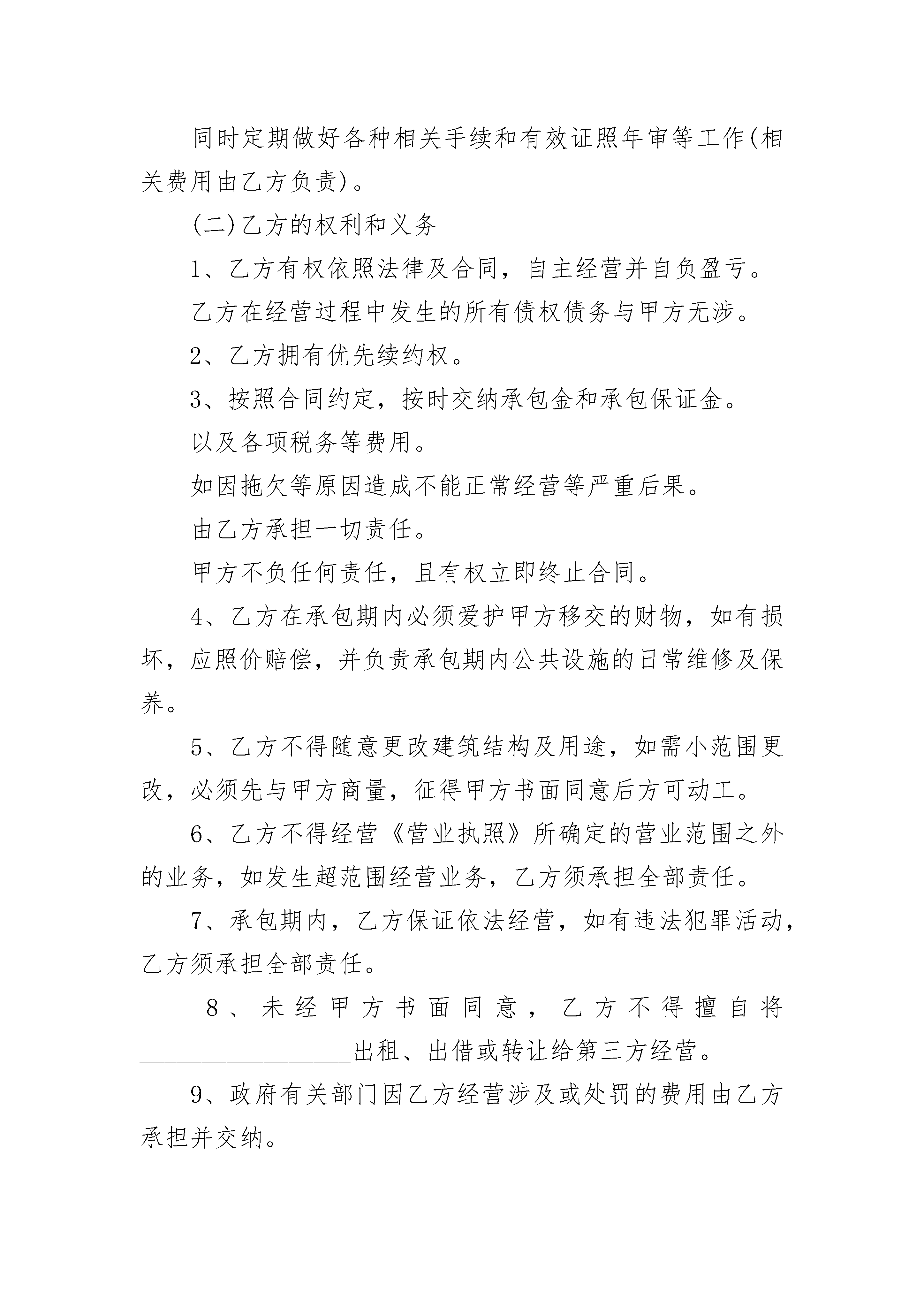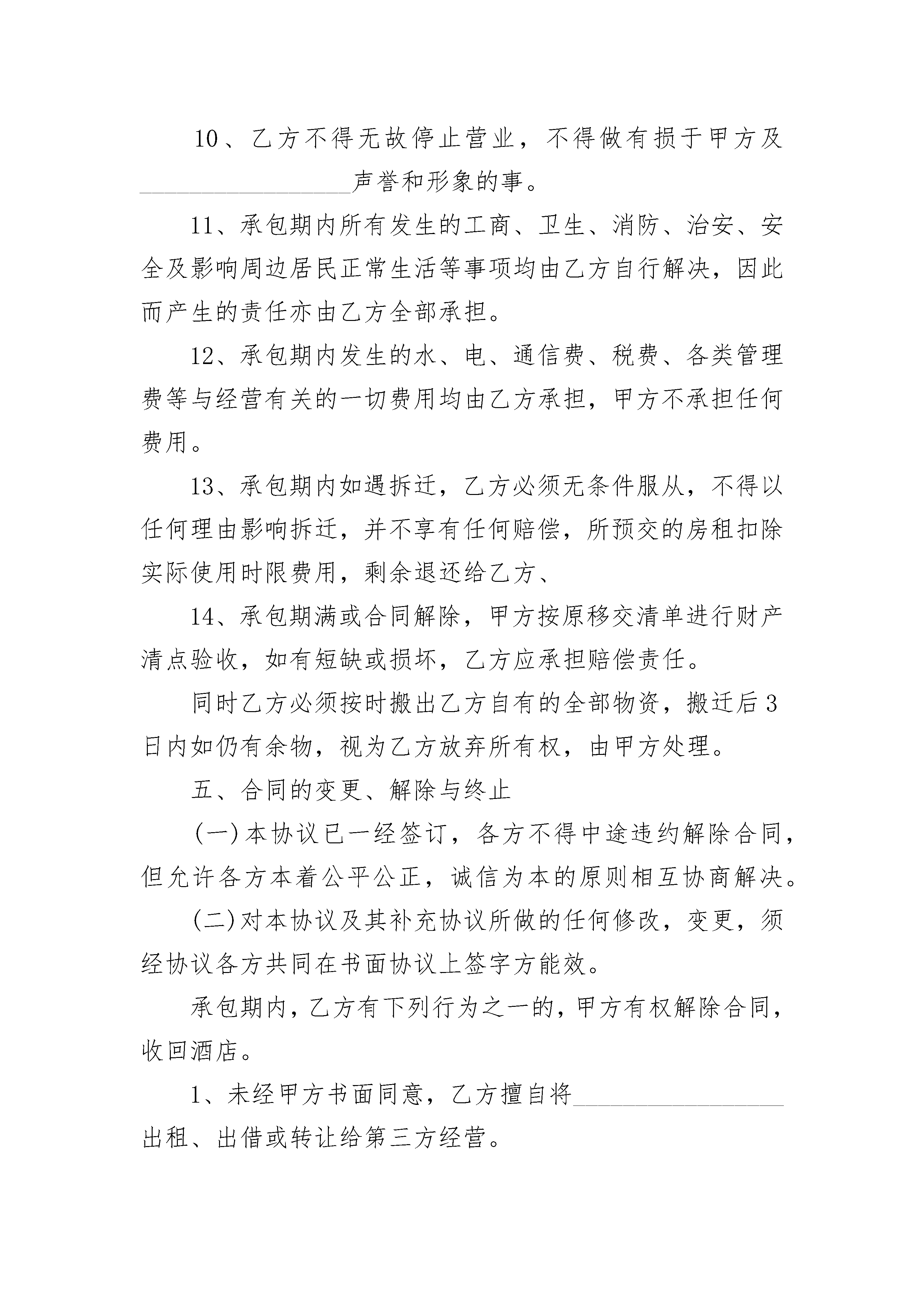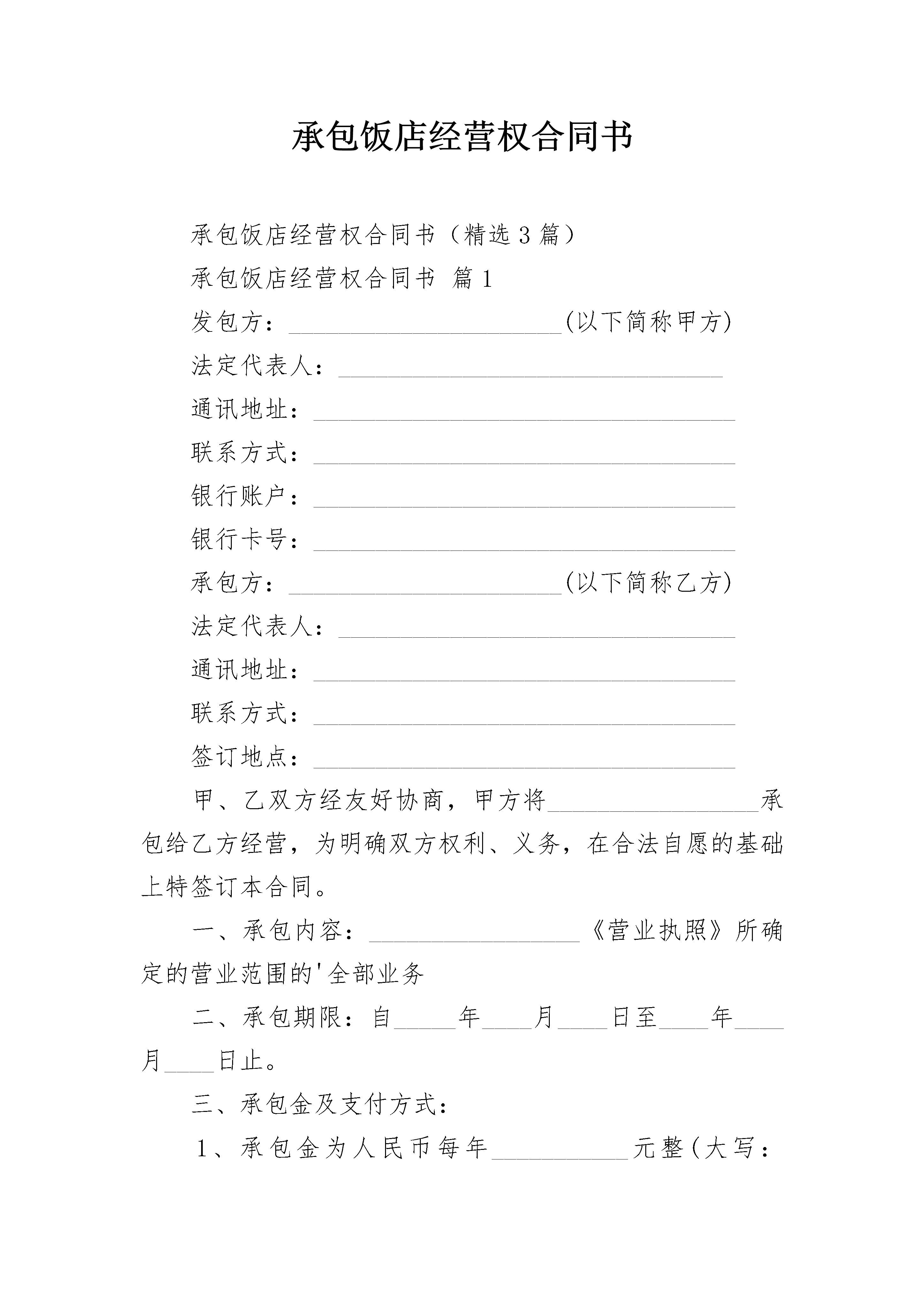 承包饭店经营权合同书承包饭店经营权合同书(精选3篇)承包饭店经营权合同书篇1发包方:______________________(以下简称甲方)法定代表人:_______________________________通讯地址:__________________________________联系方式:__________________________________银行账户:__________________________________银行卡号:__________________________________承包方:______________________(以下简称乙方)法定代表人:________________________________通讯地址:__________________________________联系方式:__________________________________签订地点:__________________________________甲、乙双方经友好协商,甲方将_________________承包给乙方经营,为明确双方权利、义务,在合法自愿的基础上特签订本合同。一、承包内容:_________________《营业执照》所确定的营业范围的'全部业务二、承包期限:自_____年____月____日至____年____月____日止。三、承包金及支付方式:1、承包金为人民币每年___________元整(大写:________元整),承包经营保证金____元(大写:________元整),合计:___________元整(大写:___________元整)、2、合同签订时先支付___________元,余款___________元必须在____月____日前向甲方付清。3、该承包保证金作为履约保证金,在合同终止后,且在乙方结清承包经营期间的所有债权债务后,由甲方全额归还给乙方(不计利息)。四、双方的权利和义务(一)甲方的权利和义务1、按照合同约定向乙方收取承包金和承包保证金。乙方未按本合同约定按时交纳应当由其缴纳的各项费用(包括但不限于税费、行政罚款、水、电、电梯、通信等费用)时。甲方可不经过乙方同意,将相应款项直接从其交纳的承包保证金中直接扣除。因此导致乙方交纳的承包保证金不足部分,甲方可随时要求乙方交纳。2、甲方在本合同签定之日前将_________________场内现有设备、设施、家具及其它一些零星物资移交给乙方使用(具体以《财产移交清单》为准)。3、甲方保证场所无任何遗留问题,包括房租,水电,税务,消防,物业管理,员工工资等所有费用。自合同签订之日前甲方的所有债权债务均与乙方无关。4、甲方负责提供保证乙方正常经营需要的各种相关手续和有效证照,并交于乙方保管使用。同时定期做好各种相关手续和有效证照年审等工作(相关费用由乙方负责)。(二)乙方的权利和义务1、乙方有权依照法律及合同,自主经营并自负盈亏。乙方在经营过程中发生的所有债权债务与甲方无涉。2、乙方拥有优先续约权。3、按照合同约定,按时交纳承包金和承包保证金。以及各项税务等费用。如因拖欠等原因造成不能正常经营等严重后果。由乙方承担一切责任。甲方不负任何责任,且有权立即终止合同。4、乙方在承包期内必须爱护甲方移交的财物,如有损坏,应照价赔偿,并负责承包期内公共设施的日常维修及保养。5、乙方不得随意更改建筑结构及用途,如需小范围更改,必须先与甲方商量,征得甲方书面同意后方可动工。6、乙方不得经营《营业执照》所确定的营业范围之外的业务,如发生超范围经营业务,乙方须承担全部责任。7、承包期内,乙方保证依法经营,如有违法犯罪活动,乙方须承担全部责任。8、未经甲方书面同意,乙方不得擅自将_________________出租、出借或转让给第三方经营。9、政府有关部门因乙方经营涉及或处罚的费用由乙方承担并交纳。10、乙方不得无故停止营业,不得做有损于甲方及_________________声誉和形象的事。11、承包期内所有发生的工商、卫生、消防、治安、安全及影响周边居民正常生活等事项均由乙方自行解决,因此而产生的责任亦由乙方全部承担。12、承包期内发生的水、电、通信费、税费、各类管理费等与经营有关的一切费用均由乙方承担,甲方不承担任何费用。13、承包期内如遇拆迁,乙方必须无条件服从,不得以任何理由影响拆迁,并不享有任何赔偿,所预交的房租扣除实际使用时限费用,剩余退还给乙方、14、承包期满或合同解除,甲方按原移交清单进行财产清点验收,如有短缺或损坏,乙方应承担赔偿责任。同时乙方必须按时搬出乙方自有的全部物资,搬迁后3日内如仍有余物,视为乙方放弃所有权,由甲方处理。五、合同的变更、解除与终止(一)本协议已一经签订,各方不