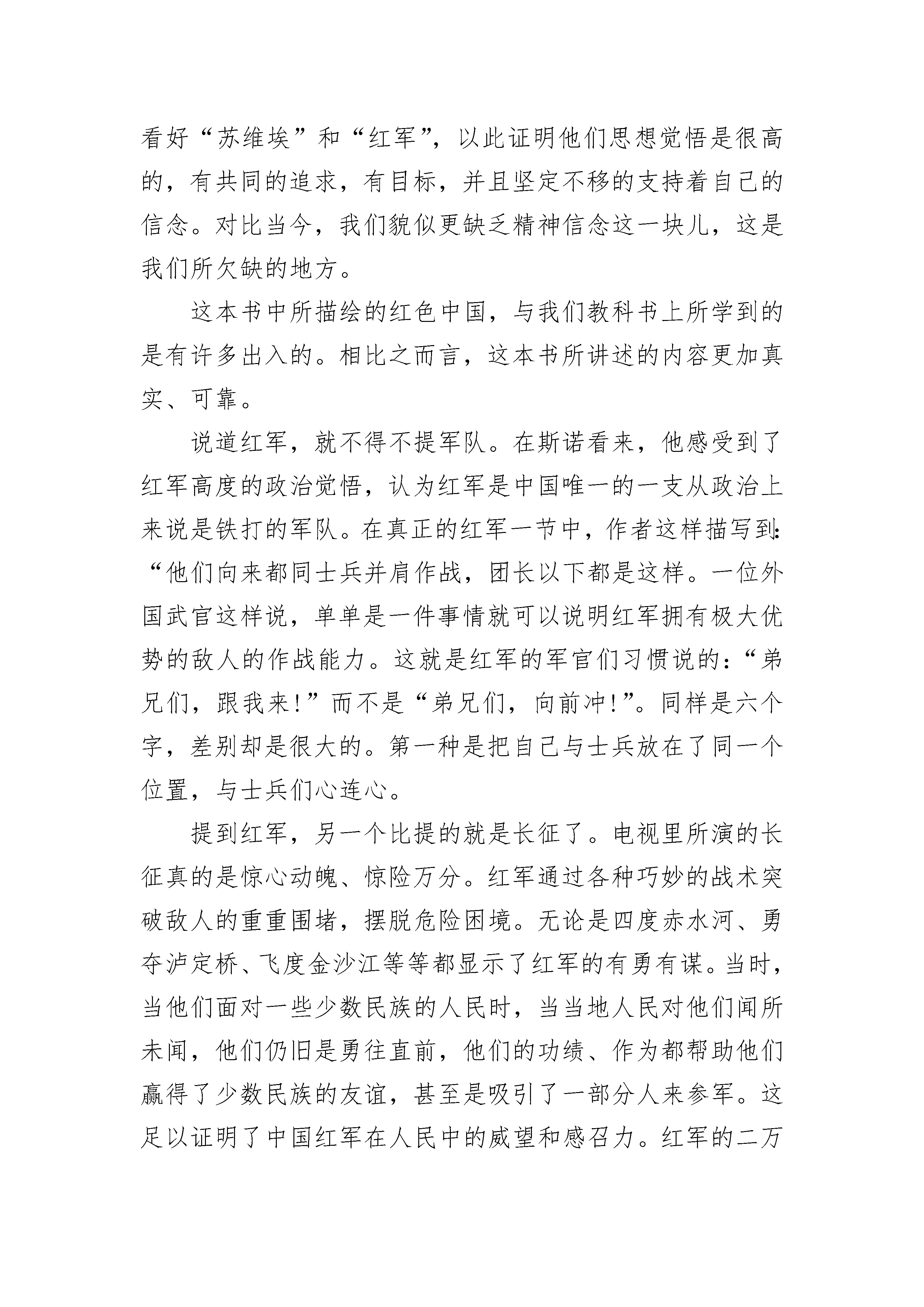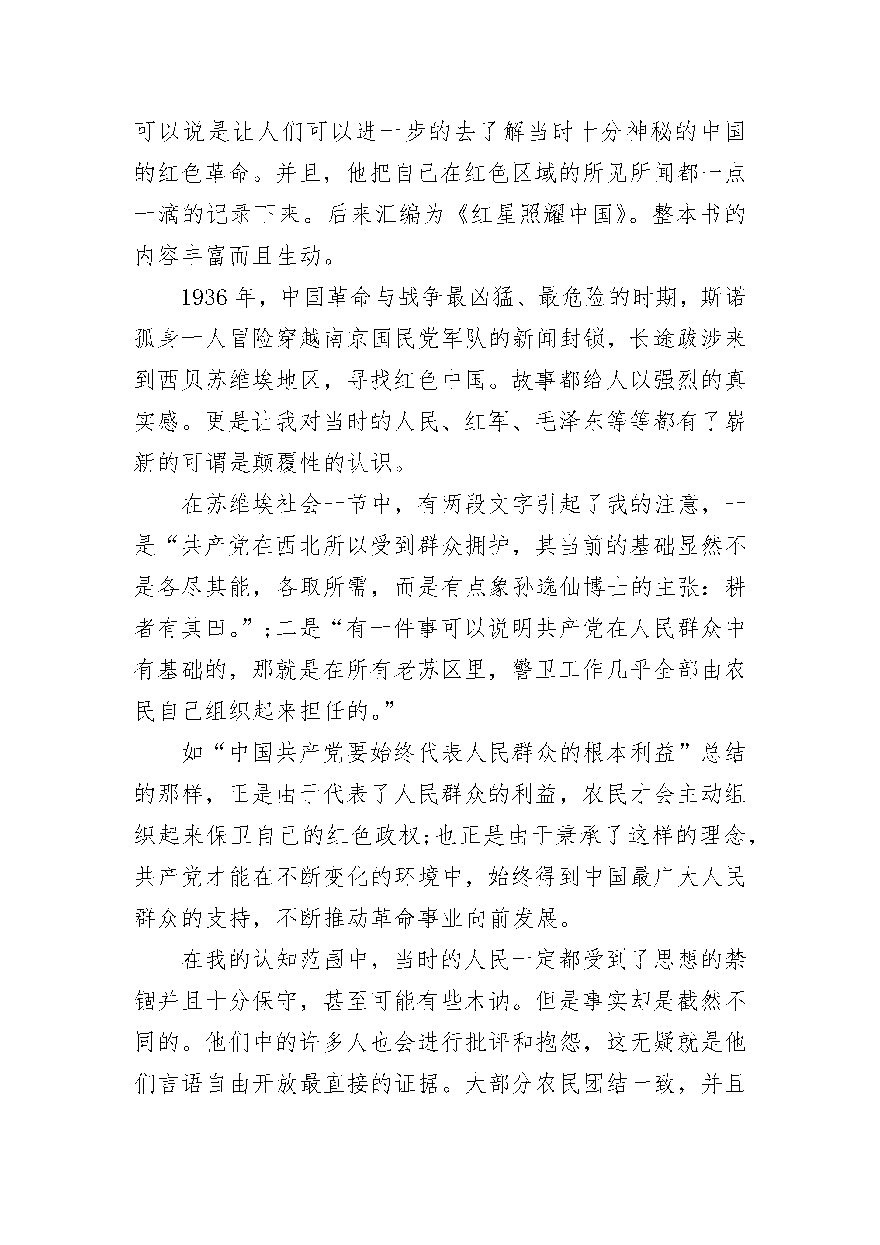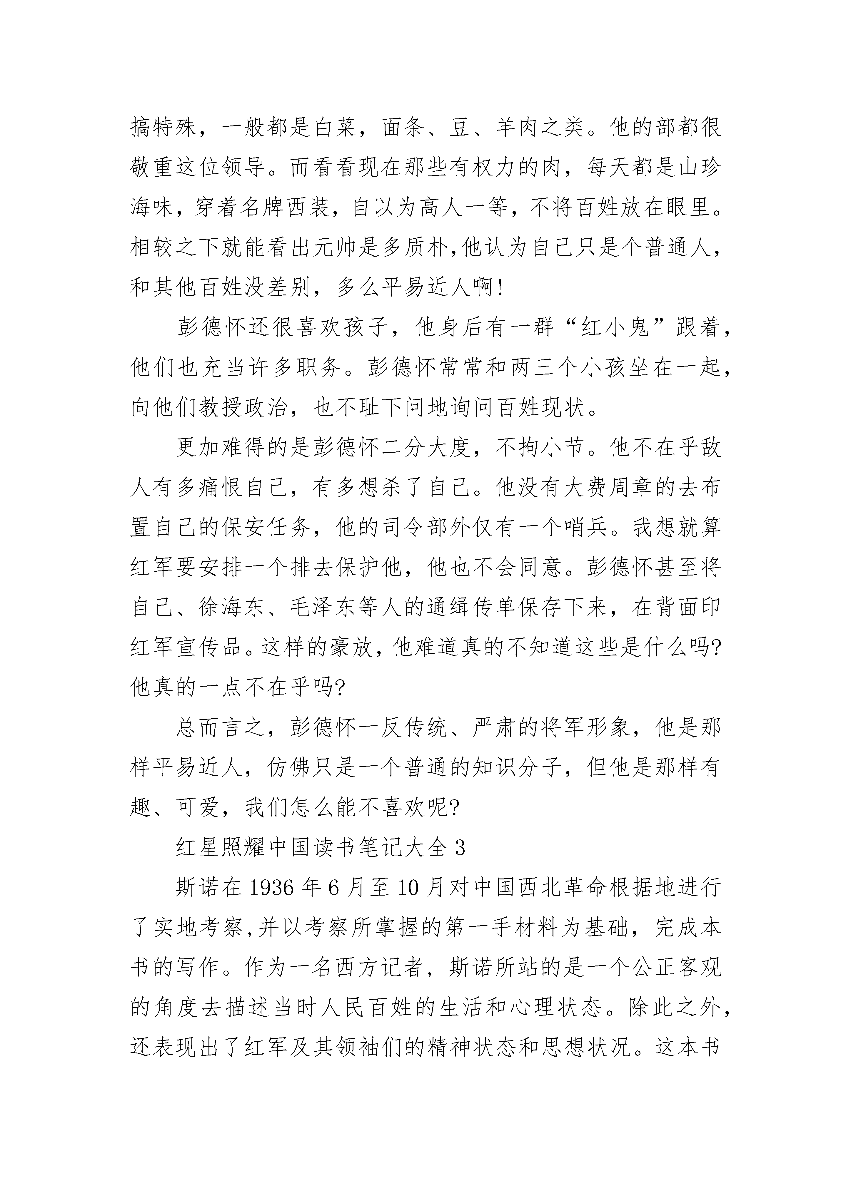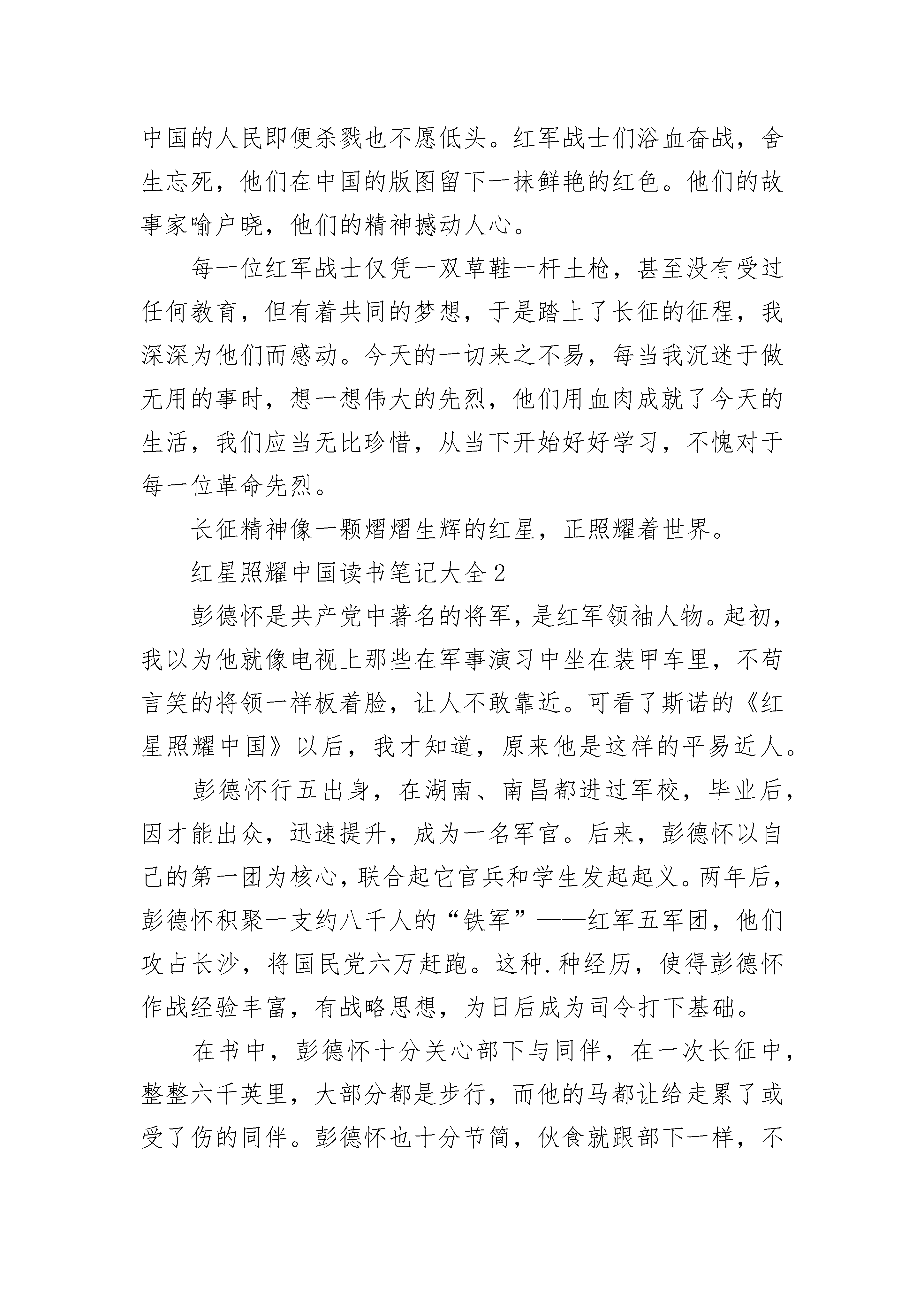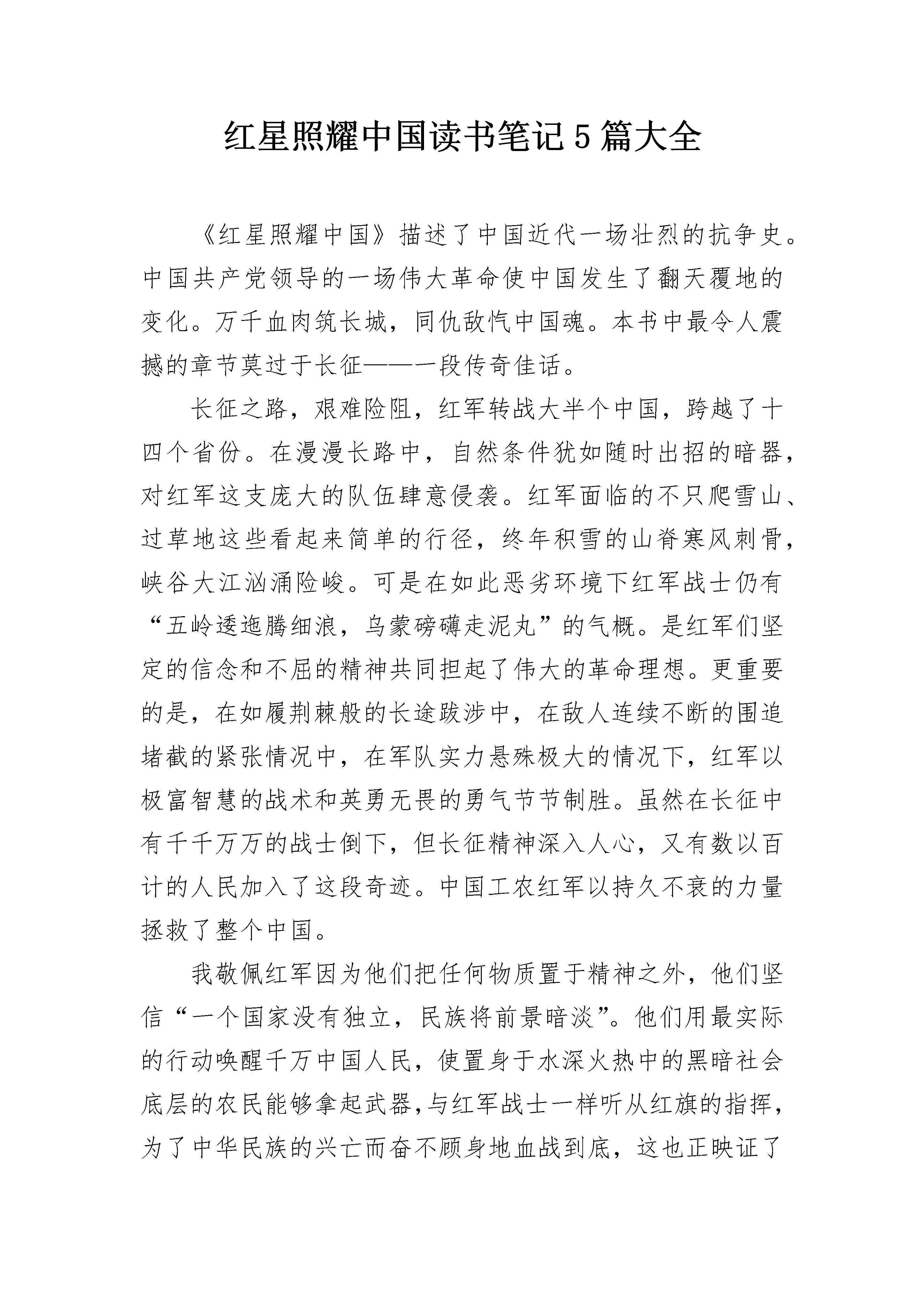 红星照耀中国读书笔记5篇大全《红星照耀中国》描述了中国近代一场壮烈的抗争史。中国共产党领导的一场伟大革命使中国发生了翻天覆地的变化。万千血肉筑长城,同仇敌忾中国魂。本书中最令人震撼的章节莫过于长征——一段传奇佳话。长征之路,艰难险阻,红军转战大半个中国,跨越了十四个省份。在漫漫长路中,自然条件犹如随时出招的暗器,对红军这支庞大的队伍肆意侵袭。红军面临的不只爬雪山、过草地这些看起来简单的行径,终年积雪的山脊寒风刺骨,峡谷大江汹涌险峻。可是在如此恶劣环境下红军战士仍有“五岭逶迤腾细浪,乌蒙磅礴走泥丸”的气概。是红军们坚定的信念和不屈的精神共同担起了伟大的革命理想。更重要的是,在如履荆棘般的长途跋涉中,在敌人连续不断的围追堵截的紧张情况中,在军队实力悬殊极大的情况下,红军以极富智慧的战术和英勇无畏的勇气节节制胜。虽然在长征中有千千万万的战士倒下,但长征精神深入人心,又有数以百计的人民加入了这段奇迹。中国工农红军以持久不衰的力量拯救了整个中国。我敬佩红军因为他们把任何物质置于精神之外,他们坚信“一个国家没有独立,民族将前景暗淡”。他们用最实际的行动唤醒千万中国人民,使置身于水深火热中的黑暗社会底层的农民能够拿起武器,与红军战士一样听从红旗的指挥,为了中华民族的兴亡而奋不顾身地血战到底,这也正映证了中国的人民即便杀戮也不愿低头。红军战士们浴血奋战,舍生忘死,他们在中国的版图留下一抹鲜艳的红色。他们的故事家喻户晓,他们的精神撼动人心。每一位红军战士仅凭一双草鞋一杆土枪,甚至没有受过任何教育,但有着共同的梦想,于是踏上了长征的征程,我深深为他们而感动。今天的一切来之不易,每当我沉迷于做无用的事时,想一想伟大的先烈,他们用血肉成就了今天的生活,我们应当无比珍惜,从当下开始好好学习,不愧对于每一位革命先烈。长征精神像一颗熠熠生辉的红星,正照耀着世界。红星照耀中国读书笔记大全2彭德怀是共产党中著名的将军,是红军领袖人物。起初,我以为他就像电视上那些在军事演习中坐在装甲车里,不苟言笑的将领一样板着脸,让人不敢靠近。可看了斯诺的《红星照耀中国》以后,我才知道,原来他是这样的平易近人。彭德怀行五出身,在湖南、南昌都进过军校,毕业后,因才能出众,迅速提升,成为一名军官。后来,彭德怀以自己的第一团为核心,联合起它官兵和学生发起起义。两年后,彭德怀积聚一支约八千人的“铁军”——红军五军团,他们攻占长沙,将国民党六万赶跑。这种.种经历,使得彭德怀作战经验丰富,有战略思想,为日后成为司令打下基础。在书中,彭德怀十分关心部下与同伴,在一次长征中,整整六千英里,大部分都是步行,而他的马都让给走累了或受了伤的同伴。彭德怀也十分节简,伙食就跟部下一样,不搞特殊,一般都是白菜,面条、豆、羊肉之类。他的部都很敬重这位领导。而看看现在那些有权力的肉,每天都是山珍海味,穿着名牌西装,自以为高人一等,不将百姓放在眼里。相较之下就能看出元帅是多质朴,他认为自己只是个普通人,和其他百姓没差别,多么平易近人啊!彭德怀还很喜欢孩子,他身后有一群“红小鬼”跟着,他们也充当许多职务。彭德怀常常和两三个小孩坐在一起,向他们教授政治,也不耻下问地询问百姓现状。更加难得的是彭德怀二分大度,不拘小节。他不在乎敌人有多痛恨自己,有多想杀了自己。他没有大费周章的去布置自己的保安任务,他的司令部外仅有一个哨兵。我想就算红军要安排一个排去保护他,他也不会同意。彭德怀甚至将自己、徐海东、毛泽东等人的通缉传单保存下来,在背面印红军宣传品。这样的豪放,他难道真的不知道这些是什么吗?他真的一点不在乎吗?总而言之,彭德怀一反传统、严肃的将军形象,他是那样平易近人,仿佛只是一个普通的知识分子,但他是那样有趣、可爱,我们怎么能不喜欢呢?红星照耀中国读书笔记大全3斯诺在1936年6月至10月对中国西北革命根据地进行了实地考察,并以考察所掌握的第一手材料为基础,完成本书的写作。作为一名西方记者,斯诺所站的是一个公正客观的角度去描述当时人民百姓的生活和心理状态。除此之外,还表现出了红军及其领袖们的精神状态和思想状况。这本书可以说是让人们可以进一步的去了解当时十分神秘的中国的红色革命。并且,他把自己在红色区域的所见所闻都一点一滴的记录下来。后来汇编为《红星照耀中国》。整本书的内容丰富而且生动。1936年,中国革命与战争最凶猛、最危险的时期,斯诺孤身一人冒险穿越南京国民党军队的新闻封锁,长途跋涉来到西贝苏维埃地区,寻找红色中国。故事都给人以强烈的真实感。更是让我对当时的人民、红军、毛泽东等等都有了崭新的可谓是颠覆性的认识。在苏维埃社会一节中,有两段文字引起了我的注意,一是“共产党在西北所以受到群众拥护,其当前的基础显然不是各尽其能,各取所需,而是有点象孙逸仙博士的主张:耕者有其田。”;二是“有一件事可以说明共产党在人民群众中有