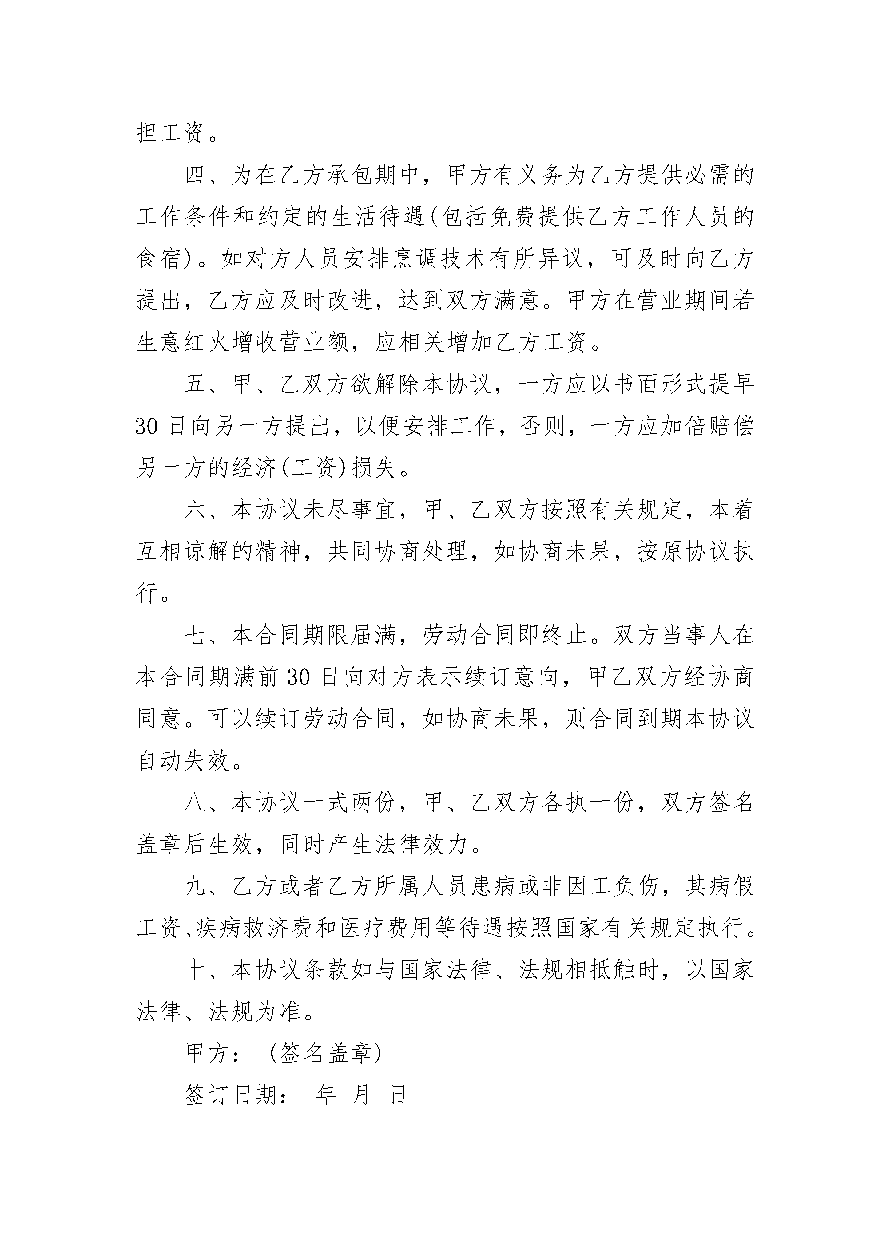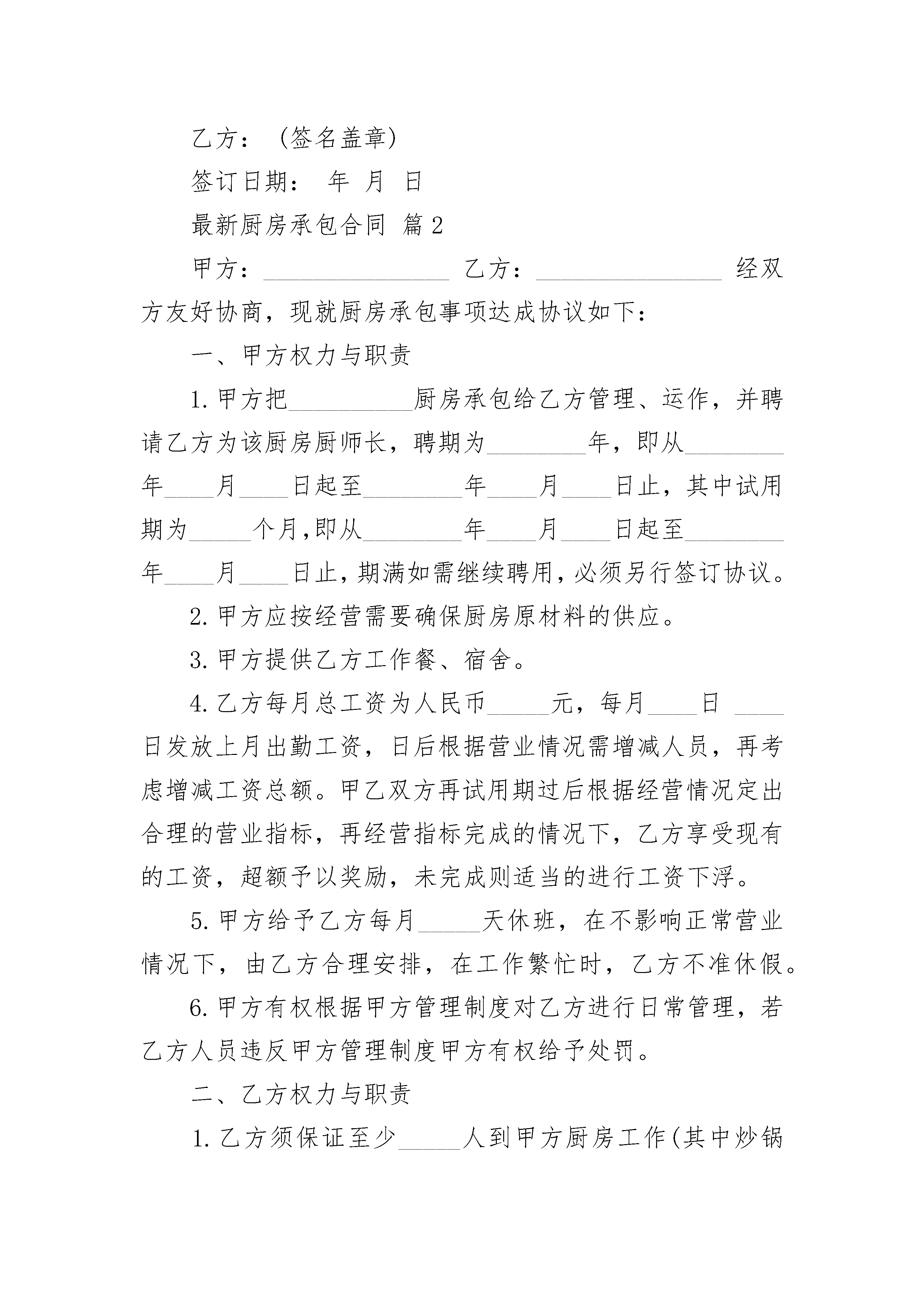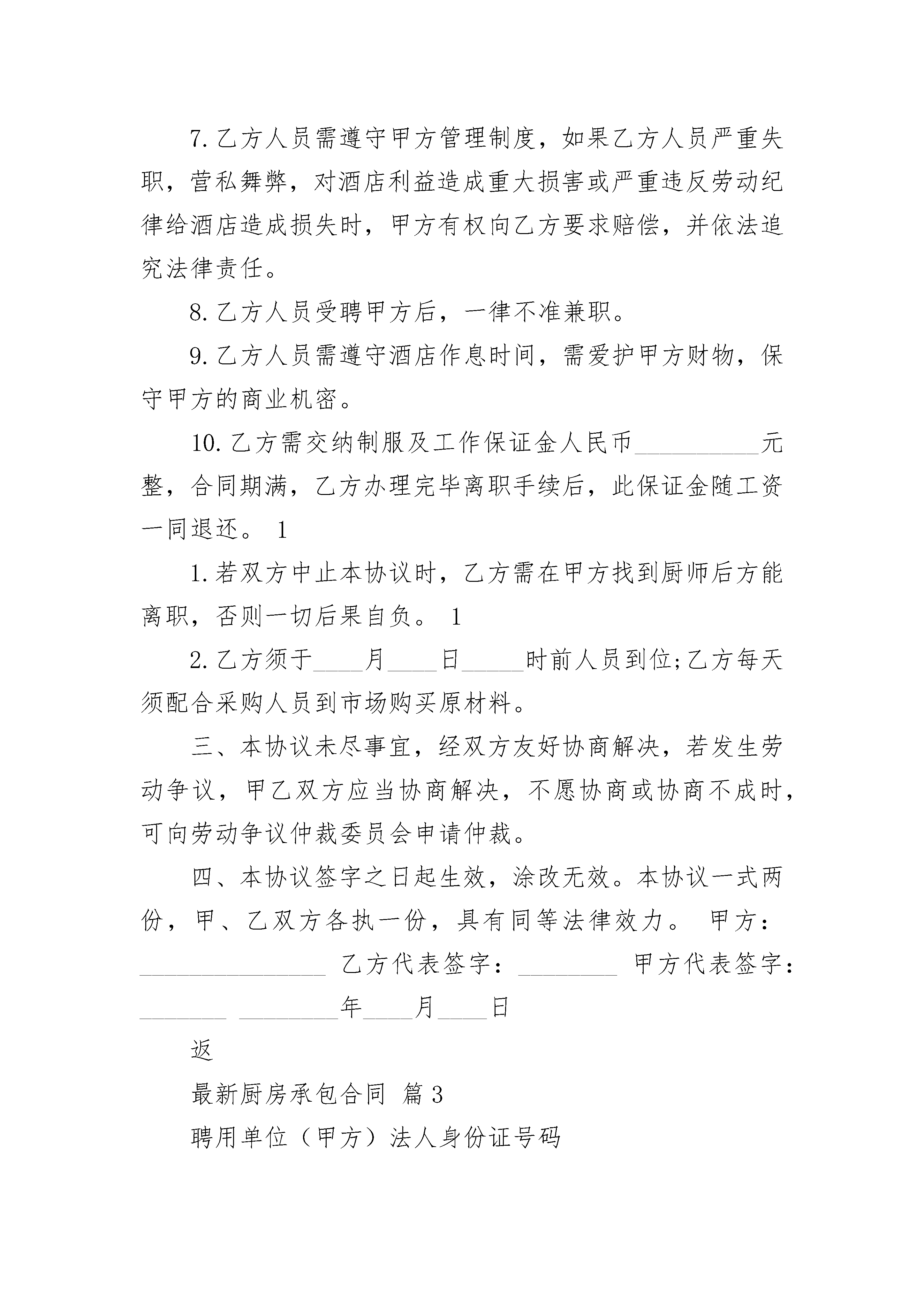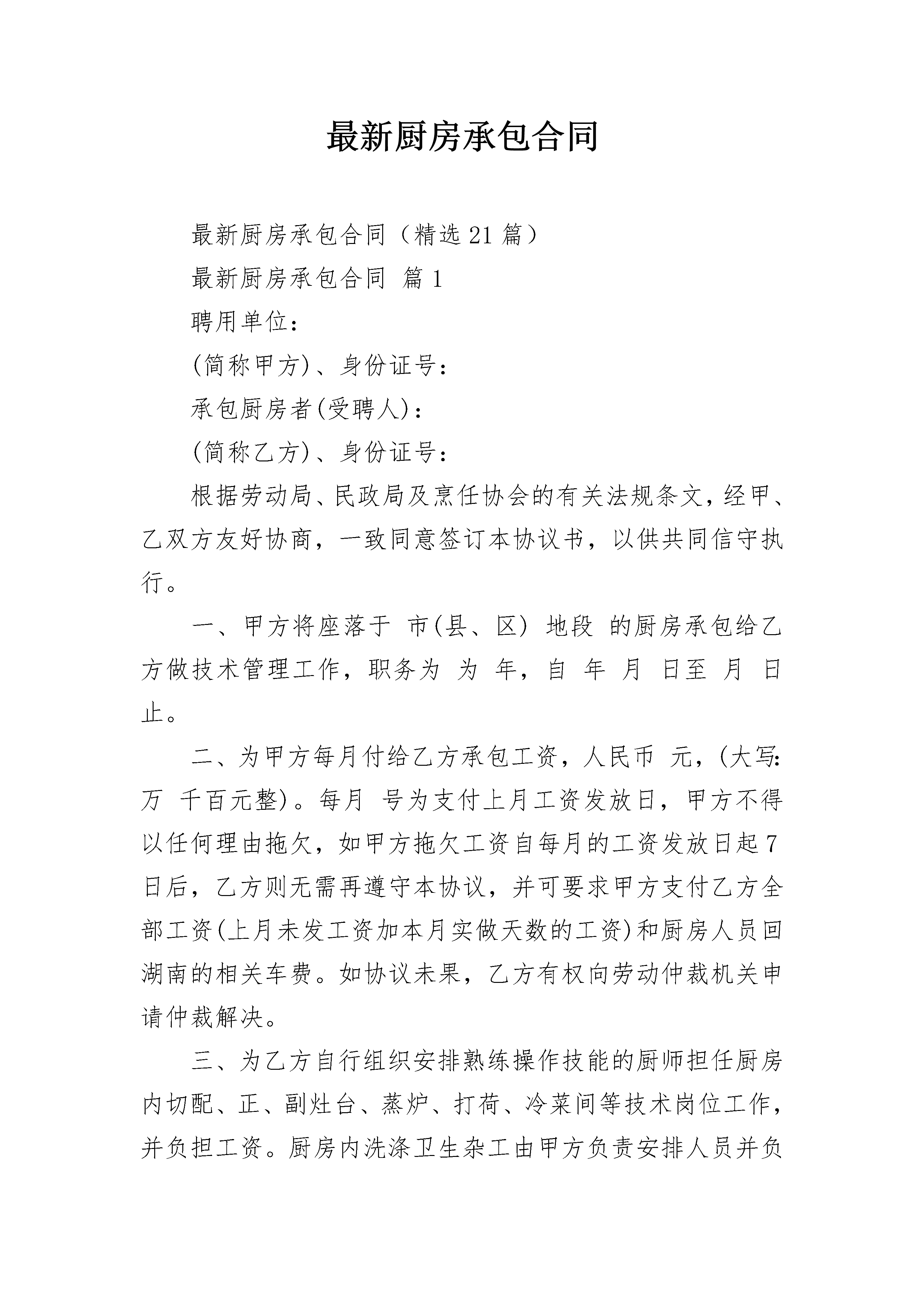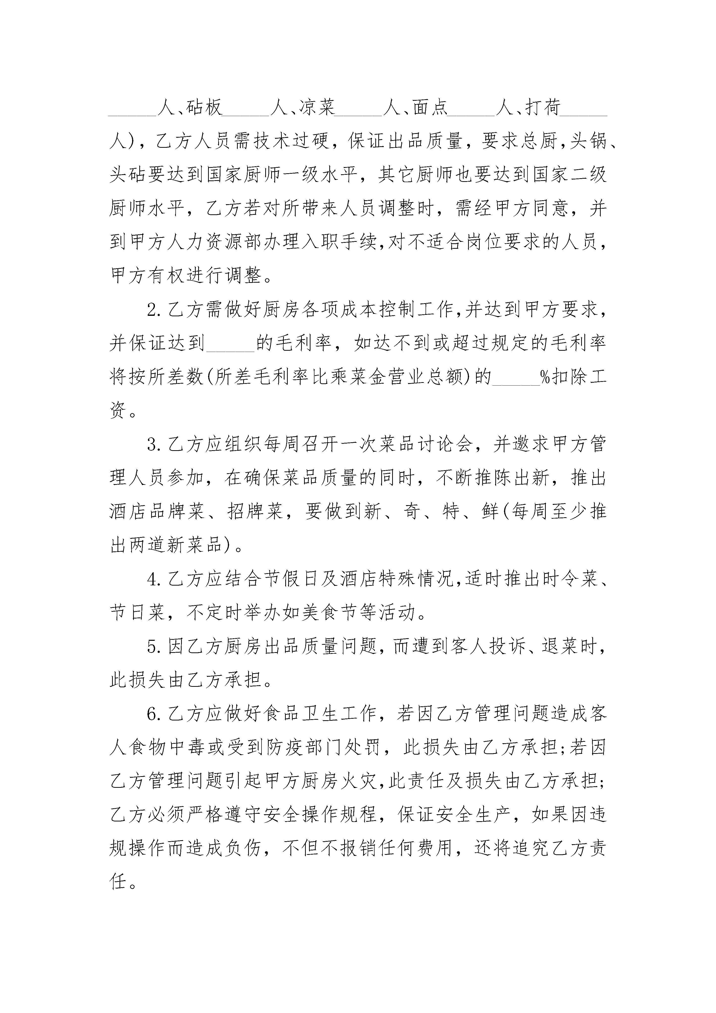 最新厨房承包合同最新厨房承包合同(精选21篇)最新厨房承包合同篇1聘用单位:(简称甲方)、身份证号:承包厨房者(受聘人):(简称乙方)、身份证号:根据劳动局、民政局及烹任协会的有关法规条文,经甲、乙双方友好协商,一致同意签订本协议书,以供共同信守执行。一、甲方将座落于市(县、区)地段的厨房承包给乙方做技术管理工作,职务为为年,自年月日至月日止。二、为甲方每月付给乙方承包工资,人民币元,(大写:万千百元整)。每月号为支付上月工资发放日,甲方不得以任何理由拖欠,如甲方拖欠工资自每月的工资发放日起7日后,乙方则无需再遵守本协议,并可要求甲方支付乙方全部工资(上月未发工资加本月实做天数的工资)和厨房人员回湖南的相关车费。如协议未果,乙方有权向劳动仲裁机关申请仲裁解决。三、为乙方自行组织安排熟练操作技能的厨师担任厨房内切配、正、副灶台、蒸炉、打荷、冷菜间等技术岗位工作,并负担工资。厨房内洗涤卫生杂工由甲方负责安排人员并负担工资。四、为在乙方承包期中,甲方有义务为乙方提供必需的工作条件和约定的生活待遇(包括免费提供乙方工作人员的食宿)。如对方人员安排烹调技术有所异议,可及时向乙方提出,乙方应及时改进,达到双方满意。甲方在营业期间若生意红火增收营业额,应相关增加乙方工资。五、甲、乙双方欲解除本协议,一方应以书面形式提早30日向另一方提出,以便安排工作,否则,一方应加倍赔偿另一方的经济(工资)损失。六、本协议未尽事宜,甲、乙双方按照有关规定,本着互相谅解的精神,共同协商处理,如协商未果,按原协议执行。七、本合同期限届满,劳动合同即终止。双方当事人在本合同期满前30日向对方表示续订意向,甲乙双方经协商同意。可以续订劳动合同,如协商未果,则合同到期本协议自动失效。八、本协议一式两份,甲、乙双方各执一份,双方签名盖章后生效,同时产生法律效力。九、乙方或者乙方所属人员患病或非因工负伤,其病假工资、疾病救济费和医疗费用等待遇按照国家有关规定执行。十、本协议条款如与国家法律、法规相抵触时,以国家法律、法规为准。甲方:(签名盖章)签订日期:年月日乙方:(签名盖章)签订日期:年月日最新厨房承包合同篇2甲方:_______________乙方:_______________经双方友好协商,现就厨房承包事项达成协议如下:一、甲方权力与职责1.甲方把__________厨房承包给乙方管理、运作,并聘请乙方为该厨房厨师长,聘期为________年,即从________年____月____日起至________年____月____日止,其中试用期为_____个月,即从________年____月____日起至________年____月____日止,期满如需继续聘用,必须另行签订协议。2.甲方应按经营需要确保厨房原材料的供应。3.甲方提供乙方工作餐、宿舍。4.乙方每月总工资为人民币_____元,每月____日____日发放上月出勤工资,日后根据营业情况需增减人员,再考虑增减工资总额。甲乙双方再试用期过后根据经营情况定出合理的营业指标,再经营指标完成的情况下,乙方享受现有的工资,超额予以奖励,未完成则适当的进行工资下浮。5.甲方给予乙方每月_____天休班,在不影响正常营业情况下,由乙方合理安排,在工作繁忙时,乙方不准休假。6.甲方有权根据甲方管理制度对乙方进行日常管理,若乙方人员违反甲方管理制度甲方有权给予处罚。二、乙方权力与职责1.乙方须保证至少_____人到甲方厨房工作(其中炒锅_____人、砧板_____人、凉菜_____人、面点_____人、打荷_____人),乙方人员需技术过硬,保证出品质量,要求总厨,头锅、头砧要达到国家厨师一级水平,其它厨师也要达到国家二级厨师水平,乙方若对所带来人员调整时,需经甲方同意,并到甲方人力资源部办理入职手续,对不适合岗位要求的人员,甲方有权进行调整。2.乙方需做好厨房各项成本控制工作,并达到甲方要求,并保证达到_____的毛利率,如达不到或超过规定的毛利率将按所差数(所差毛利率比乘菜金营业总额)的_____%扣除工资。3.乙方应组织每周召开一次菜品讨论会,并邀求甲方管理人员参加,在确保菜品质量的同时,不断推陈出新,推出酒店品牌菜、招牌菜,要做到新、奇、特、鲜(每周至少推出两道新菜品)。4.乙方应结合节假日及酒店特殊情况,适时推出时令菜、节日菜,不定时举办如美食节等活动。5.因乙方厨房出品质量问题,而遭到客人投诉、退菜时,此损失由乙方承担。6.乙方应做好食品卫生工作,若因乙方管理问题造成客人食物中毒或受到防疫部门处罚,此损失由乙方承担;若因乙方管理问题引起甲方厨房火灾,此责任及损失由乙方承担;乙方必须严格遵守安全操作规程,保证安全生产,如果因违规操作而造成负伤,不但不报销任何费用,还将追究乙方责任。7.乙方人员需遵守甲方管理