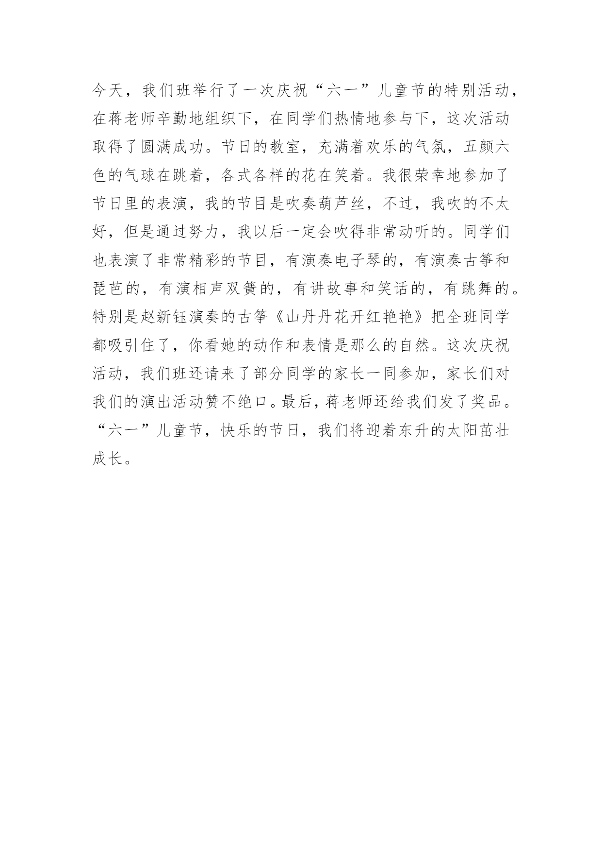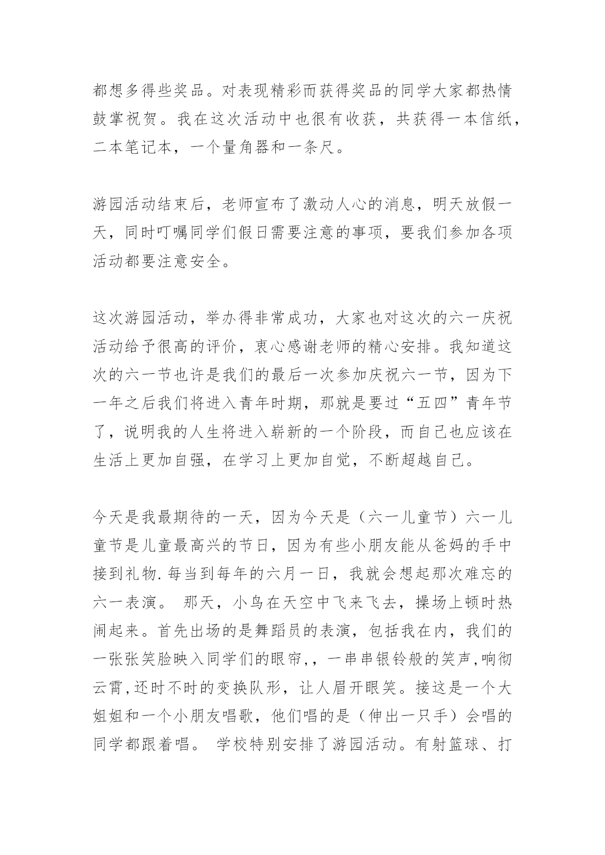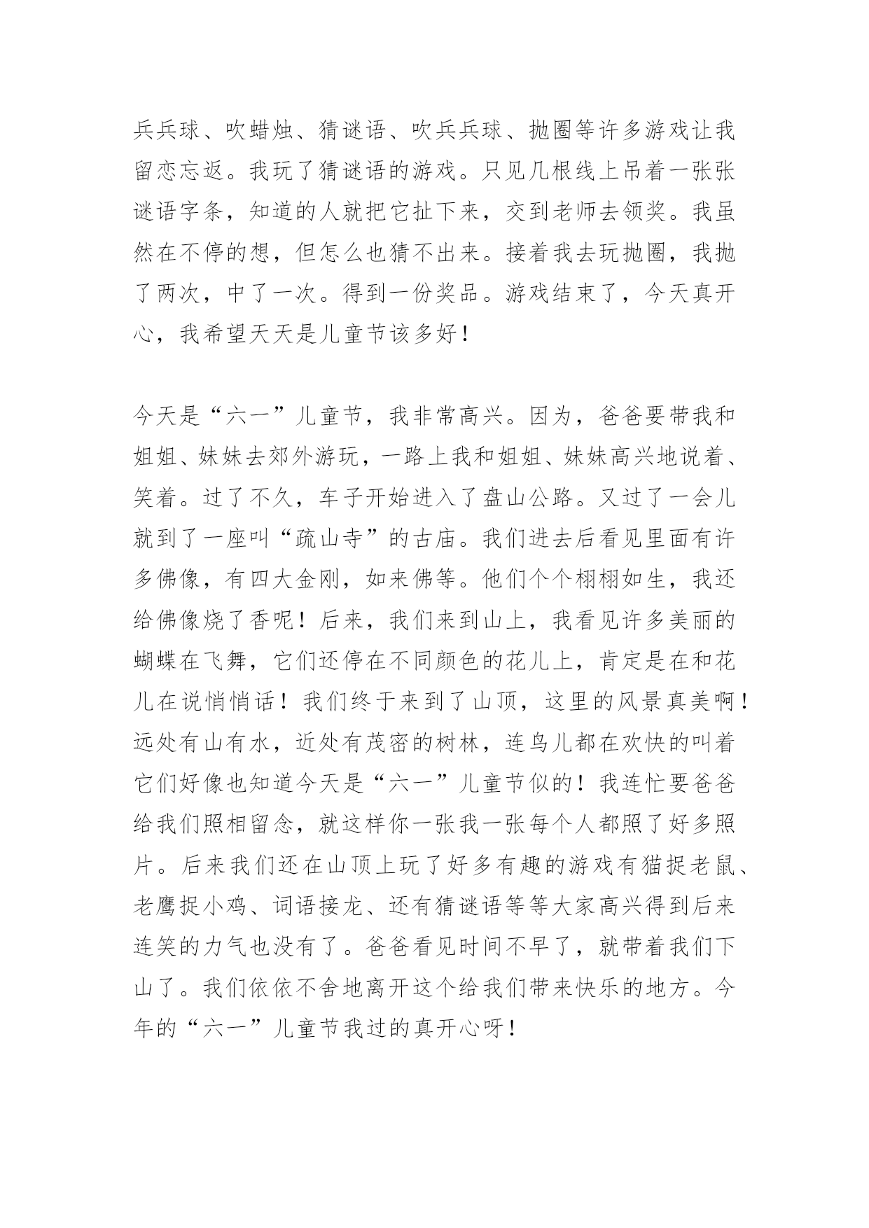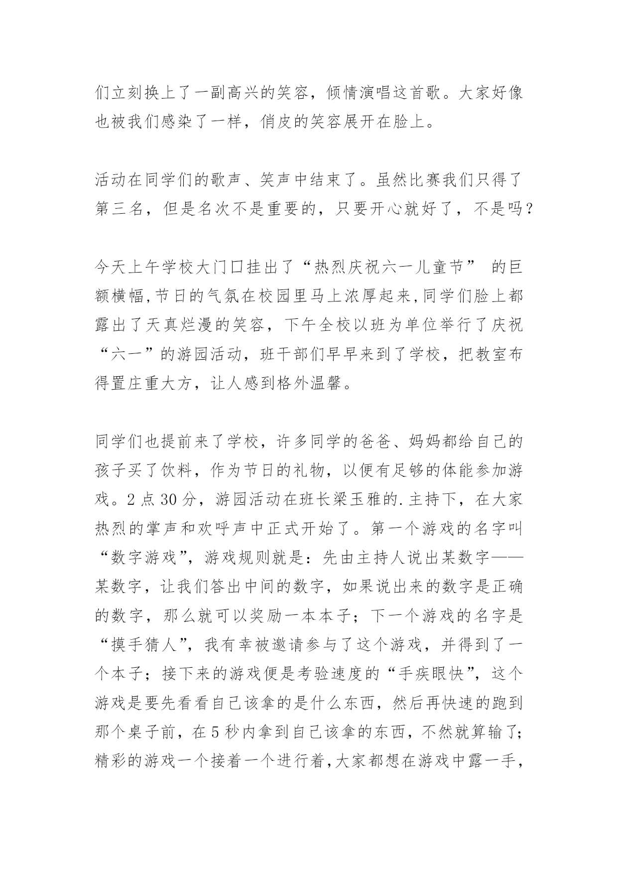 六一儿童节作文 六一儿童节作文六一儿童节是儿童的盛宴。在儿童节里,我们欢庆着属于自己的时光。今天是一年一度的六一儿童节,每一位同学的脸上都挂着欣喜、快乐的笑容。我们来到学校的大礼堂,准备参加六一儿童节歌咏大赛,和其他班的同学来个PK比赛!都说儿童的歌声是天籁之音。果不其然,每个班都唱得那么好。我最喜欢的就数六(1)班的《虫儿飞》了。同学们站在舞台上,缓缓的抒情音乐响起,大家轻轻唱了起来:“黑黑的天空低垂,亮亮的繁星相随……”我们好像真的到了一个仙境般的地方,到处都是闪着微弱的光芒的萤火虫,萦绕在我们的身边。夜空上的繁星一闪一闪,微风吹拂着我们,好似在诉说一个美丽的故事。萤火虫飞啊飞啊,跳着美丽的舞蹈,在我们身边旋转、舞蹈……一曲终了,我们才清醒过来,意犹未尽,还想再听一遍。终于轮到我们上场了!我们走上台,微笑着面对观众。音乐响起,清脆的歌声也随之响起,流淌在同学们之间。第一首是《让我们荡起双桨》。唱着,唱着,大家好像真的坐在小船里,一边划船一边唱歌。小船儿漂啊漂,伴着同学们一起歌唱,直到音乐结束。大家还没缓过神来呢,轻快、活泼的乐曲就又响了起来。哦!《蜗牛与黄鹂鸟》已经开始了。我们立刻换上了一副高兴的笑容,倾情演唱这首歌。大家好像也被我们感染了一样,俏皮的笑容展开在脸上。活动在同学们的歌声、笑声中结束了。虽然比赛我们只得了第三名,但是名次不是重要的,只要开心就好了,不是吗?今天上午学校大门囗挂出了“热烈庆祝六一儿童节”的巨额横幅,节日的气氛在校园里马上浓厚起来,同学们脸上都露出了天真烂漫的笑容,下午全校以班为单位举行了庆祝“六一”的游园活动,班干部们早早来到了学校,把教室布得置庄重大方,让人感到格外温馨。同学们也提前来了学校,许多同学的爸爸、妈妈都给自己的孩子买了饮料,作为节日的礼物,以便有足够的体能参加游戏。2点30分,游园活动在班长梁玉雅的.主持下,在大家热烈的掌声和欢呼声中正式开始了。第一个游戏的名字叫“数字游戏”,游戏规则就是:先由主持人说出某数字——某数字,让我们答出中间的数字,如果说出来的数字是正确的数字,那么就可以奖励一本本子;下一个游戏的名字是“摸手猜人”,我有幸被邀请参与了这个游戏,并得到了一个本子;接下来的游戏便是考验速度的“手疾眼快”,这个游戏是要先看看自己该拿的是什么东西,然后再快速的跑到那个桌子前,在5秒内拿到自己该拿的东西,不然就算输了;精彩的游戏一个接着一个进行着,大家都想在游戏中露一手,都想多得些奖品。对表现精彩而获得奖品的同学大家都热情鼓掌祝贺。我在这次活动中也很有收获,共获得一本信纸,二本笔记本,一个量角器和一条尺。游园活动结束后,老师宣布了激动人心的消息,明天放假一天,同时叮嘱同学们假日需要注意的事项,要我们参加各项活动都要注意安全。这次游园活动,举办得非常成功,大家也对这次的六一庆祝活动给予很高的评价,衷心感谢老师的精心安排。我知道这次的六一节也许是我们的最后一次参加庆祝六一节,因为下一年之后我们将进入青年时期,那就是要过“五四”青年节了,说明我的人生将进入崭新的一个阶段,而自己也应该在生活上更加自强,在学习上更加自觉,不断超越自己。今天是我最期待的一天,因为今天是(六一儿童节)六一儿童节是儿童最高兴的节日,因为有些小朋友能从爸妈的手中接到礼物.每当到每年的六月一日,我就会想起那次难忘的六一表演。那天,小鸟在天空中飞来飞去,操场上顿时热闹起来。首先出场的是舞蹈员的表演,包括我在内,我们的一张张笑脸映入同学们的眼帘,,一串串银铃般的笑声,响彻云霄,还时不时的变换队形,让人眉开眼笑。接这是一个大姐姐和一个小朋友唱歌,他们唱的是(伸出一只手)会唱的同学都跟着唱。学校特别安排了游园活动。有射篮球、打兵兵球、吹蜡烛、猜谜语、吹兵兵球、抛圈等许多游戏让我留恋忘返。我玩了猜谜语的游戏。只见几根线上吊着一张张谜语字条,知道的人就把它扯下来,交到老师去领奖。我虽然在不停的想,但怎么也猜不出来。接着我去玩抛圈,我抛了两次,中了一次。得到一份奖品。游戏结束了,今天真开心,我希望天天是儿童节该多好!今天是“六一”儿童节,我非常高兴。因为,爸爸要带我和姐姐、妹妹去郊外游玩,一路上我和姐姐、妹妹高兴地说着、笑着。过了不久,车子开始进入了盘山公路。又过了一会儿就到了一座叫“疏山寺”的古庙。我们进去后看见里面有许多佛像,有四大金刚,如来佛等。他们个个栩栩如生,我还给佛像烧了香呢!后来,我们来到山上,我看见许多美丽的蝴蝶在飞舞,它们还停在不同颜色的花儿上,肯定是在和花儿在说悄悄话!我们终于来到了山顶,这里的风景真美啊!远处有山有水,近处有茂密的树林,连鸟儿都在欢快的叫着它们好像也知道今天是“六一”儿童节似的!我连忙要爸爸给我们照相留念,就这样你一张我一张每个人都照了好多照片。后来我们还在山顶上玩了好多有趣的游戏有猫捉老