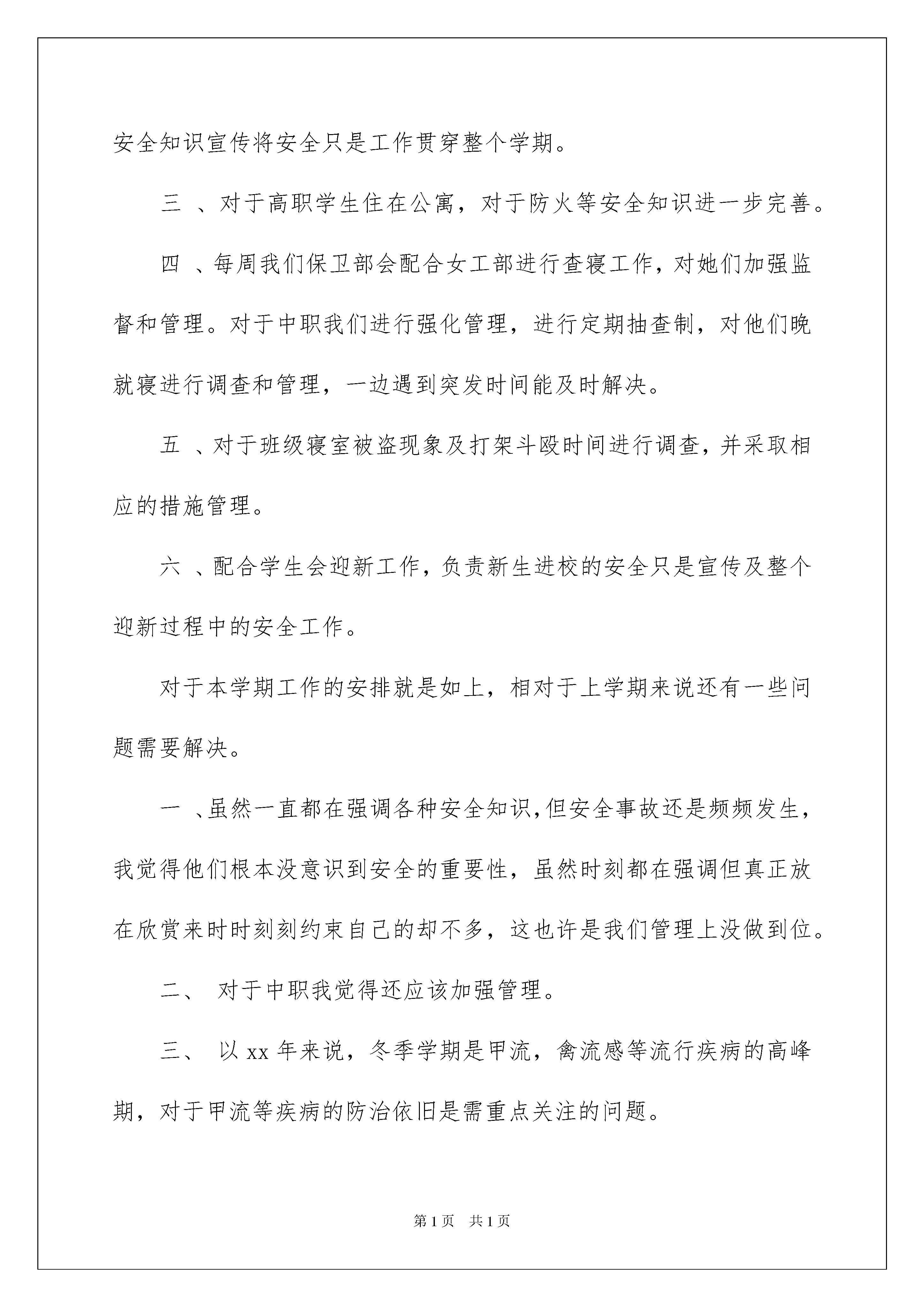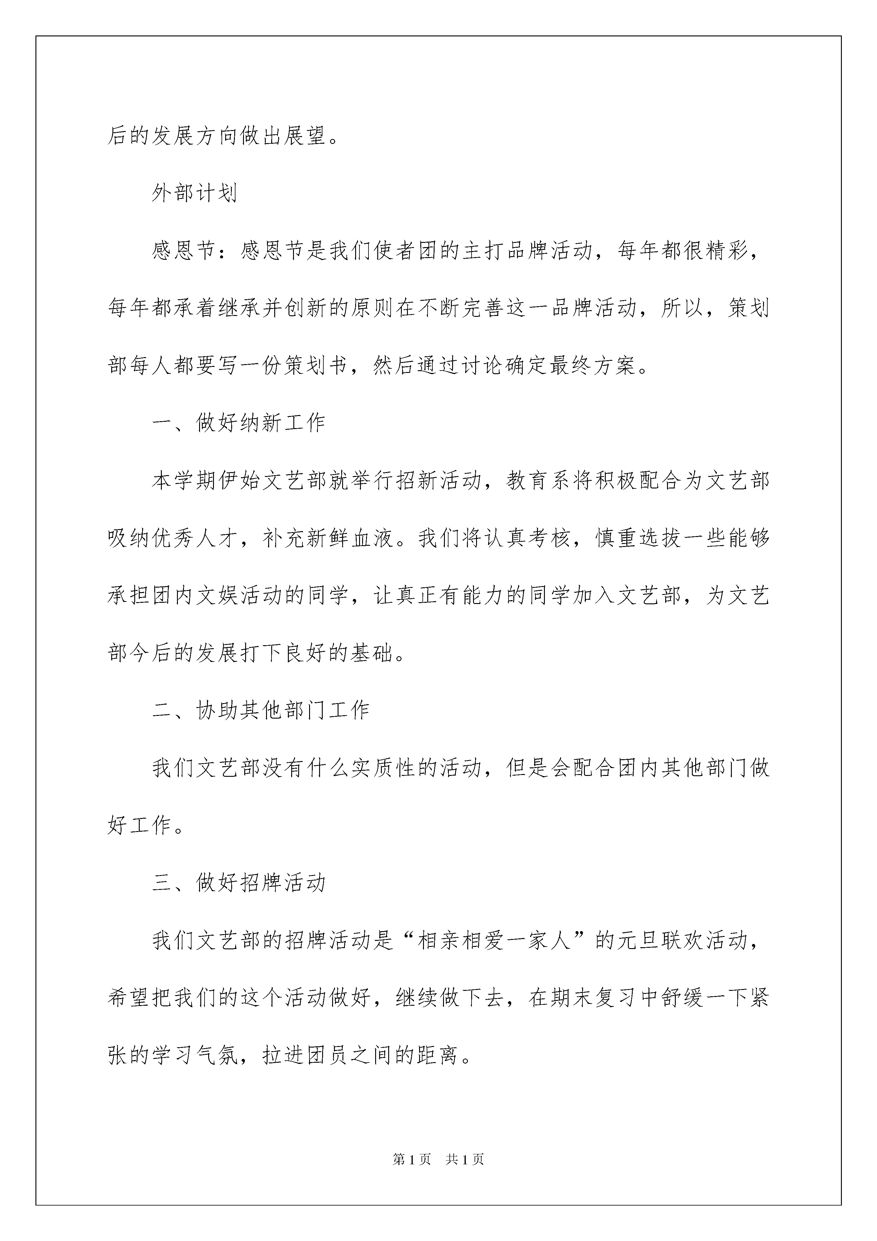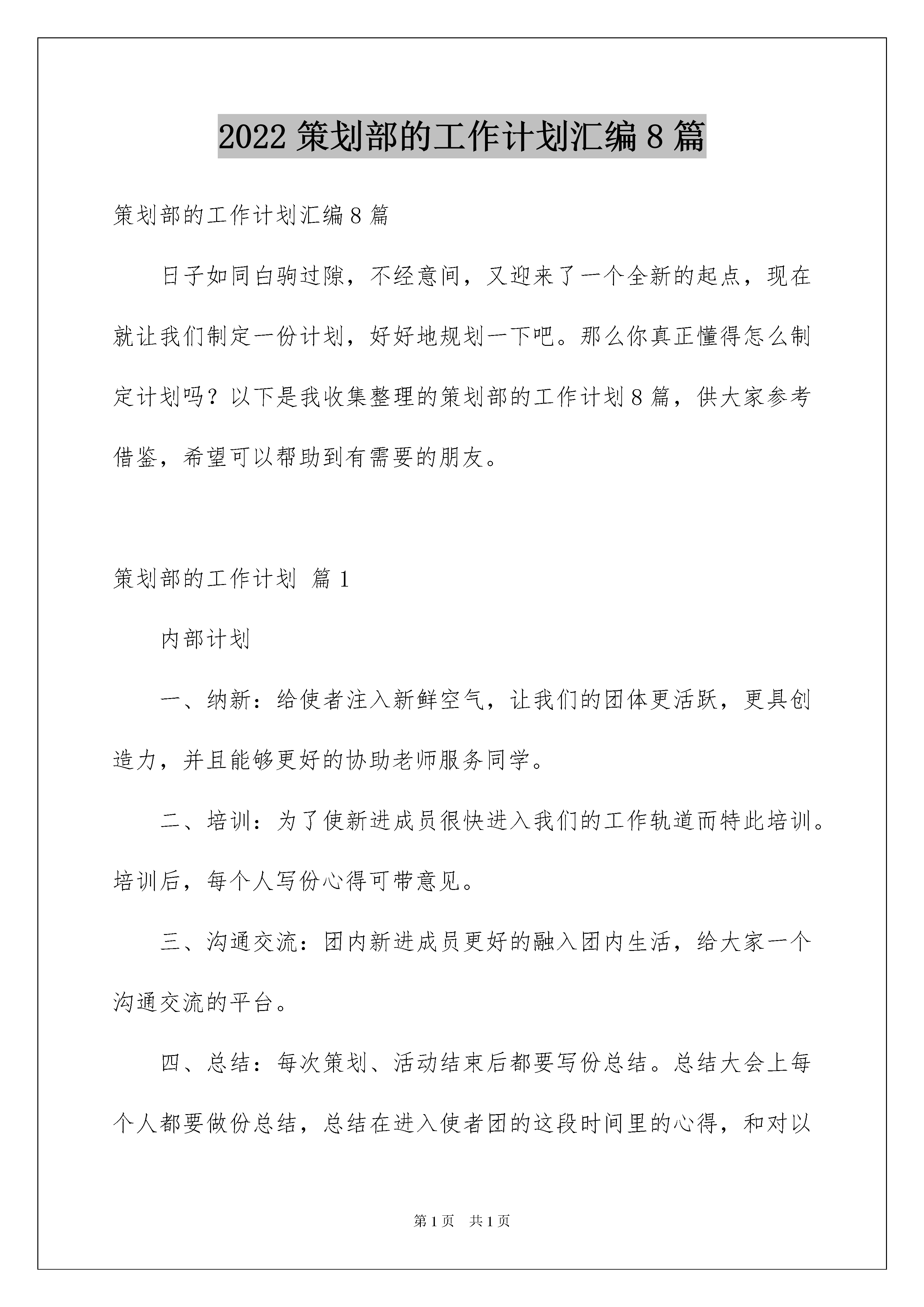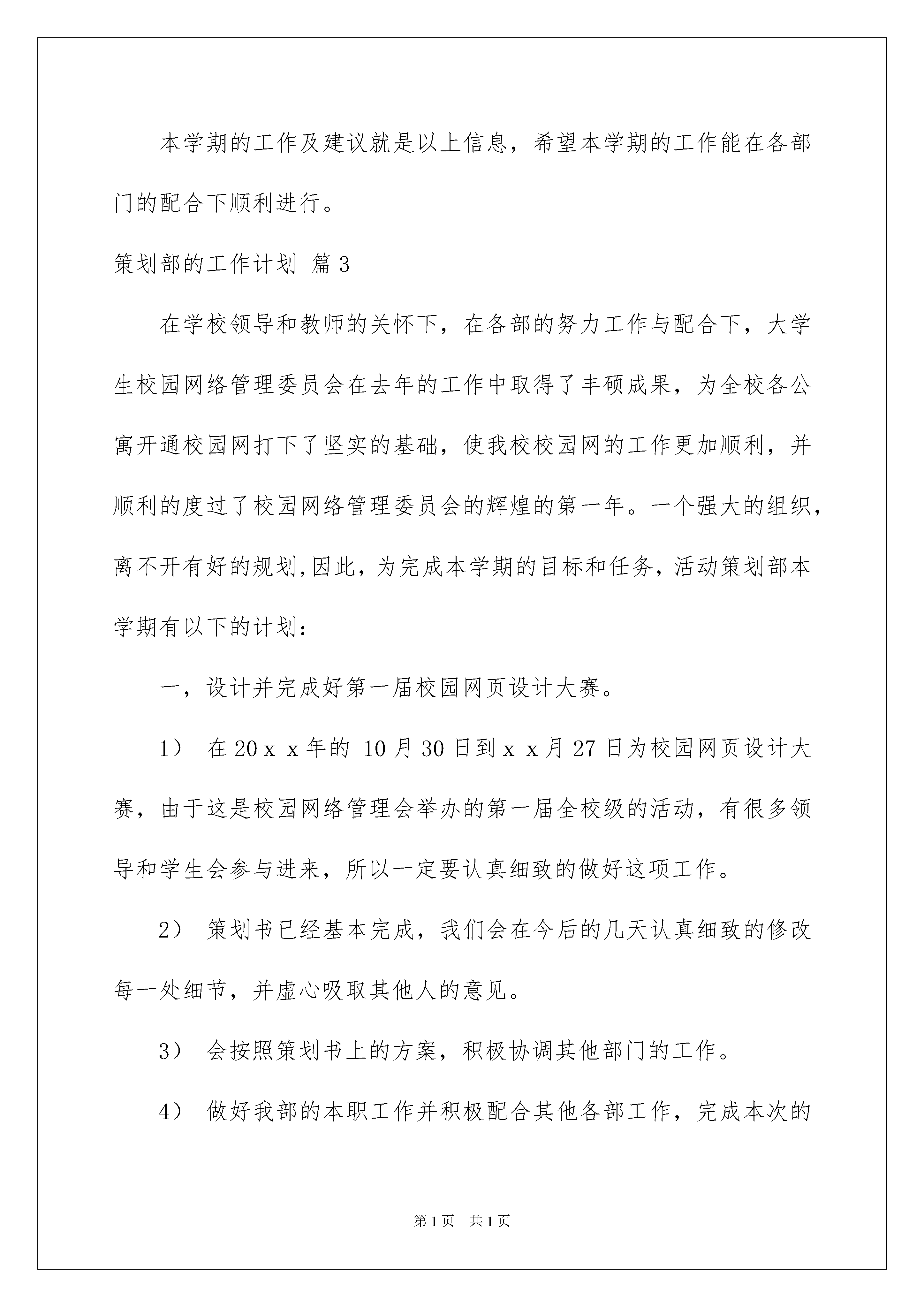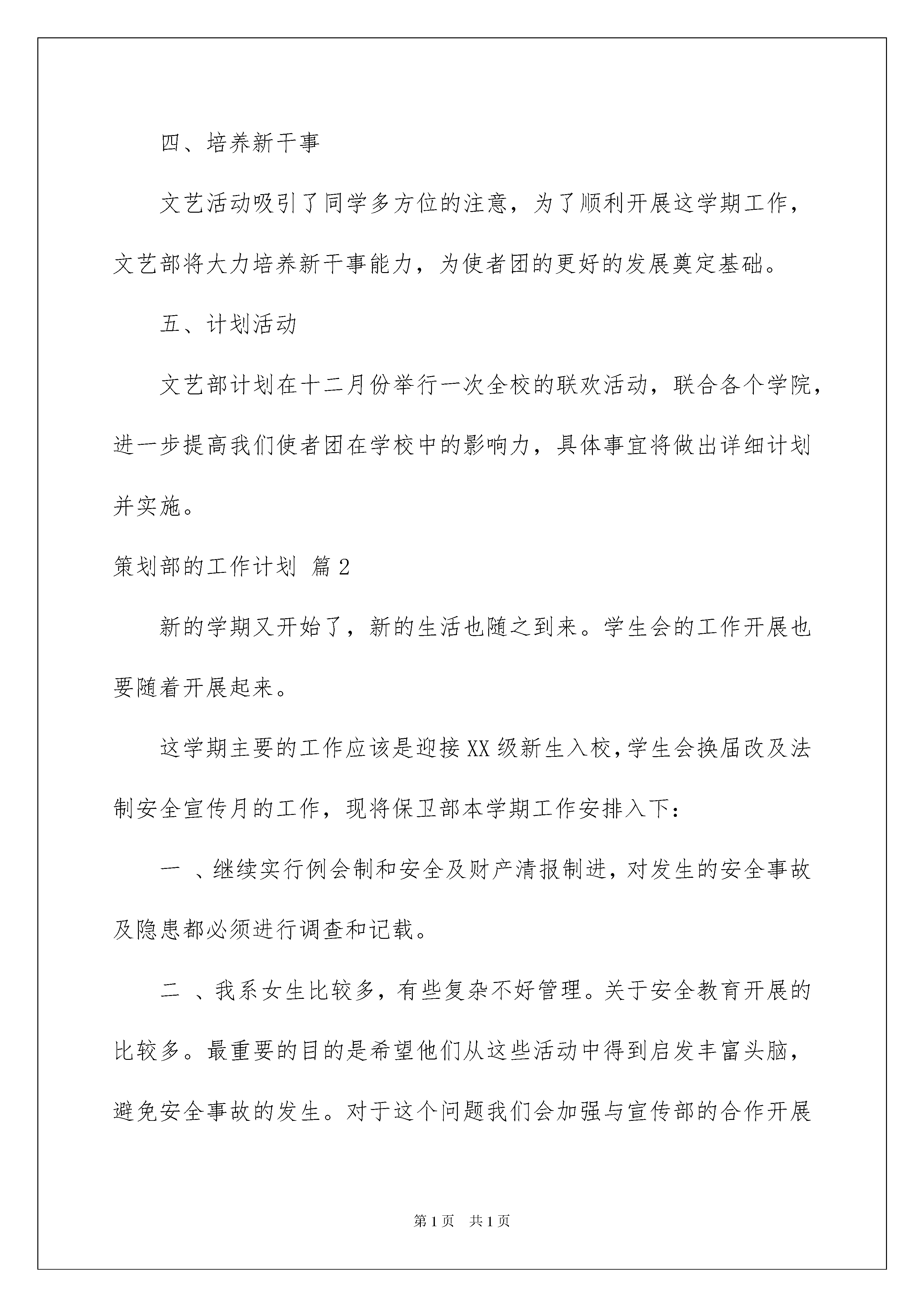 2022策划部的工作计划汇编8篇策划部的工作计划汇编8篇日子如同白驹过隙,不经意间,又迎来了一个全新的起点,现在就让我们制定一份计划,好好地规划一下吧。那么你真正懂得怎么制定计划吗?以下是我收集整理的策划部的工作计划8篇,供大家参考借鉴,希望可以帮助到有需要的朋友。策划部的工作计划篇1内部计划一、纳新:给使者注入新鲜空气,让我们的团体更活跃,更具创造力,并且能够更好的协助老师服务同学。二、培训:为了使新进成员很快进入我们的工作轨道而特此培训。培训后,每个人写份心得可带意见。三、沟通交流:团内新进成员更好的融入团内生活,给大家一个沟通交流的平台。四、总结:每次策划、活动结束后都要写份总结。总结大会上每个人都要做份总结,总结在进入使者团的这段时间里的心得,和对以后的发展方向做出展望。外部计划感恩节:感恩节是我们使者团的主打品牌活动,每年都很精彩,每年都承着继承并创新的原则在不断完善这一品牌活动,所以,策划部每人都要写一份策划书,然后通过讨论确定最终方案。一、做好纳新工作本学期伊始文艺部就举行招新活动,教育系将积极配合为文艺部吸纳优秀人才,补充新鲜血液。我们将认真考核,慎重选拔一些能够承担团内文娱活动的同学,让真正有能力的同学加入文艺部,为文艺部今后的发展打下良好的基础。二、协助其他部门工作我们文艺部没有什么实质性的活动,但是会配合团内其他部门做好工作。三、做好招牌活动我们文艺部的招牌活动是“相亲相爱一家人”的元旦联欢活动,希望把我们的这个活动做好,继续做下去,在期末复习中舒缓一下紧张的学习气氛,拉进团员之间的距离。四、培养新干事文艺活动吸引了同学多方位的注意,为了顺利开展这学期工作,文艺部将大力培养新干事能力,为使者团的更好的发展奠定基础。五、计划活动文艺部计划在十二月份举行一次全校的联欢活动,联合各个学院,进一步提高我们使者团在学校中的影响力,具体事宜将做出详细计划并实施。策划部的工作计划篇2新的学期又开始了,新的生活也随之到来。学生会的工作开展也要随着开展起来。这学期主要的工作应该是迎接XX级新生入校,学生会换届改及法制安全宣传月的工作,现将保卫部本学期工作安排入下:一、继续实行例会制和安全及财产清报制进,对发生的安全事故及隐患都必须进行调查和记载。二、我系女生比较多,有些复杂不好管理。关于安全教育开展的比较多。最重要的目的是希望他们从这些活动中得到启发丰富头脑,避免安全事故的发生。对于这个问题我们会加强与宣传部的合作开展安全知识宣传将安全只是工作贯穿整个学期。三、对于高职学生住在公寓,对于防火等安全知识进一步完善。四、每周我们保卫部会配合女工部进行查寝工作,对她们加强监督和管理。对于中职我们进行强化管理,进行定期抽查制,对他们晚就寝进行调查和管理,一边遇到突发时间能及时解决。五、对于班级寝室被盗现象及打架斗殴时间进行调查,并采取相应的措施管理。六、配合学生会迎新工作,负责新生进校的安全只是宣传及整个迎新过程中的安全工作。对于本学期工作的安排就是如上,相对于上学期来说还有一些问题需要解决。一、虽然一直都在强调各种安全知识,但安全事故还是频频发生,我觉得他们根本没意识到安全的重要性,虽然时刻都在强调但真正放在欣赏来时时刻刻约束自己的却不多,这也许是我们管理上没做到位。二、对于中职我觉得还应该加强管理。三、以xx年来说,冬季学期是甲流,禽流感等流行疾病的高峰期,对于甲流等疾病的防治依旧是需重点关注的问题。本学期的工作及建议就是以上信息,希望本学期的工作能在各部门的配合下顺利进行。策划部的工作计划篇3在学校领导和教师的关怀下,在各部的努力工作与配合下,大学生校园网络管理委员会在去年的工作中取得了丰硕成果,为全校各公寓开通校园网打下了坚实的基础,使我校校园网的工作更加顺利,并顺利的度过了校园网络管理委员会的辉煌的第一年。一个强大的组织,离不开有好的规划,因此,为完成本学期的目标和任务,活动策划部本学期有以下的计划:一,设计并完成好第一届校园网页设计大赛。1)在20xx年的10月30日到xx月27日为校园网页设计大赛,由于这是校园网络管理会举办的第一届全校级的活动,有很多领导和学生会参与进来,所以一定要认真细致的做好这项工作。2)策划书已经基本完成,我们会在今后的几天认真细致的修改每一处细节,并虚心吸取其他人的意见。3)会按照策划书上的方案,积极协调其他部门的工作。4)做好我部的本职工作并积极配合其他各部工作,完成本次的校园网页设计大赛。二,组建部内工作小组。1)根据部内委员的不同特长和爱好,将其分成两个小组。2)一个小组主要负责策划,另一个小组主要负责组织和协调其他部门的工作,当