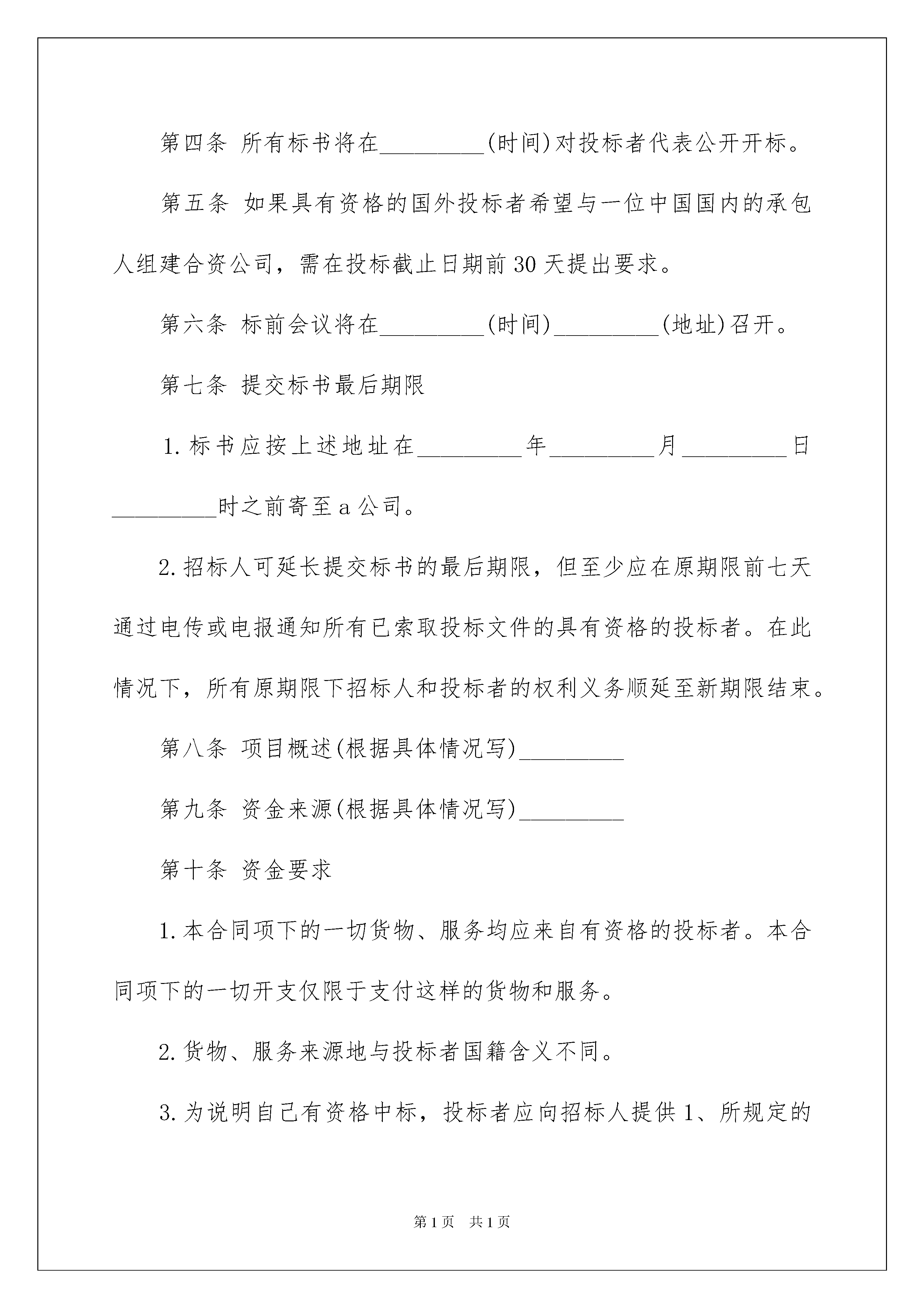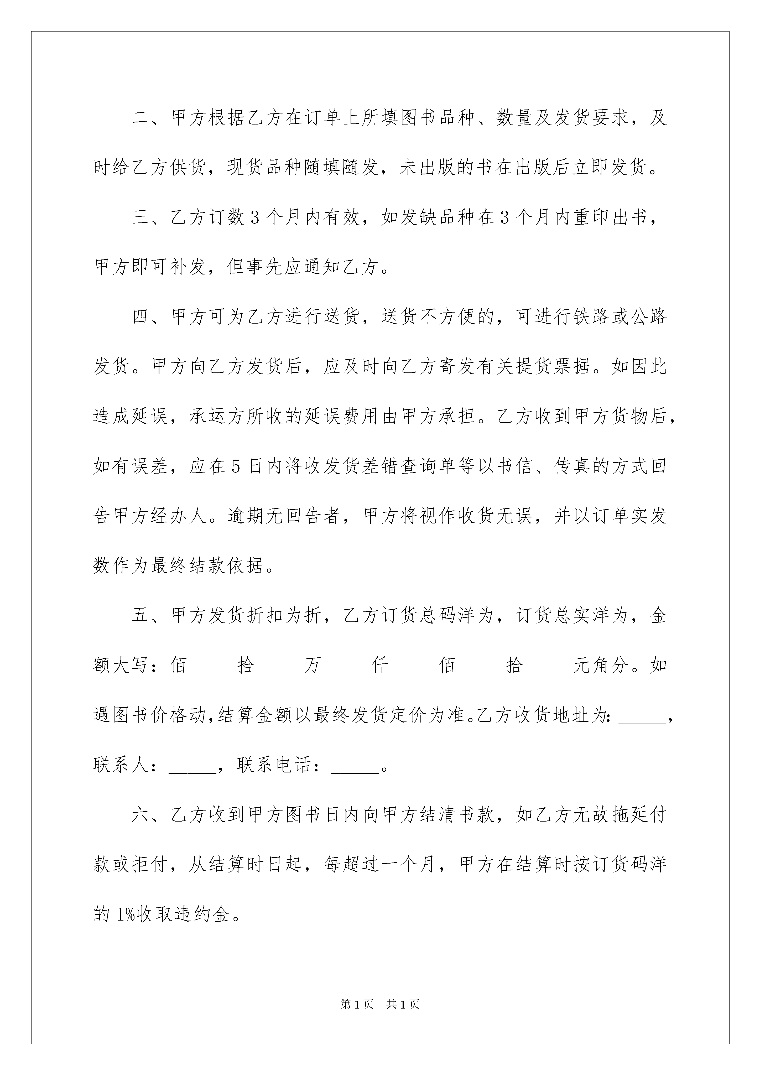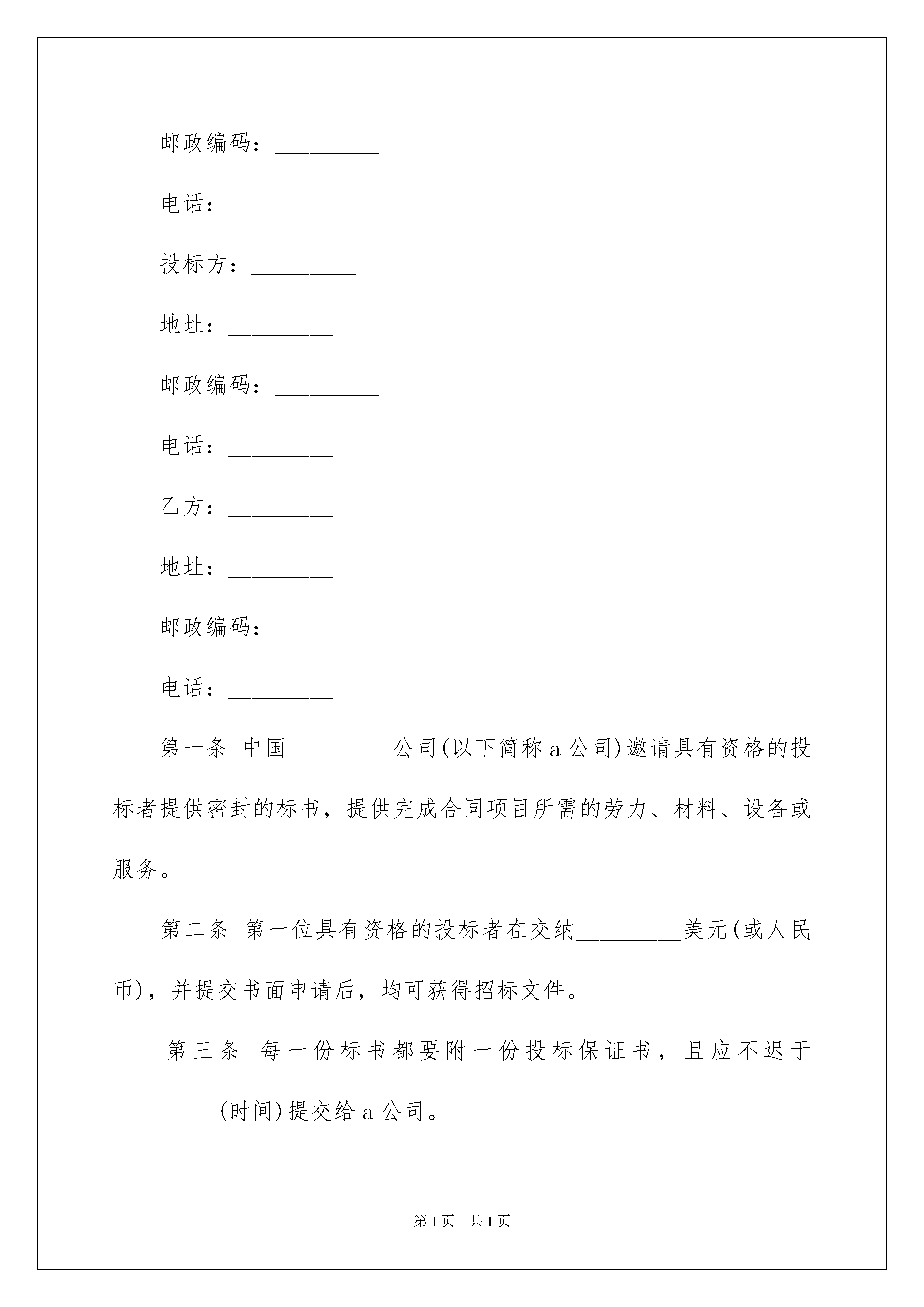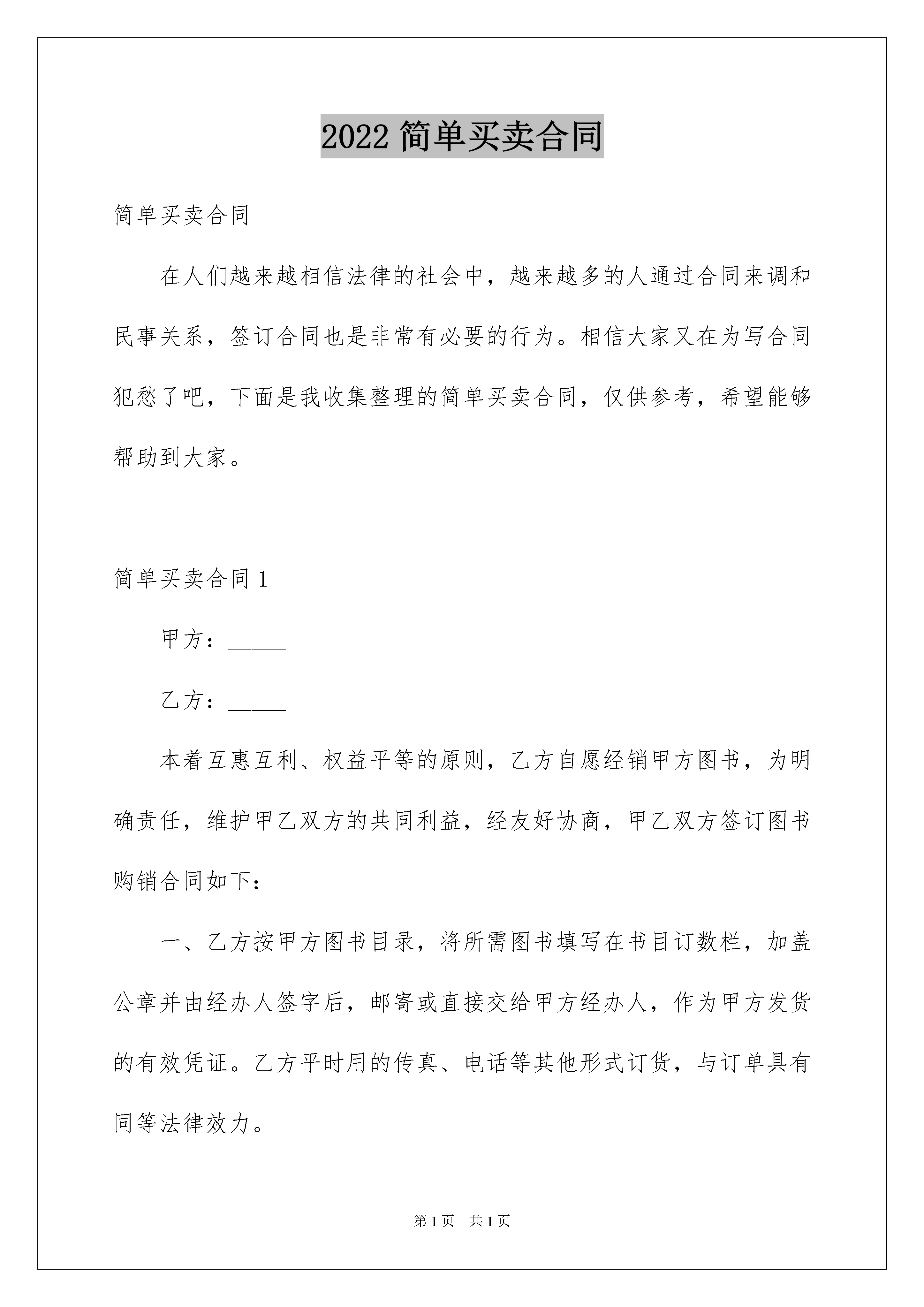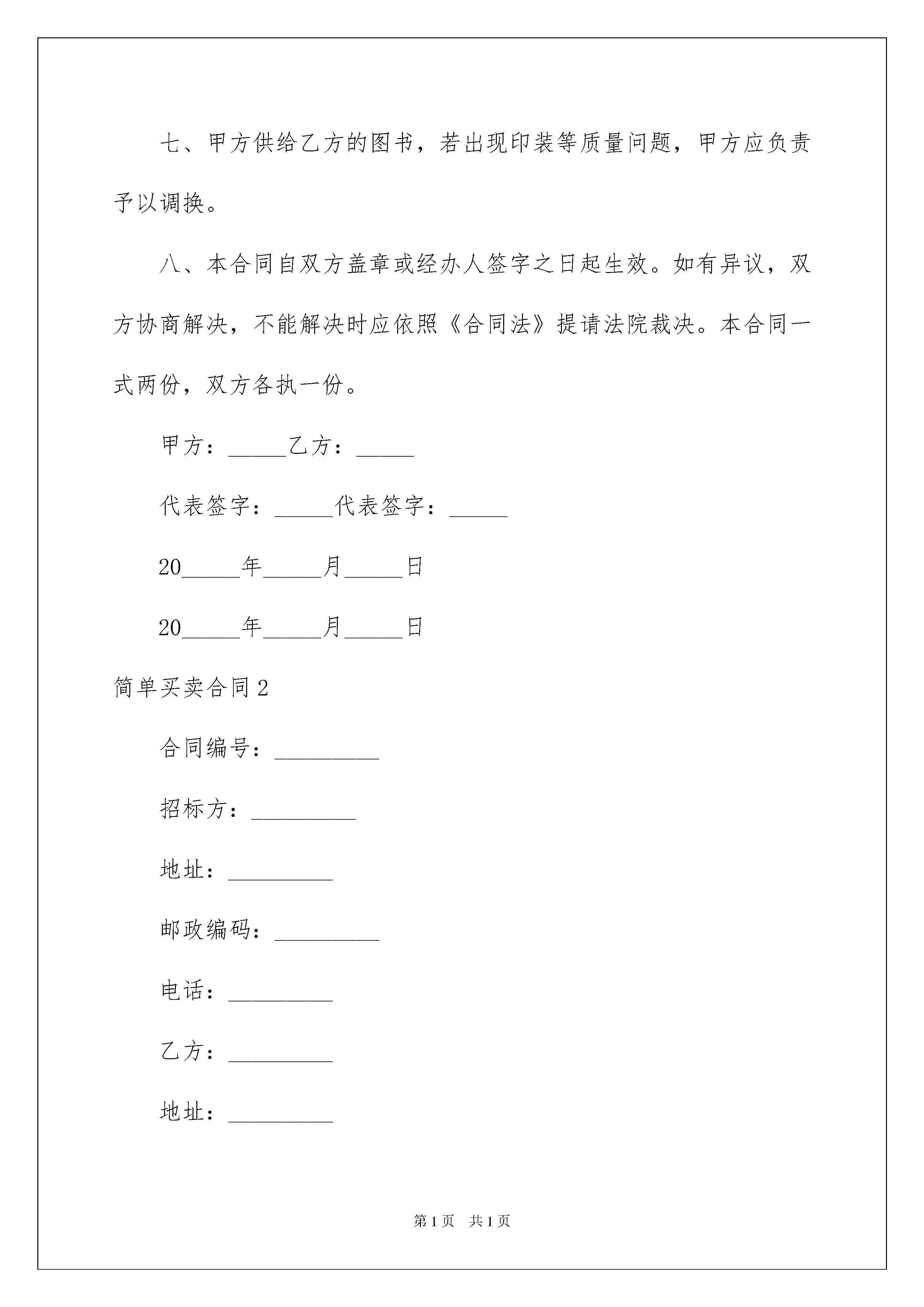 2022简单买卖合同简单买卖合同在人们越来越相信法律的社会中,越来越多的人通过合同来调和民事关系,签订合同也是非常有必要的行为。相信大家又在为写合同犯愁了吧,下面是我收集整理的简单买卖合同,仅供参考,希望能够帮助到大家。简单买卖合同1甲方:_____乙方:_____本着互惠互利、权益平等的原则,乙方自愿经销甲方图书,为明确责任,维护甲乙双方的共同利益,经友好协商,甲乙双方签订图书购销合同如下:一、乙方按甲方图书目录,将所需图书填写在书目订数栏,加盖公章并由经办人签字后,邮寄或直接交给甲方经办人,作为甲方发货的有效凭证。乙方平时用的传真、电话等其他形式订货,与订单具有同等法律效力。二、甲方根据乙方在订单上所填图书品种、数量及发货要求,及时给乙方供货,现货品种随填随发,未出版的书在出版后立即发货。三、乙方订数3个月内有效,如发缺品种在3个月内重印出书,甲方即可补发,但事先应通知乙方。四、甲方可为乙方进行送货,送货不方便的,可进行铁路或公路发货。甲方向乙方发货后,应及时向乙方寄发有关提货票据。如因此造成延误,承运方所收的延误费用由甲方承担。乙方收到甲方货物后,如有误差,应在5日内将收发货差错查询单等以书信、传真的方式回告甲方经办人。逾期无回告者,甲方将视作收货无误,并以订单实发数作为最终结款依据。五、甲方发货折扣为折,乙方订货总码洋为,订货总实洋为,金额大写:佰_____拾_____万_____仟_____佰_____拾_____元角分。如遇图书价格动,结算金额以最终发货定价为准。乙方收货地址为:_____,联系人:_____,联系电话:_____。六、乙方收到甲方图书日内向甲方结清书款,如乙方无故拖延付款或拒付,从结算时日起,每超过一个月,甲方在结算时按订货码洋的1%收取违约金。七、甲方供给乙方的图书,若出现印装等质量问题,甲方应负责予以调换。八、本合同自双方盖章或经办人签字之日起生效。如有异议,双方协商解决,不能解决时应依照《合同法》提请法院裁决。本合同一式两份,双方各执一份。甲方:_____乙方:_____代表签字:_____代表签字:_____20_____年_____月_____日20_____年_____月_____日简单买卖合同2合同编号:_________招标方:_________地址:_________邮政编码:_________电话:_________乙方:_________地址:_________邮政编码:_________电话:_________投标方:_________地址:_________邮政编码:_________电话:_________乙方:_________地址:_________邮政编码:_________电话:_________第一条中国_________公司(以下简称a公司)邀请具有资格的投标者提供密封的标书,提供完成合同项目所需的劳力、材料、设备或服务。第二条第一位具有资格的投标者在交纳_________美元(或人民币),并提交书面申请后,均可获得招标文件。第三条每一份标书都要附一份投标保证书,且应不迟于_________(时间)提交给a公司。第四条所有标书将在_________(时间)对投标者代表公开开标。第五条如果具有资格的国外投标者希望与一位中国国内的承包人组建合资公司,需在投标截止日期前30天提出要求。第六条标前会议将在_________(时间)_________(地址)召开。第七条提交标书最后期限1.标书应按上述地址在_________年_________月_________日_________时之前寄至a公司。2.招标人可延长提交标书的最后期限,但至少应在原期限前七天通过电传或电报通知所有已索取投标文件的具有资格的投标者。在此情况下,所有原期限下招标人和投标者的权利义务顺延至新期限结束。第八条项目概述(根据具体情况写)_________第九条资金来源(根据具体情况写)_________第十条资金要求1.本合同项下的一切货物、服务均应来自有资格的投标者。本合同项下的一切开支仅限于支付这样的货物和服务。2.货物、服务来源地与投标者国籍含义不同。3.为说明自己有资格中标,投标者应向招标人提供1、所规定的证明,保证有效地执行合同。为此,招标者在公布中标者前,可要求投标者更新其先前提供的资格证明材料。投标者提供的材料应包括:(1)法律地位证明文件复本,注册地及主要经营场所。如果是合资公司,应提供合资者的材料。(2)提供主要合同执行人的资格、经历证明材料。(3)填写执行合同计划所需设备。(4)填写可能的分包人。(5)目前进行中涉及投标