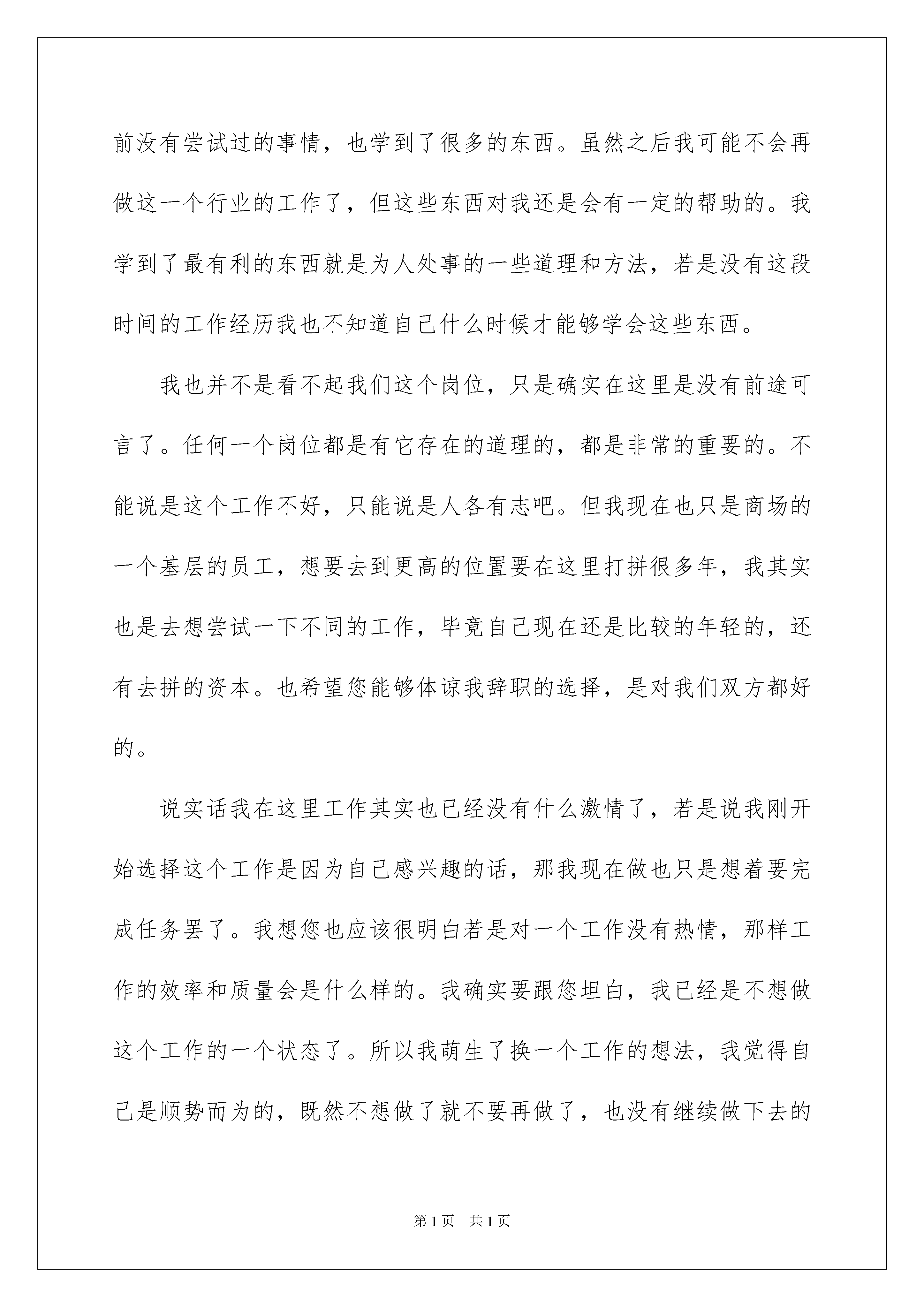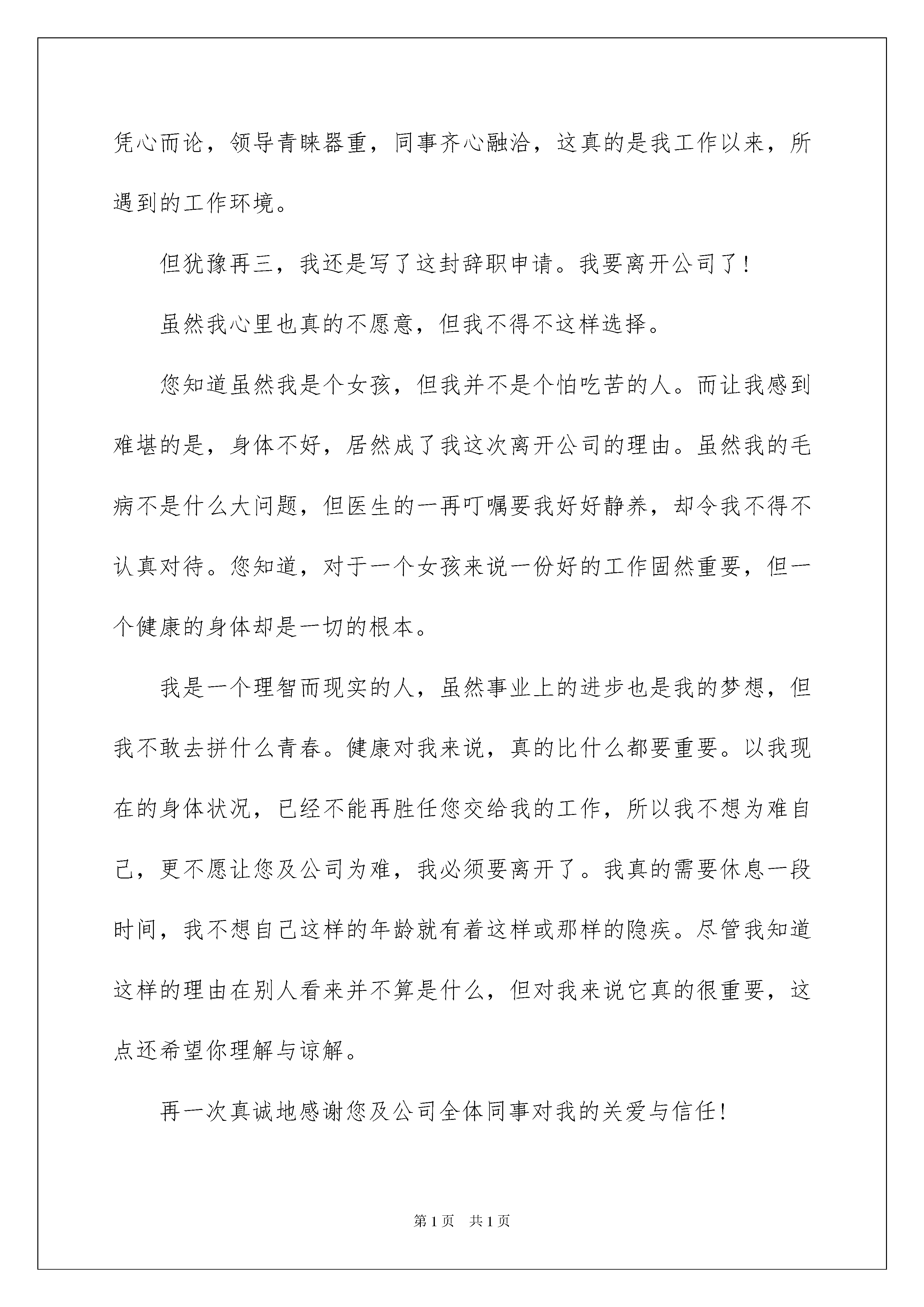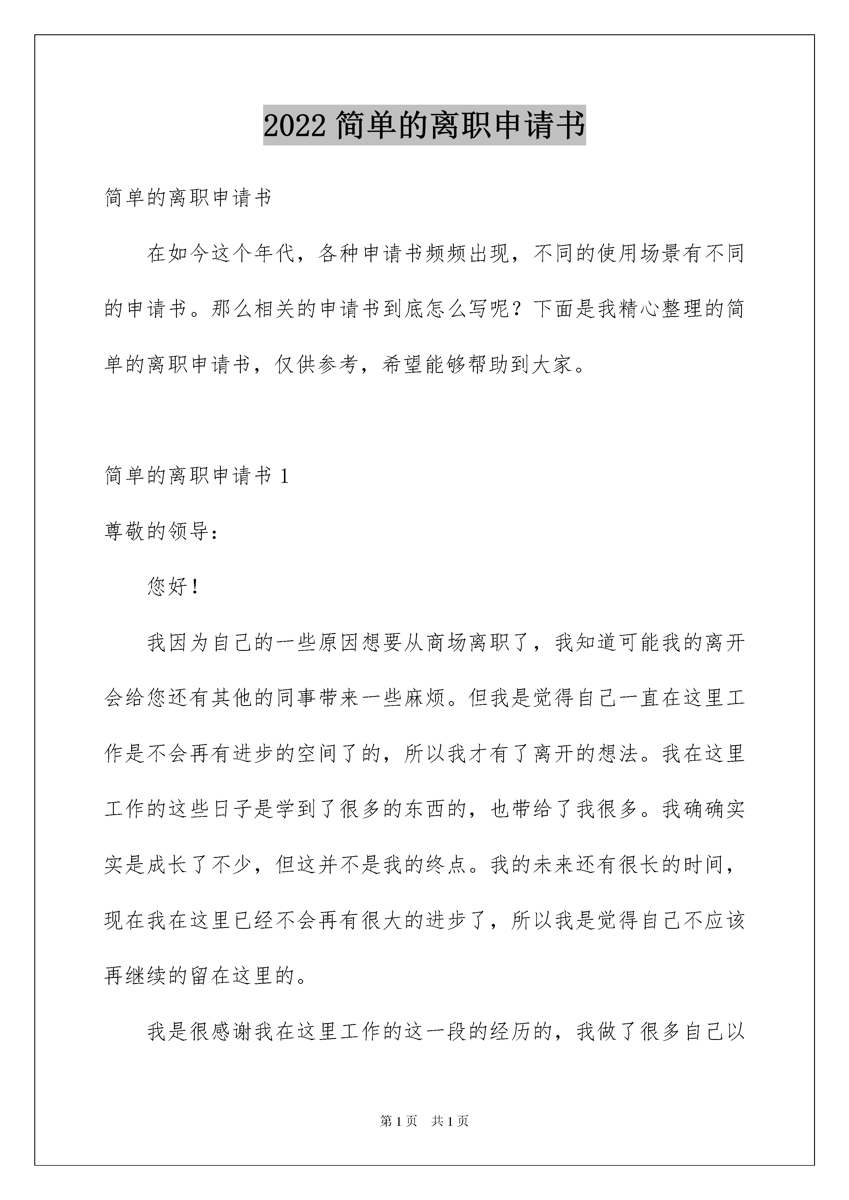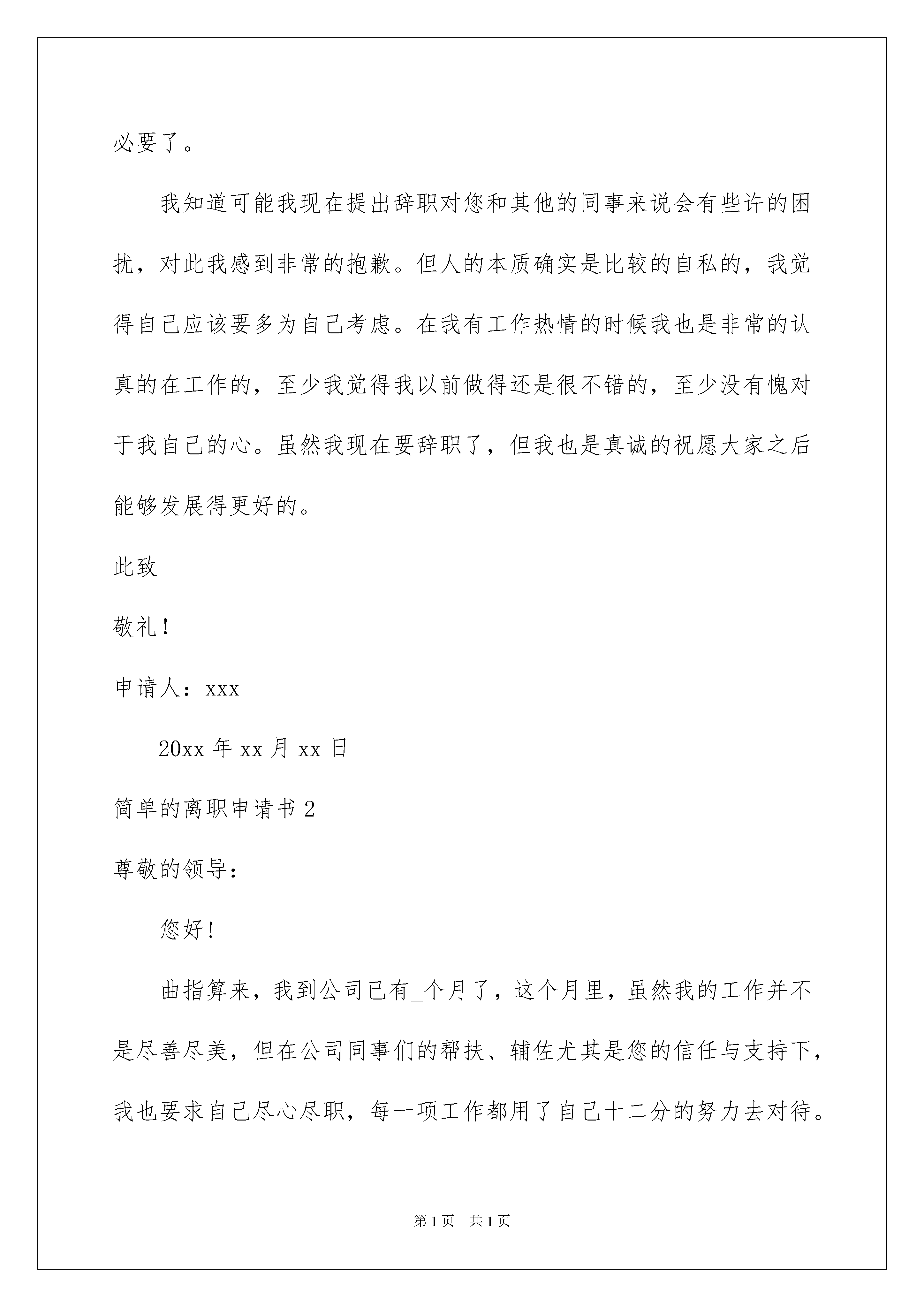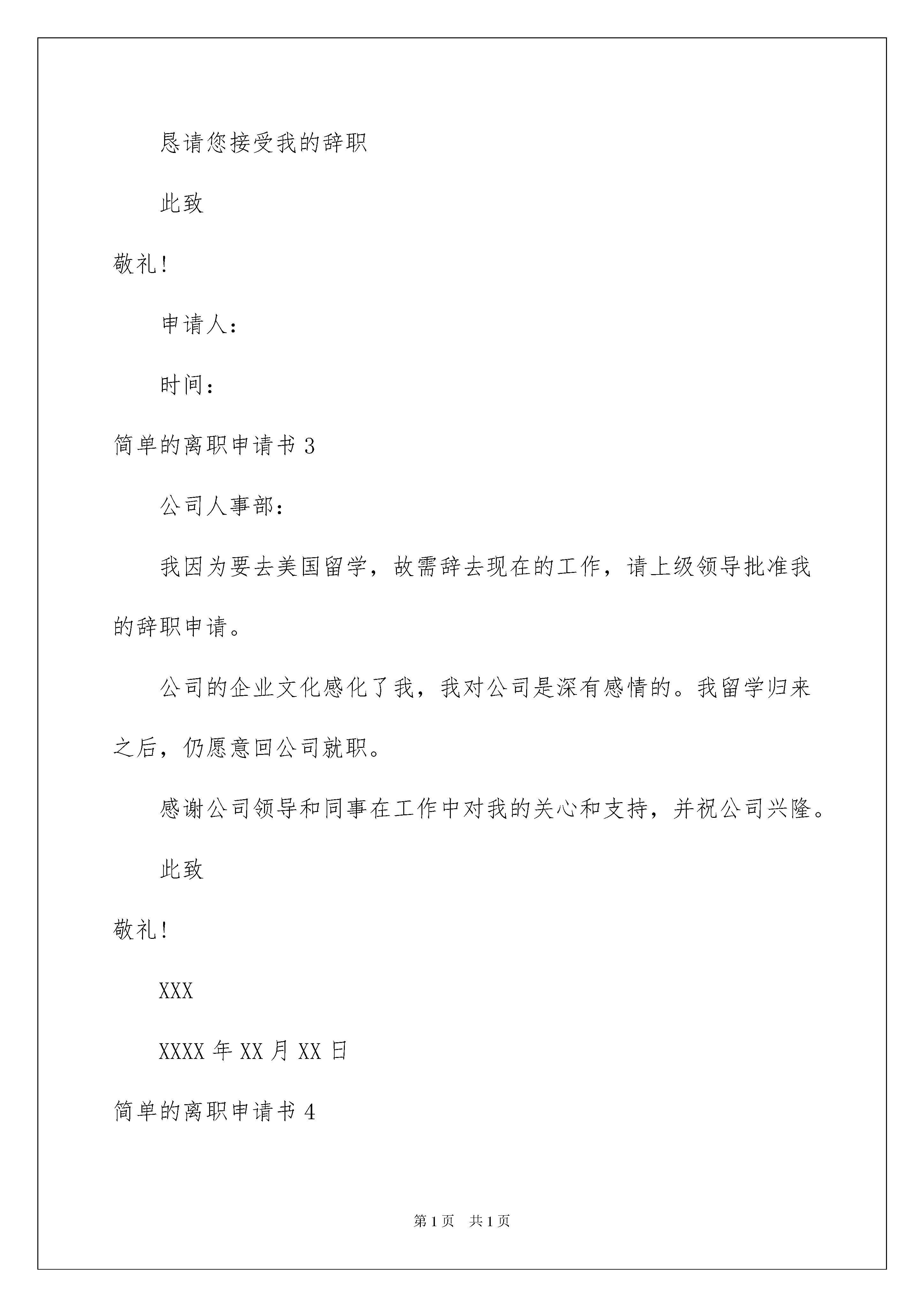 2022简单的离职申请书简单的离职申请书在如今这个年代,各种申请书频频出现,不同的使用场景有不同的申请书。那么相关的申请书到底怎么写呢?下面是我精心整理的简单的离职申请书,仅供参考,希望能够帮助到大家。简单的离职申请书1尊敬的领导:您好!我因为自己的一些原因想要从商场离职了,我知道可能我的离开会给您还有其他的同事带来一些麻烦。但我是觉得自己一直在这里工作是不会再有进步的空间了的,所以我才有了离开的想法。我在这里工作的这些日子是学到了很多的东西的,也带给了我很多。我确确实实是成长了不少,但这并不是我的终点。我的未来还有很长的时间,现在我在这里已经不会再有很大的进步了,所以我是觉得自己不应该再继续的留在这里的。我是很感谢我在这里工作的这一段的经历的,我做了很多自己以前没有尝试过的事情,也学到了很多的东西。虽然之后我可能不会再做这一个行业的工作了,但这些东西对我还是会有一定的帮助的。我学到了最有利的东西就是为人处事的一些道理和方法,若是没有这段时间的工作经历我也不知道自己什么时候才能够学会这些东西。我也并不是看不起我们这个岗位,只是确实在这里是没有前途可言了。任何一个岗位都是有它存在的道理的,都是非常的重要的。不能说是这个工作不好,只能说是人各有志吧。但我现在也只是商场的一个基层的员工,想要去到更高的位置要在这里打拼很多年,我其实也是去想尝试一下不同的工作,毕竟自己现在还是比较的年轻的,还有去拼的资本。也希望您能够体谅我辞职的选择,是对我们双方都好的。说实话我在这里工作其实也已经没有什么激情了,若是说我刚开始选择这个工作是因为自己感兴趣的话,那我现在做也只是想着要完成任务罢了。我想您也应该很明白若是对一个工作没有热情,那样工作的效率和质量会是什么样的。我确实要跟您坦白,我已经是不想做这个工作的一个状态了。所以我萌生了换一个工作的想法,我觉得自己是顺势而为的,既然不想做了就不要再做了,也没有继续做下去的必要了。我知道可能我现在提出辞职对您和其他的同事来说会有些许的困扰,对此我感到非常的抱歉。但人的本质确实是比较的自私的,我觉得自己应该要多为自己考虑。在我有工作热情的时候我也是非常的认真的在工作的,至少我觉得我以前做得还是很不错的,至少没有愧对于我自己的心。虽然我现在要辞职了,但我也是真诚的祝愿大家之后能够发展得更好的。此致敬礼!申请人:xxx20xx年xx月xx日简单的离职申请书2尊敬的领导:您好!曲指算来,我到公司已有_个月了,这个月里,虽然我的工作并不是尽善尽美,但在公司同事们的帮扶、辅佐尤其是您的信任与支持下,我也要求自己尽心尽职,每一项工作都用了自己十二分的努力去对待。凭心而论,领导青睐器重,同事齐心融洽,这真的是我工作以来,所遇到的工作环境。但犹豫再三,我还是写了这封辞职申请。我要离开公司了!虽然我心里也真的不愿意,但我不得不这样选择。您知道虽然我是个女孩,但我并不是个怕吃苦的人。而让我感到难堪的是,身体不好,居然成了我这次离开公司的理由。虽然我的毛病不是什么大问题,但医生的一再叮嘱要我好好静养,却令我不得不认真对待。您知道,对于一个女孩来说一份好的工作固然重要,但一个健康的身体却是一切的根本。我是一个理智而现实的人,虽然事业上的进步也是我的梦想,但我不敢去拼什么青春。健康对我来说,真的比什么都要重要。以我现在的身体状况,已经不能再胜任您交给我的工作,所以我不想为难自己,更不愿让您及公司为难,我必须要离开了。我真的需要休息一段时间,我不想自己这样的年龄就有着这样或那样的隐疾。尽管我知道这样的理由在别人看来并不算是什么,但对我来说它真的很重要,这点还希望你理解与谅解。再一次真诚地感谢您及公司全体同事对我的关爱与信任!恳请您接受我的辞职此致敬礼!申请人:时间:简单的离职申请书3公司人事部:我因为要去美国留学,故需辞去现在的工作,请上级领导批准我的辞职申请。公司的企业文化感化了我,我对公司是深有感情的。我留学归来之后,仍愿意回公司就职。感谢公司领导和同事在工作中对我的关心和支持,并祝公司兴隆。此致敬礼!XXXXXXX年XX月XX日简单的离职申请书4尊敬的领导:首先,感谢领导及同事在这x个多月里对我工作的支持与帮忙。在那里我学到了很多。在xxxx公司这一段时刻里,是我工作的宝贵财富,同时这段时刻也发现了自己很多不足之处,需要改善的地方也很多。正因是做xxxxx工作的关联,与同事朝夕相处,建立了友谊。我从内心期望这分友谊能继续并永久维持下去。但是正因我的个人的原因,经过深思熟虑的思考,我决定辞去我目前在公司所担任的职位。对由此为公司造成的不便,我深感抱歉。同时也期望公司思考到我的