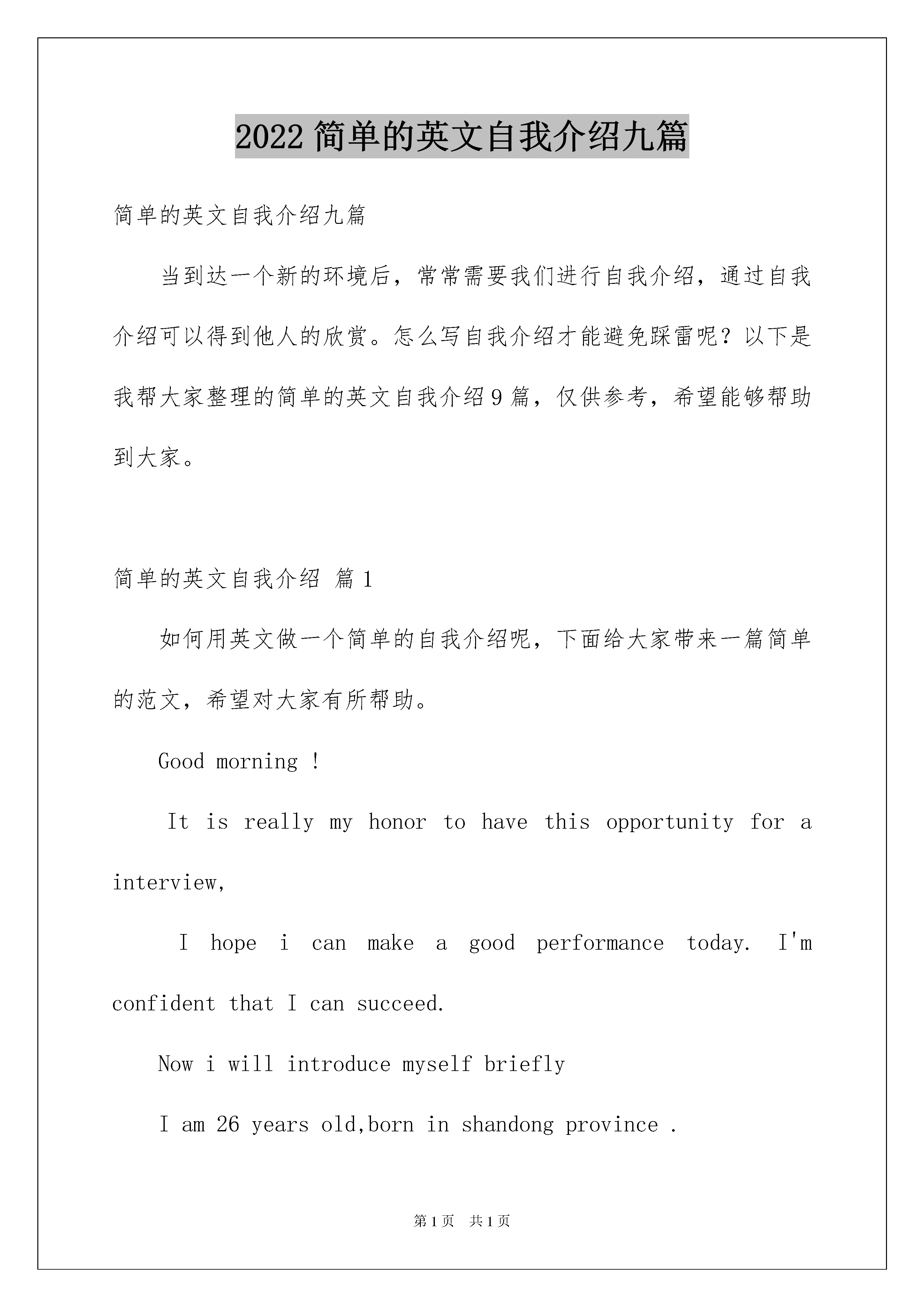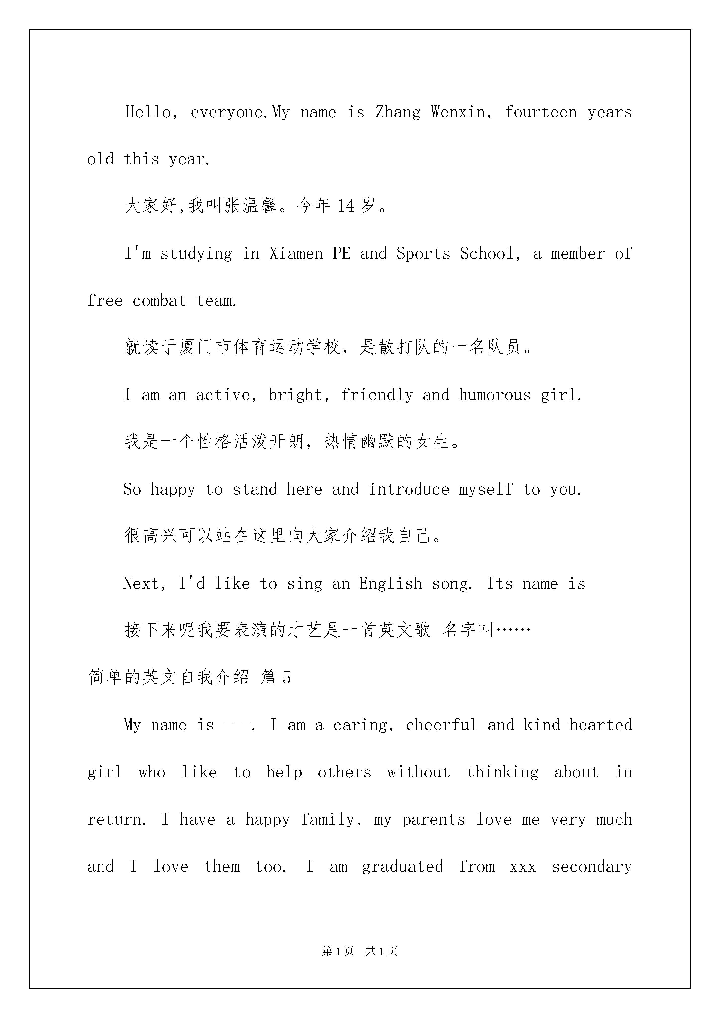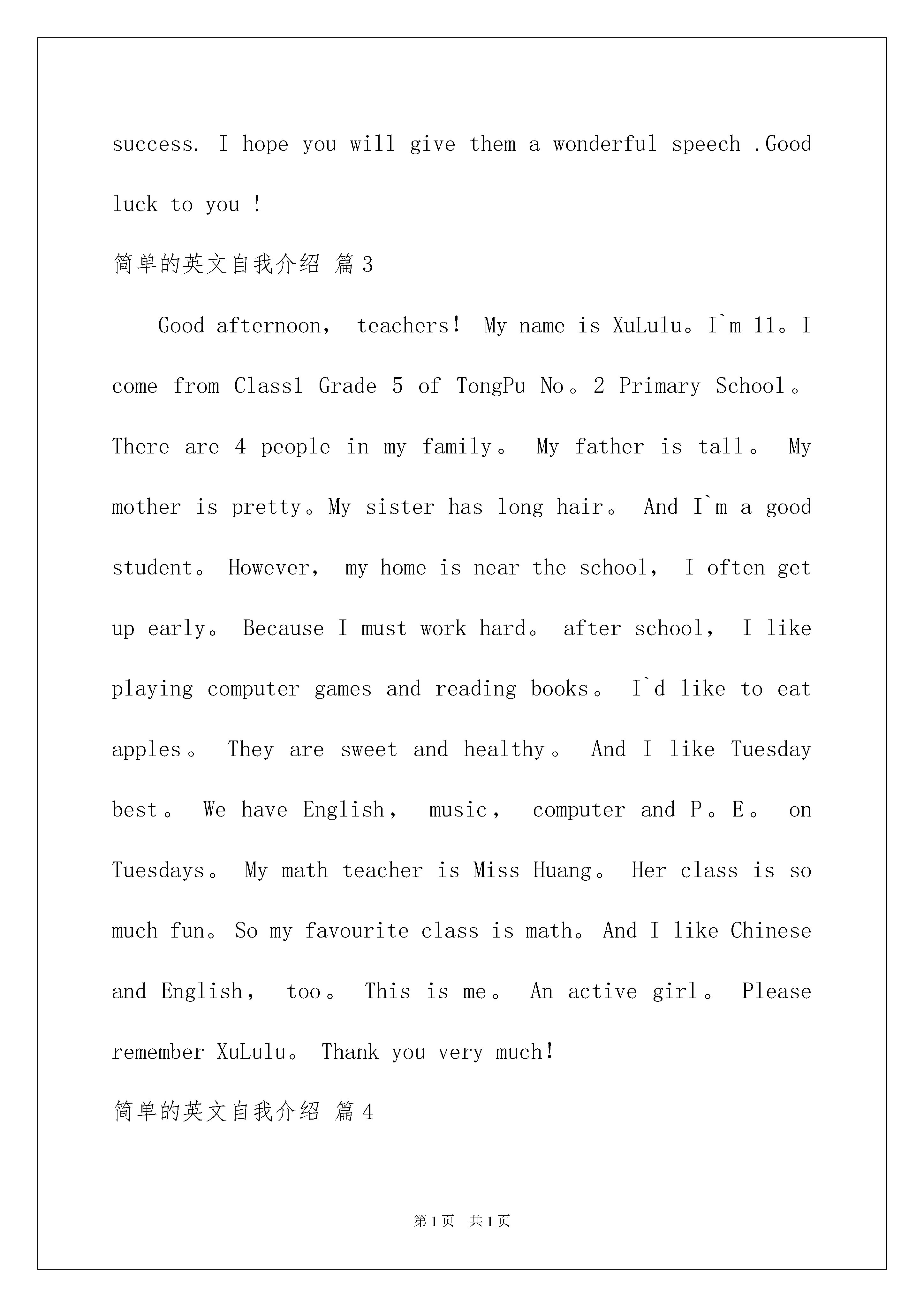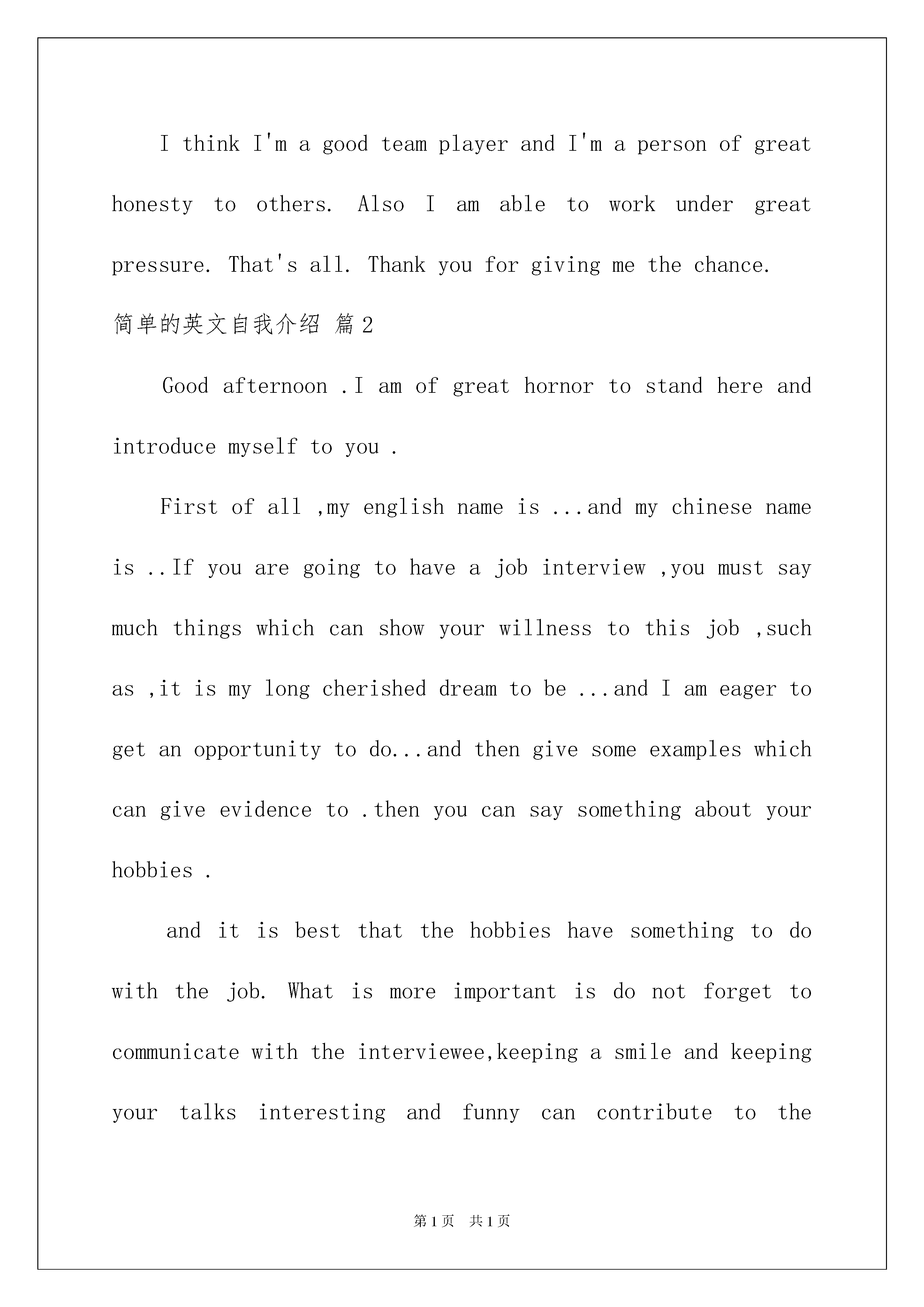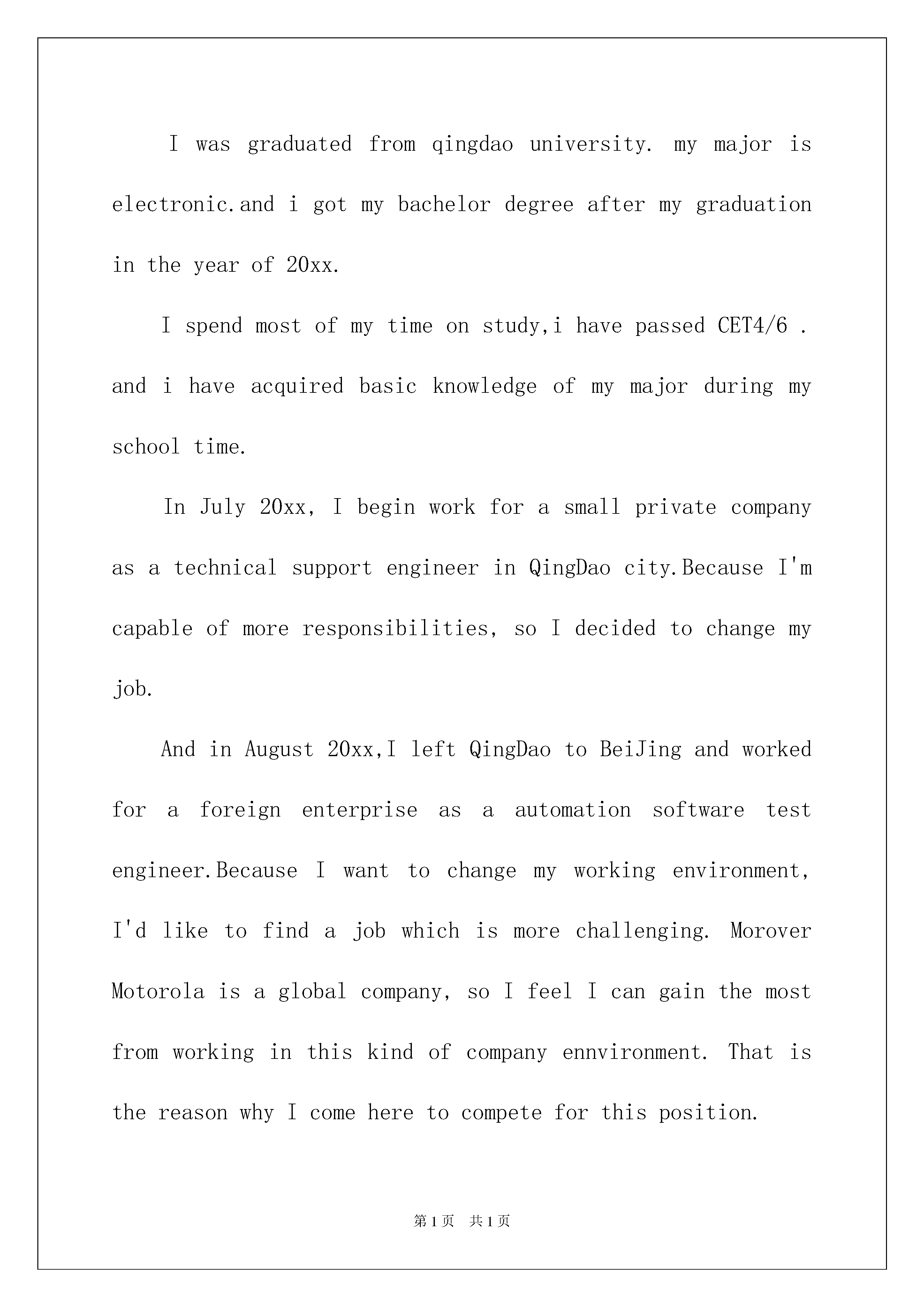 2022简单的英文自我介绍九篇简单的英文自我介绍九篇当到达一个新的环境后,常常需要我们进行自我介绍,通过自我介绍可以得到他人的欣赏。怎么写自我介绍才能避免踩雷呢?以下是我帮大家整理的简单的英文自我介绍9篇,仅供参考,希望能够帮助到大家。简单的英文自我介绍篇1如何用英文做一个简单的自我介绍呢,下面给大家带来一篇简单的范文,希望对大家有所帮助。Goodmorning!Itisreallymyhonortohavethisopportunityforainterview,Ihopeicanmakeagoodperformancetoday.I'mconfidentthatIcansucceed.NowiwillintroducemyselfbrieflyIam26yearsold,borninshandongprovince.Iwasgraduatedfromqingdaouniversity.mymajoriselectronic.andigotmybachelordegreeaftermygraduationintheyearof20xx.Ispendmostofmytimeonstudy,ihavepassedCET4/6.andihaveacquiredbasicknowledgeofmymajorduringmyschooltime.InJuly20xx,IbeginworkforasmallprivatecompanyasatechnicalsupportengineerinQingDaocity.BecauseI'mcapableofmoreresponsibilities,soIdecidedtochangemyjob.AndinAugust20xx,IleftQingDaotoBeiJingandworkedforaforeignenterpriseasaautomationsoftwaretestengineer.BecauseIwanttochangemyworkingenvironment,I'dliketofindajobwhichismorechallenging.MoroverMotorolaisaglobalcompany,soIfeelIcangainthemostfromworkinginthiskindofcompanyennvironment.ThatisthereasonwhyIcomeheretocompeteforthisposition.IthinkI'magoodteamplayerandI'mapersonofgreathonestytoothers.AlsoIamabletoworkundergreatpressure.That'sall.Thankyouforgivingmethechance.简单的英文自我介绍篇2Goodafternoon.Iamofgreathornortostandhereandintroducemyselftoyou.Firstofall,myenglishnameis...andmychinesenameis..Ifyouaregoingtohaveajobinterview,youmustsaymuchthingswhichcanshowyourwillnesstothisjob,suchas,itismylongcherisheddreamtobe...andIameagertogetanopportunitytodo...andthengivesomeexampleswhichcangiveevidenceto.thenyoucansaysomethingaboutyourhobbies.anditisbestthatthehobbieshavesomethingtodowiththejob.Whatismoreimportantisdonotforgettocommunicatewiththeinterviewee,keepingasmileandkeepingyourtalksinterestingandfunnycancontributetothesuccess.Ihopeyouwillgivethemawonderfulspeech.Goodlucktoyou!简单的英文自我介绍篇3Goodafternoon,teachers!MynameisXuLulu。I`m11。IcomefromClass1Grade5ofTongPuNo。2PrimarySchool。Thereare4p