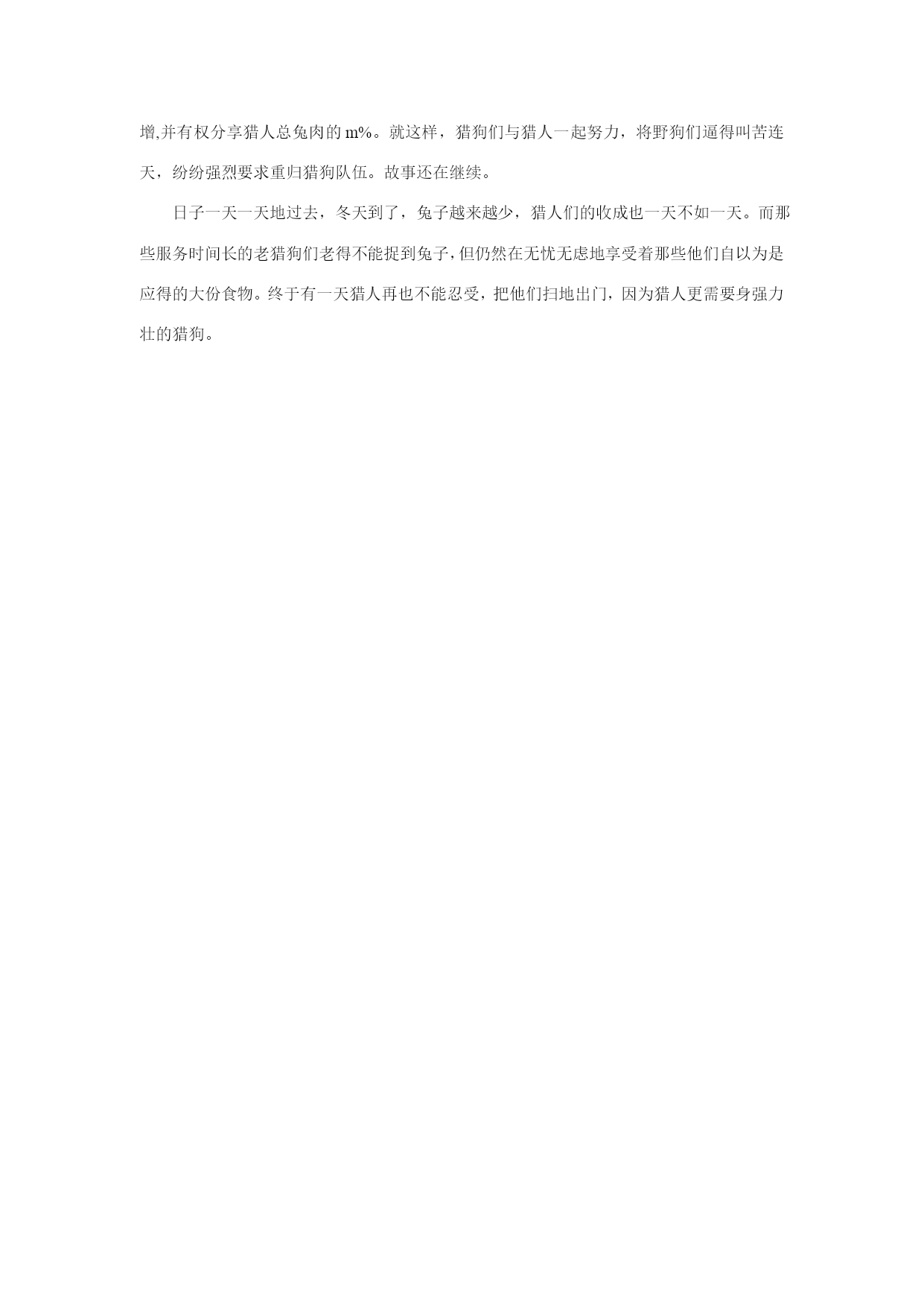 一条猎狗将兔子赶出了窝,一直追赶他,追了很久仍没有捉到。牧羊看到此种情景,讥笑猎狗说“你们两个之间小的反而跑得快得多。”猎狗回答说:“你不知道,我们两个的跑是完全不同的!我仅仅为了一顿饭而跑,他却是为了性命而跑呀!” 这话被猎人听到了,猎人想:猎狗说的对啊,那我要想得到更多的猎物,得想个好法子。于是,猎人又买来几条猎狗,凡是能够在打猎中捉到兔子的,就可以得到几根骨头,捉不到的就没有饭吃。这一招果然有用,猎狗们纷纷去努力追兔子,因为谁都不愿意看着别人有骨头吃,自己没的吃。就这样过了一段时间,问题又出现了。大兔子非常难捉到,小兔子好捉。但捉到大兔子得到的奖赏和捉到小兔子得到的骨头差不多,猎狗们善于观察发现了这个窍门,专门去捉小兔子。慢慢的,大家都发现了这个窍门。猎人对猎狗说:最近你们捉的兔子越来越小了,为什么?猎狗们说:反正没有什么大的区别,为什么费那么大的劲去捉那些大的呢? 猎人经过思考后,决定不将分得骨头的数量与是否捉到兔子挂钩,而是采用每过一段时间,就统计一次猎狗捉到兔子的总重量。按照重量来评价猎狗,决定一段时间内的待遇。于是猎狗们捉到兔子的数量和重量都增加了。猎人很开心。但是过了一段时间,猎人发现,猎狗们捉兔子的数量又少了,而且越有经验的猎狗,捉兔子的数量下降的就越利害。于是猎人又去问猎狗。猎狗说:“我们把最好的时间都奉献给了您,主人,但是我们随着时间的推移会老,当我们捉不到兔子的时候,您还会给我们骨头吃吗?” 猎人做了论功行赏的决定。分析与汇总了所有猎狗捉到兔子的数量与重量,规定如果捉到的兔子超过了一定的数量后,即使捉不到兔子,每顿饭也可以得到一定数量的骨头。猎狗们都很高兴,大家都努力去达到猎人规定的数量。一段时间过后,终于有一些猎狗达到了猎人规定的数量。这时,其中有一只猎狗说:“我们这么努力,只得到几根骨头,而我们捉的猎物远远超过了这几根骨头。我们为什么不能给自己捉兔子呢?”于是,有些猎狗离开了猎人,自己捉兔子去了。 猎人意识到猎狗正在流失,并且那些流失的猎狗像野狗一般和自己的猎狗抢兔子。情况变得越来越糟,猎人不得已引诱了一条野狗,问他到底野狗比猎狗强在那里。野狗说:“猎狗吃的是骨头,吐出来的是肉啊!”,接着又道:“也不是所有的野狗都顿顿有肉吃,大部分最后骨头都没的舔!不然也不至于被你诱惑。”于是猎人进行了改革,使得每条猎狗除基本骨头外,可获得其所猎兔肉总量的n%,而且随着服务时间加长,贡献变大,该比例还可递增,并有权分享猎人总兔肉的m%。就这样,猎狗们与猎人一起努力,将野狗们逼得叫苦连天,纷纷强烈要求重归猎狗队伍。故事还在继续。 日子一天一天地过去,冬天到了,兔子越来越少,猎人们的收成也一天不如一天。而那些服务时间长的老猎狗们老得不能捉到兔子,但仍然在无忧无虑地享受着那些他们自以为是应得的大份食物。终于有一天猎人再也不能忍受,把他们扫地出门,因为猎人更需要身强力壮的猎狗。