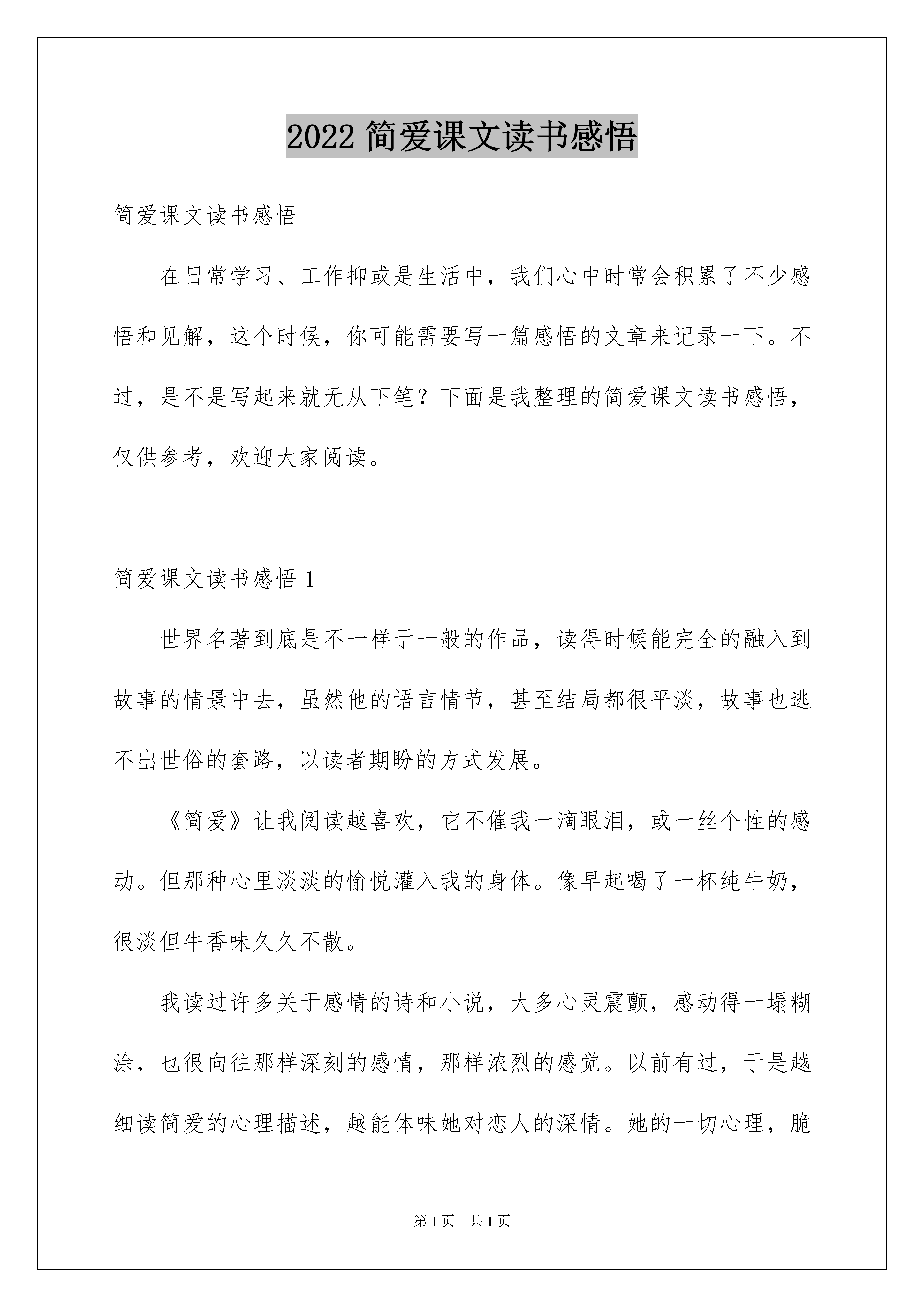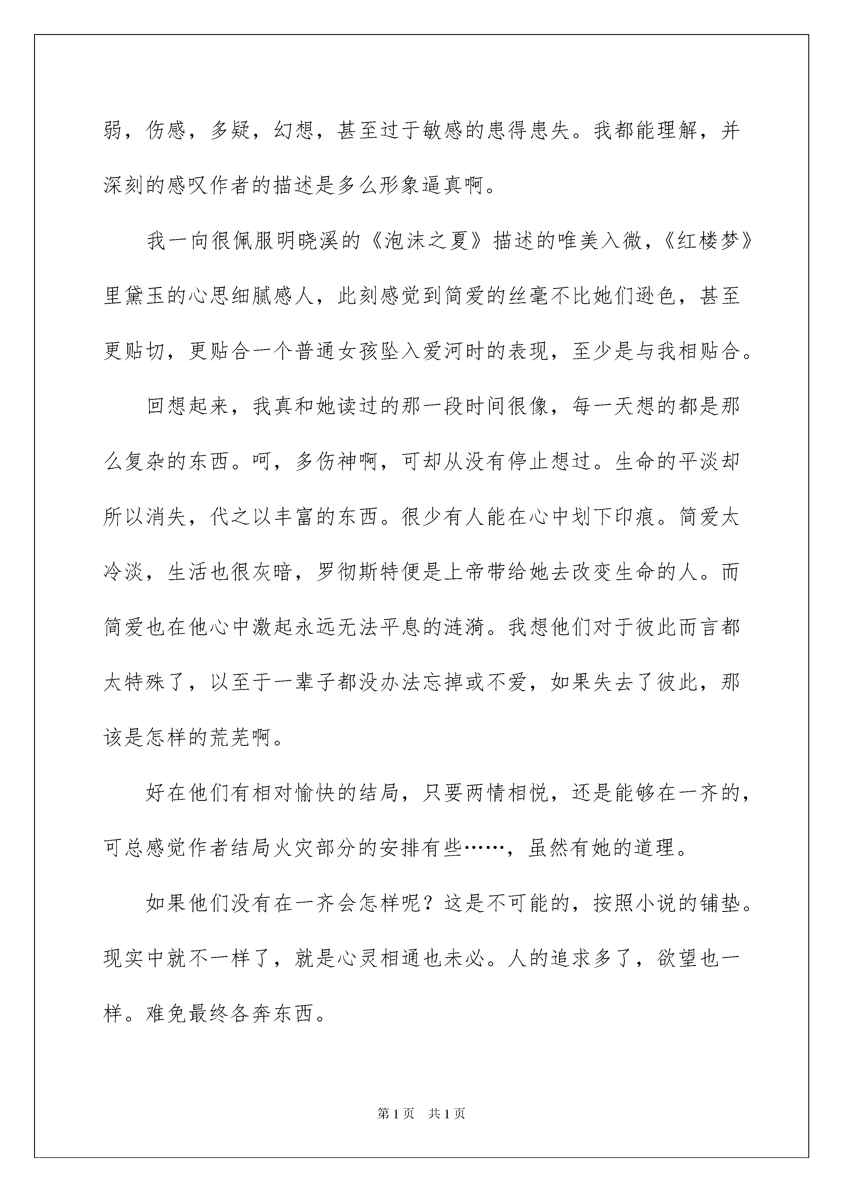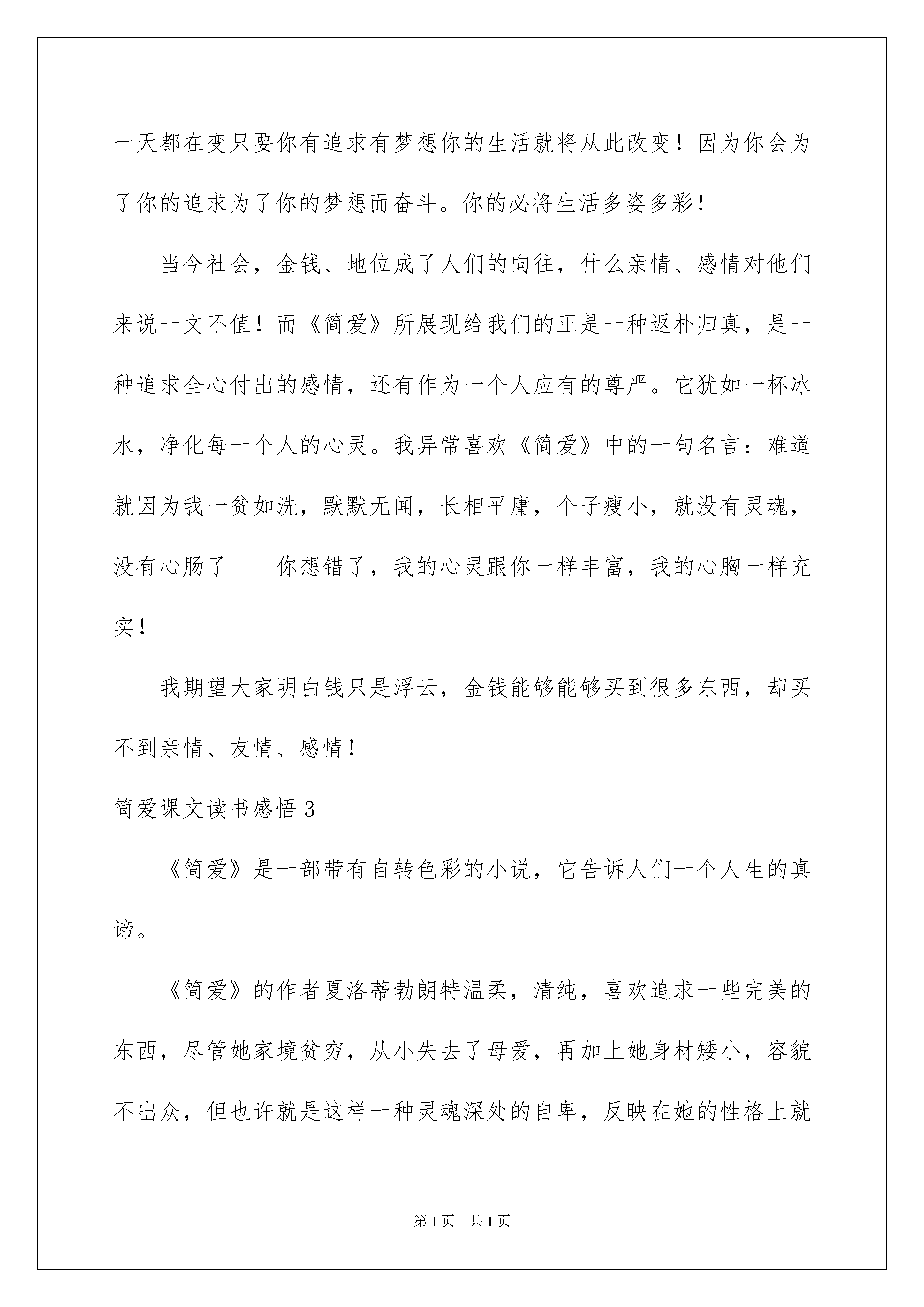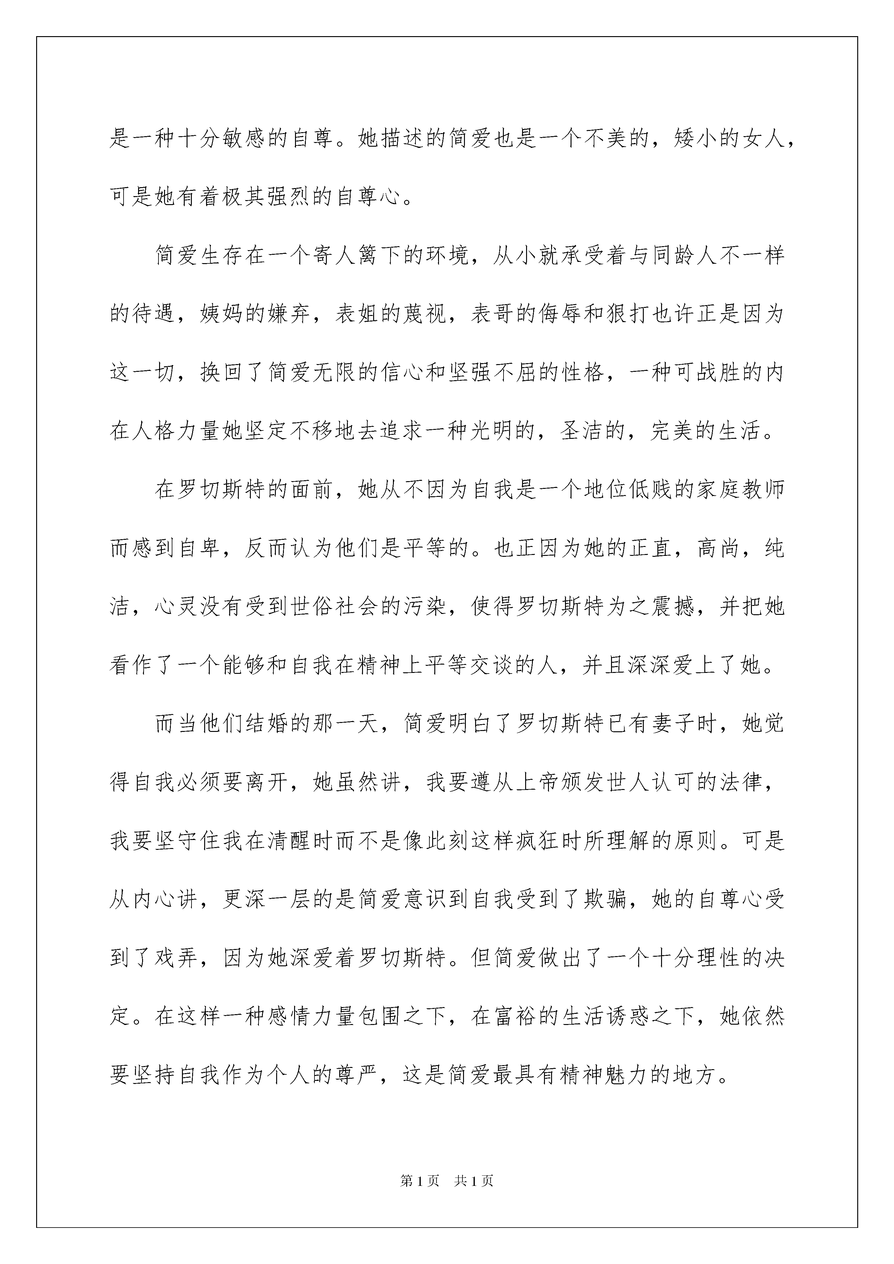 2022简爱课文读书感悟简爱课文读书感悟在日常学习、工作抑或是生活中,我们心中时常会积累了不少感悟和见解,这个时候,你可能需要写一篇感悟的文章来记录一下。不过,是不是写起来就无从下笔?下面是我整理的简爱课文读书感悟,仅供参考,欢迎大家阅读。简爱课文读书感悟1世界名著到底是不一样于一般的作品,读得时候能完全的融入到故事的情景中去,虽然他的语言情节,甚至结局都很平淡,故事也逃不出世俗的套路,以读者期盼的方式发展。《简爱》让我阅读越喜欢,它不催我一滴眼泪,或一丝个性的感动。但那种心里淡淡的愉悦灌入我的身体。像早起喝了一杯纯牛奶,很淡但牛香味久久不散。我读过许多关于感情的诗和小说,大多心灵震颤,感动得一塌糊涂,也很向往那样深刻的感情,那样浓烈的感觉。以前有过,于是越细读简爱的心理描述,越能体味她对恋人的深情。她的一切心理,脆弱,伤感,多疑,幻想,甚至过于敏感的患得患失。我都能理解,并深刻的感叹作者的描述是多么形象逼真啊。我一向很佩服明晓溪的《泡沫之夏》描述的唯美入微,《红楼梦》里黛玉的心思细腻感人,此刻感觉到简爱的丝毫不比她们逊色,甚至更贴切,更贴合一个普通女孩坠入爱河时的表现,至少是与我相贴合。回想起来,我真和她读过的那一段时间很像,每一天想的都是那么复杂的东西。呵,多伤神啊,可却从没有停止想过。生命的平淡却所以消失,代之以丰富的东西。很少有人能在心中划下印痕。简爱太冷淡,生活也很灰暗,罗彻斯特便是上帝带给她去改变生命的人。而简爱也在他心中激起永远无法平息的涟漪。我想他们对于彼此而言都太特殊了,以至于一辈子都没办法忘掉或不爱,如果失去了彼此,那该是怎样的荒芜啊。好在他们有相对愉快的结局,只要两情相悦,还是能够在一齐的,可总感觉作者结局火灾部分的安排有些……,虽然有她的道理。如果他们没有在一齐会怎样呢?这是不可能的,按照小说的铺垫。现实中就不一样了,就是心灵相通也未必。人的追求多了,欲望也一样。难免最终各奔东西。简爱是个个性的人,她不求什么,也不被现实的枷锁所累,无欲则刚,她能够一心持续特立独行的她。或许这正是我该学习的,想太多,难免会陷入牢笼之中。倒不如简单淡薄的好。简爱课文读书感悟2《简爱》是英国女作家夏洛蒂·勃朗特对生活的写照,同时也是反映女性生活的成长故事。这简·爱是个孤儿,从小寄养在舅母家中,受尽百般欺凌。之后进了慈善学校洛伍德孤儿院,灵魂和肉体都经受了苦痛的折磨。也许正是这样才换回了简·爱无限的信心和坚强不屈的精神,她以顽强的意志以成绩优秀完成了学业。为了追求独立生活,她受聘在桑菲尔德庄园任家庭教师。故事的重点是身份低下的家庭教师简·爱与男主人罗切斯特之间历经磨难的感情。这段感情因男女主人公悬殊的社会地位和个性的差异而充满了激烈碰撞,也因两人志趣相同、真诚相爱而迸发出灿烂的火花。作者以简·爱鲜明独特的女性视角和叙事风格娓娓道来,真实而有艺术感染力。异常是简·爱的独特个性和思想,爱是一个不美的,矮小的女人,但她有顽强的自尊心。在打动身为贵族的男主人公的同时,也紧紧抓住了我们读者的心。这让我深深的感受到命运是不公平的可是人确是平等的,生活每一天都在变只要你有追求有梦想你的生活就将从此改变!因为你会为了你的追求为了你的梦想而奋斗。你的必将生活多姿多彩!当今社会,金钱、地位成了人们的向往,什么亲情、感情对他们来说一文不值!而《简爱》所展现给我们的正是一种返朴归真,是一种追求全心付出的感情,还有作为一个人应有的尊严。它犹如一杯冰水,净化每一个人的心灵。我异常喜欢《简爱》中的一句名言:难道就因为我一贫如洗,默默无闻,长相平庸,个子瘦小,就没有灵魂,没有心肠了——你想错了,我的心灵跟你一样丰富,我的心胸一样充实!我期望大家明白钱只是浮云,金钱能够能够买到很多东西,却买不到亲情、友情、感情!简爱课文读书感悟3《简爱》是一部带有自转色彩的小说,它告诉人们一个人生的真谛。《简爱》的作者夏洛蒂勃朗特温柔,清纯,喜欢追求一些完美的东西,尽管她家境贫穷,从小失去了母爱,再加上她身材矮小,容貌不出众,但也许就是这样一种灵魂深处的自卑,反映在她的性格上就是一种十分敏感的自尊。她描述的简爱也是一个不美的,矮小的女人,可是她有着极其强烈的自尊心。简爱生存在一个寄人篱下的环境,从小就承受着与同龄人不一样的待遇,姨妈的嫌弃,表姐的蔑视,表哥的侮辱和狠打也许正是因为这一切,换回了简爱无限的信心和坚强不屈的性格,一种可战胜的内在人格力量她坚定不移地去追求一种光明的,圣洁的,完美的生活。在罗切斯特的面前,她从不因为自我是一个地位低贱的家庭教师而感到自卑,反而认为他们是平等的。也正因为她的正直,高尚,纯洁,心灵没