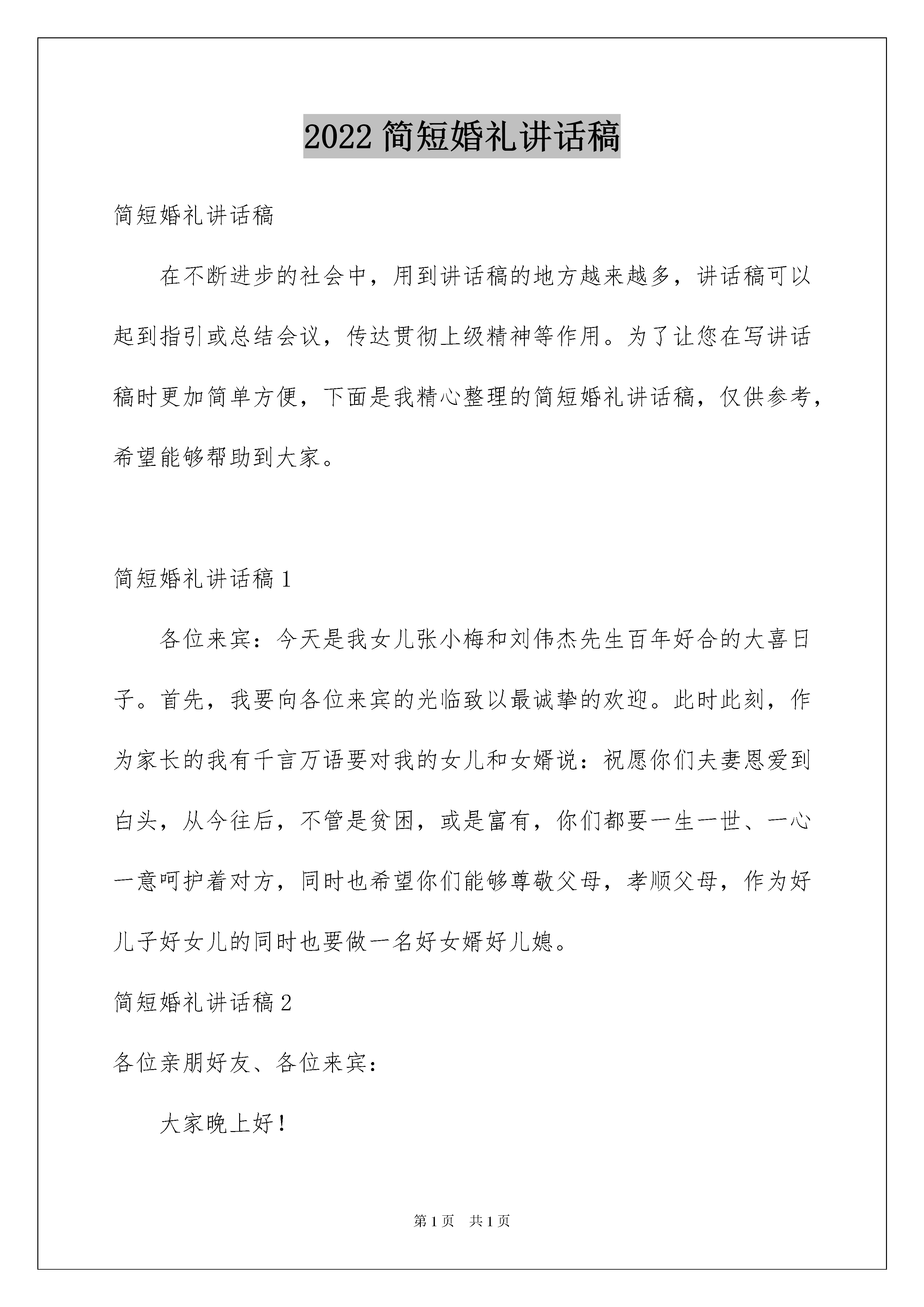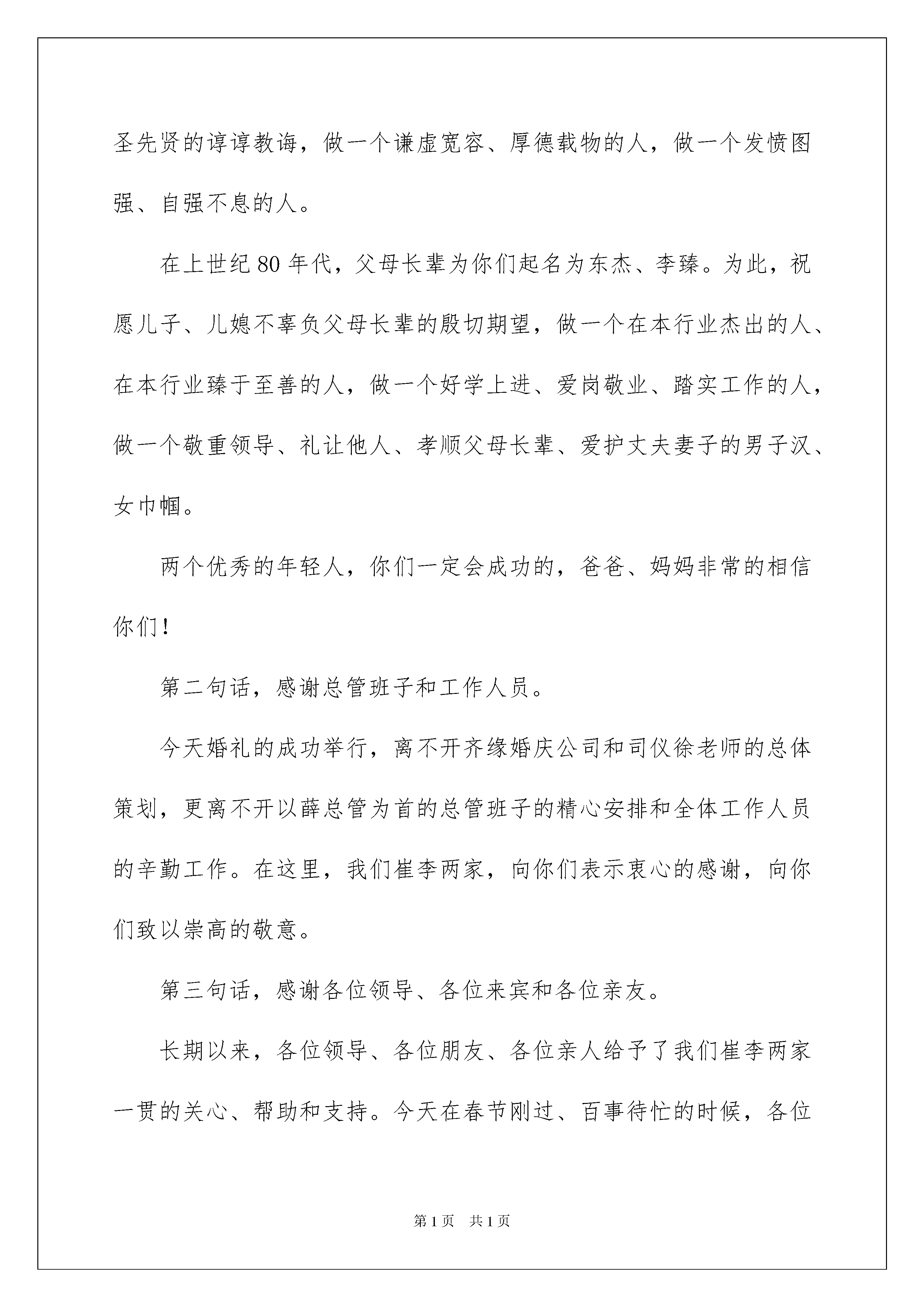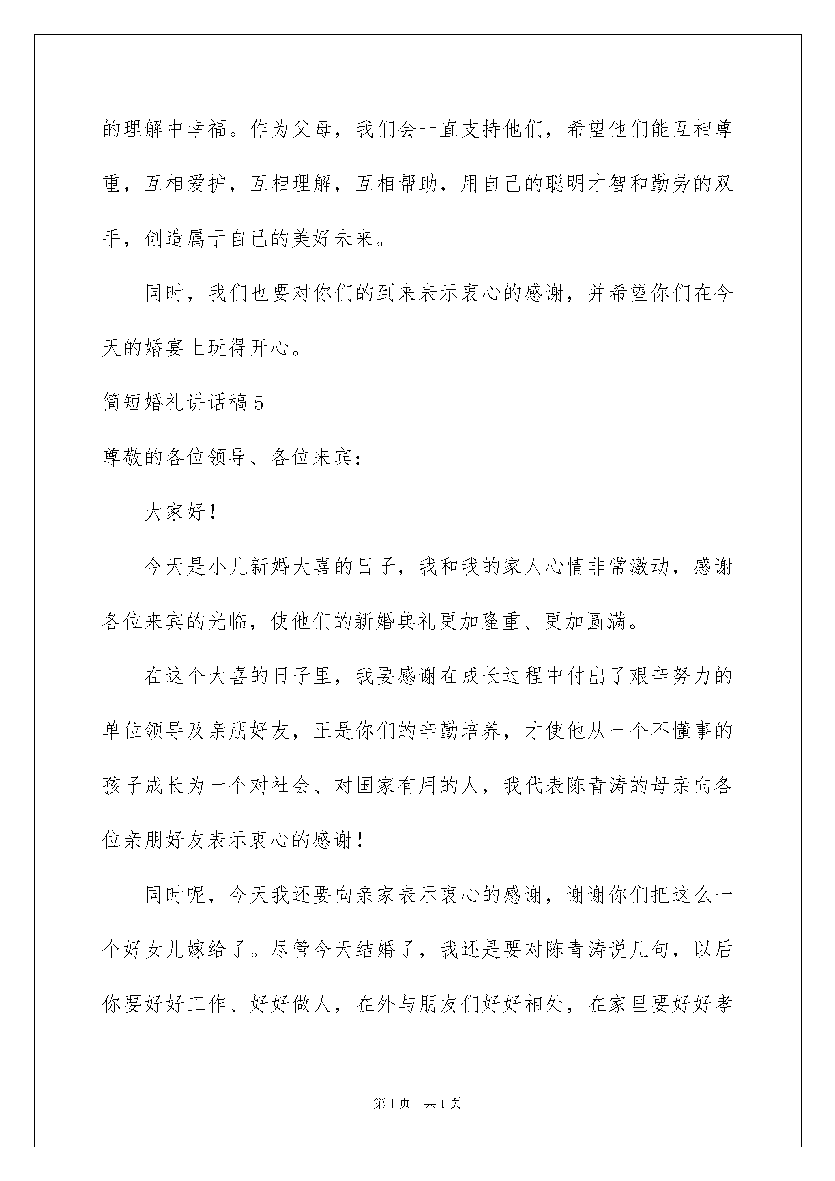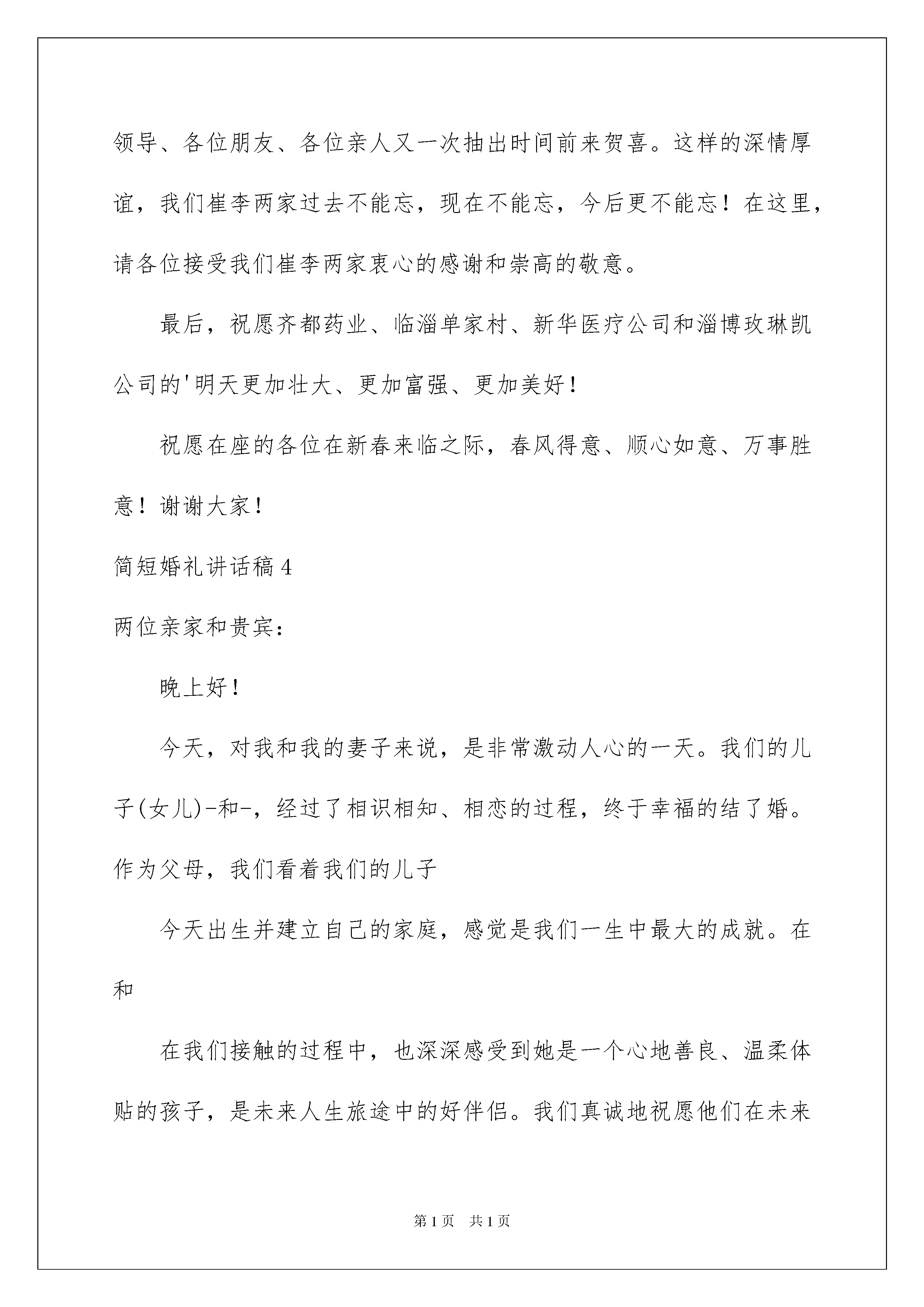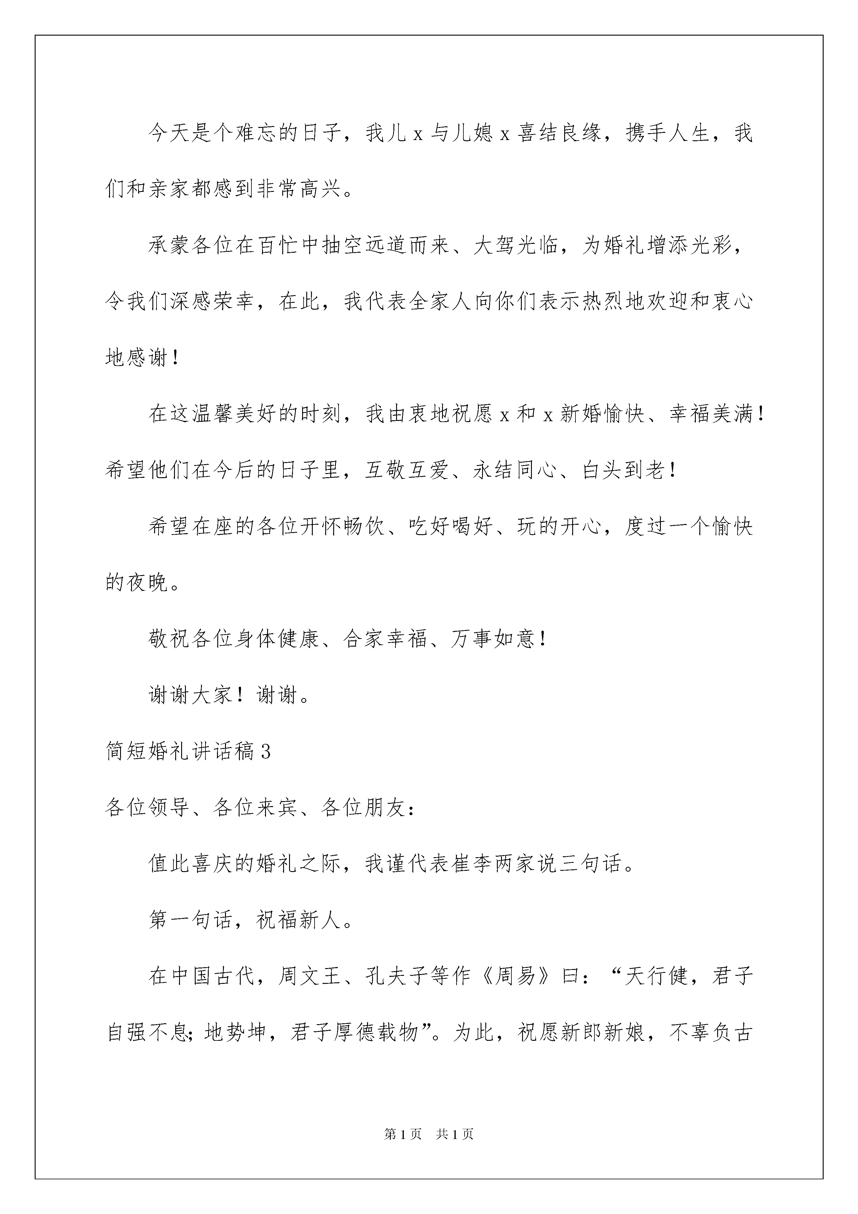 2022简短婚礼讲话稿简短婚礼讲话稿在不断进步的社会中,用到讲话稿的地方越来越多,讲话稿可以起到指引或总结会议,传达贯彻上级精神等作用。为了让您在写讲话稿时更加简单方便,下面是我精心整理的简短婚礼讲话稿,仅供参考,希望能够帮助到大家。简短婚礼讲话稿1各位来宾:今天是我女儿张小梅和刘伟杰先生百年好合的大喜日子。首先,我要向各位来宾的光临致以最诚挚的欢迎。此时此刻,作为家长的我有千言万语要对我的女儿和女婿说:祝愿你们夫妻恩爱到白头,从今往后,不管是贫困,或是富有,你们都要一生一世、一心一意呵护着对方,同时也希望你们能够尊敬父母,孝顺父母,作为好儿子好女儿的同时也要做一名好女婿好儿媳。简短婚礼讲话稿2各位亲朋好友、各位来宾:大家晚上好!今天是个难忘的日子,我儿x与儿媳x喜结良缘,携手人生,我们和亲家都感到非常高兴。承蒙各位在百忙中抽空远道而来、大驾光临,为婚礼增添光彩,令我们深感荣幸,在此,我代表全家人向你们表示热烈地欢迎和衷心地感谢!在这温馨美好的时刻,我由衷地祝愿x和x新婚愉快、幸福美满!希望他们在今后的日子里,互敬互爱、永结同心、白头到老!希望在座的各位开怀畅饮、吃好喝好、玩的开心,度过一个愉快的夜晚。敬祝各位身体健康、合家幸福、万事如意!谢谢大家!谢谢。简短婚礼讲话稿3各位领导、各位来宾、各位朋友:值此喜庆的婚礼之际,我谨代表崔李两家说三句话。第一句话,祝福新人。在中国古代,周文王、孔夫子等作《周易》曰:“天行健,君子自强不息;地势坤,君子厚德载物”。为此,祝愿新郎新娘,不辜负古圣先贤的谆谆教诲,做一个谦虚宽容、厚德载物的人,做一个发愤图强、自强不息的人。在上世纪80年代,父母长辈为你们起名为东杰、李臻。为此,祝愿儿子、儿媳不辜负父母长辈的殷切期望,做一个在本行业杰出的人、在本行业臻于至善的人,做一个好学上进、爱岗敬业、踏实工作的人,做一个敬重领导、礼让他人、孝顺父母长辈、爱护丈夫妻子的男子汉、女巾帼。两个优秀的年轻人,你们一定会成功的,爸爸、妈妈非常的相信你们!第二句话,感谢总管班子和工作人员。今天婚礼的成功举行,离不开齐缘婚庆公司和司仪徐老师的总体策划,更离不开以薛总管为首的总管班子的精心安排和全体工作人员的辛勤工作。在这里,我们崔李两家,向你们表示衷心的感谢,向你们致以崇高的敬意。第三句话,感谢各位领导、各位来宾和各位亲友。长期以来,各位领导、各位朋友、各位亲人给予了我们崔李两家一贯的关心、帮助和支持。今天在春节刚过、百事待忙的时候,各位领导、各位朋友、各位亲人又一次抽出时间前来贺喜。这样的深情厚谊,我们崔李两家过去不能忘,现在不能忘,今后更不能忘!在这里,请各位接受我们崔李两家衷心的感谢和崇高的敬意。最后,祝愿齐都药业、临淄单家村、新华医疗公司和淄博玫琳凯公司的'明天更加壮大、更加富强、更加美好!祝愿在座的各位在新春来临之际,春风得意、顺心如意、万事胜意!谢谢大家!简短婚礼讲话稿4两位亲家和贵宾:晚上好!今天,对我和我的妻子来说,是非常激动人心的一天。我们的儿子(女儿)-和-,经过了相识相知、相恋的过程,终于幸福的结了婚。作为父母,我们看着我们的儿子今天出生并建立自己的家庭,感觉是我们一生中最大的成就。在和在我们接触的过程中,也深深感受到她是一个心地善良、温柔体贴的孩子,是未来人生旅途中的好伴侣。我们真诚地祝愿他们在未来的理解中幸福。作为父母,我们会一直支持他们,希望他们能互相尊重,互相爱护,互相理解,互相帮助,用自己的聪明才智和勤劳的双手,创造属于自己的美好未来。同时,我们也要对你们的到来表示衷心的感谢,并希望你们在今天的婚宴上玩得开心。简短婚礼讲话稿5尊敬的各位领导、各位来宾:大家好!今天是小儿新婚大喜的日子,我和我的家人心情非常激动,感谢各位来宾的光临,使他们的新婚典礼更加隆重、更加圆满。在这个大喜的日子里,我要感谢在成长过程中付出了艰辛努力的单位领导及亲朋好友,正是你们的辛勤培养,才使他从一个不懂事的孩子成长为一个对社会、对国家有用的人,我代表陈青涛的母亲向各位亲朋好友表示衷心的感谢!同时呢,今天我还要向亲家表示衷心的感谢,谢谢你们把这么一个好女儿嫁给了。尽管今天结婚了,我还是要对陈青涛说几句,以后你要好好工作、好好做人,在外与朋友们好好相处,在家里要好好孝敬双方老人,对周玉慧要好好对待,一定要尽到一个做丈夫的责任,维护好自己的小家庭。最后,让我再次感谢各位来宾的光临,请大家吃好、喝好、玩得开心,谢谢!简短婚礼讲话稿6各位来宾、各位战友、所有的亲朋好友们:大家中午好!今天是我儿子康x、儿媳陈xx百年好合、永结同心的大喜日子。承蒙大家的厚爱,在百忙之中光临