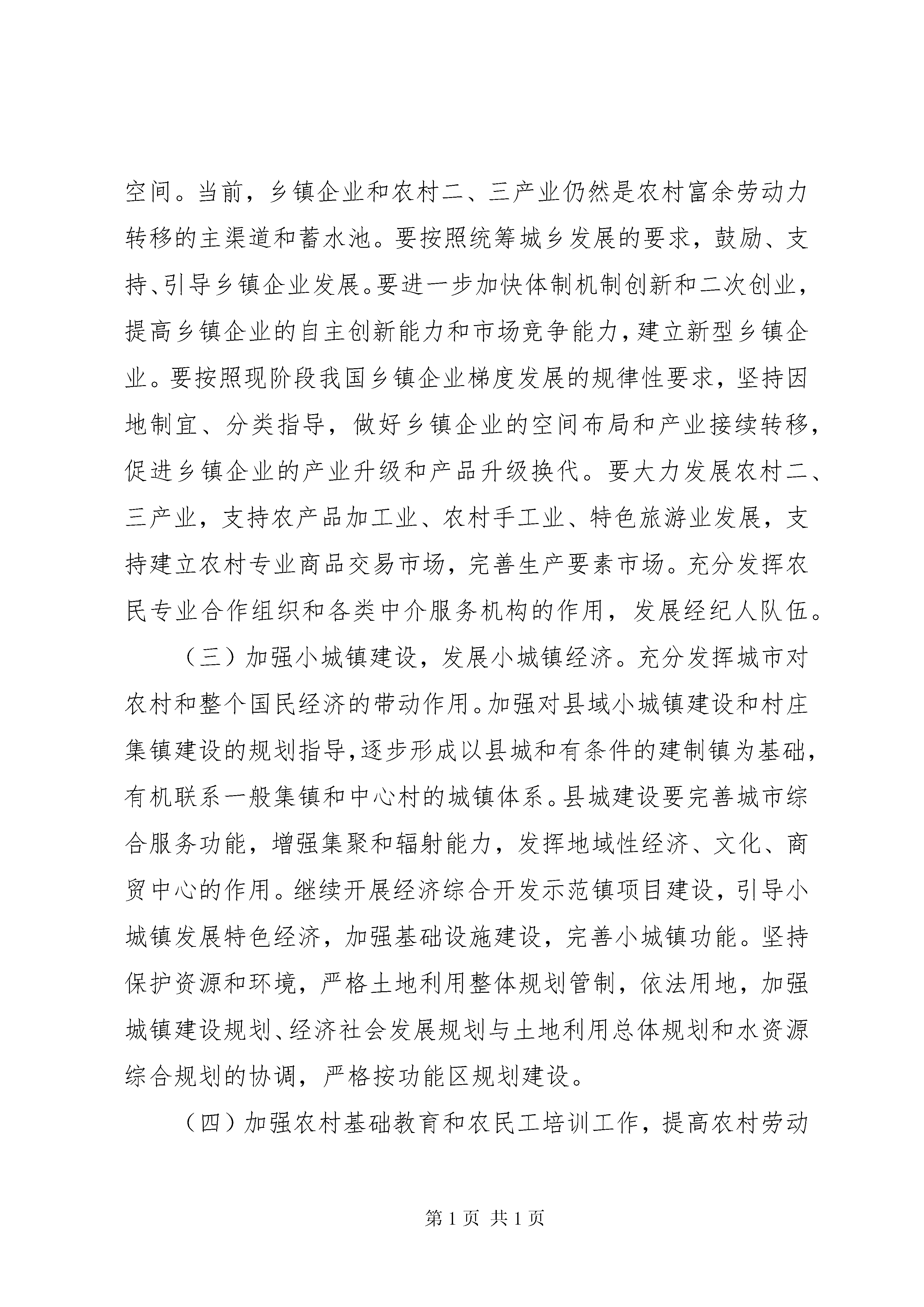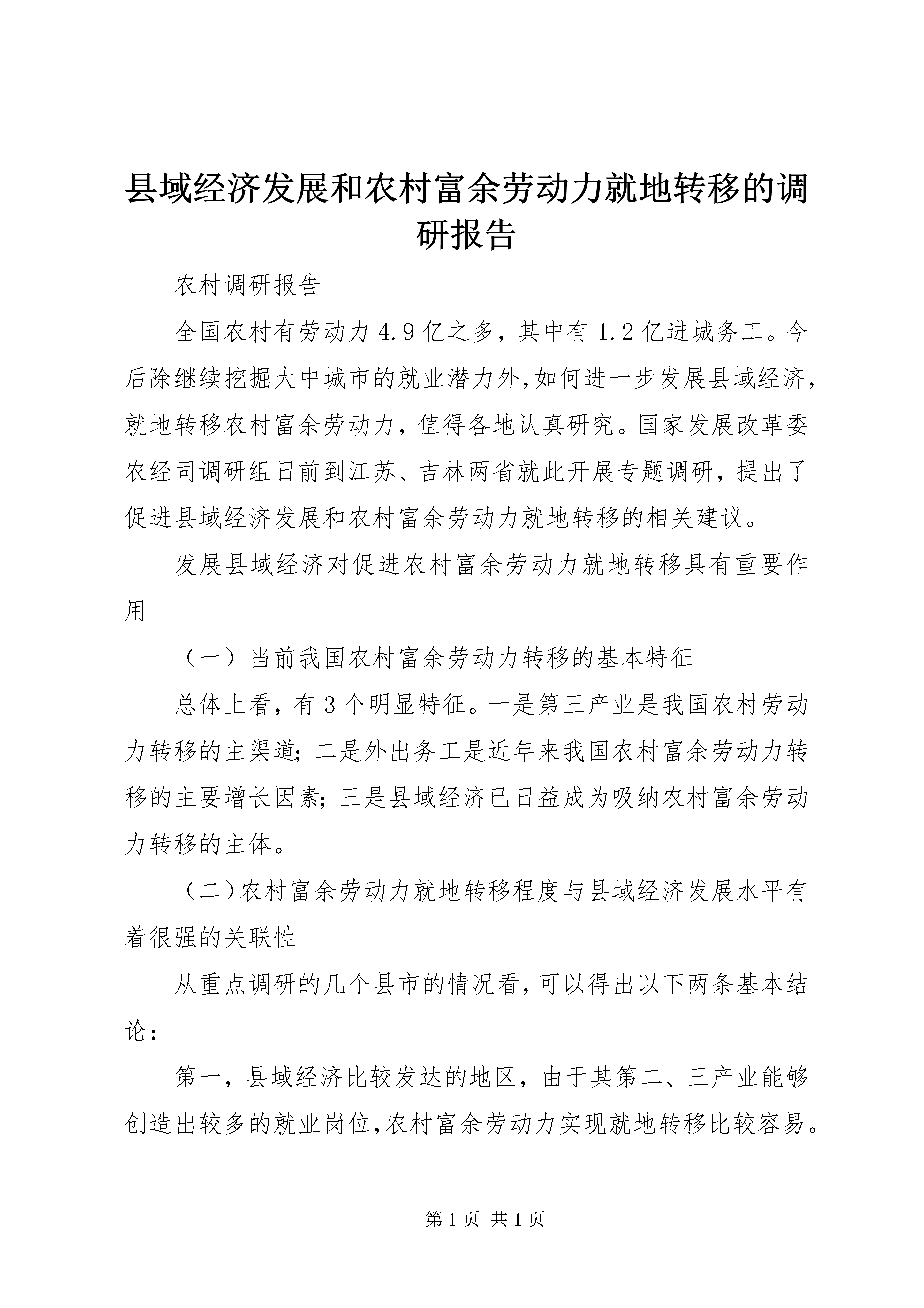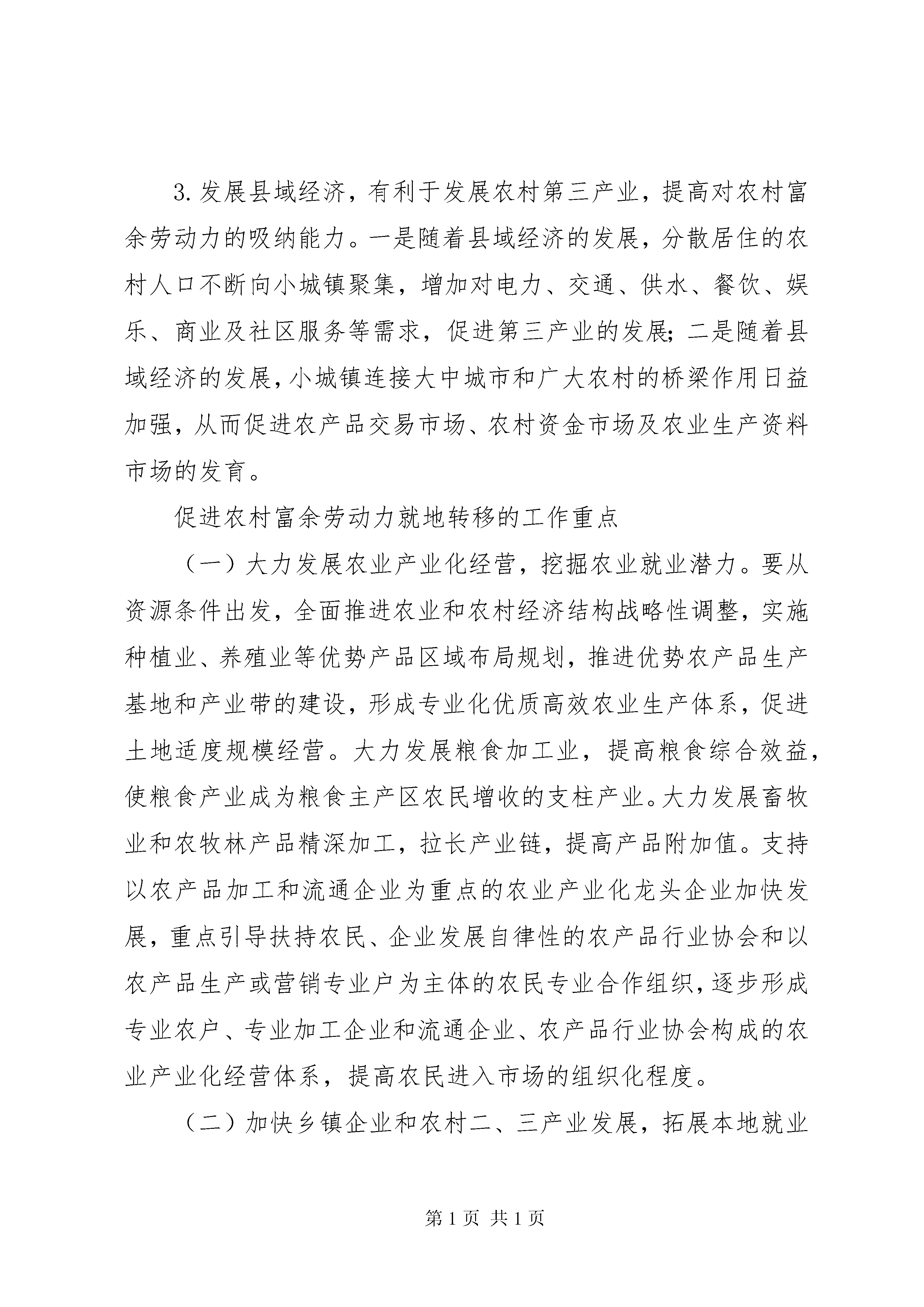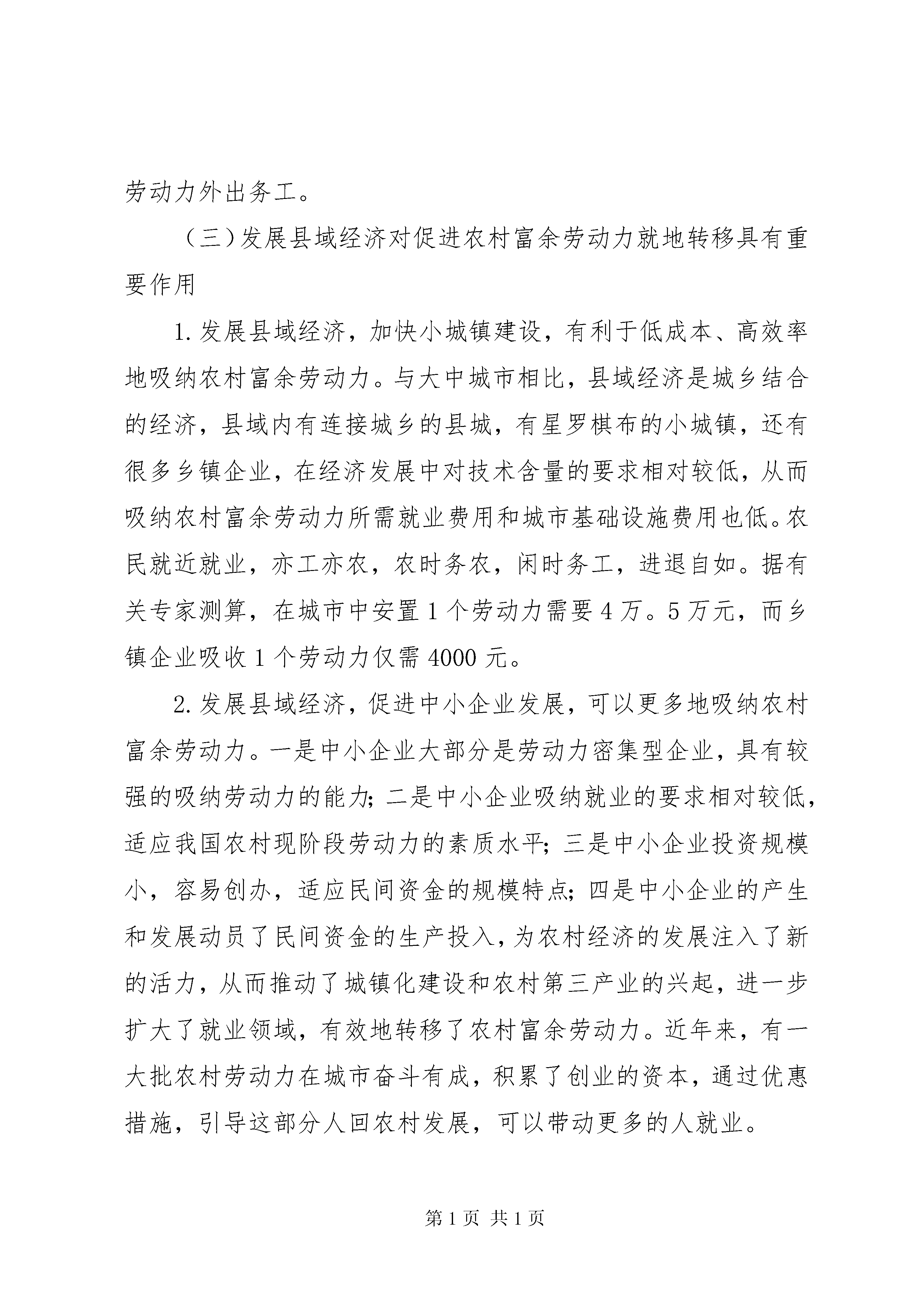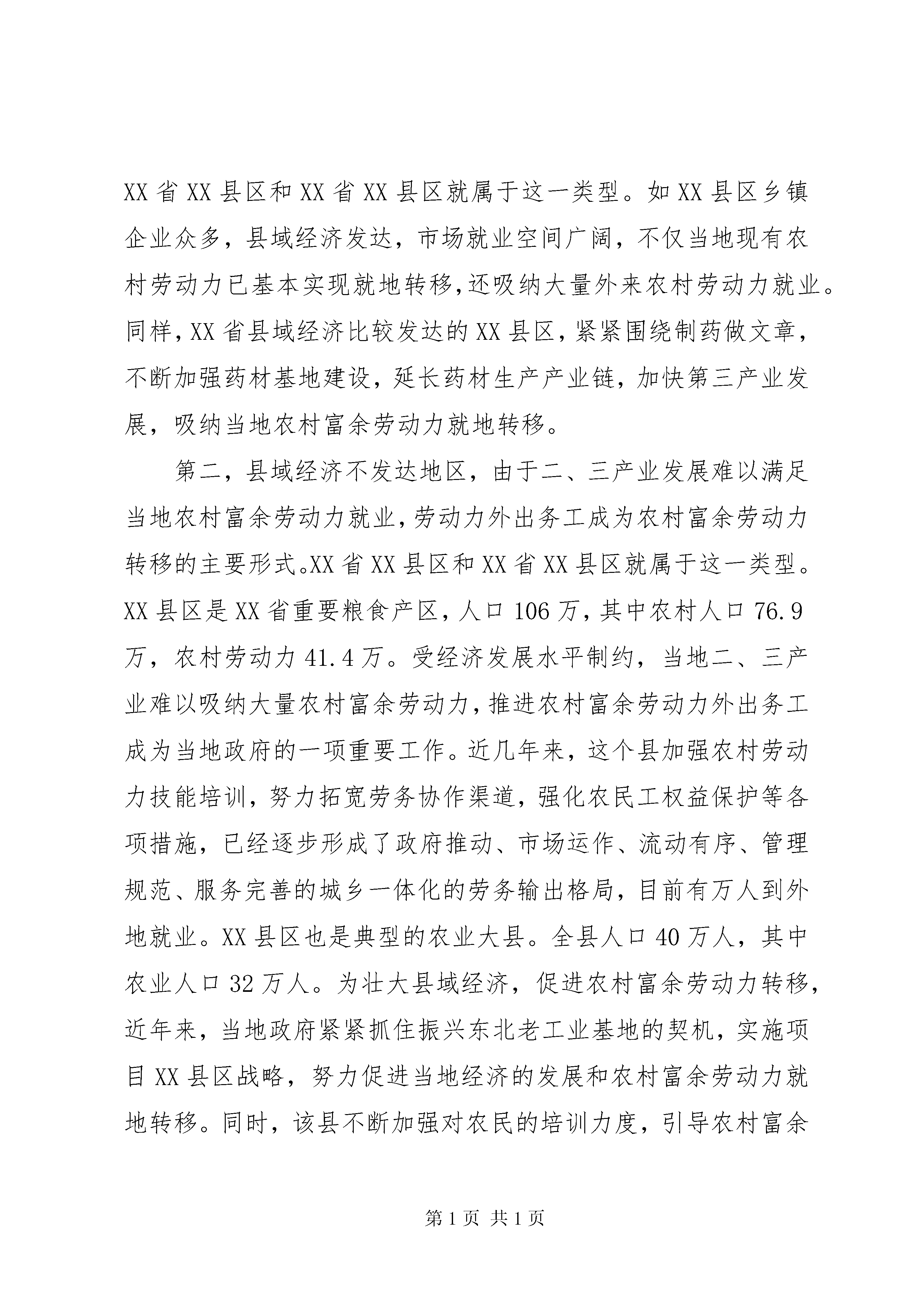 县域经济发展和农村富余劳动力就地转移的调研报告农村调研报告全国农村有劳动力4.9亿之多,其中有1.2亿进城务工。今后除继续挖掘大中城市的就业潜力外,如何进一步发展县域经济,就地转移农村富余劳动力,值得各地认真研究。国家发展改革委农经司调研组日前到江苏、吉林两省就此开展专题调研,提出了促进县域经济发展和农村富余劳动力就地转移的相关建议。发展县域经济对促进农村富余劳动力就地转移具有重要作用(一)当前我国农村富余劳动力转移的基本特征总体上看,有3个明显特征。一是第三产业是我国农村劳动力转移的主渠道;二是外出务工是近年来我国农村富余劳动力转移的主要增长因素;三是县域经济已日益成为吸纳农村富余劳动力转移的主体。(二)农村富余劳动力就地转移程度与县域经济发展水平有着很强的关联性从重点调研的几个县市的情况看,可以得出以下两条基本结论:第一,县域经济比较发达的地区,由于其第二、三产业能够创造出较多的就业岗位,农村富余劳动力实现就地转移比较容易。XX省XX县区和XX省XX县区就属于这一类型。如XX县区乡镇企业众多,县域经济发达,市场就业空间广阔,不仅当地现有农村劳动力已基本实现就地转移,还吸纳大量外来农村劳动力就业。同样,XX省县域经济比较发达的XX县区,紧紧围绕制药做文章,不断加强药材基地建设,延长药材生产产业链,加快第三产业发展,吸纳当地农村富余劳动力就地转移。第二,县域经济不发达地区,由于二、三产业发展难以满足当地农村富余劳动力就业,劳动力外出务工成为农村富余劳动力转移的主要形式。XX省XX县区和XX省XX县区就属于这一类型。XX县区是XX省重要粮食产区,人口106万,其中农村人口76.9万,农村劳动力41.4万。受经济发展水平制约,当地二、三产业难以吸纳大量农村富余劳动力,推进农村富余劳动力外出务工成为当地政府的一项重要工作。近几年来,这个县加强农村劳动力技能培训,努力拓宽劳务协作渠道,强化农民工权益保护等各项措施,已经逐步形成了政府推动、市场运作、流动有序、管理规范、服务完善的城乡一体化的劳务输出格局,目前有万人到外地就业。XX县区也是典型的农业大县。全县人口40万人,其中农业人口32万人。为壮大县域经济,促进农村富余劳动力转移,近年来,当地政府紧紧抓住振兴东北老工业基地的契机,实施项目XX县区战略,努力促进当地经济的发展和农村富余劳动力就地转移。同时,该县不断加强对农民的培训力度,引导农村富余劳动力外出务工。(三)发展县域经济对促进农村富余劳动力就地转移具有重要作用1.发展县域经济,加快小城镇建设,有利于低成本、高效率地吸纳农村富余劳动力。与大中城市相比,县域经济是城乡结合的经济,县域内有连接城乡的县城,有星罗棋布的小城镇,还有很多乡镇企业,在经济发展中对技术含量的要求相对较低,从而吸纳农村富余劳动力所需就业费用和城市基础设施费用也低。农民就近就业,亦工亦农,农时务农,闲时务工,进退自如。据有关专家测算,在城市中安置1个劳动力需要4万。5万元,而乡镇企业吸收1个劳动力仅需4000元。2.发展县域经济,促进中小企业发展,可以更多地吸纳农村富余劳动力。一是中小企业大部分是劳动力密集型企业,具有较强的吸纳劳动力的能力;二是中小企业吸纳就业的要求相对较低,适应我国农村现阶段劳动力的素质水平;三是中小企业投资规模小,容易创办,适应民间资金的规模特点;四是中小企业的产生和发展动员了民间资金的生产投入,为农村经济的发展注入了新的活力,从而推动了城镇化建设和农村第三产业的兴起,进一步扩大了就业领域,有效地转移了农村富余劳动力。近年来,有一大批农村劳动力在城市奋斗有成,积累了创业的资本,通过优惠措施,引导这部分人回农村发展,可以带动更多的人就业。3.发展县域经济,有利于发展农村第三产业,提高对农村富余劳动力的吸纳能力。一是随着县域经济的发展,分散居住的农村人口不断向小城镇聚集,增加对电力、交通、供水、餐饮、娱乐、商业及社区服务等需求,促进第三产业的发展;二是随着县域经济的发展,小城镇连接大中城市和广大农村的桥梁作用日益加强,从而促进农产品交易市场、农村资金市场及农业生产资料市场的发育。促进农村富余劳动力就地转移的工作重点(一)大力发展农业产业化经营,挖掘农业就业潜力。要从资源条件出发,全面推进农业和农村经济结构战略性调整,实施种植业、养殖业等优势产品区域布局规划,推进优势农产品生产基地和产业带的建设,形成专业化优质高效农业生产体系,促进土地适度规模经营。大力发展粮食加工业,提高粮食综合效益,使粮食产业成为粮食主产区农民增收的支柱产业。大力发展畜牧业和农牧林产品精深加工,拉长产业链,提高产品附加值。支持以农产品加工和流通企业为重点的农业产业化龙头企业加快发展,重点引导扶持农民、企业发展自律性的农产品行业协会和以农产品生产或营销