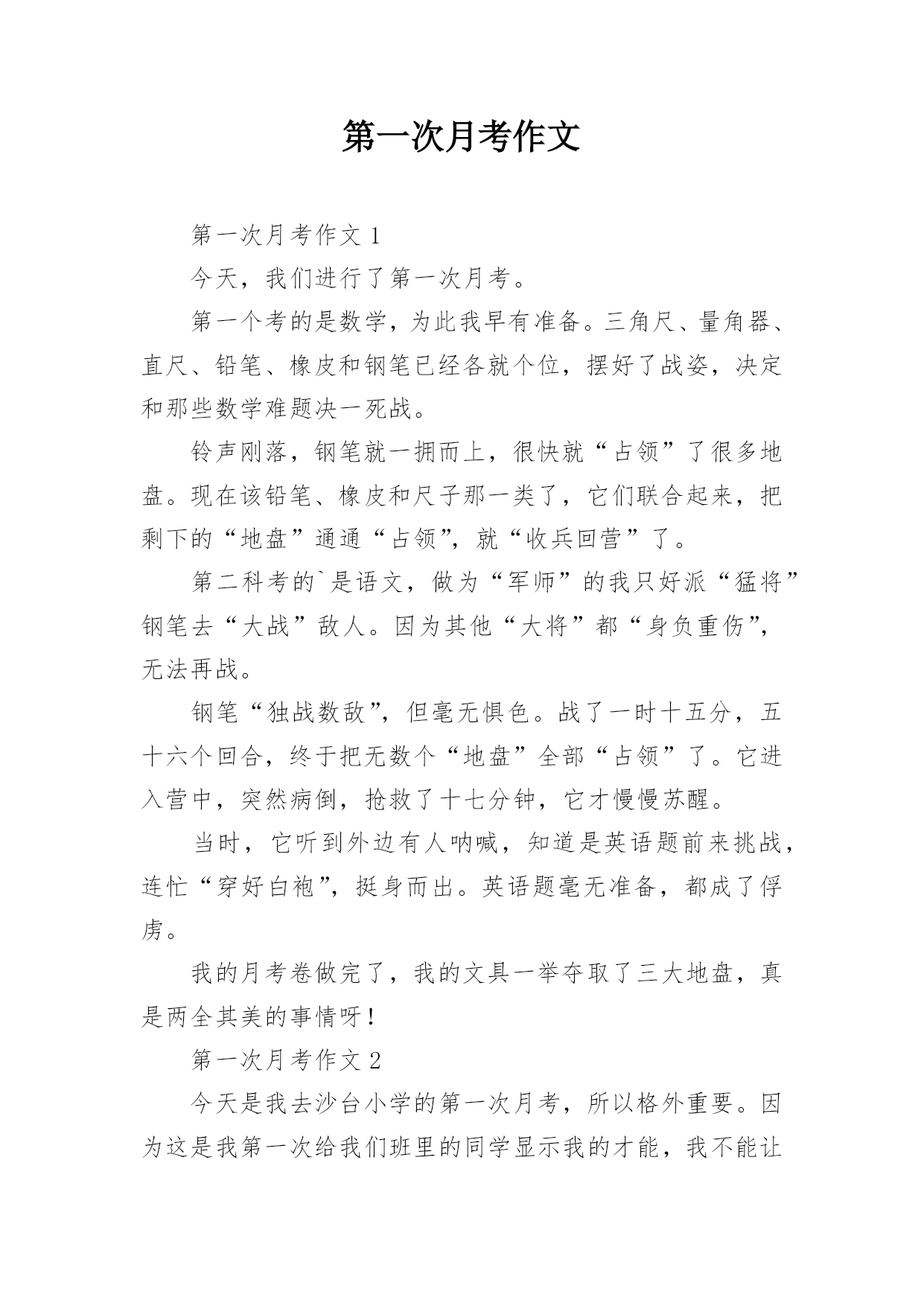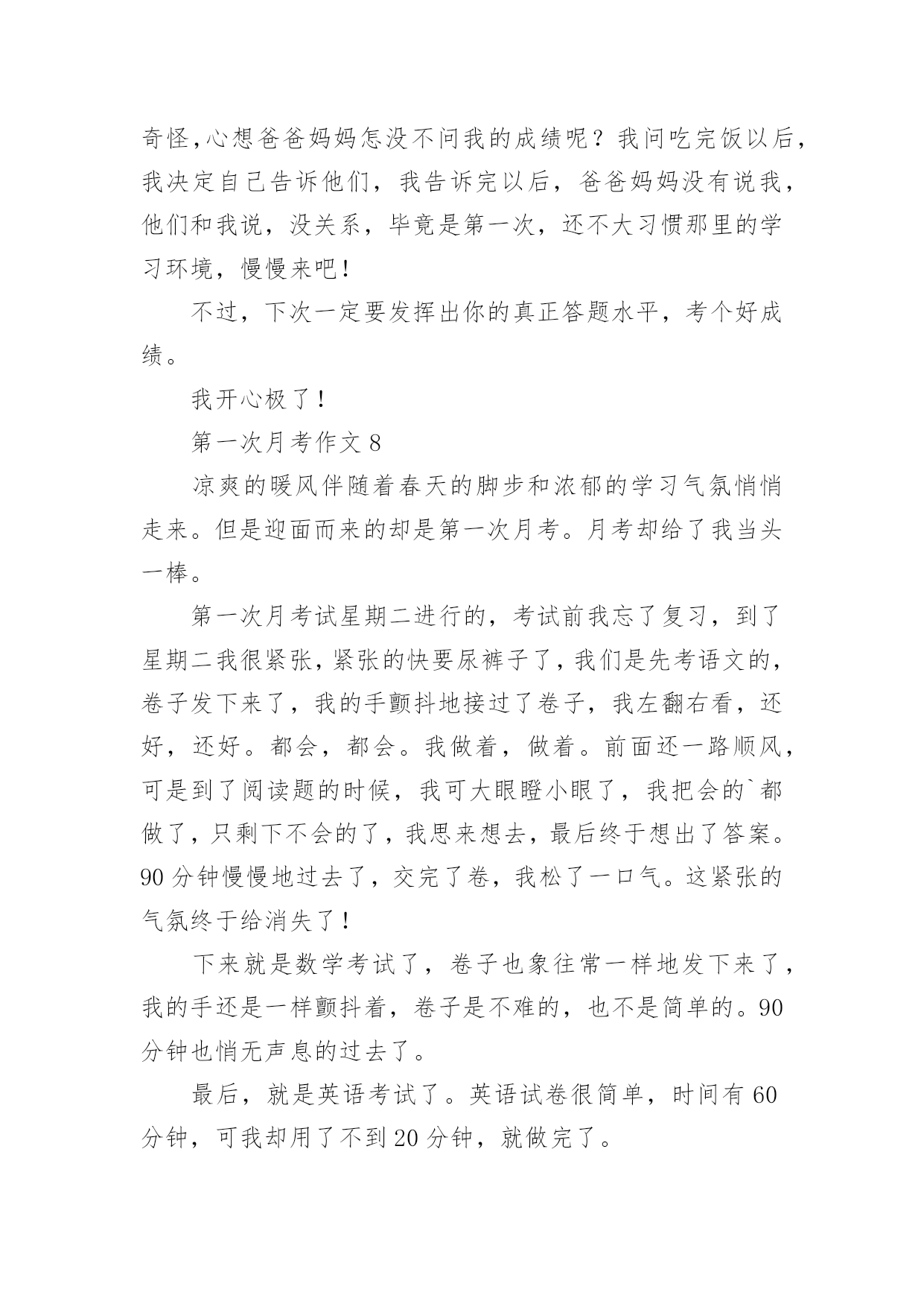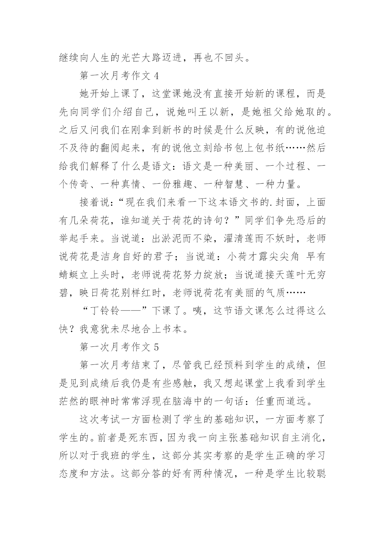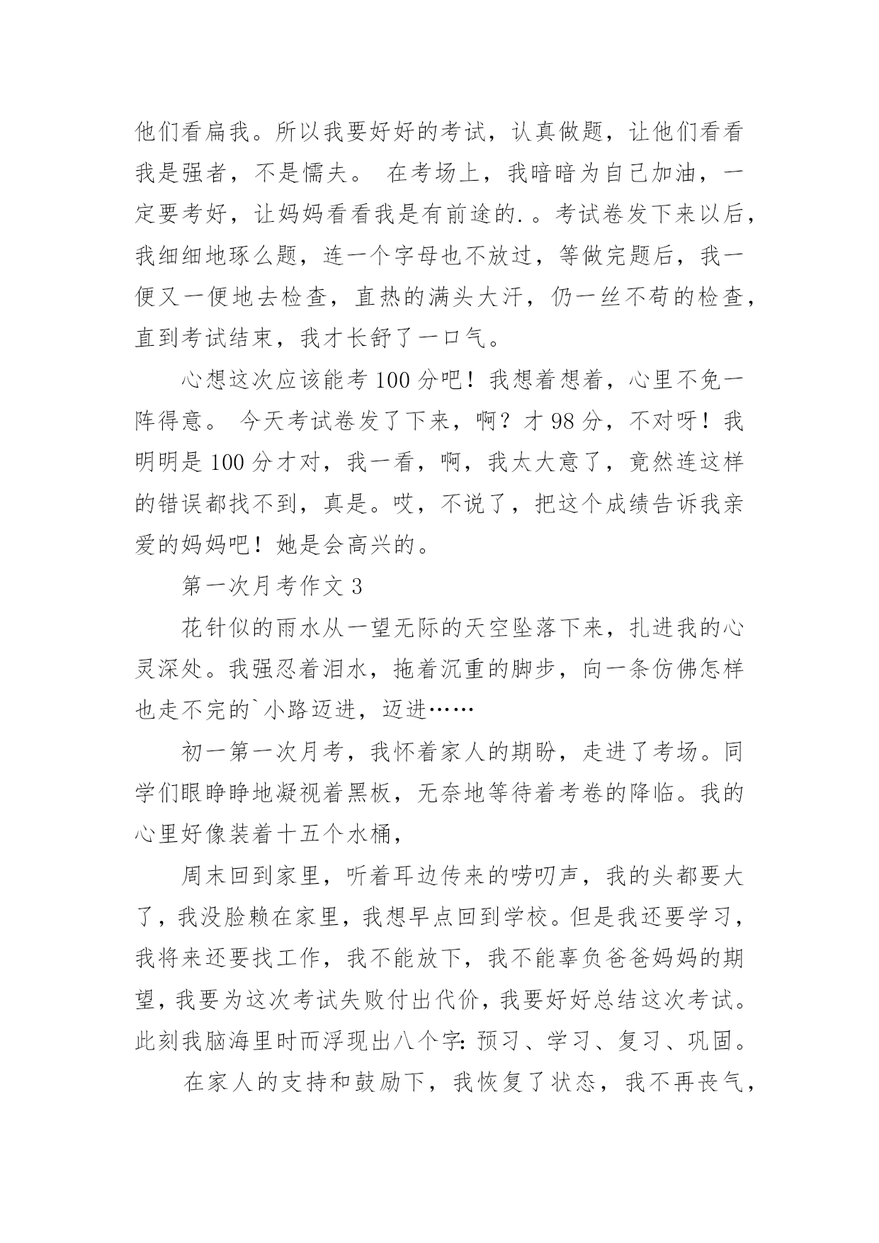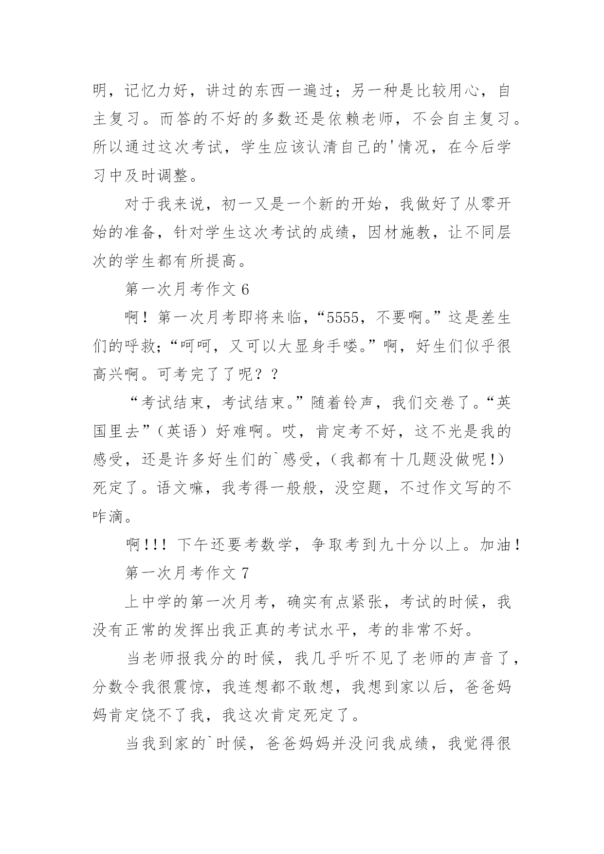 第一次月考作文 第一次月考作文1今天,我们进行了第一次月考。第一个考的是数学,为此我早有准备。三角尺、量角器、直尺、铅笔、橡皮和钢笔已经各就个位,摆好了战姿,决定和那些数学难题决一死战。铃声刚落,钢笔就一拥而上,很快就“占领”了很多地盘。现在该铅笔、橡皮和尺子那一类了,它们联合起来,把剩下的“地盘”通通“占领”,就“收兵回营”了。第二科考的`是语文,做为“军师”的我只好派“猛将”钢笔去“大战”敌人。因为其他“大将”都“身负重伤”,无法再战。钢笔“独战数敌”,但毫无惧色。战了一时十五分,五十六个回合,终于把无数个“地盘”全部“占领”了。它进入营中,突然病倒,抢救了十七分钟,它才慢慢苏醒。当时,它听到外边有人呐喊,知道是英语题前来挑战,连忙“穿好白袍”,挺身而出。英语题毫无准备,都成了俘虏。我的月考卷做完了,我的文具一举夺取了三大地盘,真是两全其美的事情呀!第一次月考作文2今天是我去沙台小学的第一次月考,所以格外重要。因为这是我第一次给我们班里的同学显示我的才能,我不能让他们看扁我。所以我要好好的考试,认真做题,让他们看看我是强者,不是懦夫。在考场上,我暗暗为自己加油,一定要考好,让妈妈看看我是有前途的.。考试卷发下来以后,我细细地琢么题,连一个字母也不放过,等做完题后,我一便又一便地去检查,直热的满头大汗,仍一丝不苟的检查,直到考试结束,我才长舒了一口气。心想这次应该能考100分吧!我想着想着,心里不免一阵得意。今天考试卷发了下来,啊?才98分,不对呀!我明明是100分才对,我一看,啊,我太大意了,竟然连这样的错误都找不到,真是。哎,不说了,把这个成绩告诉我亲爱的妈妈吧!她是会高兴的。第一次月考作文3花针似的雨水从一望无际的天空坠落下来,扎进我的心灵深处。我强忍着泪水,拖着沉重的脚步,向一条仿佛怎样也走不完的`小路迈进,迈进……初一第一次月考,我怀着家人的期盼,走进了考场。同学们眼睁睁地凝视着黑板,无奈地等待着考卷的降临。我的心里好像装着十五个水桶,周末回到家里,听着耳边传来的唠叨声,我的头都要大了,我没脸赖在家里,我想早点回到学校。但是我还要学习,我将来还要找工作,我不能放下,我不能辜负爸爸妈妈的期望,我要为这次考试失败付出代价,我要好好总结这次考试。此刻我脑海里时而浮现出八个字:预习、学习、复习、巩固。在家人的支持和鼓励下,我恢复了状态,我不再丧气,继续向人生的光芒大路迈进,再也不回头。第一次月考作文4她开始上课了,这堂课她没有直接开始新的课程,而是先向同学们介绍自己,说她叫王以新,是她祖父给她取的。之后又问我们在刚拿到新书的时候是什么反映,有的说他迫不及待的翻阅起来,有的说他立刻给书包上包书纸……然后给我们解释了什么是语文:语文是一种美丽、一个过程、一个传奇、一种真情、一份雅趣、一种智慧、一种力量。接着说:“现在我们来看一下这本语文书的.封面,上面有几朵荷花,谁知道关于荷花的诗句?”同学们争先恐后的举起手来。当说道:出淤泥而不染,濯清莲而不妖时,老师说荷花是洁身自好的君子;当说道:小荷才露尖尖角早有蜻蜓立上头时,老师说荷花努力绽放;当说道接天莲叶无穷碧,映日荷花别样红时,老师说荷花有美丽的气质……“丁铃铃——”下课了。咦,这节语文课怎么过得这么快?我意犹未尽地合上书本。第一次月考作文5第一次月考结束了,尽管我已经预料到学生的成绩,但是见到成绩后我仍是有些感触,我又想起课堂上我看到学生茫然的眼神时常常浮现在脑海中的一句话:任重而道远。这次考试一方面检测了学生的基础知识,一方面考察了学生的。前者是死东西,因为我一向主张基础知识自主消化,所以对于我班的学生,这部分其实考察的是学生正确的学习态度和方法。这部分答的好有两种情况,一种是学生比较聪明,记忆力好,讲过的东西一遍过;另一种是比较用心,自主复习。而答的不好的多数还是依赖老师,不会自主复习。所以通过这次考试,学生应该认清自己的'情况,在今后学习中及时调整。对于我来说,初一又是一个新的开始,我做好了从零开始的准备,针对学生这次考试的成绩,因材施教,让不同层次的学生都有所提高。第一次月考作文6啊!第一次月考即将来临,“5555,不要啊。”这是差生们的呼救;“呵呵,又可以大显身手喽。”啊,好生们似乎很高兴啊。可考完了了呢??“考试结束,考试结束。”随着铃声,我们交卷了。“英国里去”(英语)好难啊。哎,肯定考不好,这不光是我的感受,还是许多好生们的`感受,(我都有十几题没做呢!)死定了。语文嘛,我考得一般般,没空题,不过作文写的不咋滴。啊!!!下午还要考数学,争取考到九十分以上。加油!第一次月考作文7上中学的第一次月考,确实有点紧张,考试的时候,我没有正常的发挥出我正真的考试水平,考的非常不好。当老师报我分的时候,我几乎听不见了老师的声音了,分数令我很震惊,我连想都不敢想,我想到家以