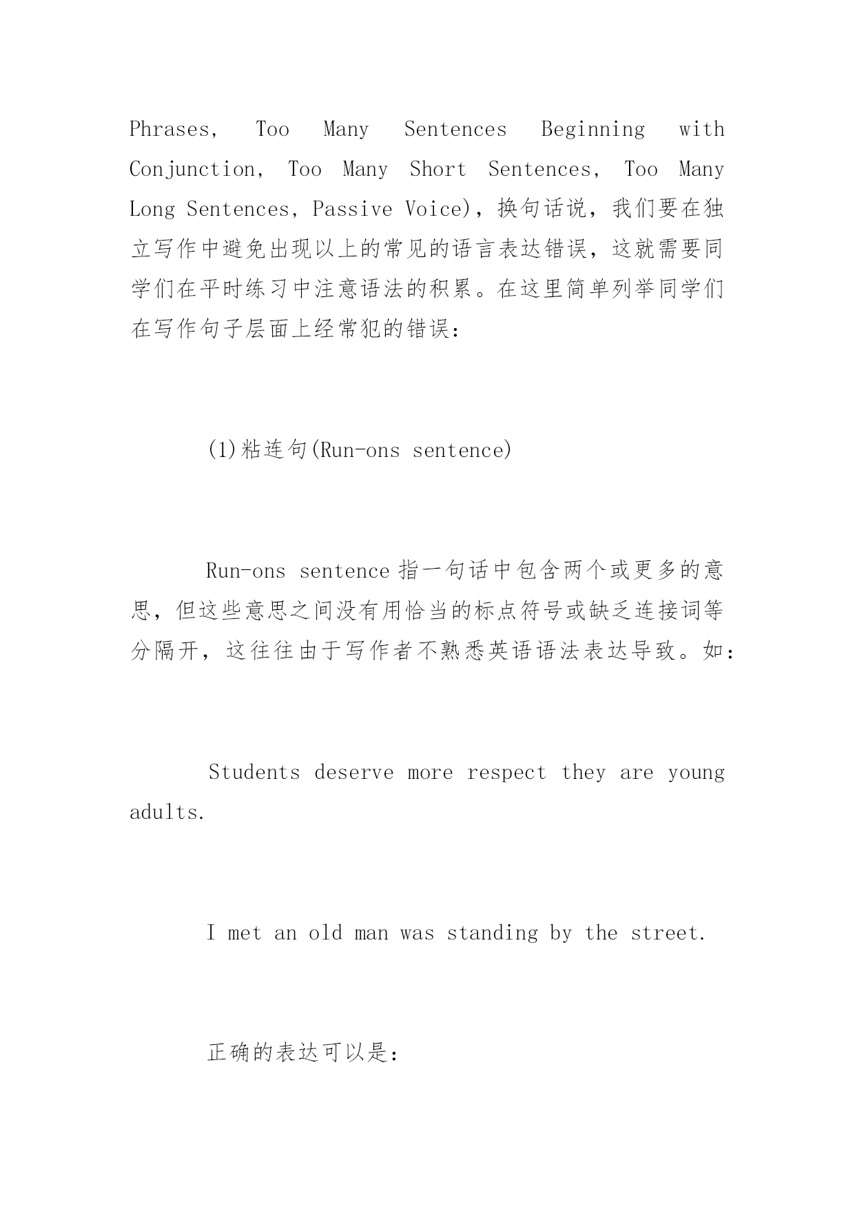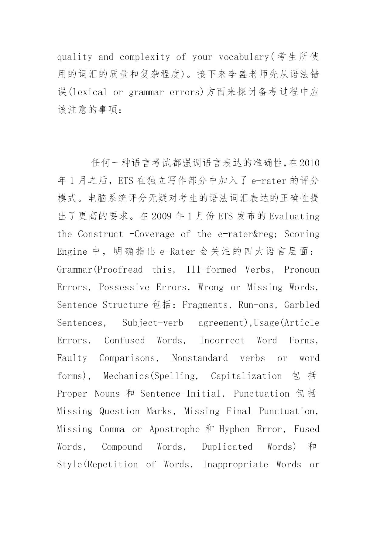 托福写作高分秘诀揭秘 2017托福写作高分秘诀揭秘 托福写作一直是众多考生的担忧,有什么方法可以迅速提高托福写作水平,下面百分网小编为同学们整理汇总了托福写作高分秘诀揭秘,更多精彩内容请关注yjbys考试网。 在TOEFLiBTOfficialGuide(托福官方指南,以下简称OG)中明确指出托福独立写作有三大考查维度:Development(展开论点),Organization(组织文章结构)和LanguageUse(语言运用)。因此,除了注意作文的内容和结构外,阅卷老师同样十分注重我们在作文中表现出来的语言基本功。 托福独立写作部分对于我们写作的总体要求是consistentfacilityintheuseoflanguage(语言运用的和谐流畅),给我们的具体建议是avarietyofsentencestructures(句子结构多样)和wordchoiceshouldbeappropriate(措辞贴切得体),评分者的审查角度是lexicalorgrammarerrors(词汇和语法错误)以及thecomplexityofsentencestructures(句子结构的复杂程度)和thequalityandcomplexityofyourvocabulary(考生所使用的词汇的质量和复杂程度)。接下来李盛老师先从语法错误(lexicalorgrammarerrors)方面来探讨备考过程中应该注意的事项: 任何一种语言考试都强调语言表达的准确性,在2010年1月之后,ETS在独立写作部分中加入了e-rater的评分模式。电脑系统评分无疑对考生的语法词汇表达的正确性提出了更高的要求。在2009年1月份ETS发布的EvaluatingtheConstruct-Coverageofthee-rater®ScoringEngine中,明确指出e-Rater会关注的四大语言层面:Grammar(Proofreadthis,Ill-formedVerbs,PronounErrors,PossessiveErrors,WrongorMissingWords,SentenceStructure包括:Fragments,Run-ons,GarbledSentences,Subject-verbagreement),Usage(ArticleErrors,ConfusedWords,IncorrectWordForms,FaultyComparisons,Nonstandardverbsorwordforms),Mechanics(Spelling,Capitalization包括ProperNouns和Sentence-Initial,Punctuation包括MissingQuestionMarks,MissingFinalPunctuation,MissingCommaorApostrophe和HyphenError,FusedWords,CompoundWords,DuplicatedWords)和Style(RepetitionofWords,InappropriateWordsorPhrases,TooManySentencesBeginningwithConjunction,TooManyShortSentences,TooManyLongSentences,PassiveVoice),换句话说,我们要在独立写作中避免出现以上的常见的语言表达错误,这就需要同学们在平时练习中注意语法的积累。在这里简单列举同学们在写作句子层面上经常犯的错误: (1)粘连句(Run-onssentence) Run-onssentence指一句话中包含两个或更多的意思,但这些意思之间没有用恰当的标点符号或缺乏连接词等分隔开,这往往由于写作者不熟悉英语语法表达导致。如: Studentsdeservemorerespecttheyareyoungadults. Imetanoldmanwasstandingbythestreet. 正确的表达可以是: Studentsdeservemorerespectwhen/althoughtheyareyoungadults. Imetanoldmanwhowasstandingbythestreet. (2)逗号连接句(Commasplice) Commasplice指用逗号连接两个分句。在英语中,逗号只能表示语气上的短暂停顿,不能表示两个分句间的逻辑关系,如果一句话中有几个分句,就常常使用连接词。如: Weareoutofmoney,wedecidenottoeatoutontheweekend. 正确的表达可以是: Weareoutofmoney,sowedecidenottoeatoutont