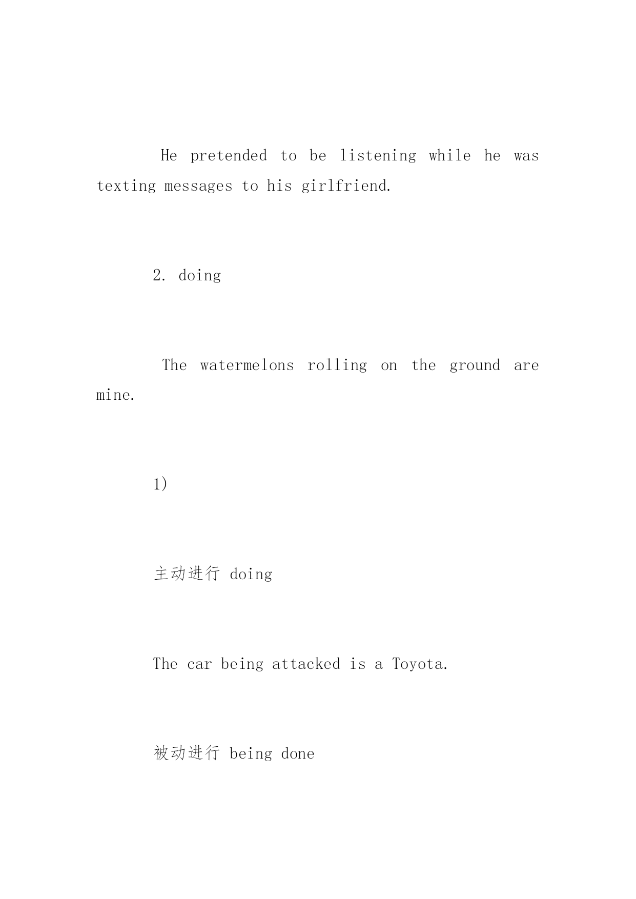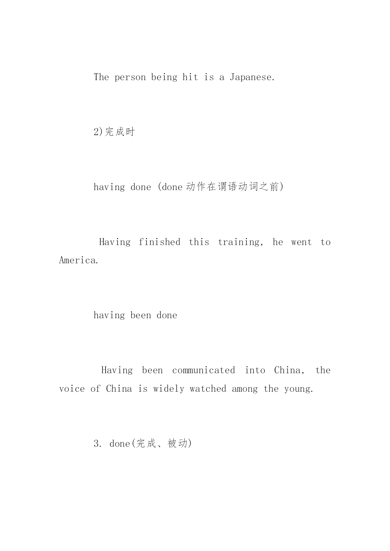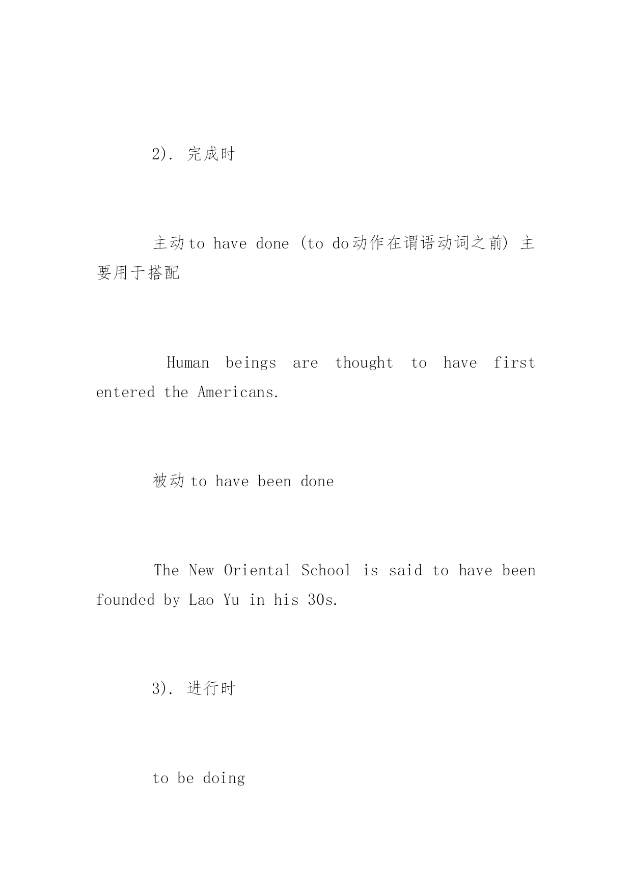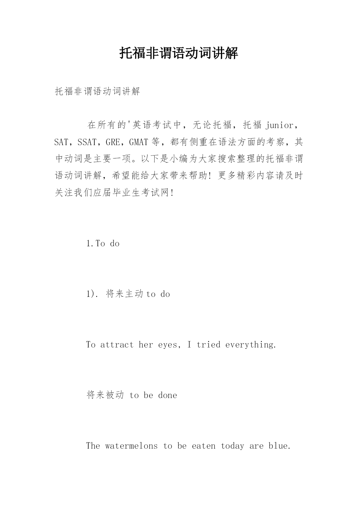 托福非谓语动词讲解 托福非谓语动词讲解 在所有的'英语考试中,无论托福,托福junior,SAT,SSAT,GRE,GMAT等,都有侧重在语法方面的考察,其中动词是主要一项。以下是小编为大家搜索整理的托福非谓语动词讲解,希望能给大家带来帮助!更多精彩内容请及时关注我们应届毕业生考试网! 1.Todo 1).将来主动todo Toattracthereyes,Itriedeverything. 将来被动tobedone Thewatermelonstobeeatentodayareblue. 2).完成时 主动tohavedone(todo动作在谓语动词之前)主要用于搭配 HumanbeingsarethoughttohavefirstenteredtheAmericans. 被动tohavebeendone TheNewOrientalSchoolissaidtohavebeenfoundedbyLaoYuinhis30s. 3).进行时 tobedoing Hepretendedtobelisteningwhilehewastextingmessagestohisgirlfriend. 2.doing Thewatermelonsrollingonthegroundaremine. 1) 主动进行doing ThecarbeingattackedisaToyota. 被动进行beingdone ThepersonbeinghitisaJapanese. 2)完成时 havingdone(done动作在谓语动词之前) Havingfinishedthistraining,hewenttoAmerica. havingbeendone HavingbeencommunicatedintoChina,thevoiceofChinaiswidelywatchedamongtheyoung. 3.done(完成、被动) Thewatermelonssoldinthemarketareexpensive.