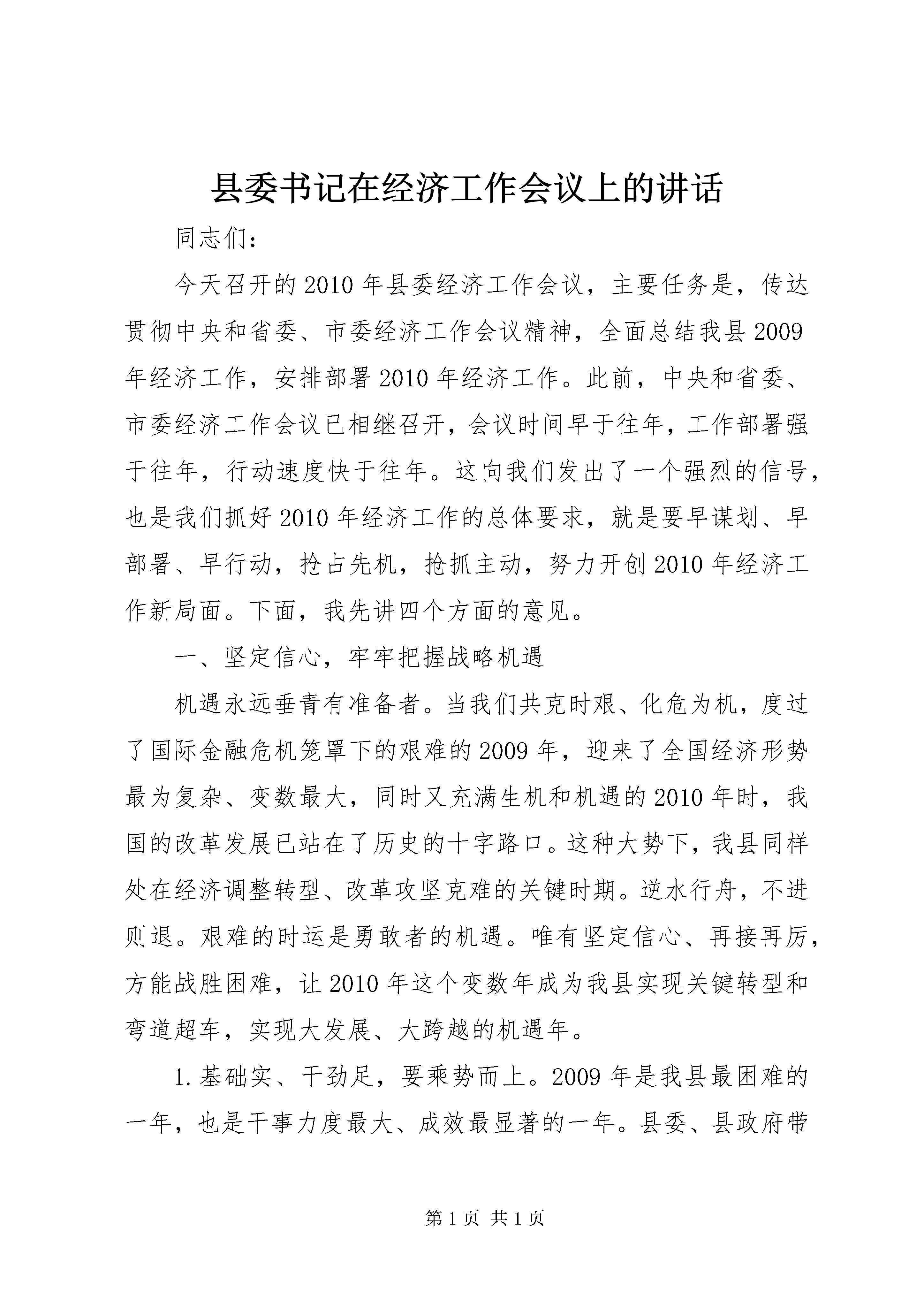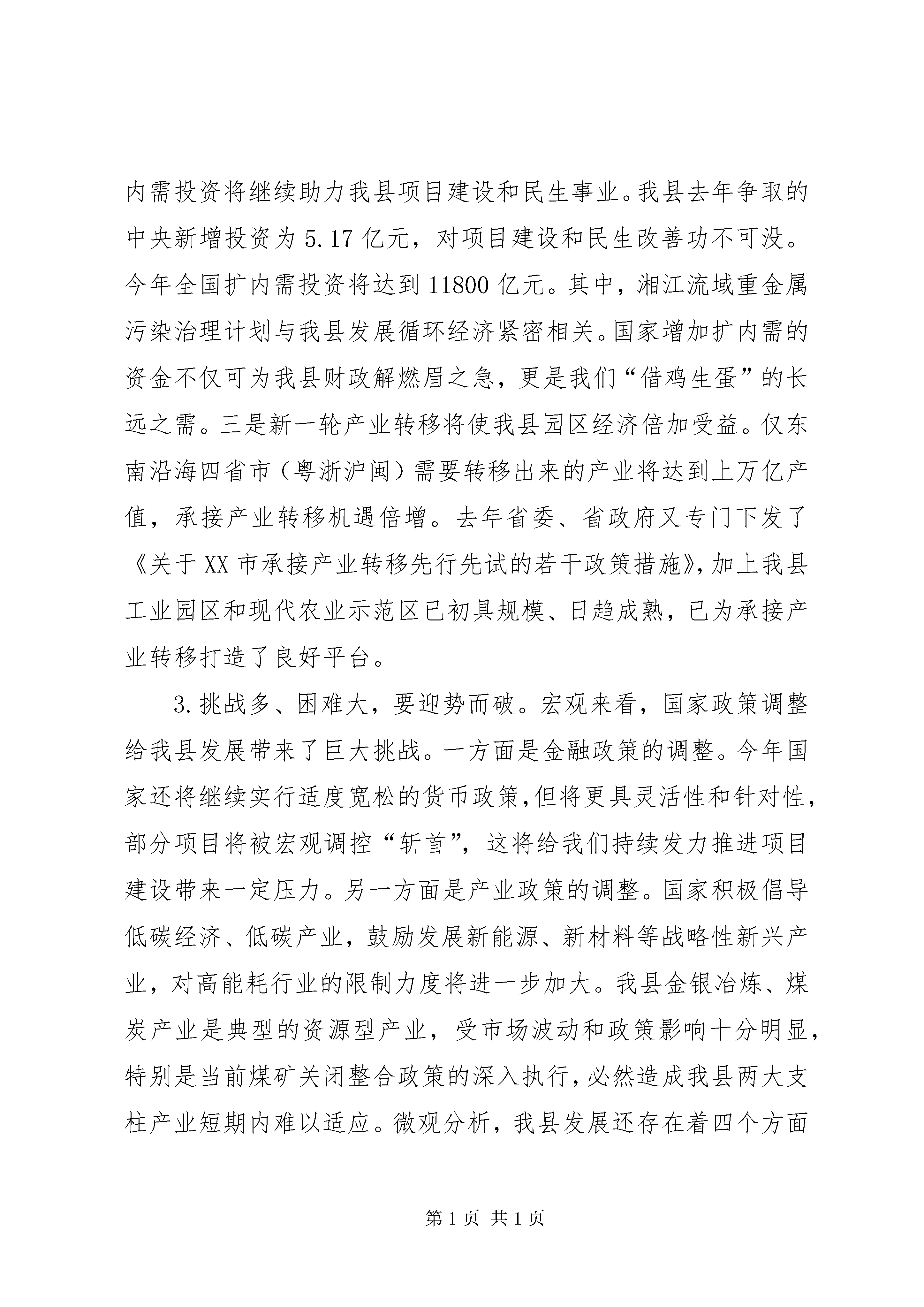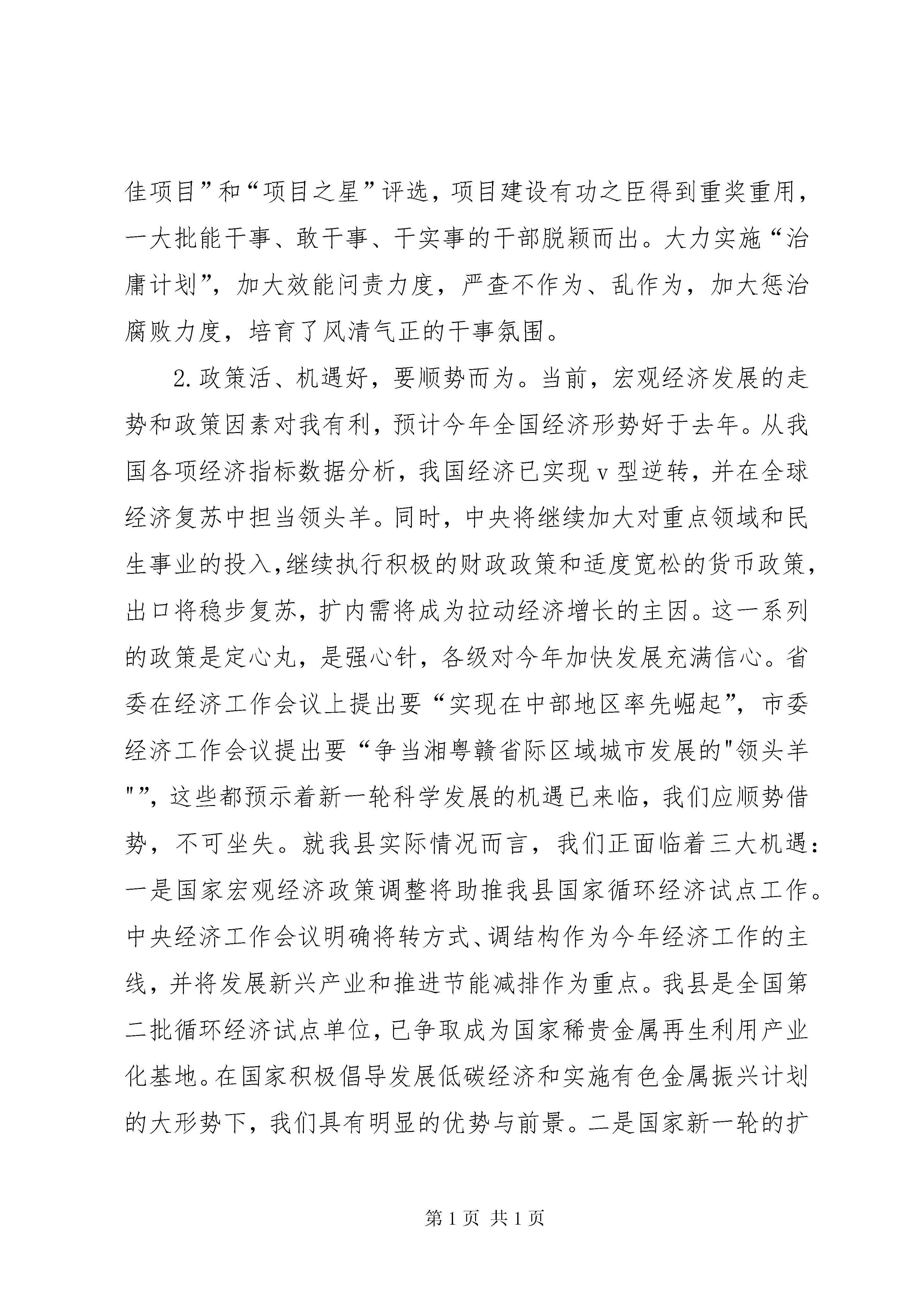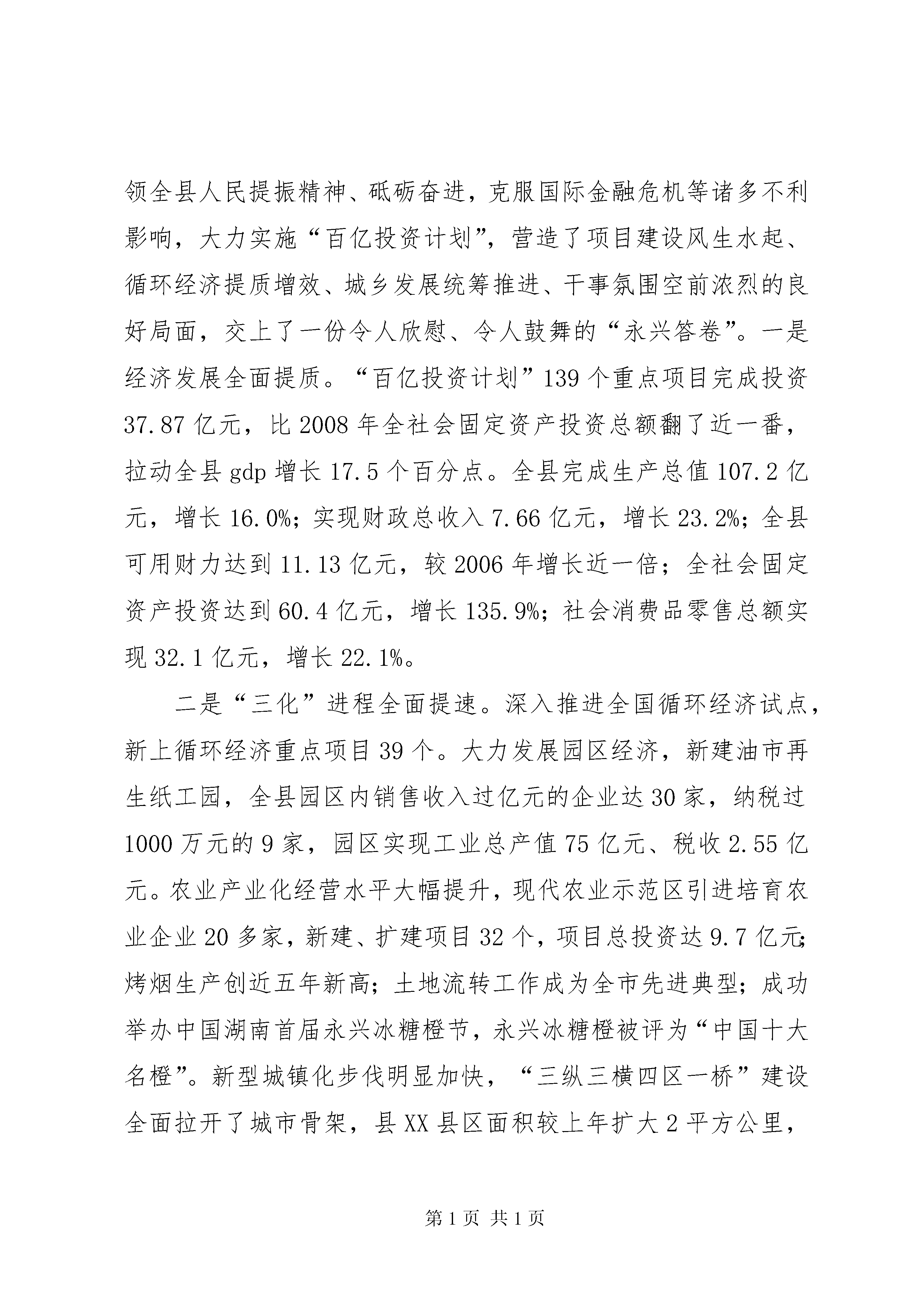 县委书记在经济工作会议上的讲话同志们:今天召开的2010年县委经济工作会议,主要任务是,传达贯彻中央和省委、市委经济工作会议精神,全面总结我县2009年经济工作,安排部署2010年经济工作。此前,中央和省委、市委经济工作会议已相继召开,会议时间早于往年,工作部署强于往年,行动速度快于往年。这向我们发出了一个强烈的信号,也是我们抓好2010年经济工作的总体要求,就是要早谋划、早部署、早行动,抢占先机,抢抓主动,努力开创2010年经济工作新局面。下面,我先讲四个方面的意见。一、坚定信心,牢牢把握战略机遇机遇永远垂青有准备者。当我们共克时艰、化危为机,度过了国际金融危机笼罩下的艰难的2009年,迎来了全国经济形势最为复杂、变数最大,同时又充满生机和机遇的2010年时,我国的改革发展已站在了历史的十字路口。这种大势下,我县同样处在经济调整转型、改革攻坚克难的关键时期。逆水行舟,不进则退。艰难的时运是勇敢者的机遇。唯有坚定信心、再接再厉,方能战胜困难,让2010年这个变数年成为我县实现关键转型和弯道超车,实现大发展、大跨越的机遇年。1.基础实、干劲足,要乘势而上。2009年是我县最困难的一年,也是干事力度最大、成效最显著的一年。县委、县政府带领全县人民提振精神、砥砺奋进,克服国际金融危机等诸多不利影响,大力实施“百亿投资计划”,营造了项目建设风生水起、循环经济提质增效、城乡发展统筹推进、干事氛围空前浓烈的良好局面,交上了一份令人欣慰、令人鼓舞的“永兴答卷”。一是经济发展全面提质。“百亿投资计划”139个重点项目完成投资37.87亿元,比2008年全社会固定资产投资总额翻了近一番,拉动全县gdp增长17.5个百分点。全县完成生产总值107.2亿元,增长16.0%;实现财政总收入7.66亿元,增长23.2%;全县可用财力达到11.13亿元,较2006年增长近一倍;全社会固定资产投资达到60.4亿元,增长135.9%;社会消费品零售总额实现32.1亿元,增长22.1%。二是“三化”进程全面提速。深入推进全国循环经济试点,新上循环经济重点项目39个。大力发展园区经济,新建油市再生纸工园,全县园区内销售收入过亿元的企业达30家,纳税过1000万元的9家,园区实现工业总产值75亿元、税收2.55亿元。农业产业化经营水平大幅提升,现代农业示范区引进培育农业企业20多家,新建、扩建项目32个,项目总投资达9.7亿元;烤烟生产创近五年新高;土地流转工作成为全市先进典型;成功举办中国湖南首届永兴冰糖橙节,永兴冰糖橙被评为“中国十大名橙”。新型城镇化步伐明显加快,“三纵三横四区一桥”建设全面拉开了城市骨架,县XX县区面积较上年扩大2平方公里,县城新增建筑面积22万平方米、人口2.1万人,新增16层以上高层建筑项目12个,全县农村镇区面积扩大到24平方公里,城镇长大长高变靓。三是先行先试全面放活。全年新批外资项目4个,引进内资项目53个,实际利用外资4909万美元,增长24.5%。成功引进了金邦投资、山东招金、湖南有色、贵研铂业、中国诚通等战略投资者。项目建设“一办六组”集中调度、挂图作战模式有力推进项目建设大提速。积极创新融资模式,全年实现项目融资13亿元以上。开创了有色金属仓储质押贷款模式。科技战略合作取得重大突破,与中南大学冶金学院、湖南农大的合作取得实质性进展,为新一轮的大发展积累了实力、奠定了基础。四是民生事业全面进步。进一步加大了民生投入,2009年县财政用于民生的投入达到8.28亿元,占全县财政总收入的70.6%。村级经费平均每村4万元,其中公务经费1万元。共投入为民办实事项目建设资金1.66亿元,全面完成28项为民办实事项目。完成通乡联网及通村公路387公里,启动建设6大输变电项目和惠及3.7万多户的农网改造工程,城乡饮水、污水治理、数字电视、采煤沉陷区安置等一大批民生工程建设全面推进。城乡就业、就医、就学等各方面的条件切实改善,社会保障体系不断完善。五是干部作风全面转变。坚持以项目建设论英雄,开展了“最佳项目”和“项目之星”评选,项目建设有功之臣得到重奖重用,一大批能干事、敢干事、干实事的干部脱颖而出。大力实施“治庸计划”,加大效能问责力度,严查不作为、乱作为,加大惩治腐败力度,培育了风清气正的干事氛围。2.政策活、机遇好,要顺势而为。当前,宏观经济发展的走势和政策因素对我有利,预计今年全国经济形势好于去年。从我国各项经济指标数据分析,我国经济已实现v型逆转,并在全球经济复苏中担当领头羊。同时,中央将继续加大对重点领域和民生事业的投入,继续执行积极的财政政策和适度宽松的货币政策,出口将稳步复苏,扩内需将成为拉动经济增长的主因。这一系列的政策是定心丸,是强心针,各级对今年加快发展充满信心。省委在经济工作会议上提出要“实