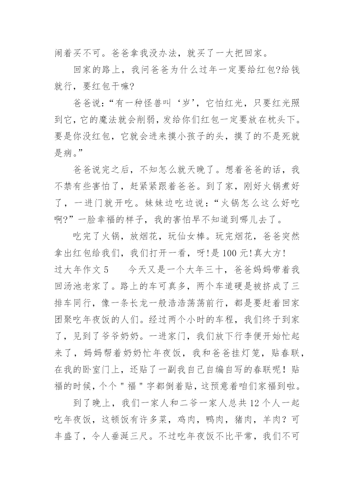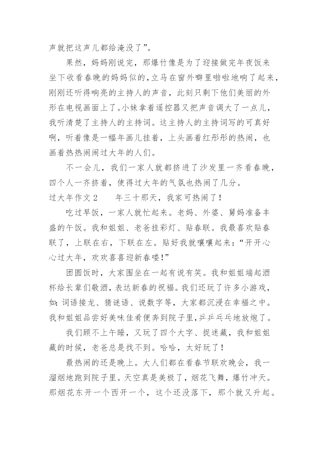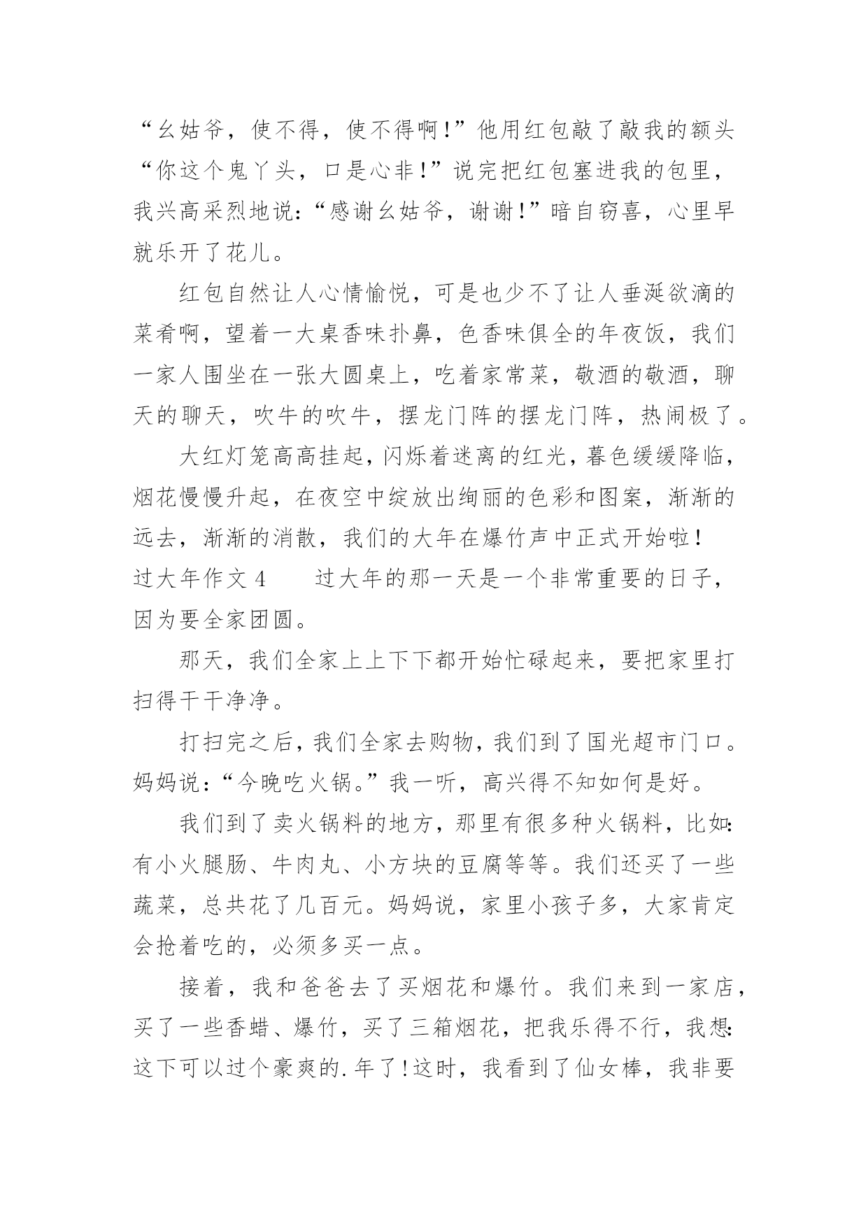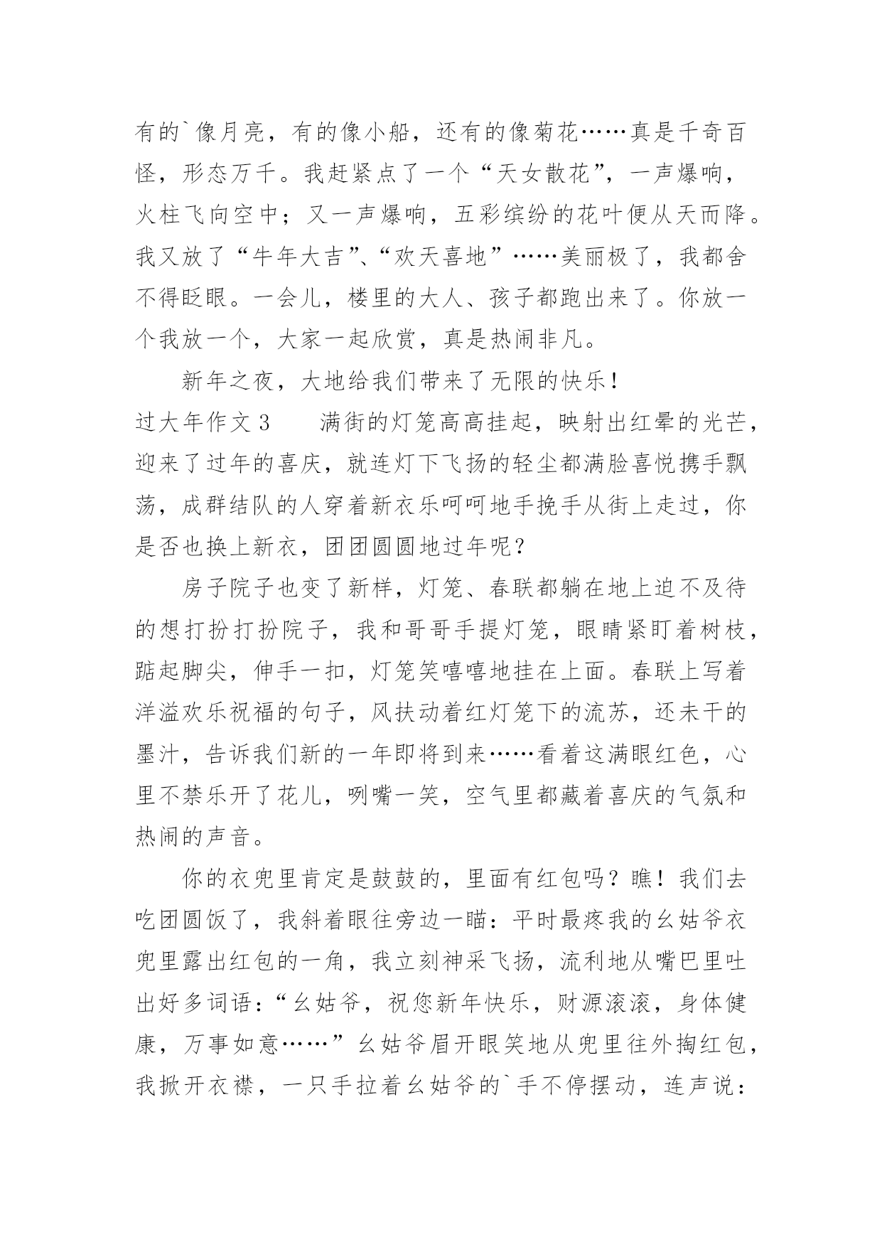 过大年作文 过大年作文精选15篇在日常的学习、工作、生活中,大家对作文都再熟悉不过了吧,作文根据写作时限的不同可以分为限时作文和非限时作文。为了让您在写作文时更加简单方便,以下是小编帮大家整理的过大年作文,供大家参考借鉴,希望可以帮助到有需要的朋友。过大年作文1“快点,快点,春晚开始啦!”小妹在家里大声嚷嚷着,我们在家里洗的洗碗,洗的洗澡,摆盘的摆盘,忙得不亦乐乎,听到她的呼唤,大家赶紧加快了手头的事。小妹在家不用干什么活,吃完年夜饭,她负责把家里所有的灯都打开,然后坐在电视前等着春晚的到来。时不时她也会听到外面的爆竹声而从窗口往外眺望,只是她不下楼去玩,她想要留在家里和家人过大年。“来啦,来啦,小妹,你把声音开大点儿!”妈妈从厨房里做着收尾工作,同时冲小妹喊着把电视的声音调大点。“哎呀,咱家可真是热闹啊!”爸爸洗完澡出来第一句就是这个,大概是洗澡的时候就听到小妹把电视音量给调大了好几个分贝吧。我忙着把过年茶几上的零食重新填满,听到爸爸的这句话,赶紧回应说:“这样才有过年的'气氛啊!”小妹凑到我面前来补充道:“对对对,就是要热热闹闹过大年啊!”妈妈这时也从厨房里忙完出来了,听到我们的声音,笑呵呵地对爸爸说:“这点声儿又不大,一会儿外面的爆竹声就把这声儿都给淹没了”。果然,妈妈刚说完,那爆竹像是为了迎接做完年夜饭来坐下收看春晚的妈妈似的,立马在窗外噼里啪啦地响了起来,刚刚还听得响亮的主持人的声音,此刻只剩下他们美丽的外形在电视画面上了。小妹拿着遥控器又把声音调大了一点儿,我听清楚了主持人的主持词。这主持人的主持词写的可真好啊,听着像是一幅年画儿挂着,上头画着红彤彤的热闹,也画着热热闹闹过大年的人们。不一会儿,我们一家人就都挤进了沙发里一齐看春晚,四个人一齐挤着,使得过大年的气氛也热闹了几分。过大年作文2年三十那天,我家可热闹了!吃过早饭,一家人就忙起来。老妈、外婆、舅妈准备丰盛的午饭。我和姐姐、老爸挂彩灯、贴春联。我最喜欢贴春联了,上联在右,下联在左。贴好我就嚷嚷起来:“开开心心过大年,欢欢喜喜迎新春喽!”团圆饭时,大家围坐在一起有说有笑。我和姐姐端起酒杯给长辈们敬酒,表达新春的祝福。我们还玩了许多小游戏,如:词语接龙、猜谜语、说数字等,大家都沉浸在幸福之中。我和姐姐品尝好美味佳肴便奔到院子里,乒乒乓乓地放炮了。我们顾不上午睡,又玩了四个大字、捉迷藏,我和姐姐藏的时候,老爸总是找不到。哈哈,太好玩了!最热闹的还是晚上。大人们都在看春节联欢晚会,我一溜烟地跑到院子里。天空真是美极了,烟花飞舞,爆竹冲天。那烟花东开一个西开一个,这个还没落下,那个就又升起。有的`像月亮,有的像小船,还有的像菊花……真是千奇百怪,形态万千。我赶紧点了一个“天女散花”,一声爆响,火柱飞向空中;又一声爆响,五彩缤纷的花叶便从天而降。我又放了“牛年大吉”、“欢天喜地”……美丽极了,我都舍不得眨眼。一会儿,楼里的大人、孩子都跑出来了。你放一个我放一个,大家一起欣赏,真是热闹非凡。新年之夜,大地给我们带来了无限的快乐!过大年作文3满街的灯笼高高挂起,映射出红晕的光芒,迎来了过年的喜庆,就连灯下飞扬的轻尘都满脸喜悦携手飘荡,成群结队的人穿着新衣乐呵呵地手挽手从街上走过,你是否也换上新衣,团团圆圆地过年呢?房子院子也变了新样,灯笼、春联都躺在地上迫不及待的想打扮打扮院子,我和哥哥手提灯笼,眼睛紧盯着树枝,踮起脚尖,伸手一扣,灯笼笑嘻嘻地挂在上面。春联上写着洋溢欢乐祝福的句子,风扶动着红灯笼下的流苏,还未干的墨汁,告诉我们新的一年即将到来……看着这满眼红色,心里不禁乐开了花儿,咧嘴一笑,空气里都藏着喜庆的气氛和热闹的声音。你的衣兜里肯定是鼓鼓的,里面有红包吗?瞧!我们去吃团圆饭了,我斜着眼往旁边一瞄:平时最疼我的幺姑爷衣兜里露出红包的一角,我立刻神采飞扬,流利地从嘴巴里吐出好多词语:“幺姑爷,祝您新年快乐,财源滚滚,身体健康,万事如意……”幺姑爷眉开眼笑地从兜里往外掏红包,我掀开衣襟,一只手拉着幺姑爷的`手不停摆动,连声说:“幺姑爷,使不得,使不得啊!”他用红包敲了敲我的额头“你这个鬼丫头,口是心非!”说完把红包塞进我的包里,我兴高采烈地说:“感谢幺姑爷,谢谢!”暗自窃喜,心里早就乐开了花儿。红包自然让人心情愉悦,可是也少不了让人垂涎欲滴的菜肴啊,望着一大桌香味扑鼻,色香味俱全的年夜饭,我们一家人围坐在一张大圆桌上,吃着家常菜,敬酒的敬酒,聊天的聊天,吹牛的吹牛,摆龙门阵的摆龙门阵,热闹极了。大红灯笼高高挂起,闪烁着迷离的红光,暮色缓缓降临,烟花慢慢升起,在夜空中绽放出绚丽的色彩和图案,渐渐的远去,渐渐的消散,我们的大年在爆竹声中正式开始啦!过大年作文4过大年的那一天是一个非常重要的日子,因为要全家团圆。那天,我们全家上上下下都开始忙碌起来,要把家里打扫得干干净净。