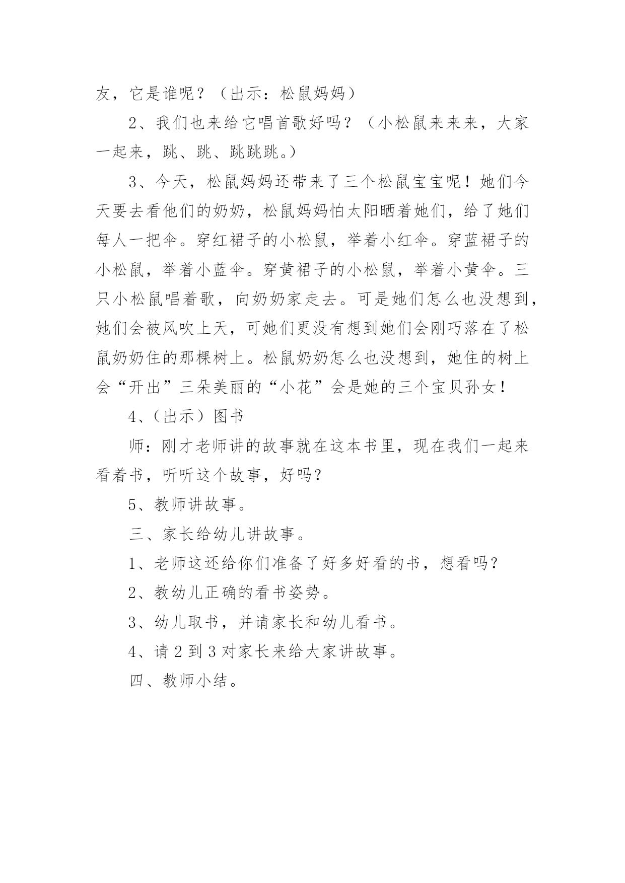 托班语言教案:松鼠宝宝的小伞 托班语言教案:松鼠宝宝的小伞作为一名辛苦耕耘的教育工作者,很有必要精心设计一份教案,编写教案有利于我们准确把握教材的重点与难点,进而选择恰当的教学方法。写教案需要注意哪些格式呢?下面是小编精心整理的托班语言教案:松鼠宝宝的小伞,仅供参考,大家一起来看看吧。活动目标:1、培养幼儿学会认真倾听故事。2、鼓励幼儿大胆地跟老师学说故事。活动准备:塑封的各种故事人物。活动过程:一、音乐歌曲导入。1、出示小白兔头饰。师:小朋友们,上次我们给小白兔做了好吃的胡萝卜,瞧,今天它又来了,我们一起唱歌给它听,好吗?(小白兔来来来,大家一起来,跳、跳、跳跳跳。)2、幼儿跟老师一起来唱。二、讲述故事。1、师:你们看,今天小白兔还给我们带来了一个新朋友,它是谁呢?(出示:松鼠妈妈)2、我们也来给它唱首歌好吗?(小松鼠来来来,大家一起来,跳、跳、跳跳跳。)3、今天,松鼠妈妈还带来了三个松鼠宝宝呢!她们今天要去看他们的奶奶,松鼠妈妈怕太阳晒着她们,给了她们每人一把伞。穿红裙子的小松鼠,举着小红伞。穿蓝裙子的小松鼠,举着小蓝伞。穿黄裙子的小松鼠,举着小黄伞。三只小松鼠唱着歌,向奶奶家走去。可是她们怎么也没想到,她们会被风吹上天,可她们更没有想到她们会刚巧落在了松鼠奶奶住的那棵树上。松鼠奶奶怎么也没想到,她住的树上会“开出”三朵美丽的“小花”会是她的三个宝贝孙女!4、(出示)图书师:刚才老师讲的故事就在这本书里,现在我们一起来看着书,听听这个故事,好吗?5、教师讲故事。三、家长给幼儿讲故事。1、老师这还给你们准备了好多好看的书,想看吗?2、教幼儿正确的看书姿势。3、幼儿取书,并请家长和幼儿看书。4、请2到3对家长来给大家讲故事。四、教师小结。
