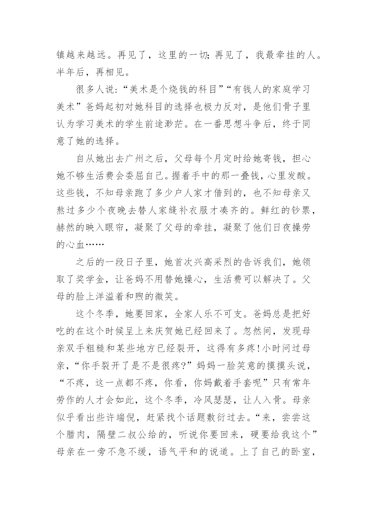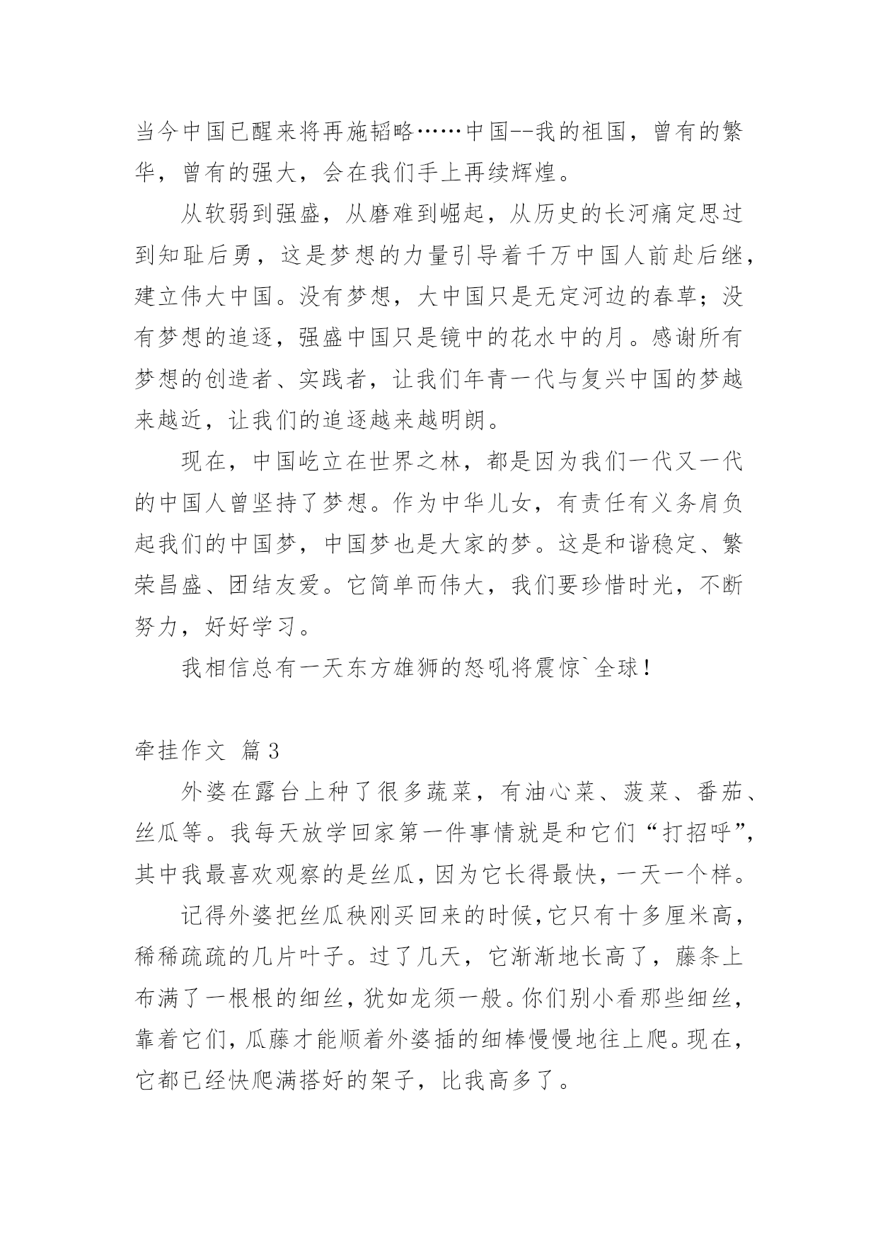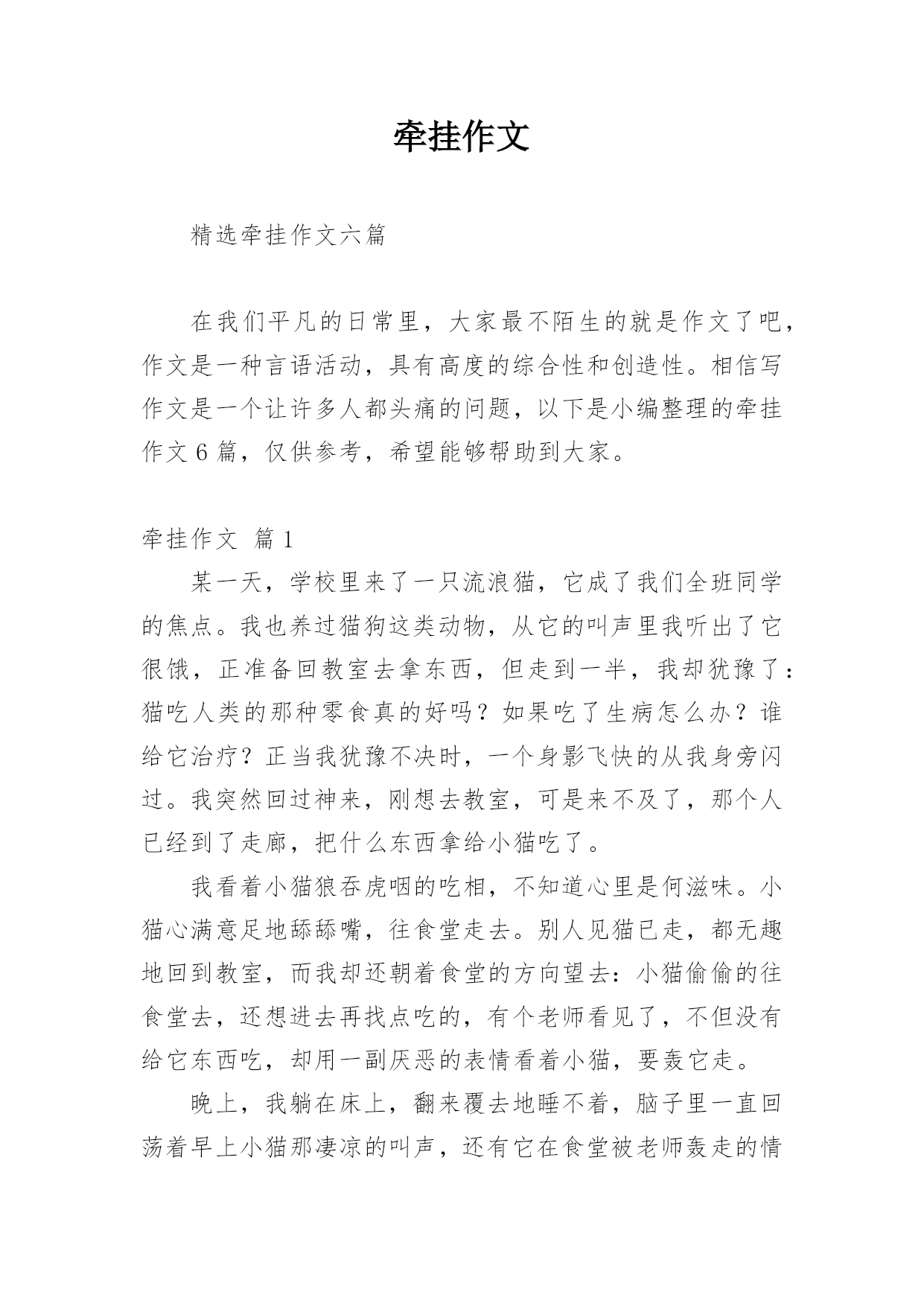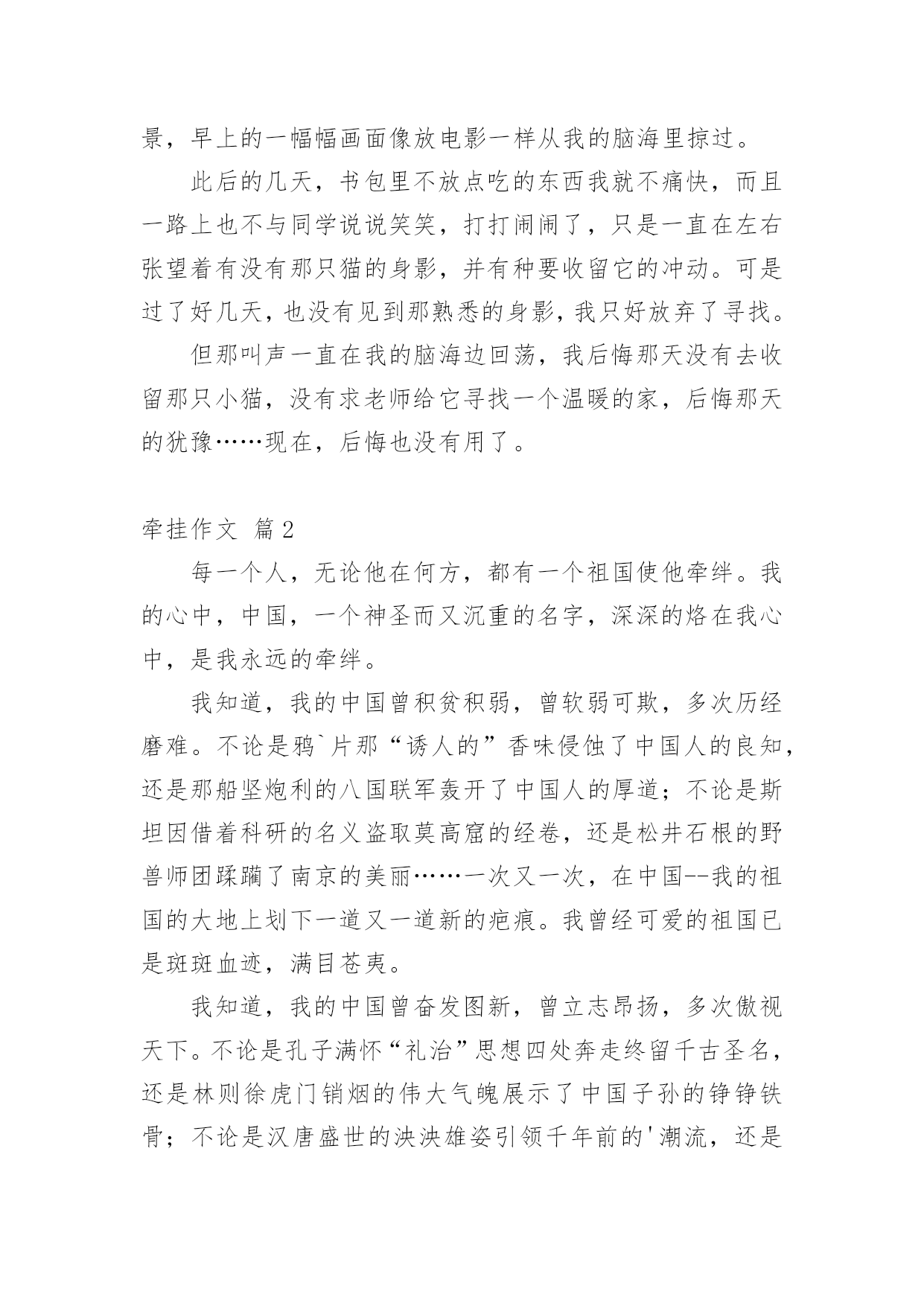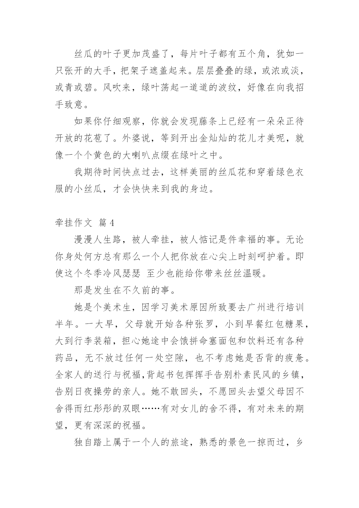 牵挂作文 精选牵挂作文六篇在我们平凡的日常里,大家最不陌生的就是作文了吧,作文是一种言语活动,具有高度的综合性和创造性。相信写作文是一个让许多人都头痛的问题,以下是小编整理的牵挂作文6篇,仅供参考,希望能够帮助到大家。牵挂作文篇1某一天,学校里来了一只流浪猫,它成了我们全班同学的焦点。我也养过猫狗这类动物,从它的叫声里我听出了它很饿,正准备回教室去拿东西,但走到一半,我却犹豫了:猫吃人类的那种零食真的好吗?如果吃了生病怎么办?谁给它治疗?正当我犹豫不决时,一个身影飞快的从我身旁闪过。我突然回过神来,刚想去教室,可是来不及了,那个人已经到了走廊,把什么东西拿给小猫吃了。我看着小猫狼吞虎咽的吃相,不知道心里是何滋味。小猫心满意足地舔舔嘴,往食堂走去。别人见猫已走,都无趣地回到教室,而我却还朝着食堂的方向望去:小猫偷偷的往食堂去,还想进去再找点吃的,有个老师看见了,不但没有给它东西吃,却用一副厌恶的表情看着小猫,要轰它走。晚上,我躺在床上,翻来覆去地睡不着,脑子里一直回荡着早上小猫那凄凉的叫声,还有它在食堂被老师轰走的情景,早上的一幅幅画面像放电影一样从我的脑海里掠过。此后的几天,书包里不放点吃的东西我就不痛快,而且一路上也不与同学说说笑笑,打打闹闹了,只是一直在左右张望着有没有那只猫的身影,并有种要收留它的冲动。可是过了好几天,也没有见到那熟悉的身影,我只好放弃了寻找。但那叫声一直在我的脑海边回荡,我后悔那天没有去收留那只小猫,没有求老师给它寻找一个温暖的家,后悔那天的犹豫……现在,后悔也没有用了。牵挂作文篇2每一个人,无论他在何方,都有一个祖国使他牵绊。我的心中,中国,一个神圣而又沉重的名字,深深的烙在我心中,是我永远的牵绊。我知道,我的中国曾积贫积弱,曾软弱可欺,多次历经磨难。不论是鸦`片那“诱人的”香味侵蚀了中国人的良知,还是那船坚炮利的八国联军轰开了中国人的厚道;不论是斯坦因借着科研的名义盗取莫高窟的经卷,还是松井石根的野兽师团蹂躏了南京的美丽……一次又一次,在中国--我的祖国的大地上划下一道又一道新的疤痕。我曾经可爱的祖国已是斑斑血迹,满目苍夷。我知道,我的中国曾奋发图新,曾立志昂扬,多次傲视天下。不论是孔子满怀“礼治”思想四处奔走终留千古圣名,还是林则徐虎门销烟的伟大气魄展示了中国子孙的铮铮铁骨;不论是汉唐盛世的泱泱雄姿引领千年前的'潮流,还是当今中国已醒来将再施韬略……中国--我的祖国,曾有的繁华,曾有的强大,会在我们手上再续辉煌。从软弱到强盛,从磨难到崛起,从历史的长河痛定思过到知耻后勇,这是梦想的力量引导着千万中国人前赴后继,建立伟大中国。没有梦想,大中国只是无定河边的春草;没有梦想的追逐,强盛中国只是镜中的花水中的月。感谢所有梦想的创造者、实践者,让我们年青一代与复兴中国的梦越来越近,让我们的追逐越来越明朗。现在,中国屹立在世界之林,都是因为我们一代又一代的中国人曾坚持了梦想。作为中华儿女,有责任有义务肩负起我们的中国梦,中国梦也是大家的梦。这是和谐稳定、繁荣昌盛、团结友爱。它简单而伟大,我们要珍惜时光,不断努力,好好学习。我相信总有一天东方雄狮的怒吼将震惊`全球!牵挂作文篇3外婆在露台上种了很多蔬菜,有油心菜、菠菜、番茄、丝瓜等。我每天放学回家第一件事情就是和它们“打招呼”,其中我最喜欢观察的是丝瓜,因为它长得最快,一天一个样。记得外婆把丝瓜秧刚买回来的时候,它只有十多厘米高,稀稀疏疏的几片叶子。过了几天,它渐渐地长高了,藤条上布满了一根根的细丝,犹如龙须一般。你们别小看那些细丝,靠着它们,瓜藤才能顺着外婆插的细棒慢慢地往上爬。现在,它都已经快爬满搭好的架子,比我高多了。丝瓜的叶子更加茂盛了,每片叶子都有五个角,犹如一只张开的大手,把架子遮盖起来。层层叠叠的绿,或浓或淡,或青或碧。风吹来,绿叶荡起一道道的波纹,好像在向我招手致意。如果你仔细观察,你就会发现藤条上已经有一朵朵正待开放的花苞了。外婆说,等到开出金灿灿的花儿才美呢,就像一个个黄色的大喇叭点缀在绿叶之中。我期待时间快点过去,这样美丽的丝瓜花和穿着绿色衣服的小丝瓜,才会快快来到我的身边。牵挂作文篇4漫漫人生路,被人牵挂,被人惦记是件幸福的事。无论你身处何方总有那么一个人把你放在心尖上时刻呵护着。即使这个冬季冷风瑟瑟至少也能给你带来丝丝温暖。那是发生在不久前的事。她是个美术生,因学习美术原因所致要去广州进行培训半年。一大早,父母就开始各种张罗,小到早餐红包糖果,大到行李装箱,担心她途中会饿拼命塞面包和饮料还有各种药品,无不放过任何一处空隙,也不考虑她是否背的疲惫。全家人的送行与祝福,背起书包挥挥手告别朴素民风的乡镇,告别日夜操劳的亲人。她不敢回头,不愿回头去望父母因不舍得而红彤彤的双眼……有对女儿的舍不得,有对未来的期望,更有深深的祝福。独自踏上属于一