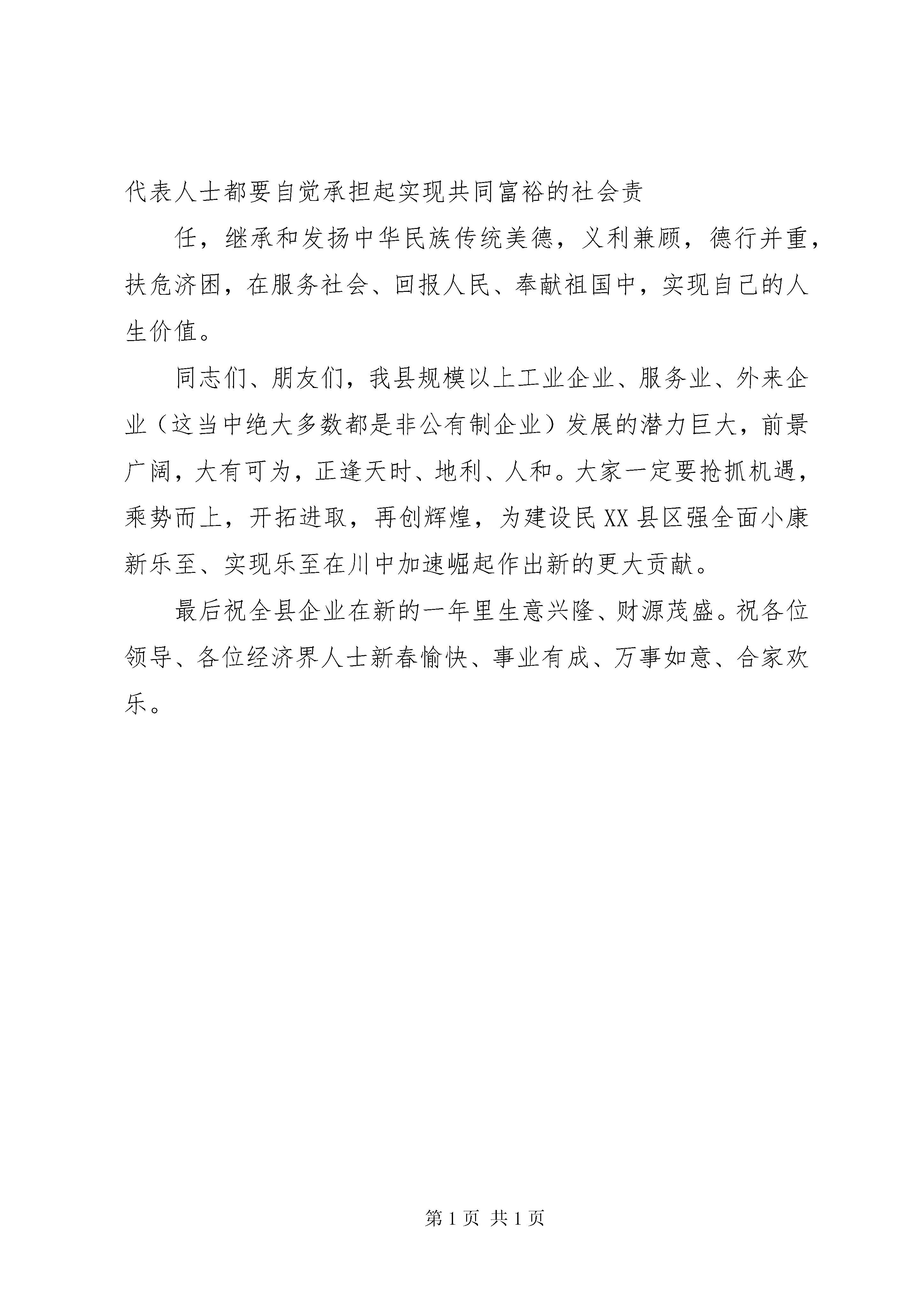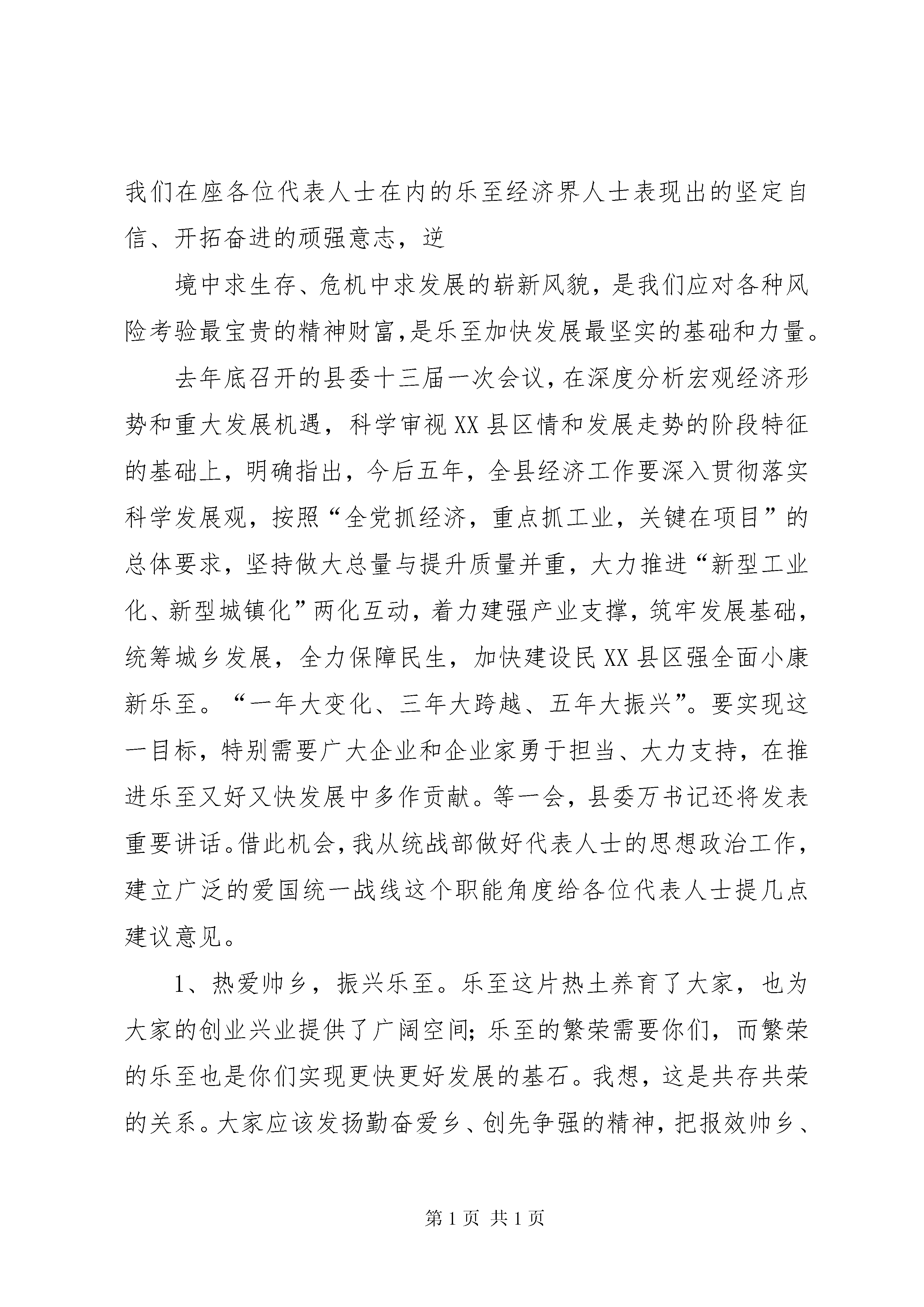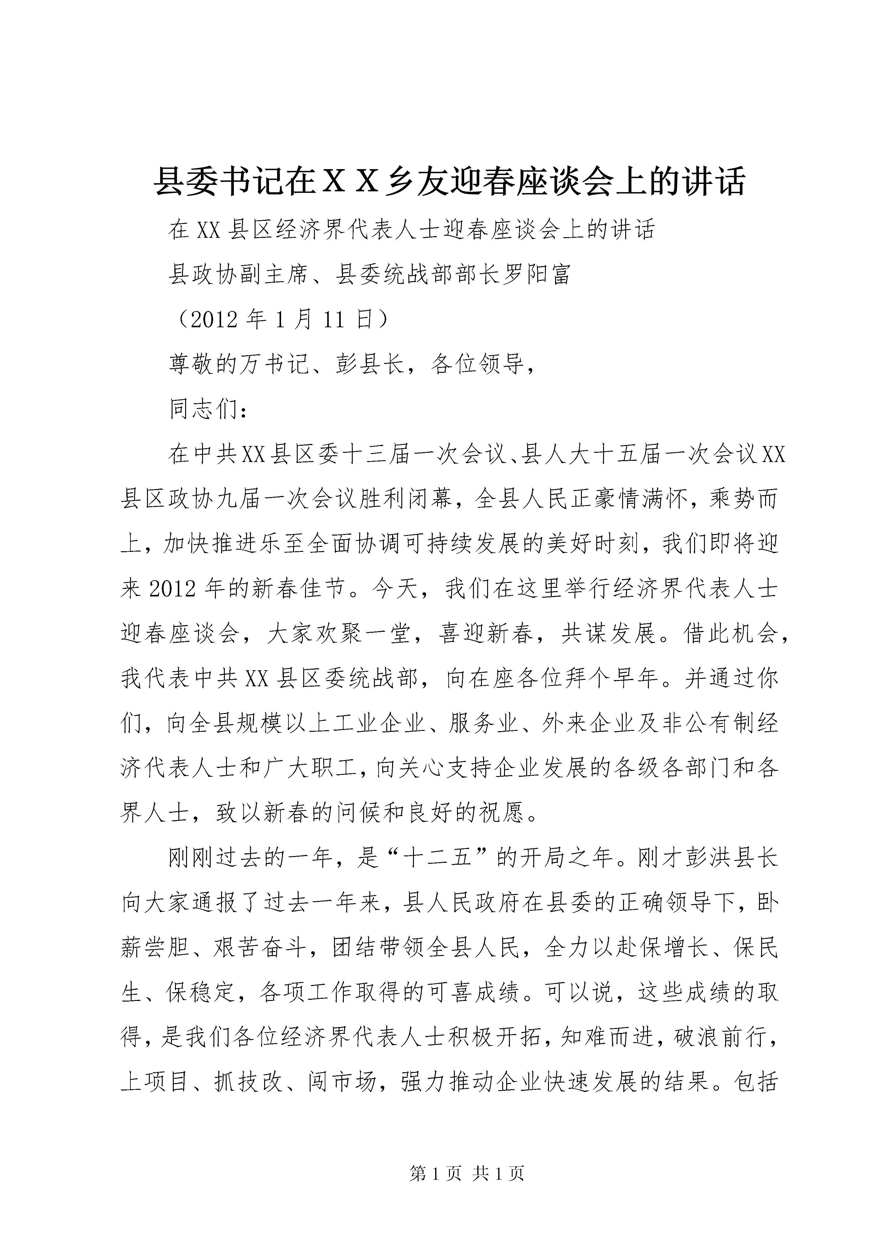 县委书记在XX乡友迎春座谈会上的讲话在XX县区经济界代表人士迎春座谈会上的讲话县政协副主席、县委统战部部长罗阳富(2012年1月11日)尊敬的万书记、彭县长,各位领导,同志们:在中共XX县区委十三届一次会议、县人大十五届一次会议XX县区政协九届一次会议胜利闭幕,全县人民正豪情满怀,乘势而上,加快推进乐至全面协调可持续发展的美好时刻,我们即将迎来2012年的新春佳节。今天,我们在这里举行经济界代表人士迎春座谈会,大家欢聚一堂,喜迎新春,共谋发展。借此机会,我代表中共XX县区委统战部,向在座各位拜个早年。并通过你们,向全县规模以上工业企业、服务业、外来企业及非公有制经济代表人士和广大职工,向关心支持企业发展的各级各部门和各界人士,致以新春的问候和良好的祝愿。刚刚过去的一年,是“十二五”的开局之年。刚才彭洪县长向大家通报了过去一年来,县人民政府在县委的正确领导下,卧薪尝胆、艰苦奋斗,团结带领全县人民,全力以赴保增长、保民生、保稳定,各项工作取得的可喜成绩。可以说,这些成绩的取得,是我们各位经济界代表人士积极开拓,知难而进,破浪前行,上项目、抓技改、闯市场,强力推动企业快速发展的结果。包括我们在座各位代表人士在内的乐至经济界人士表现出的坚定自信、开拓奋进的顽强意志,逆境中求生存、危机中求发展的崭新风貌,是我们应对各种风险考验最宝贵的精神财富,是乐至加快发展最坚实的基础和力量。去年底召开的县委十三届一次会议,在深度分析宏观经济形势和重大发展机遇,科学审视XX县区情和发展走势的阶段特征的基础上,明确指出,今后五年,全县经济工作要深入贯彻落实科学发展观,按照“全党抓经济,重点抓工业,关键在项目”的总体要求,坚持做大总量与提升质量并重,大力推进“新型工业化、新型城镇化”两化互动,着力建强产业支撑,筑牢发展基础,统筹城乡发展,全力保障民生,加快建设民XX县区强全面小康新乐至。“一年大变化、三年大跨越、五年大振兴”。要实现这一目标,特别需要广大企业和企业家勇于担当、大力支持,在推进乐至又好又快发展中多作贡献。等一会,县委万书记还将发表重要讲话。借此机会,我从统战部做好代表人士的思想政治工作,建立广泛的爱国统一战线这个职能角度给各位代表人士提几点建议意见。1、热爱帅乡,振兴乐至。乐至这片热土养育了大家,也为大家的创业兴业提供了广阔空间;乐至的繁荣需要你们,而繁荣的乐至也是你们实现更快更好发展的基石。我想,这是共存共荣的关系。大家应该发扬勤奋爱乡、创先争强的精神,把报效帅乡、振兴乐至作为一项责无旁贷的自觉行动,为乐至的加快发展作出应有的更大贡献,为乐至的美好明天增光添彩。2、百折不挠,奋发图强。大家要珍惜改革开放的大好形势,在党和国家政策指引之下,按照科学发展观的要求,秉持勤奋敬业的职业精神,塑造精益求精的职业风范,立足本业、锐意进取,乘风扬帆、激流勇进,不断把企业做强、做大、做久,不断提高企业的竞争力,为实现我县经济腾飞尽心尽力。3、言行一致,重诚守信。无信则不立,厚德可载物。驰骋商海,诚信为舟,方能行得稳、走得远。每一位经济界人士都要自觉坚持信誉第一、诚信为本,守信用、讲信誉、重信义,弘扬诚信理念,培育诚信企业,为建设诚信乐至作出积极贡献。4、诚实劳动,依法经营。守法是每个公民必备的道德准则,也是企业持续发展的内在要求。各位经济界人士一定要牢固树立劳动致富、依法经营的理念,自觉遵守国家法律法规,遵循市场规则和行业规范,建立新型的劳动关系,尊重和维护员工的合法权益,依靠诚实劳动,倡导公平竞争,坚持社会正义,推动经济工作健康发展。5、致富思源,奉献社会。致富不忘本,饮水当思源。不论是规模以上工业企业、服务业、外来企业经营者及非公有制经济代表人士都要自觉承担起实现共同富裕的社会责任,继承和发扬中华民族传统美德,义利兼顾,德行并重,扶危济困,在服务社会、回报人民、奉献祖国中,实现自己的人生价值。同志们、朋友们,我县规模以上工业企业、服务业、外来企业(这当中绝大多数都是非公有制企业)发展的潜力巨大,前景广阔,大有可为,正逢天时、地利、人和。大家一定要抢抓机遇,乘势而上,开拓进取,再创辉煌,为建设民XX县区强全面小康新乐至、实现乐至在川中加速崛起作出新的更大贡献。最后祝全县企业在新的一年里生意兴隆、财源茂盛。祝各位领导、各位经济界人士新春愉快、事业有成、万事如意、合家欢乐。