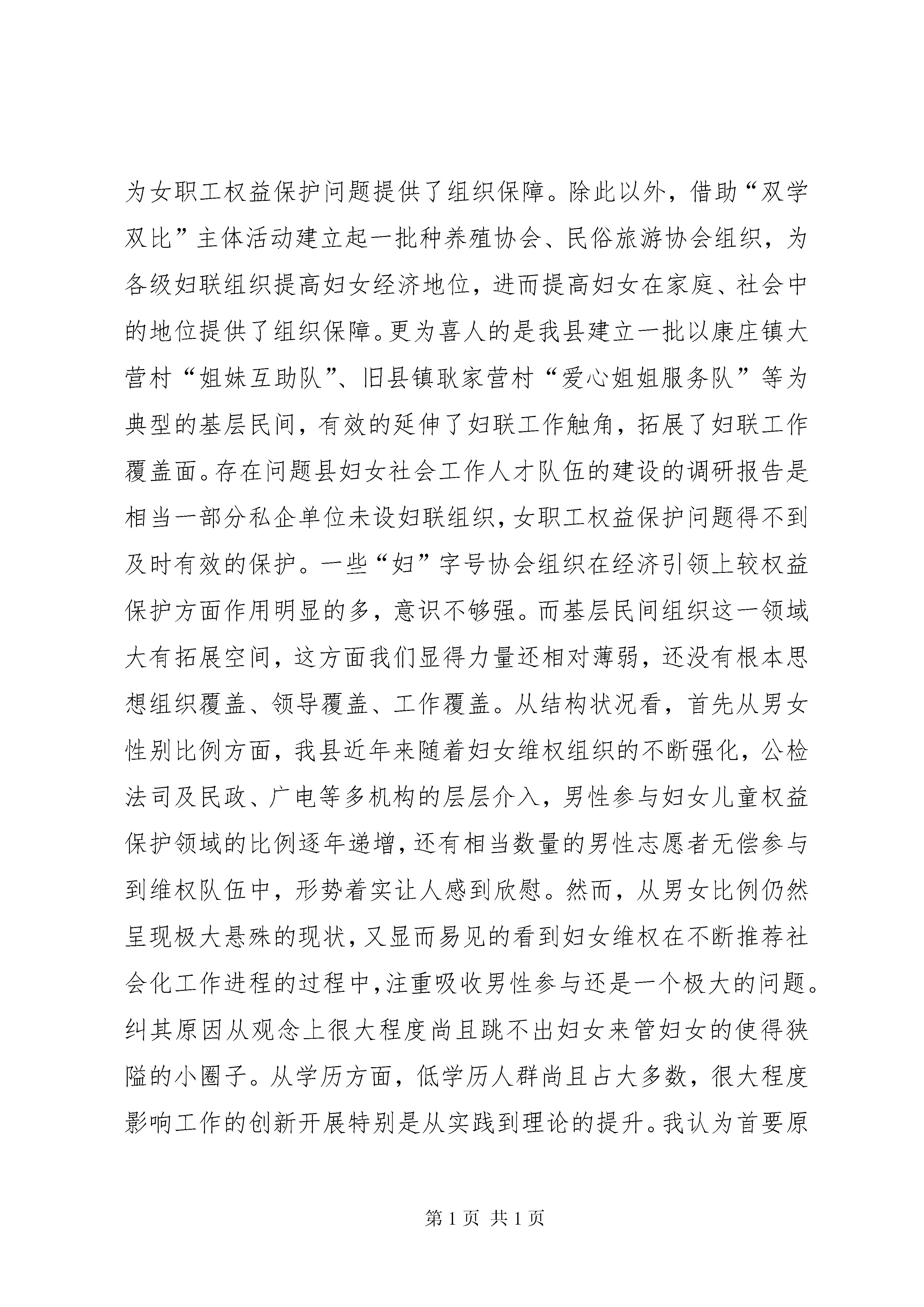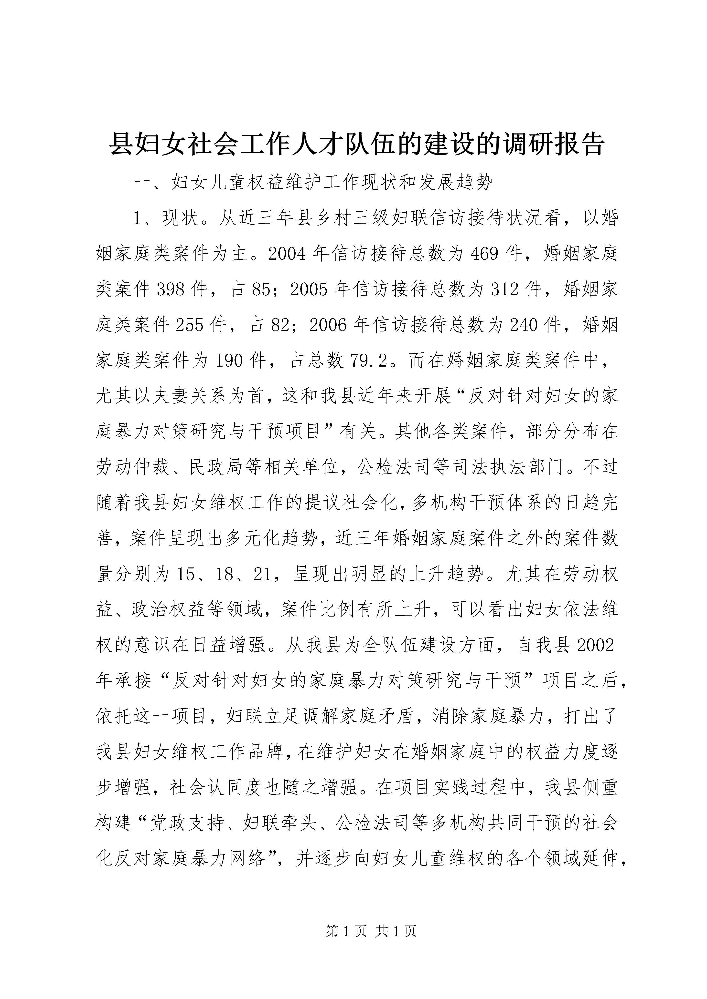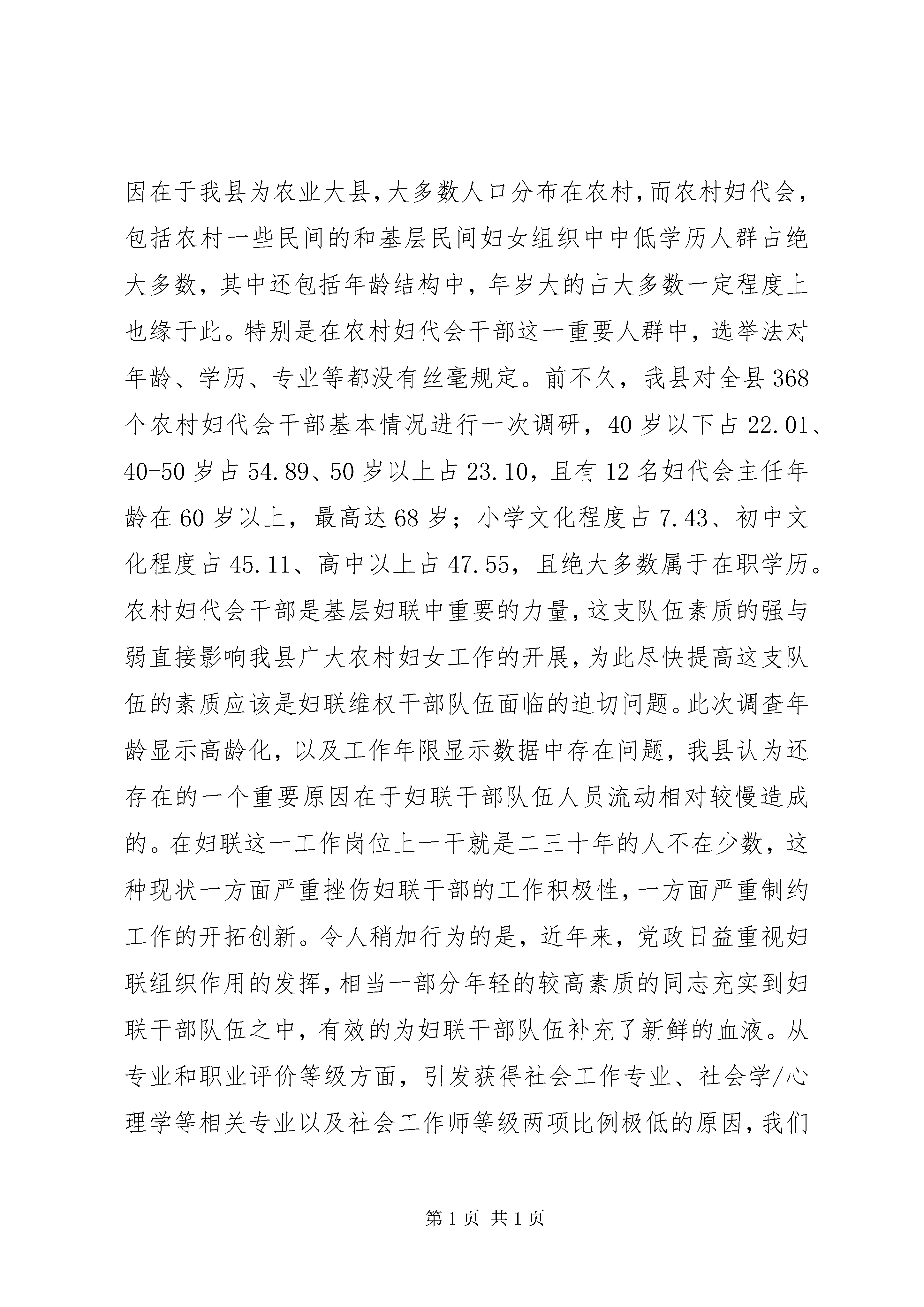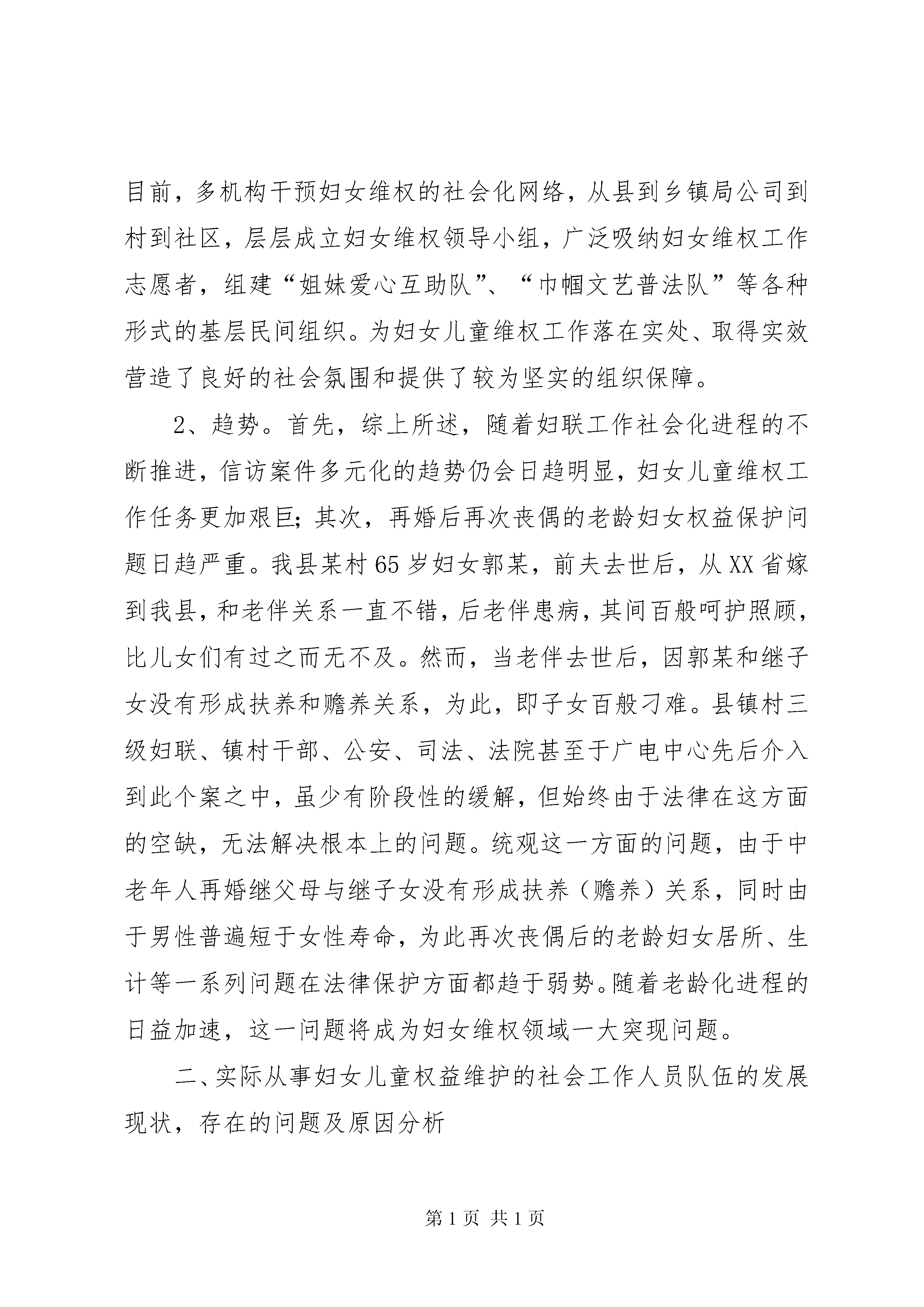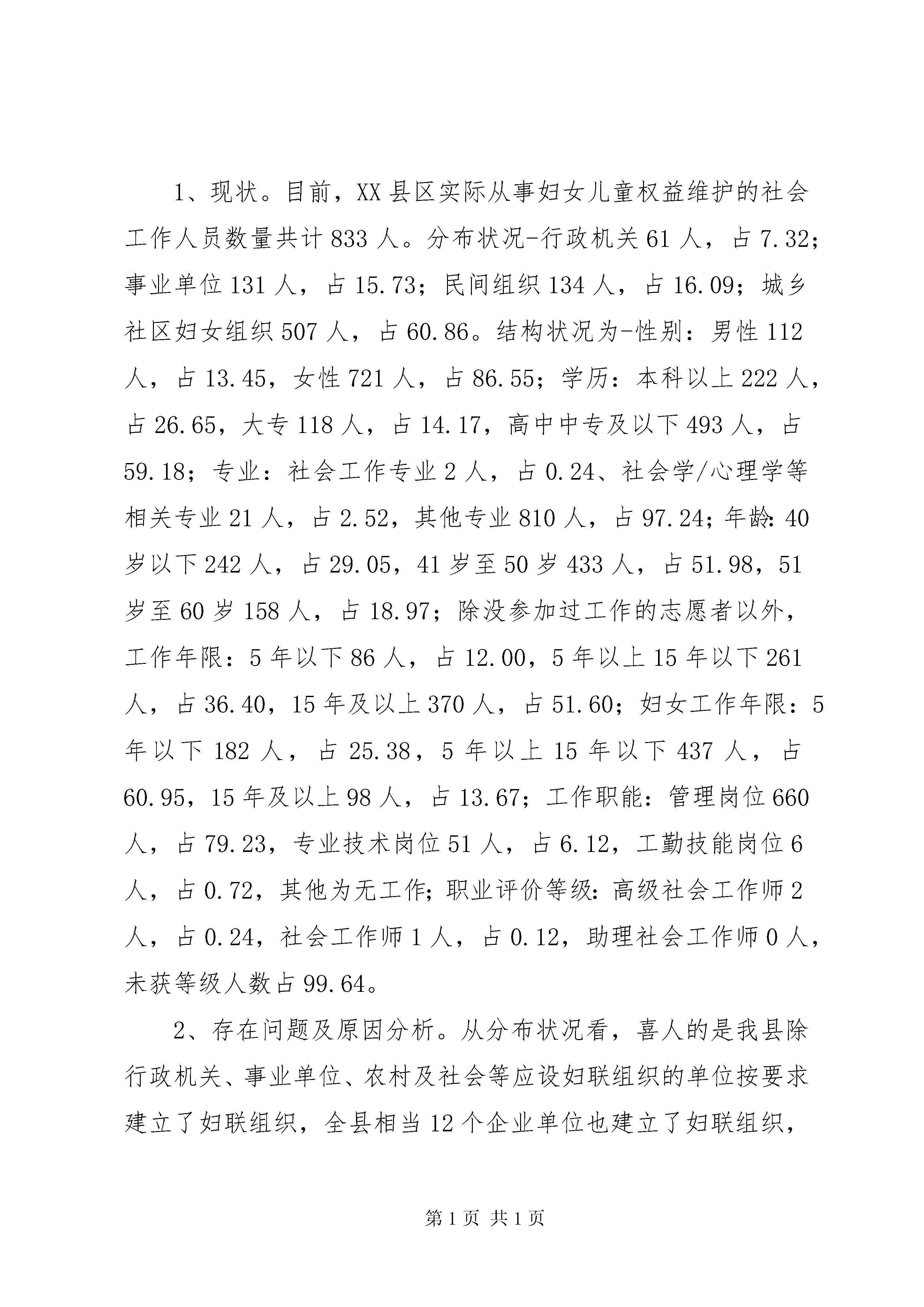 县妇女社会工作人才队伍的建设的调研报告一、妇女儿童权益维护工作现状和发展趋势1、现状。从近三年县乡村三级妇联信访接待状况看,以婚姻家庭类案件为主。2004年信访接待总数为469件,婚姻家庭类案件398件,占85;2005年信访接待总数为312件,婚姻家庭类案件255件,占82;2006年信访接待总数为240件,婚姻家庭类案件为190件,占总数79.2。而在婚姻家庭类案件中,尤其以夫妻关系为首,这和我县近年来开展“反对针对妇女的家庭暴力对策研究与干预项目”有关。其他各类案件,部分分布在劳动仲裁、民政局等相关单位,公检法司等司法执法部门。不过随着我县妇女维权工作的提议社会化,多机构干预体系的日趋完善,案件呈现出多元化趋势,近三年婚姻家庭案件之外的案件数量分别为15、18、21,呈现出明显的上升趋势。尤其在劳动权益、政治权益等领域,案件比例有所上升,可以看出妇女依法维权的意识在日益增强。从我县为全队伍建设方面,自我县2002年承接“反对针对妇女的家庭暴力对策研究与干预”项目之后,依托这一项目,妇联立足调解家庭矛盾,消除家庭暴力,打出了我县妇女维权工作品牌,在维护妇女在婚姻家庭中的权益力度逐步增强,社会认同度也随之增强。在项目实践过程中,我县侧重构建“党政支持、妇联牵头、公检法司等多机构共同干预的社会化反对家庭暴力网络”,并逐步向妇女儿童维权的各个领域延伸,目前,多机构干预妇女维权的社会化网络,从县到乡镇局公司到村到社区,层层成立妇女维权领导小组,广泛吸纳妇女维权工作志愿者,组建“姐妹爱心互助队”、“巾帼文艺普法队”等各种形式的基层民间组织。为妇女儿童维权工作落在实处、取得实效营造了良好的社会氛围和提供了较为坚实的组织保障。2、趋势。首先,综上所述,随着妇联工作社会化进程的不断推进,信访案件多元化的趋势仍会日趋明显,妇女儿童维权工作任务更加艰巨;其次,再婚后再次丧偶的老龄妇女权益保护问题日趋严重。我县某村65岁妇女郭某,前夫去世后,从XX省嫁到我县,和老伴关系一直不错,后老伴患病,其间百般呵护照顾,比儿女们有过之而无不及。然而,当老伴去世后,因郭某和继子女没有形成扶养和赡养关系,为此,即子女百般刁难。县镇村三级妇联、镇村干部、公安、司法、法院甚至于广电中心先后介入到此个案之中,虽少有阶段性的缓解,但始终由于法律在这方面的空缺,无法解决根本上的问题。统观这一方面的问题,由于中老年人再婚继父母与继子女没有形成扶养(赡养)关系,同时由于男性普遍短于女性寿命,为此再次丧偶后的老龄妇女居所、生计等一系列问题在法律保护方面都趋于弱势。随着老龄化进程的日益加速,这一问题将成为妇女维权领域一大突现问题。二、实际从事妇女儿童权益维护的社会工作人员队伍的发展现状,存在的问题及原因分析1、现状。目前,XX县区实际从事妇女儿童权益维护的社会工作人员数量共计833人。分布状况-行政机关61人,占7.32;事业单位131人,占15.73;民间组织134人,占16.09;城乡社区妇女组织507人,占60.86。结构状况为-性别:男性112人,占13.45,女性721人,占86.55;学历:本科以上222人,占26.65,大专118人,占14.17,高中中专及以下493人,占59.18;专业:社会工作专业2人,占0.24、社会学/心理学等相关专业21人,占2.52,其他专业810人,占97.24;年龄:40岁以下242人,占29.05,41岁至50岁433人,占51.98,51岁至60岁158人,占18.97;除没参加过工作的志愿者以外,工作年限:5年以下86人,占12.00,5年以上15年以下261人,占36.40,15年及以上370人,占51.60;妇女工作年限:5年以下182人,占25.38,5年以上15年以下437人,占60.95,15年及以上98人,占13.67;工作职能:管理岗位660人,占79.23,专业技术岗位51人,占6.12,工勤技能岗位6人,占0.72,其他为无工作;职业评价等级:高级社会工作师2人,占0.24,社会工作师1人,占0.12,助理社会工作师0人,未获等级人数占99.64。2、存在问题及原因分析。从分布状况看,喜人的是我县除行政机关、事业单位、农村及社会等应设妇联组织的单位按要求建立了妇联组织,全县相当12个企业单位也建立了妇联组织,为女职工权益保护问题提供了组织保障。除此以外,借助“双学双比”主体活动建立起一批种养殖协会、民俗旅游协会组织,为各级妇联组织提高妇女经济地位,进而提高妇女在家庭、社会中的地位提供了组织保障。更为喜人的是我县建立一批以康庄镇大营村“姐妹互助队”、旧县镇耿家营村“爱心姐姐服务队”等为典型的基层民间,有效的延伸了妇联工作触角,拓展了妇联工作覆盖面。存在问题县妇女社会工作人才队伍的建设