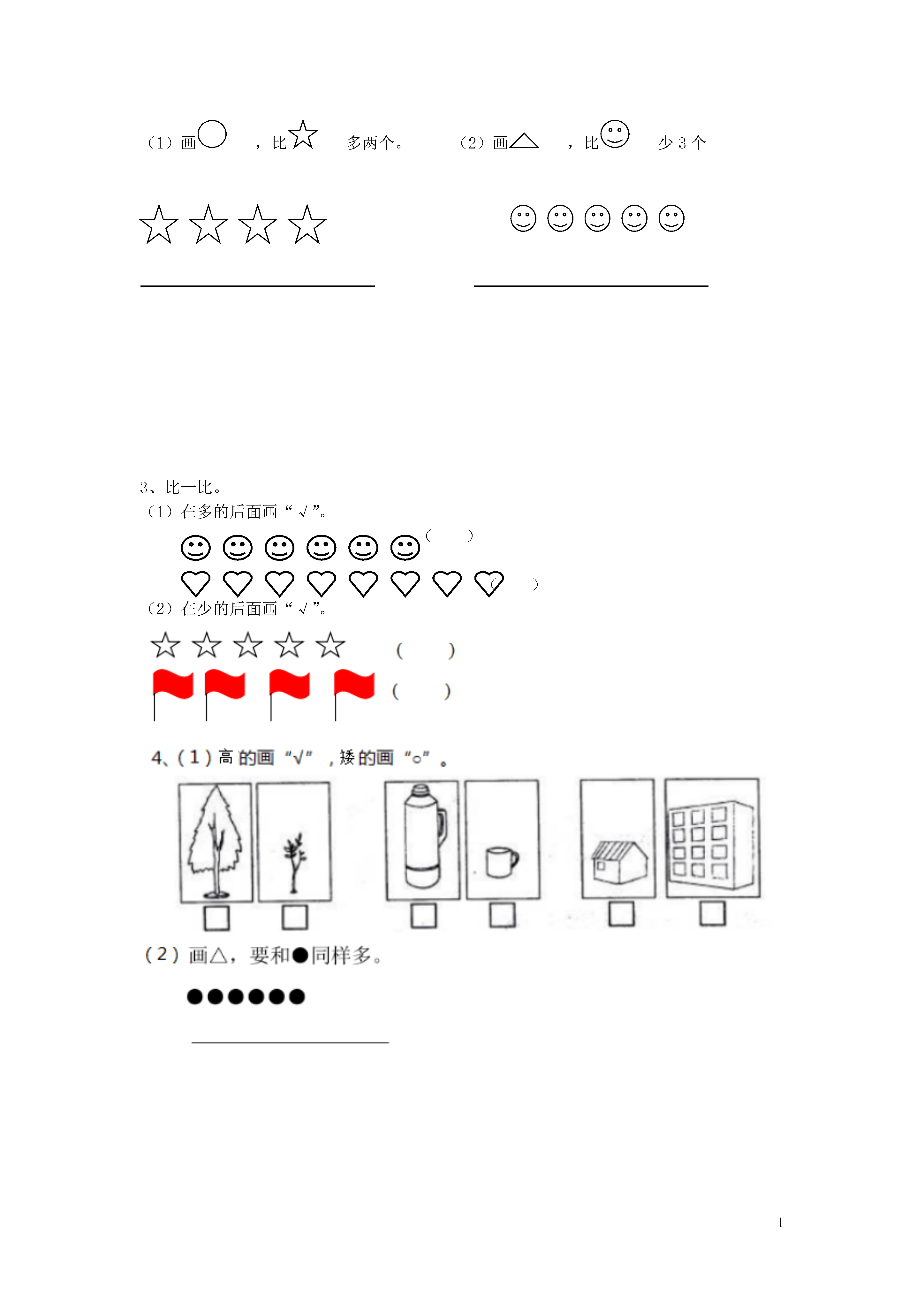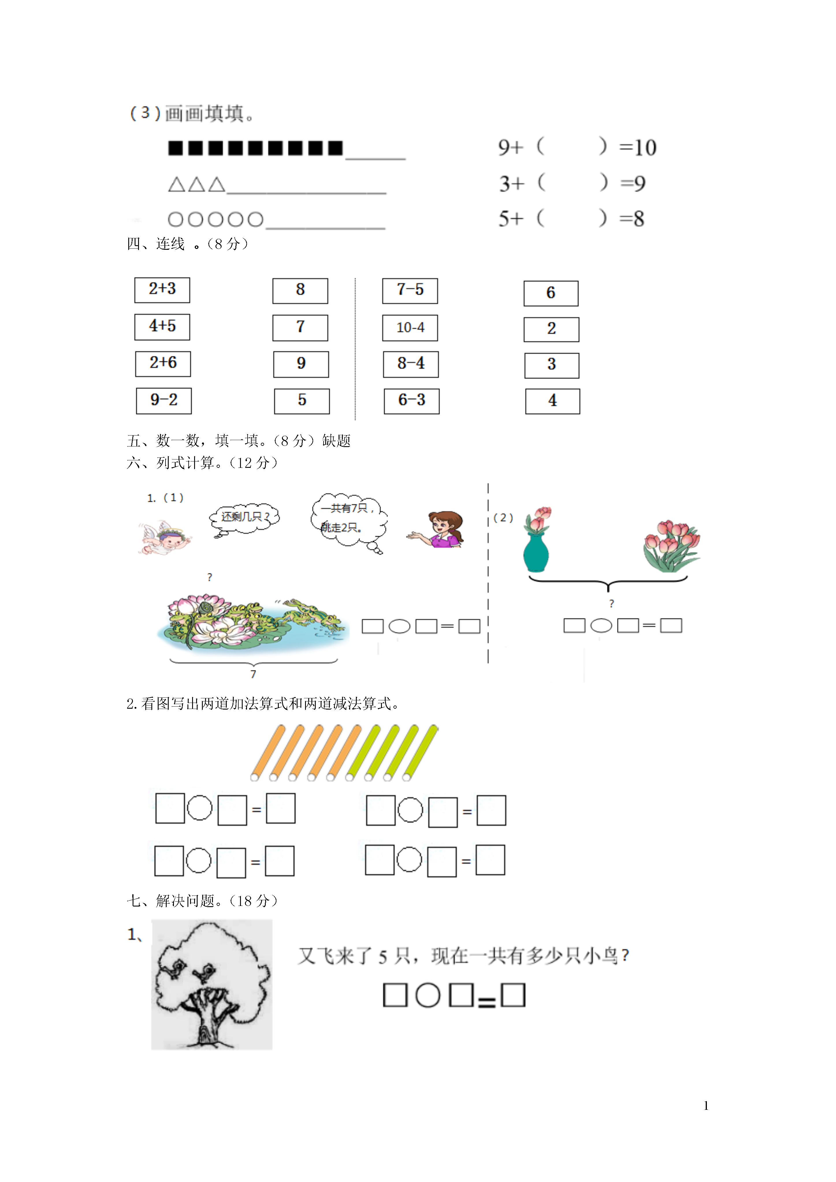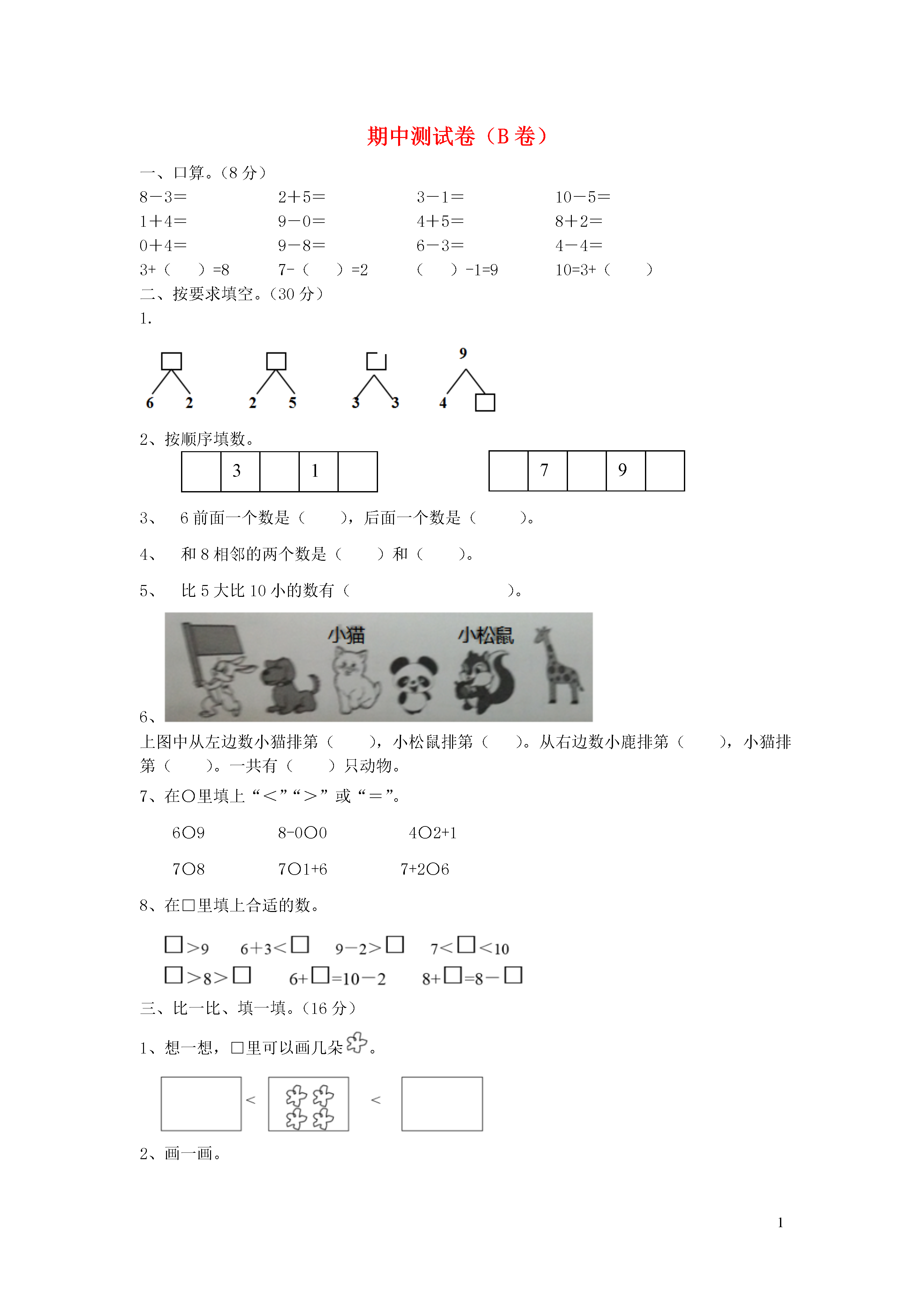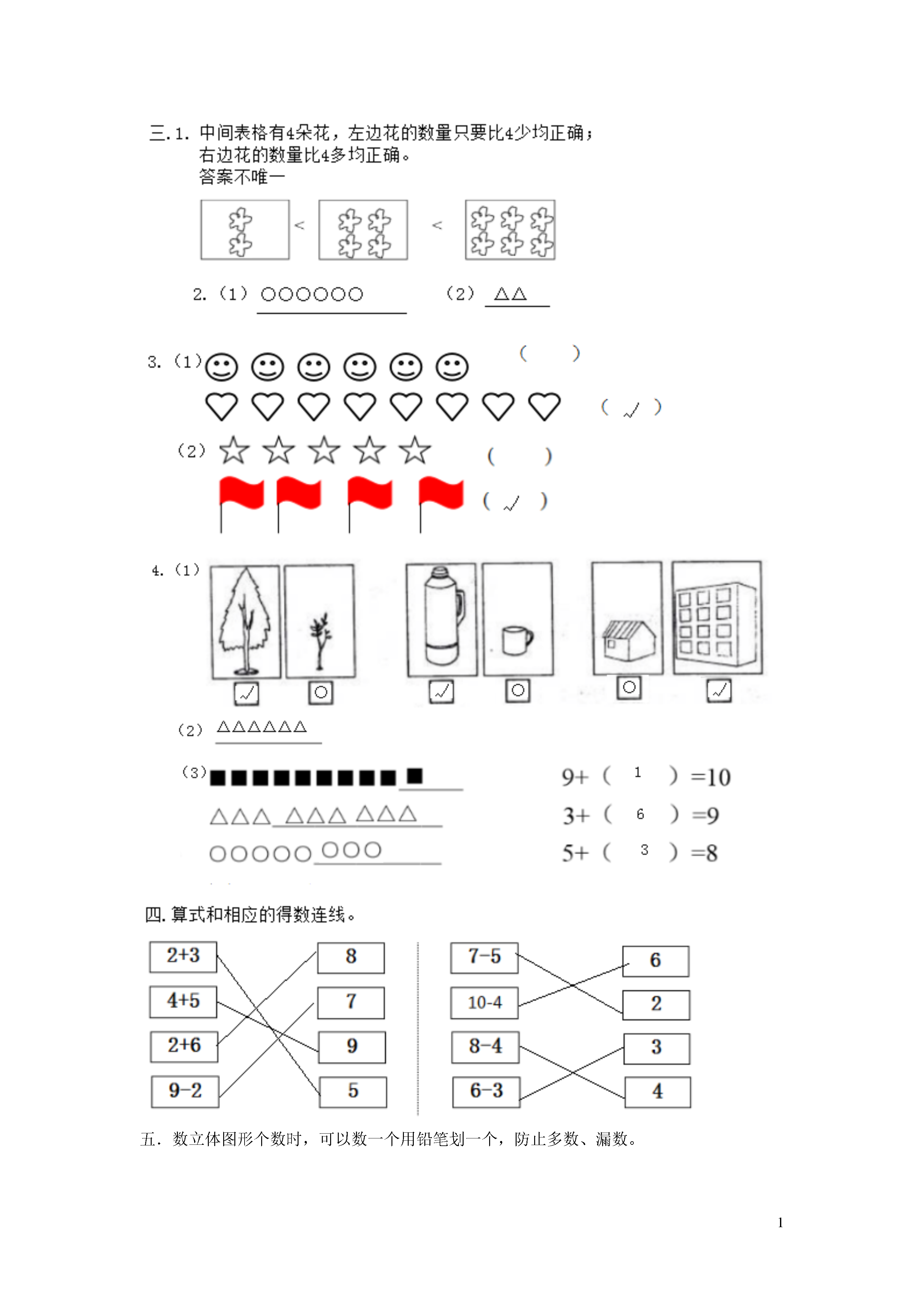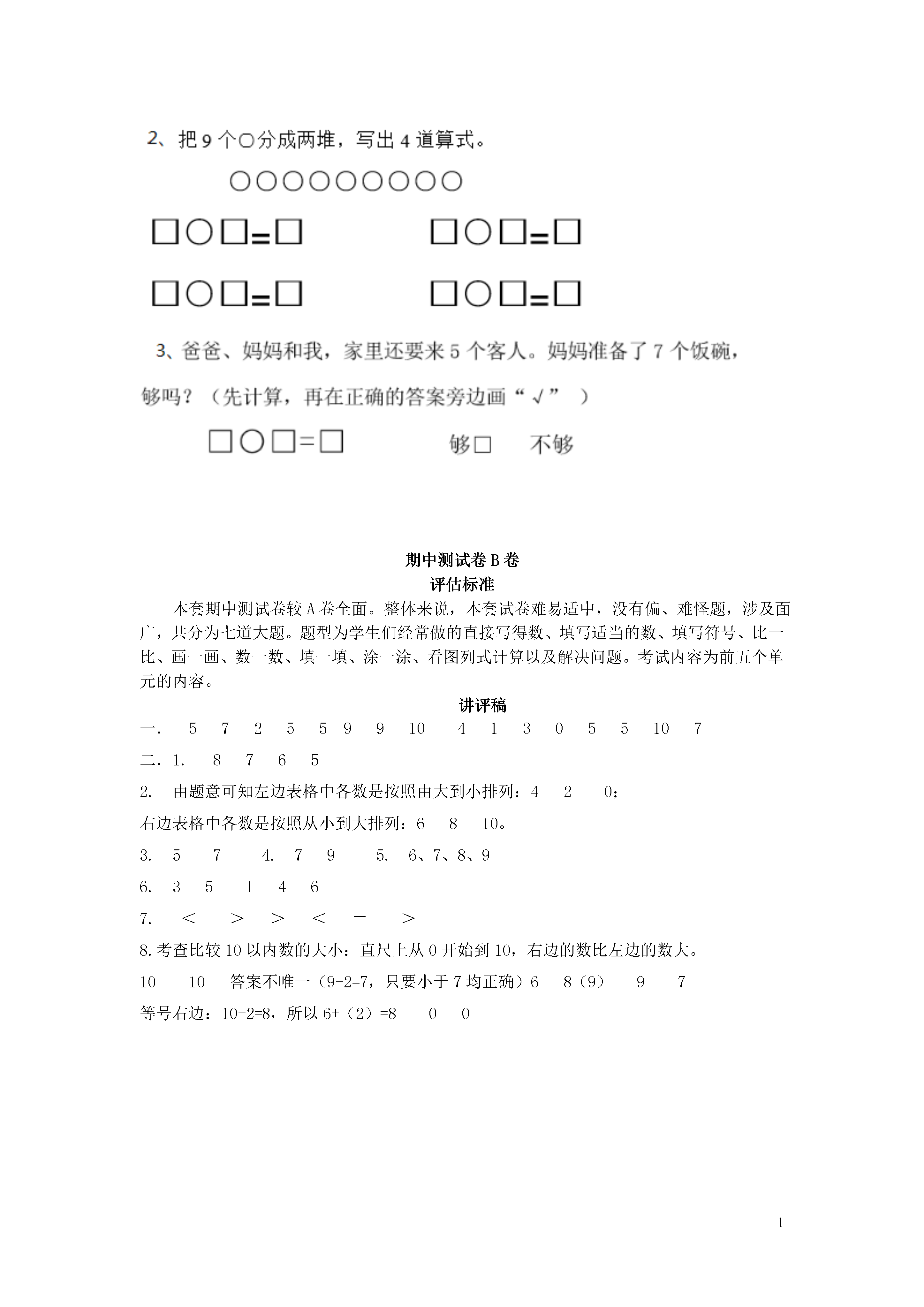 1期中测试卷(B卷)一、口算。(8分)8-3=2+5=3-1=10-5=1+4=9-0=4+5=8+2=0+4=9-8=6-3=4-4=3+()=87-()=2()-1=910=3+()按要求填空。(30分)1.2、按顺序填数。79316前面一个数是(),后面一个数是()。和8相邻的两个数是()和()。5、比5大比10小的数有()。6、上图中从左边数小猫排第(),小松鼠排第()。从右边数小鹿排第(),小猫排第()。一共有()只动物。7、在〇里填上“<”“>”或“=”。6〇98-0〇04〇2+17〇87〇1+67+2〇6在□里填上合适的数。三、比一比、填一填。(16分)1、想一想,□里可以画几朵。2、画一画。(1)画,比多两个。(2)画,比少3个3、比一比。(1)在多的后面画“√”。()()在少的后面画“√”。四、连线。(8分)数一数,填一填。(8分)缺题六、列式计算。(12分)2.看图写出两道加法算式和两道减法算式。解决问题。(18分)期中测试卷B卷评估标准本套期中测试卷较A卷全面。整体来说,本套试卷难易适中,没有偏、难怪题,涉及面广,共分为七道大题。题型为学生们经常做的直接写得数、填写适当的数、填写符号、比一比、画一画、数一数、填一填、涂一涂、看图列式计算以及解决问题。考试内容为前五个单元的内容。讲评稿一.572559910413055107二.1.87652.由题意可知左边表格中各数是按照由大到小排列:420;右边表格中各数是按照从小到大排列:6810。3.574.795.6、7、8、96.351467.<>><=>8.考查比较10以内数的大小:直尺上从0开始到10,右边的数比左边的数大。1010答案不唯一(9-2=7,只要小于7均正确)68(9)97等号右边:10-2=8,所以6+(2)=800五.数立体图形个数时,可以数一个用铅笔划一个,防止多数、漏数。六.1.(1)共有青蛙数量-跳走青蛙数量=还剩青蛙数量,列式为7-2=5。(2)求两部分数量之和,选择加法列式解答:2+5=7。2.橘色小棒数量+绿色小棒数量=小棒总数量;绿色小棒数量+橘色小棒数量=小棒总数量5+4=94+5=9小棒总数量-橘色小棒数量=绿色小棒数量;小棒总数量-绿色小棒数量=橘色小棒数量9-5=49-4=5七.1.树上小鸟数量+飞来小鸟数量=现在小鸟的总数量2+5=72.9个○分成两堆,是把9分解,答案不唯一,9分成6和3。列式:6+3=93+6=99-6=39-3=63.每个人用一个饭碗,3+5=88人需用8个碗,妈妈准备了7个饭碗,故不够。