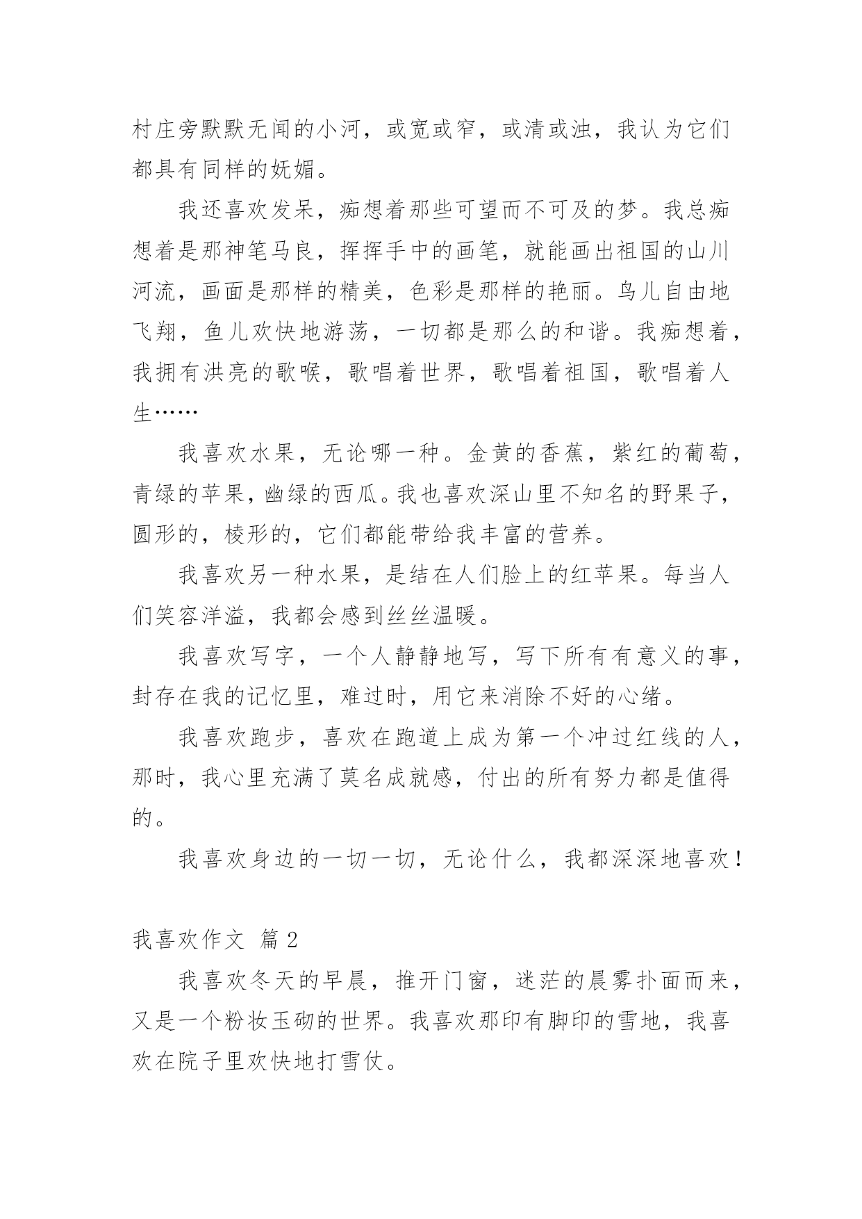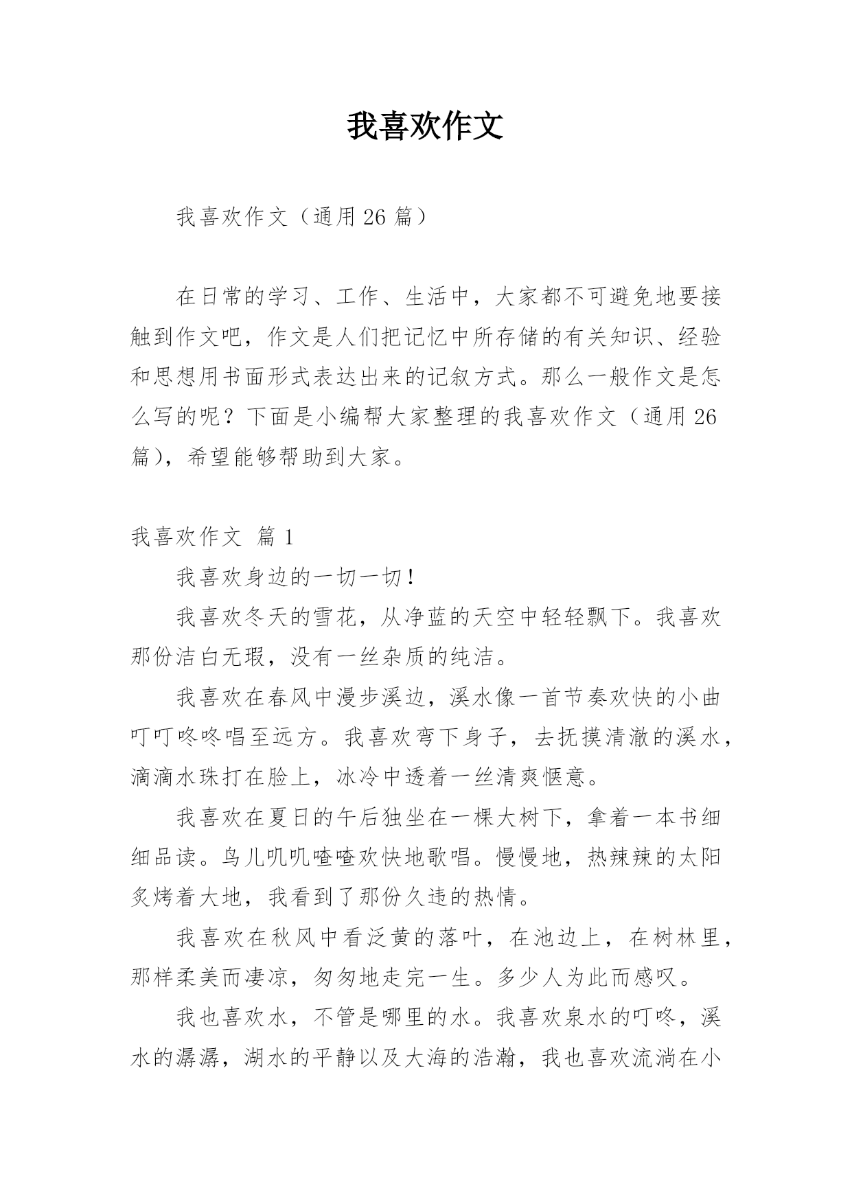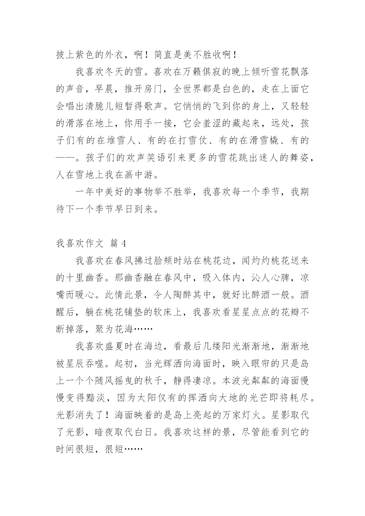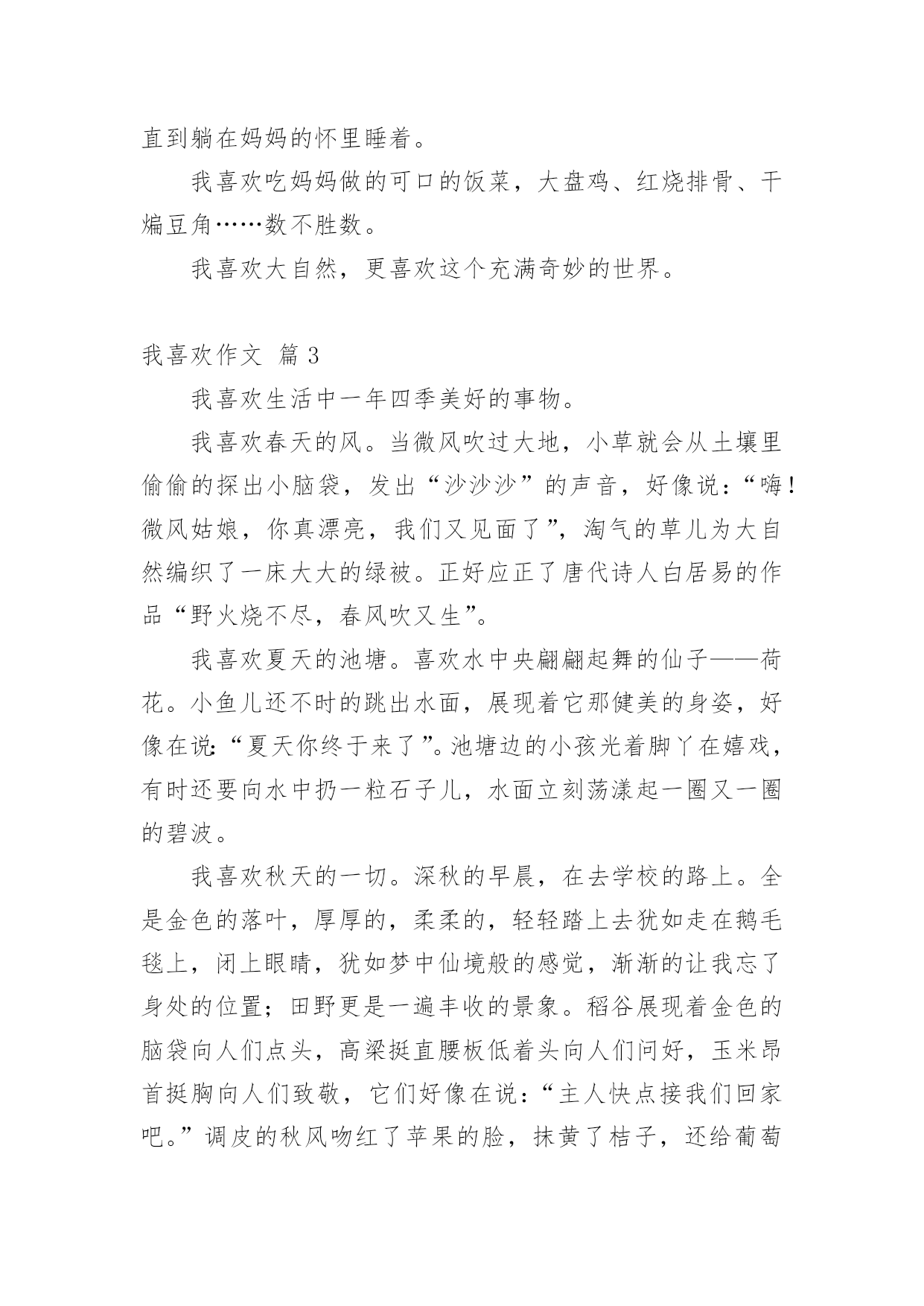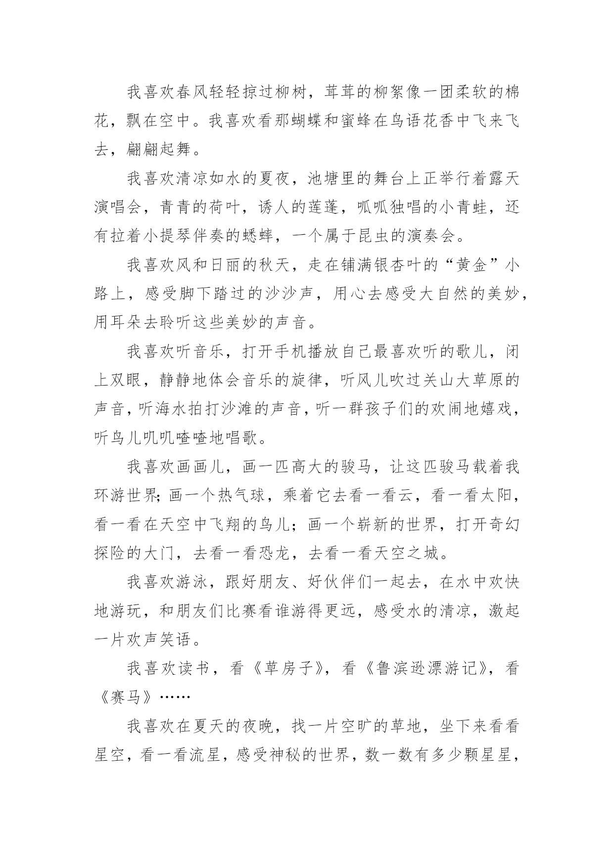 我喜欢作文 我喜欢作文(通用26篇)在日常的学习、工作、生活中,大家都不可避免地要接触到作文吧,作文是人们把记忆中所存储的有关知识、经验和思想用书面形式表达出来的记叙方式。那么一般作文是怎么写的呢?下面是小编帮大家整理的我喜欢作文(通用26篇),希望能够帮助到大家。我喜欢作文篇1我喜欢身边的一切一切!我喜欢冬天的雪花,从净蓝的天空中轻轻飘下。我喜欢那份洁白无瑕,没有一丝杂质的纯洁。我喜欢在春风中漫步溪边,溪水像一首节奏欢快的小曲叮叮咚咚唱至远方。我喜欢弯下身子,去抚摸清澈的溪水,滴滴水珠打在脸上,冰冷中透着一丝清爽惬意。我喜欢在夏日的午后独坐在一棵大树下,拿着一本书细细品读。鸟儿叽叽喳喳欢快地歌唱。慢慢地,热辣辣的太阳炙烤着大地,我看到了那份久违的热情。我喜欢在秋风中看泛黄的落叶,在池边上,在树林里,那样柔美而凄凉,匆匆地走完一生。多少人为此而感叹。我也喜欢水,不管是哪里的水。我喜欢泉水的叮咚,溪水的潺潺,湖水的平静以及大海的浩瀚,我也喜欢流淌在小村庄旁默默无闻的小河,或宽或窄,或清或浊,我认为它们都具有同样的妩媚。我还喜欢发呆,痴想着那些可望而不可及的梦。我总痴想着是那神笔马良,挥挥手中的画笔,就能画出祖国的山川河流,画面是那样的精美,色彩是那样的艳丽。鸟儿自由地飞翔,鱼儿欢快地游荡,一切都是那么的和谐。我痴想着,我拥有洪亮的歌喉,歌唱着世界,歌唱着祖国,歌唱着人生……我喜欢水果,无论哪一种。金黄的香蕉,紫红的葡萄,青绿的苹果,幽绿的西瓜。我也喜欢深山里不知名的野果子,圆形的,棱形的,它们都能带给我丰富的营养。我喜欢另一种水果,是结在人们脸上的红苹果。每当人们笑容洋溢,我都会感到丝丝温暖。我喜欢写字,一个人静静地写,写下所有有意义的事,封存在我的记忆里,难过时,用它来消除不好的心绪。我喜欢跑步,喜欢在跑道上成为第一个冲过红线的人,那时,我心里充满了莫名成就感,付出的所有努力都是值得的。我喜欢身边的一切一切,无论什么,我都深深地喜欢!我喜欢作文篇2我喜欢冬天的早晨,推开门窗,迷茫的晨雾扑面而来,又是一个粉妆玉砌的世界。我喜欢那印有脚印的雪地,我喜欢在院子里欢快地打雪仗。我喜欢春风轻轻掠过柳树,茸茸的柳絮像一团柔软的棉花,飘在空中。我喜欢看那蝴蝶和蜜蜂在鸟语花香中飞来飞去,翩翩起舞。我喜欢清凉如水的夏夜,池塘里的舞台上正举行着露天演唱会,青青的荷叶,诱人的莲蓬,呱呱独唱的小青蛙,还有拉着小提琴伴奏的蟋蟀,一个属于昆虫的演奏会。我喜欢风和日丽的秋天,走在铺满银杏叶的“黄金”小路上,感受脚下踏过的沙沙声,用心去感受大自然的美妙,用耳朵去聆听这些美妙的声音。我喜欢听音乐,打开手机播放自己最喜欢听的歌儿,闭上双眼,静静地体会音乐的旋律,听风儿吹过关山大草原的声音,听海水拍打沙滩的声音,听一群孩子们的欢闹地嬉戏,听鸟儿叽叽喳喳地唱歌。我喜欢画画儿,画一匹高大的骏马,让这匹骏马载着我环游世界;画一个热气球,乘着它去看一看云,看一看太阳,看一看在天空中飞翔的鸟儿;画一个崭新的世界,打开奇幻探险的大门,去看一看恐龙,去看一看天空之城。我喜欢游泳,跟好朋友、好伙伴们一起去,在水中欢快地游玩,和朋友们比赛看谁游得更远,感受水的清凉,激起一片欢声笑语。我喜欢读书,看《草房子》,看《鲁滨逊漂游记》,看《赛马》……我喜欢在夏天的夜晚,找一片空旷的草地,坐下来看看星空,看一看流星,感受神秘的世界,数一数有多少颗星星,直到躺在妈妈的怀里睡着。我喜欢吃妈妈做的可口的饭菜,大盘鸡、红烧排骨、干煸豆角……数不胜数。我喜欢大自然,更喜欢这个充满奇妙的世界。我喜欢作文篇3我喜欢生活中一年四季美好的事物。我喜欢春天的风。当微风吹过大地,小草就会从土壤里偷偷的探出小脑袋,发出“沙沙沙”的声音,好像说:“嗨!微风姑娘,你真漂亮,我们又见面了”,淘气的草儿为大自然编织了一床大大的绿被。正好应正了唐代诗人白居易的作品“野火烧不尽,春风吹又生”。我喜欢夏天的池塘。喜欢水中央翩翩起舞的仙子——荷花。小鱼儿还不时的跳出水面,展现着它那健美的身姿,好像在说:“夏天你终于来了”。池塘边的小孩光着脚丫在嬉戏,有时还要向水中扔一粒石子儿,水面立刻荡漾起一圈又一圈的碧波。我喜欢秋天的一切。深秋的早晨,在去学校的路上。全是金色的落叶,厚厚的,柔柔的,轻轻踏上去犹如走在鹅毛毯上,闭上眼睛,犹如梦中仙境般的感觉,渐渐的让我忘了身处的位置;田野更是一遍丰收的景象。稻谷展现着金色的脑袋向人们点头,高梁挺直腰板低着头向人们问好,玉米昂首挺胸向人们致敬,它们好像在说:“主人快点接我们回家吧。”调皮的秋风吻红了苹果的脸,抹黄了桔子,还给葡萄披上紫色的外衣,啊!简直是美不胜收啊!我喜欢冬天的雪。喜欢在万籁俱寂的晚上倾听雪花飘落的声音,早晨,推开房门,全世界都是白色的,走在上面它会唱出清脆儿短暂得歌声。它悄悄的