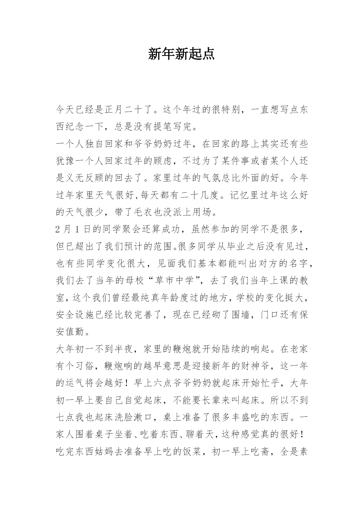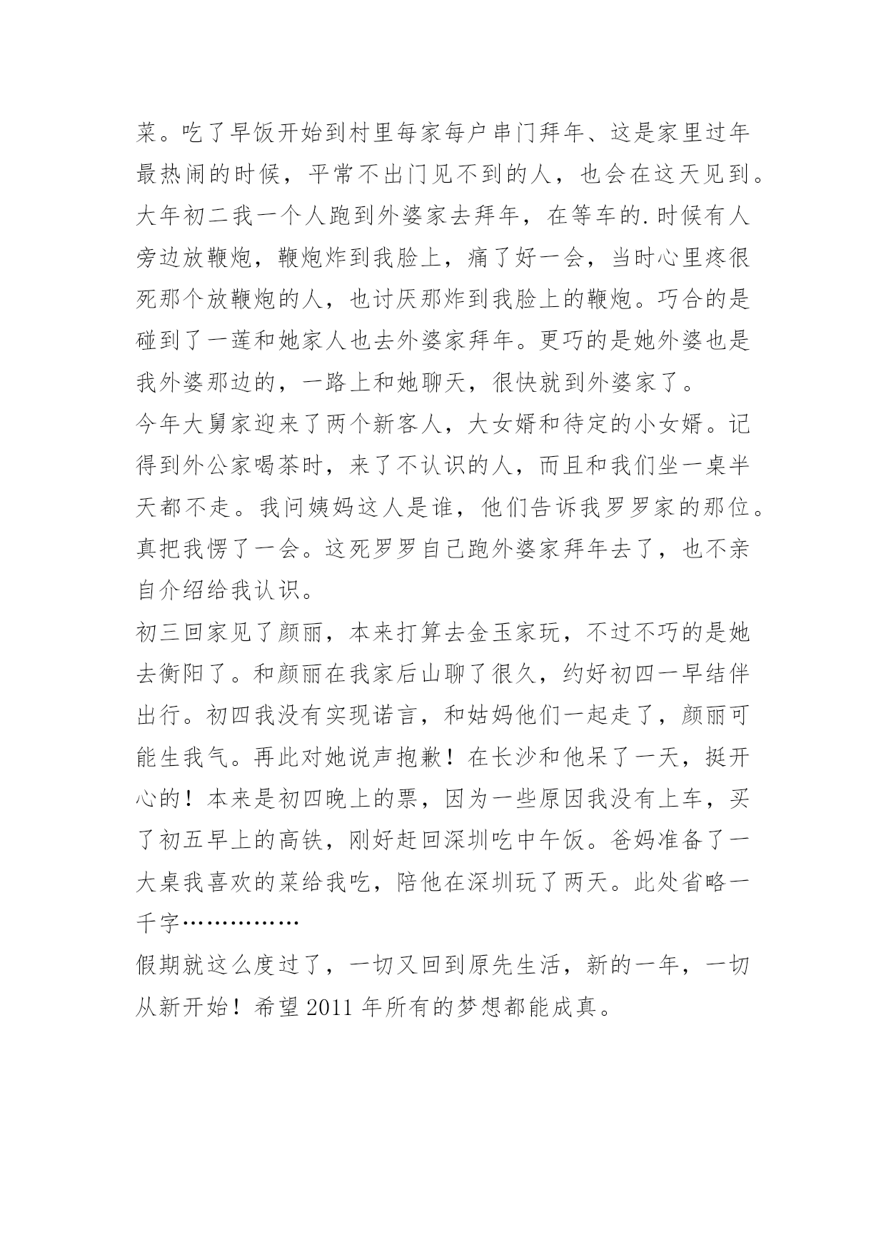 新年新起点 今天已经是正月二十了。这个年过的很特别,一直想写点东西纪念一下,总是没有提笔写完。一个人独自回家和爷爷奶奶过年,在回家的路上其实还有些犹豫一个人回家过年的顾虑,不过为了某件事或者某个人还是义无反顾的回去了。家里过年的气氛总比外面的好。今年过年家里天气很好,每天都有二十几度。记忆里过年这么好的天气很少,带了毛衣也没派上用场。2月1日的同学聚会还算成功,虽然参加的同学不是很多,但已超出了我们预计的范围。很多同学从毕业之后没有见过,也有些同学变化很大,见面我们基本都能叫出对方的名字,我们去了当年的母校“草市中学”,去了我们当年上课的教室,这个我们曾经最纯真年龄度过的地方,学校的变化挺大,安全设施已经比较完善了,现在已经砌了围墙,门口还有保安值勤。大年初一不到半夜,家里的鞭炮就开始陆续的响起。在老家有个习俗,鞭炮响的越早意思是迎接新年的财神爷,这一年的运气将会越好!早上六点爷爷奶奶就起床开始忙乎,大年初一早上要自己自觉起床,不能要长辈来叫起床。所以不到七点我也起床洗脸漱口,桌上准备了很多丰盛吃的东西。一家人围着桌子坐着、吃着东西、聊着天,这种感觉真的很好!吃完东西姑妈去准备早上吃的饭菜,初一早上吃斋,全是素菜。吃了早饭开始到村里每家每户串门拜年、这是家里过年最热闹的时候,平常不出门见不到的人,也会在这天见到。大年初二我一个人跑到外婆家去拜年,在等车的.时候有人旁边放鞭炮,鞭炮炸到我脸上,痛了好一会,当时心里疼很死那个放鞭炮的人,也讨厌那炸到我脸上的鞭炮。巧合的是碰到了一莲和她家人也去外婆家拜年。更巧的是她外婆也是我外婆那边的,一路上和她聊天,很快就到外婆家了。今年大舅家迎来了两个新客人,大女婿和待定的小女婿。记得到外公家喝茶时,来了不认识的人,而且和我们坐一桌半天都不走。我问姨妈这人是谁,他们告诉我罗罗家的那位。真把我愣了一会。这死罗罗自己跑外婆家拜年去了,也不亲自介绍给我认识。初三回家见了颜丽,本来打算去金玉家玩,不过不巧的是她去衡阳了。和颜丽在我家后山聊了很久,约好初四一早结伴出行。初四我没有实现诺言,和姑妈他们一起走了,颜丽可能生我气。再此对她说声抱歉!在长沙和他呆了一天,挺开心的!本来是初四晚上的票,因为一些原因我没有上车,买了初五早上的高铁,刚好赶回深圳吃中午饭。爸妈准备了一大桌我喜欢的菜给我吃,陪他在深圳玩了两天。此处省略一千字……………假期就这么度过了,一切又回到原先生活,新的一年,一切从新开始!希望2011年所有的梦想都能成真。【散文概念】散文是指以文字为创作、审美对象的文学艺术体裁,是文学中的一种体裁形式。六朝以来,为区别于韵文、骈文,而把凡是不押韵、不重排偶的散体文章,概称散文。随着文学概念的演变和文学体裁的发展,散文的概念也时有变化,在某些历史时期又将小说与其他抒情、记事的文学作品统称为散文,以区别于讲求韵律的诗歌。现代散文是指除小说、诗歌、戏剧等文学体裁之外的其他文学作品。其本身按其内容和形式的不同,又可分为杂文、小品、随笔等。散文形散而神不散,有一个明确的主旨贯穿全文。【散文特点】短小优美,生动有趣。它的历史可以追溯到甲骨文,是和诗歌、戏剧、小说并列的文学体裁;它包括政论、史论、传记、游记、书信、日记、奏疏、小品、表、序等各体论说、杂文,是语言艺术文学体裁的典范,并具有很高的审美价值,在长期流传过程中,它浇灌了各个时代的文学园地,也灌溉了历代文人,至今仍使人们受益。散文是“集诸美于一身”的文学体裁。文学是表达人生和传达思想感情的。通常来说,小说、诗歌、戏剧无论是在结构上,还是在格律、剪裁、对话等安排布局上,都有很严格的要求:而散文,却可以自由些,看起来只是不经意地抒写着一己的经历和感受,所表现的多是零星杂碎的片段人生。语言诗意优美。散文主要分叙事性散文、抒情散文、哲理散文、议论性散文。