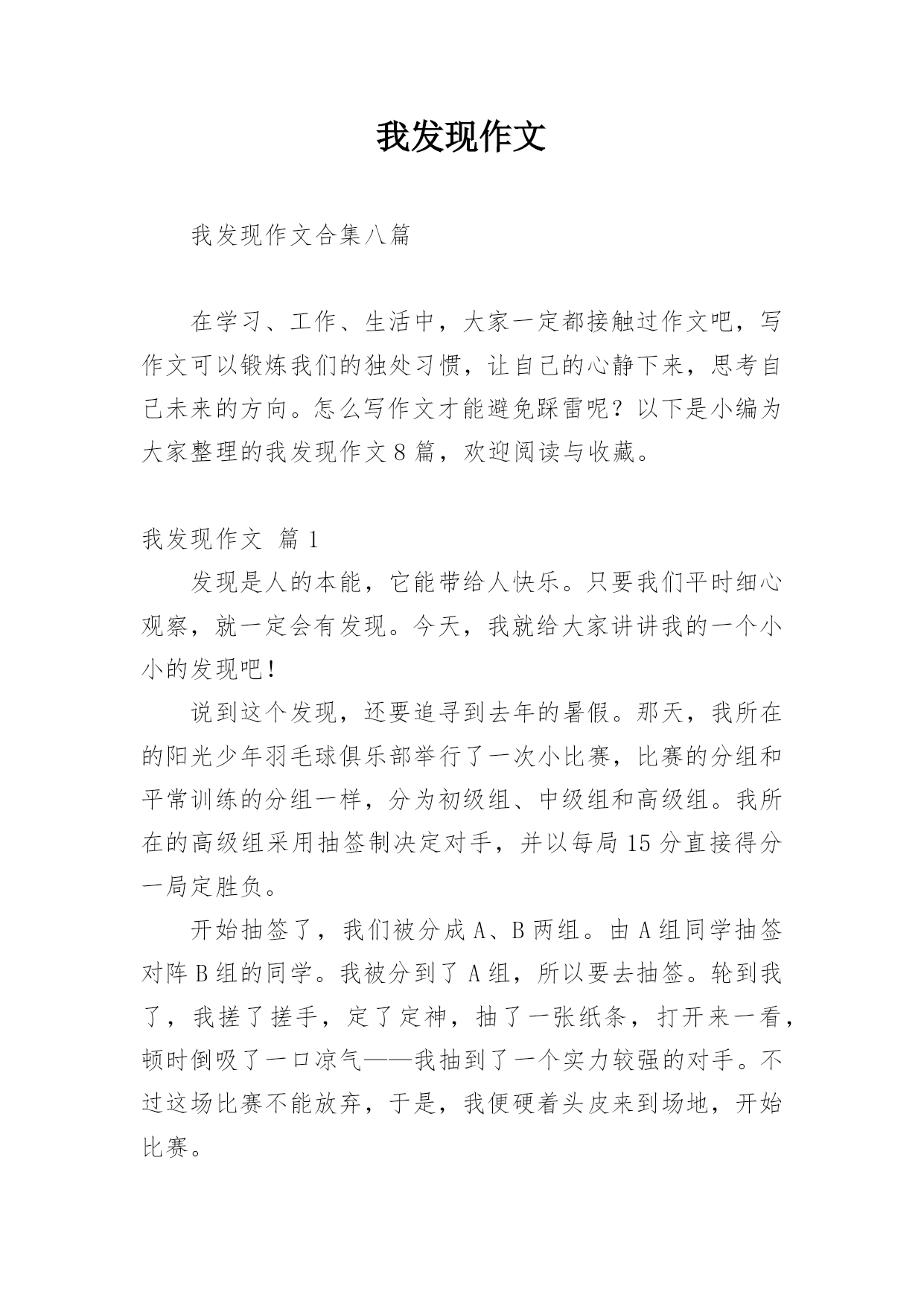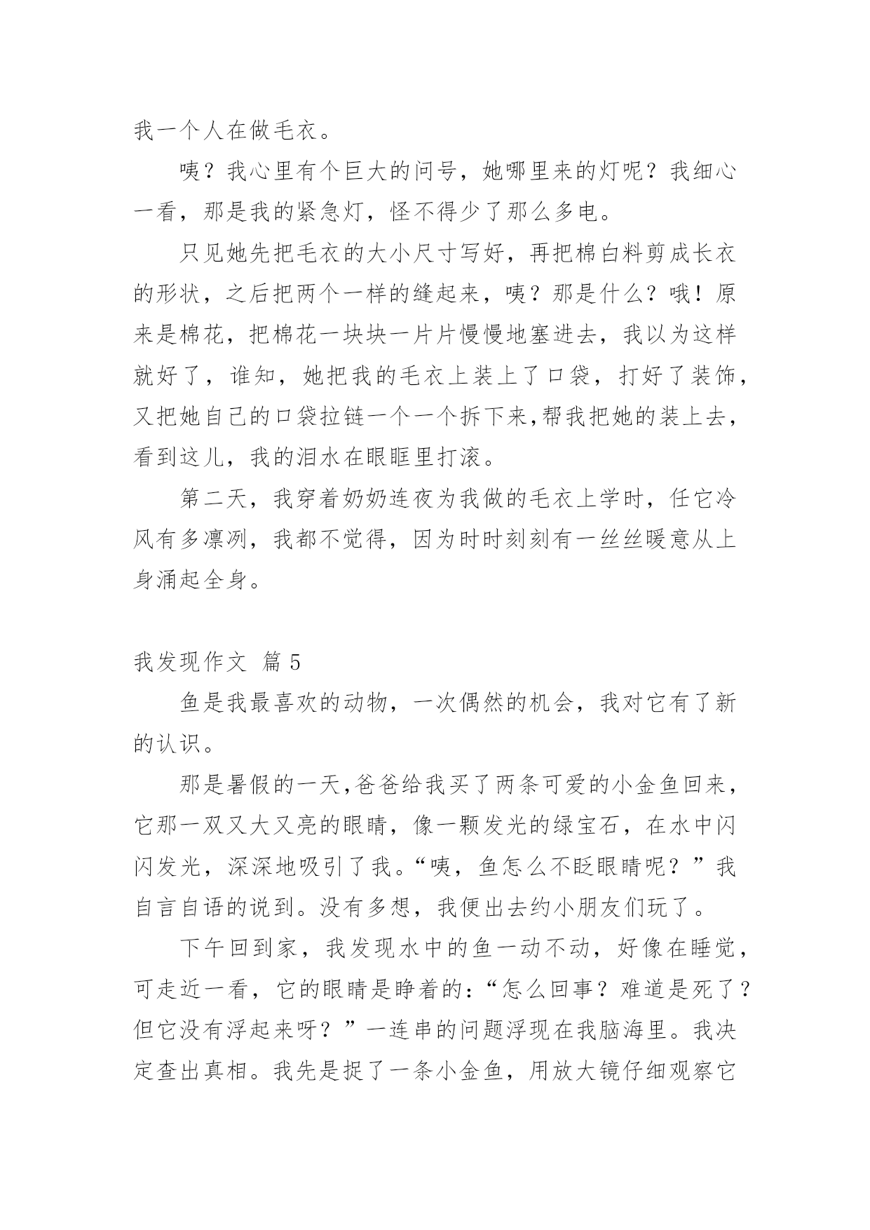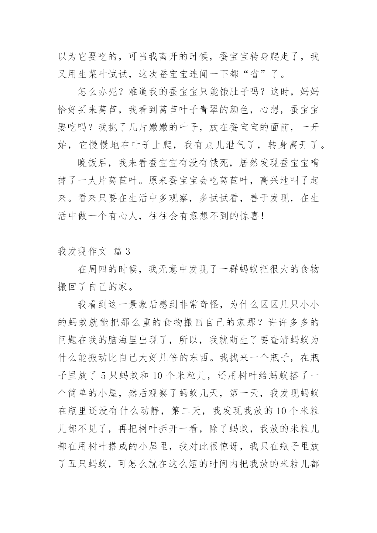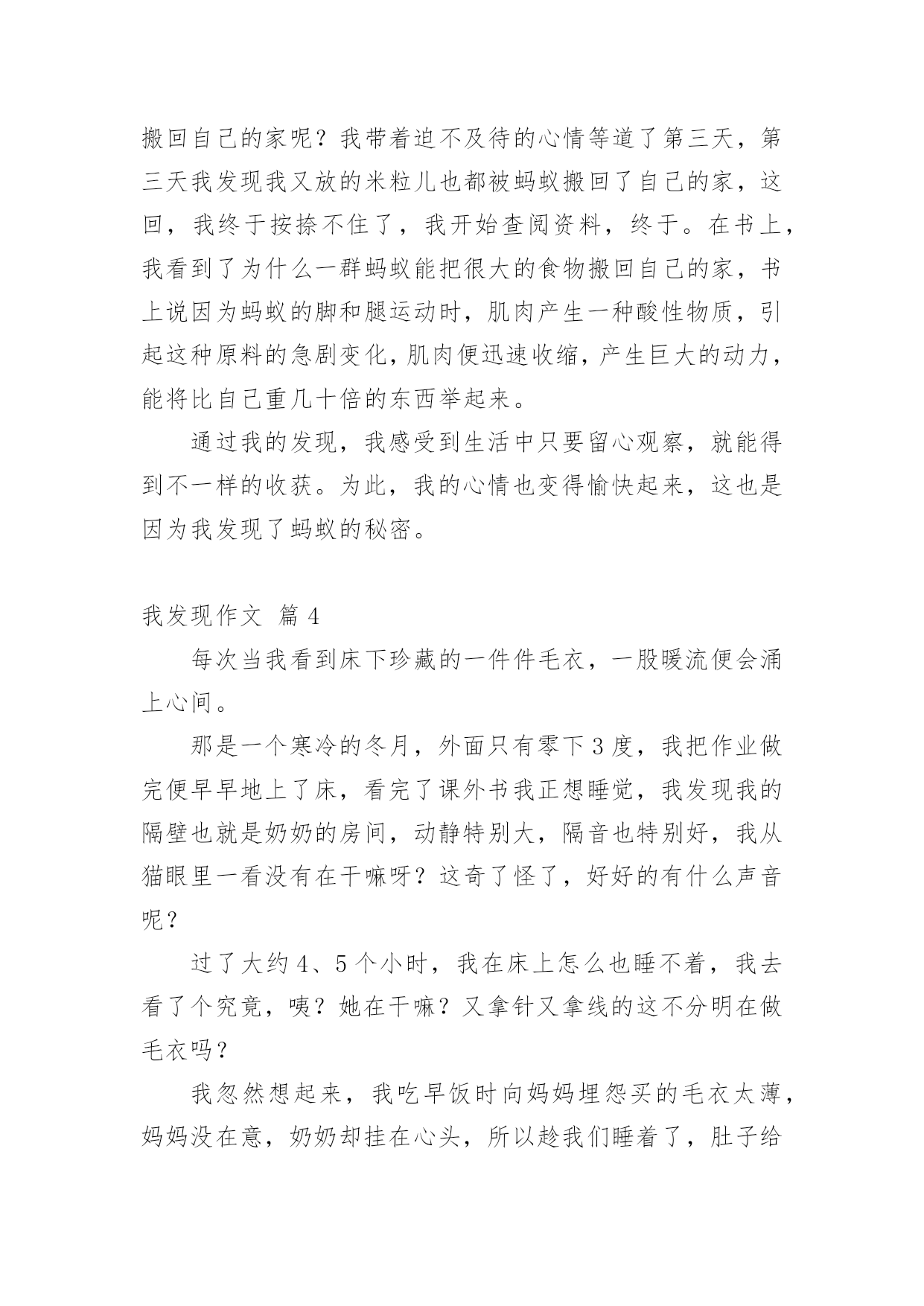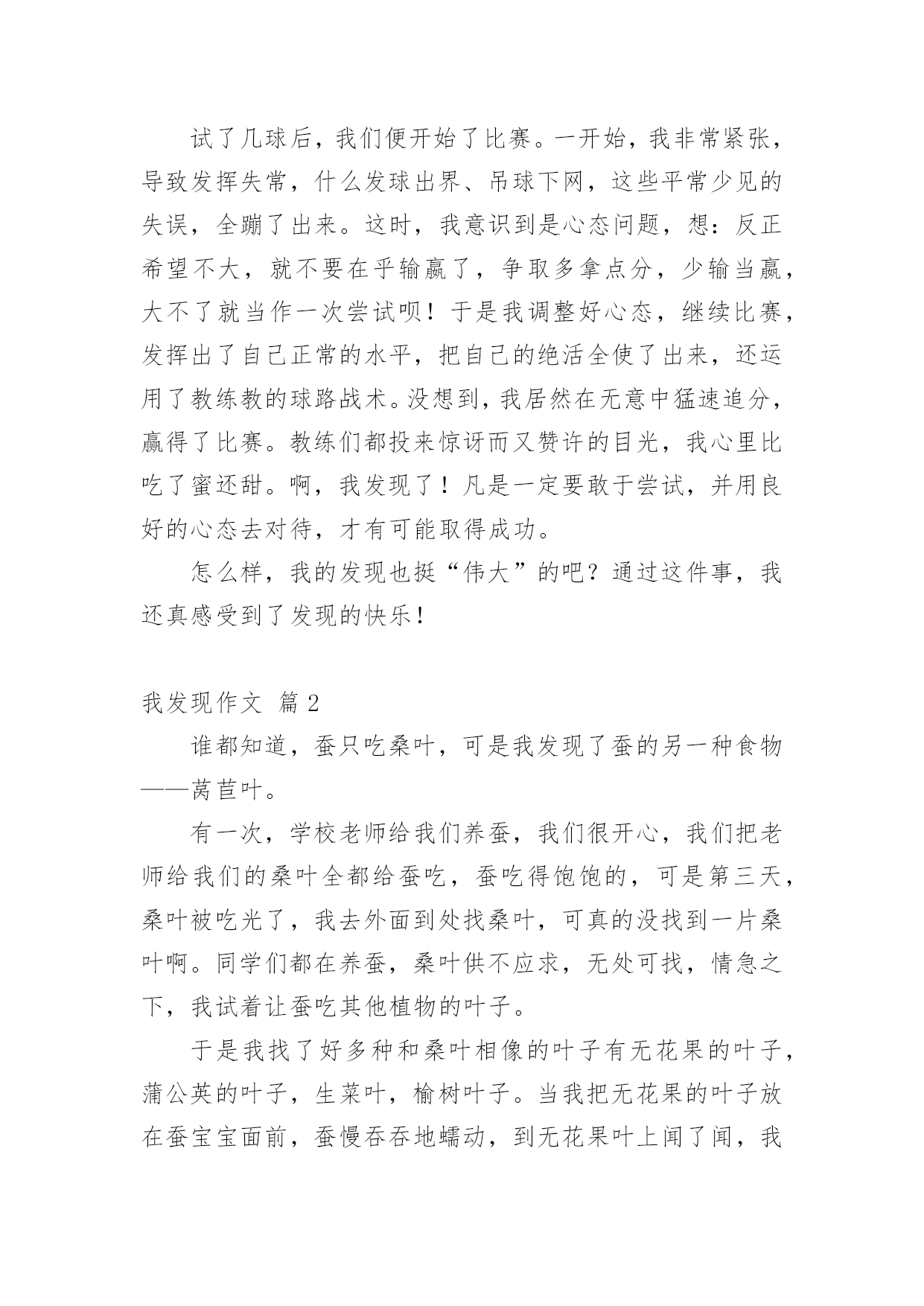 我发现作文 我发现作文合集八篇在学习、工作、生活中,大家一定都接触过作文吧,写作文可以锻炼我们的独处习惯,让自己的心静下来,思考自己未来的方向。怎么写作文才能避免踩雷呢?以下是小编为大家整理的我发现作文8篇,欢迎阅读与收藏。我发现作文篇1发现是人的本能,它能带给人快乐。只要我们平时细心观察,就一定会有发现。今天,我就给大家讲讲我的一个小小的发现吧!说到这个发现,还要追寻到去年的暑假。那天,我所在的阳光少年羽毛球俱乐部举行了一次小比赛,比赛的分组和平常训练的分组一样,分为初级组、中级组和高级组。我所在的高级组采用抽签制决定对手,并以每局15分直接得分一局定胜负。开始抽签了,我们被分成A、B两组。由A组同学抽签对阵B组的同学。我被分到了A组,所以要去抽签。轮到我了,我搓了搓手,定了定神,抽了一张纸条,打开来一看,顿时倒吸了一口凉气——我抽到了一个实力较强的对手。不过这场比赛不能放弃,于是,我便硬着头皮来到场地,开始比赛。试了几球后,我们便开始了比赛。一开始,我非常紧张,导致发挥失常,什么发球出界、吊球下网,这些平常少见的失误,全蹦了出来。这时,我意识到是心态问题,想:反正希望不大,就不要在乎输嬴了,争取多拿点分,少输当嬴,大不了就当作一次尝试呗!于是我调整好心态,继续比赛,发挥出了自己正常的水平,把自己的绝活全使了出来,还运用了教练教的球路战术。没想到,我居然在无意中猛速追分,赢得了比赛。教练们都投来惊讶而又赞许的目光,我心里比吃了蜜还甜。啊,我发现了!凡是一定要敢于尝试,并用良好的心态去对待,才有可能取得成功。怎么样,我的发现也挺“伟大”的吧?通过这件事,我还真感受到了发现的快乐!我发现作文篇2谁都知道,蚕只吃桑叶,可是我发现了蚕的另一种食物——莴苣叶。有一次,学校老师给我们养蚕,我们很开心,我们把老师给我们的桑叶全都给蚕吃,蚕吃得饱饱的,可是第三天,桑叶被吃光了,我去外面到处找桑叶,可真的没找到一片桑叶啊。同学们都在养蚕,桑叶供不应求,无处可找,情急之下,我试着让蚕吃其他植物的叶子。于是我找了好多种和桑叶相像的叶子有无花果的叶子,蒲公英的叶子,生菜叶,榆树叶子。当我把无花果的叶子放在蚕宝宝面前,蚕慢吞吞地蠕动,到无花果叶上闻了闻,我以为它要吃的,可当我离开的时候,蚕宝宝转身爬走了,我又用生菜叶试试,这次蚕宝宝连闻一下都“省”了。怎么办呢?难道我的蚕宝宝只能饿肚子吗?这时,妈妈恰好买来莴苣,我看到莴苣叶子青翠的颜色,心想,蚕宝宝要吃吗?我挑了几片嫩嫩的叶子,放在蚕宝宝的面前,一开始,它慢慢地在叶子上爬,我有点儿泄气了,转身离开了。晚饭后,我来看蚕宝宝有没有饿死,居然发现蚕宝宝啃掉了一大片莴苣叶。原来蚕宝宝会吃莴苣叶,高兴地叫了起来。看来只要在生活中多观察,多试试看,善于发现,在生活中做一个有心人,往往会有意想不到的惊喜!我发现作文篇3在周四的时候,我无意中发现了一群蚂蚁把很大的食物搬回了自己的家。我看到这一景象后感到非常奇怪,为什么区区几只小小的蚂蚁就能把那么重的食物搬回自己的家那?许许多多的问题在我的脑海里出现了,所以,我就萌生了要查清蚂蚁为什么能搬动比自己大好几倍的东西。我找来一个瓶子,在瓶子里放了5只蚂蚁和10个米粒儿,还用树叶给蚂蚁搭了一个简单的小屋,然后观察了蚂蚁几天,第一天,我发现蚂蚁在瓶里还没有什么动静,第二天,我发现我放的10个米粒儿都不见了,再把树叶拆开一看,除了蚂蚁,我放的米粒儿都在用树叶搭成的小屋里,我对此很惊讶,我只在瓶子里放了五只蚂蚁,可怎么就在这么短的时间内把我放的米粒儿都搬回自己的家呢?我带着迫不及待的心情等道了第三天,第三天我发现我又放的米粒儿也都被蚂蚁搬回了自己的家,这回,我终于按捺不住了,我开始查阅资料,终于。在书上,我看到了为什么一群蚂蚁能把很大的食物搬回自己的家,书上说因为蚂蚁的脚和腿运动时,肌肉产生一种酸性物质,引起这种原料的急剧变化,肌肉便迅速收缩,产生巨大的动力,能将比自己重几十倍的东西举起来。通过我的发现,我感受到生活中只要留心观察,就能得到不一样的收获。为此,我的心情也变得愉快起来,这也是因为我发现了蚂蚁的秘密。我发现作文篇4每次当我看到床下珍藏的一件件毛衣,一股暖流便会涌上心间。那是一个寒冷的冬月,外面只有零下3度,我把作业做完便早早地上了床,看完了课外书我正想睡觉,我发现我的隔壁也就是奶奶的房间,动静特别大,隔音也特别好,我从猫眼里一看没有在干嘛呀?这奇了怪了,好好的有什么声音呢?过了大约4、5个小时,我在床上怎么也睡不着,我去看了个究竟,咦?她在干嘛?又拿针又拿线的这不分明在做毛衣吗?我忽然想起来,我吃早饭时向妈妈埋怨买的毛衣太薄,妈妈没在意,奶奶却挂在心头,所以趁我们睡着了,肚子给我一个人在做毛衣。咦?我心里有个巨大的问号,她哪里来的灯呢?我细心一看,那是我的紧急灯,怪