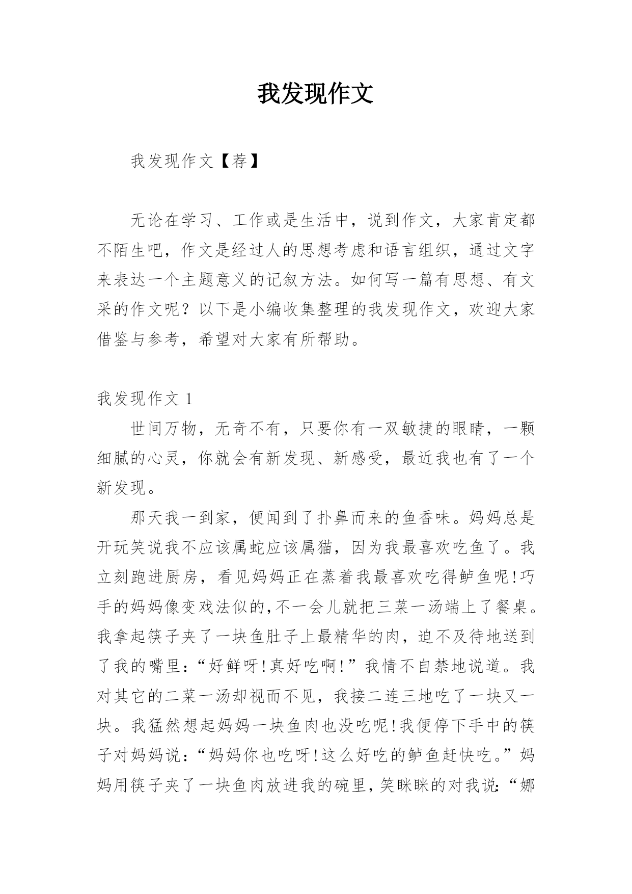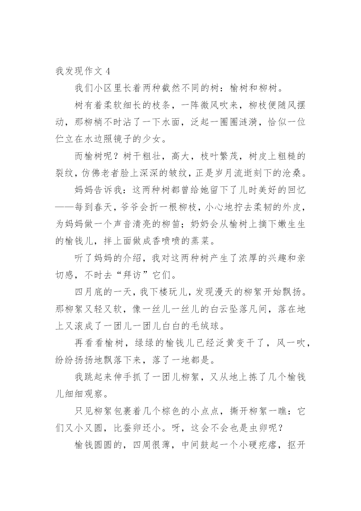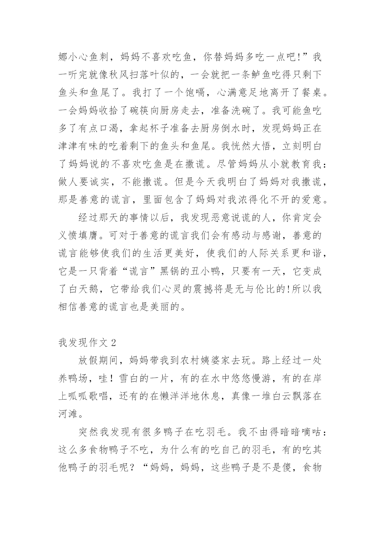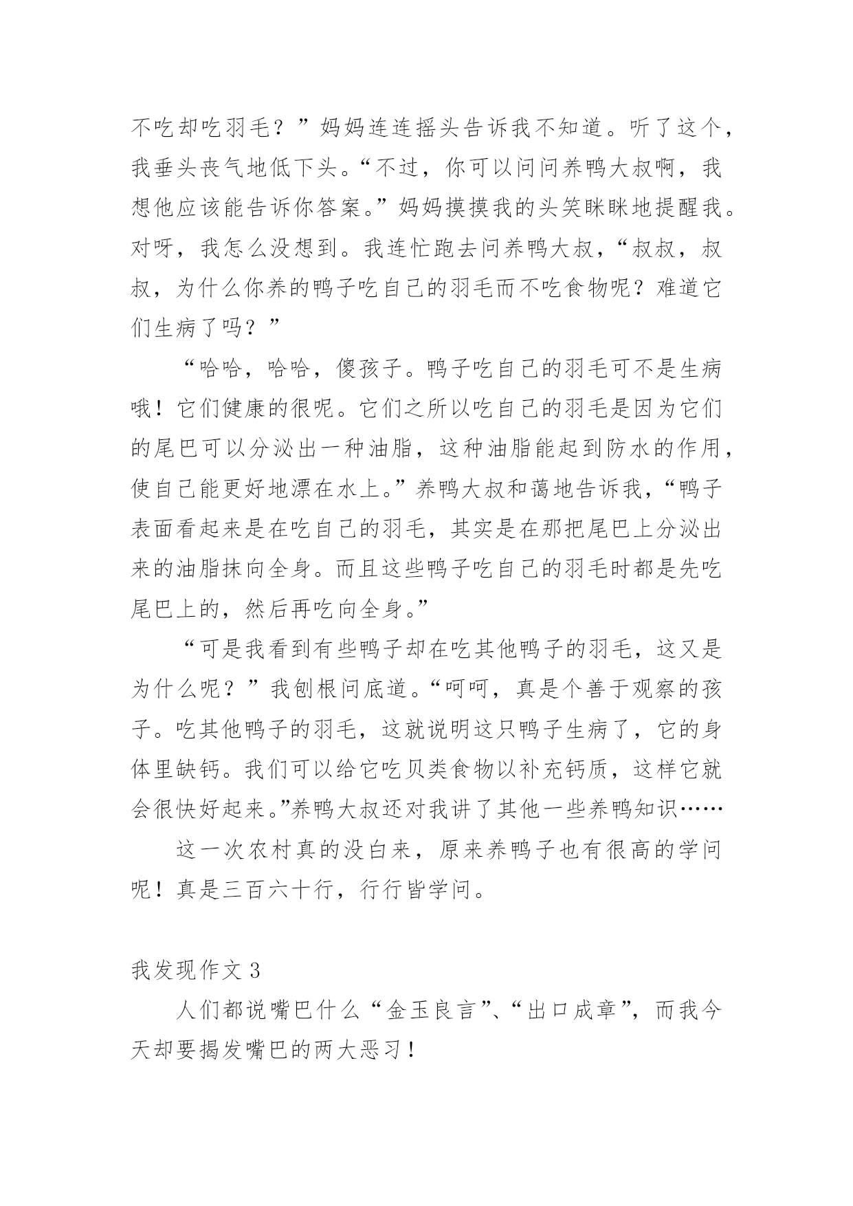 我发现作文 我发现作文【荐】无论在学习、工作或是生活中,说到作文,大家肯定都不陌生吧,作文是经过人的思想考虑和语言组织,通过文字来表达一个主题意义的记叙方法。如何写一篇有思想、有文采的作文呢?以下是小编收集整理的我发现作文,欢迎大家借鉴与参考,希望对大家有所帮助。我发现作文1世间万物,无奇不有,只要你有一双敏捷的眼睛,一颗细腻的心灵,你就会有新发现、新感受,最近我也有了一个新发现。那天我一到家,便闻到了扑鼻而来的鱼香味。妈妈总是开玩笑说我不应该属蛇应该属猫,因为我最喜欢吃鱼了。我立刻跑进厨房,看见妈妈正在蒸着我最喜欢吃得鲈鱼呢!巧手的妈妈像变戏法似的,不一会儿就把三菜一汤端上了餐桌。我拿起筷子夹了一块鱼肚子上最精华的肉,迫不及待地送到了我的嘴里:“好鲜呀!真好吃啊!”我情不自禁地说道。我对其它的二菜一汤却视而不见,我接二连三地吃了一块又一块。我猛然想起妈妈一块鱼肉也没吃呢!我便停下手中的筷子对妈妈说:“妈妈你也吃呀!这么好吃的鲈鱼赶快吃。”妈妈用筷子夹了一块鱼肉放进我的碗里,笑眯眯的对我说:“娜娜小心鱼刺,妈妈不喜欢吃鱼,你替妈妈多吃一点吧!”我一听完就像秋风扫落叶似的,一会就把一条鲈鱼吃得只剩下鱼头和鱼尾了。我打了一个饱嗝,心满意足地离开了餐桌。一会妈妈收拾了碗筷向厨房走去,准备洗碗了。我可能鱼吃多了有点口渴,拿起杯子准备去厨房倒水时,发现妈妈正在津津有味的吃着剩下的鱼头和鱼尾。我恍然大悟,立刻明白了妈妈说的不喜欢吃鱼是在撒谎。尽管妈妈从小就教育我:做人要诚实,不能撒谎。但是今天我明白了妈妈对我撒谎,那是善意的谎言,里面包含了妈妈对我浓得化不开的爱意。经过那天的事情以后,我发现恶意说谎的人,你肯定会义愤填膺。可对于善意的谎言我们会有感动与感谢,善意的谎言能够使我们的生活更美好,使我们的人际关系更和谐,它是一只背着“谎言”黑锅的丑小鸭,只要有一天,它变成了白天鹅,它带给我们心灵的震撼将是无与伦比的!所以我相信善意的谎言也是美丽的。我发现作文2放假期间,妈妈带我到农村姨婆家去玩。路上经过一处养鸭场,哇!雪白的一片,有的在水中悠悠慢游,有的在岸上呱呱歌唱,还有的在懒洋洋地休息,真像一堆白云飘落在河滩。突然我发现有很多鸭子在吃羽毛。我不由得暗暗嘀咕:这么多食物鸭子不吃,为什么有的吃自己的羽毛,有的吃其他鸭子的羽毛呢?“妈妈,妈妈,这些鸭子是不是傻,食物不吃却吃羽毛?”妈妈连连摇头告诉我不知道。听了这个,我垂头丧气地低下头。“不过,你可以问问养鸭大叔啊,我想他应该能告诉你答案。”妈妈摸摸我的头笑眯眯地提醒我。对呀,我怎么没想到。我连忙跑去问养鸭大叔,“叔叔,叔叔,为什么你养的鸭子吃自己的羽毛而不吃食物呢?难道它们生病了吗?”“哈哈,哈哈,傻孩子。鸭子吃自己的羽毛可不是生病哦!它们健康的很呢。它们之所以吃自己的羽毛是因为它们的尾巴可以分泌出一种油脂,这种油脂能起到防水的作用,使自己能更好地漂在水上。”养鸭大叔和蔼地告诉我,“鸭子表面看起来是在吃自己的羽毛,其实是在那把尾巴上分泌出来的油脂抹向全身。而且这些鸭子吃自己的羽毛时都是先吃尾巴上的,然后再吃向全身。”“可是我看到有些鸭子却在吃其他鸭子的羽毛,这又是为什么呢?”我刨根问底道。“呵呵,真是个善于观察的孩子。吃其他鸭子的羽毛,这就说明这只鸭子生病了,它的身体里缺钙。我们可以给它吃贝类食物以补充钙质,这样它就会很快好起来。”养鸭大叔还对我讲了其他一些养鸭知识……这一次农村真的没白来,原来养鸭子也有很高的学问呢!真是三百六十行,行行皆学问。我发现作文3人们都说嘴巴什么“金玉良言”、“出口成章”,而我今天却要揭发嘴巴的两大恶习!先说说“祸从口出”吧,因为一句话可能失去了一个朋友,也可能因为一句话自己的前途变得崎岖坎坷,也可能因为一句话招来了杀身之祸等等。比如,某某笑嘻嘻地对一个脾气不怎么好的同学说:“我告诉你,他(一个好朋友)说你是从神经病医院里逃出来的!你快去殴他吧!”那个同学说:“什么!气死我了!!!”说着,就露出拳头,准备去揍。那个同学挨揍时,某某在一旁窃窃地笑到。那个同学看见了,便狠狠地说:“我跟你绝交了!”就这样,某某因为一句话而失去了一个朋友。这是嘴巴的“一号特大罪行”!再说说“病从口入”吧,随着社会的进步人们的卫生习惯逐渐形成,可另一种无形的杀手却悄然形成——因环境污染造成的有污染的食品。一天,小主人手中紧紧攥着10元买练习本的钱。可在不远处,有一个专门卖油炸食品的小摊,嘴巴看见了直掉口水,一个劲地让小主人用买书钱买几串油炸食品吃,鼻子闻见了,也成了嘴巴的“同盟军”。最后,小主人拗不过嘴巴和鼻子,只好买了几串油炸食品。这不,小主人刚吃了一口,嘴巴倒吃得挺香的,你瞧,一个直流泪,一个直咳嗽。到了晚上,胃大哥翻江倒海,害得小主人输了好几天液。瞧,这就是嘴巴的“二号超级罪行”!做人