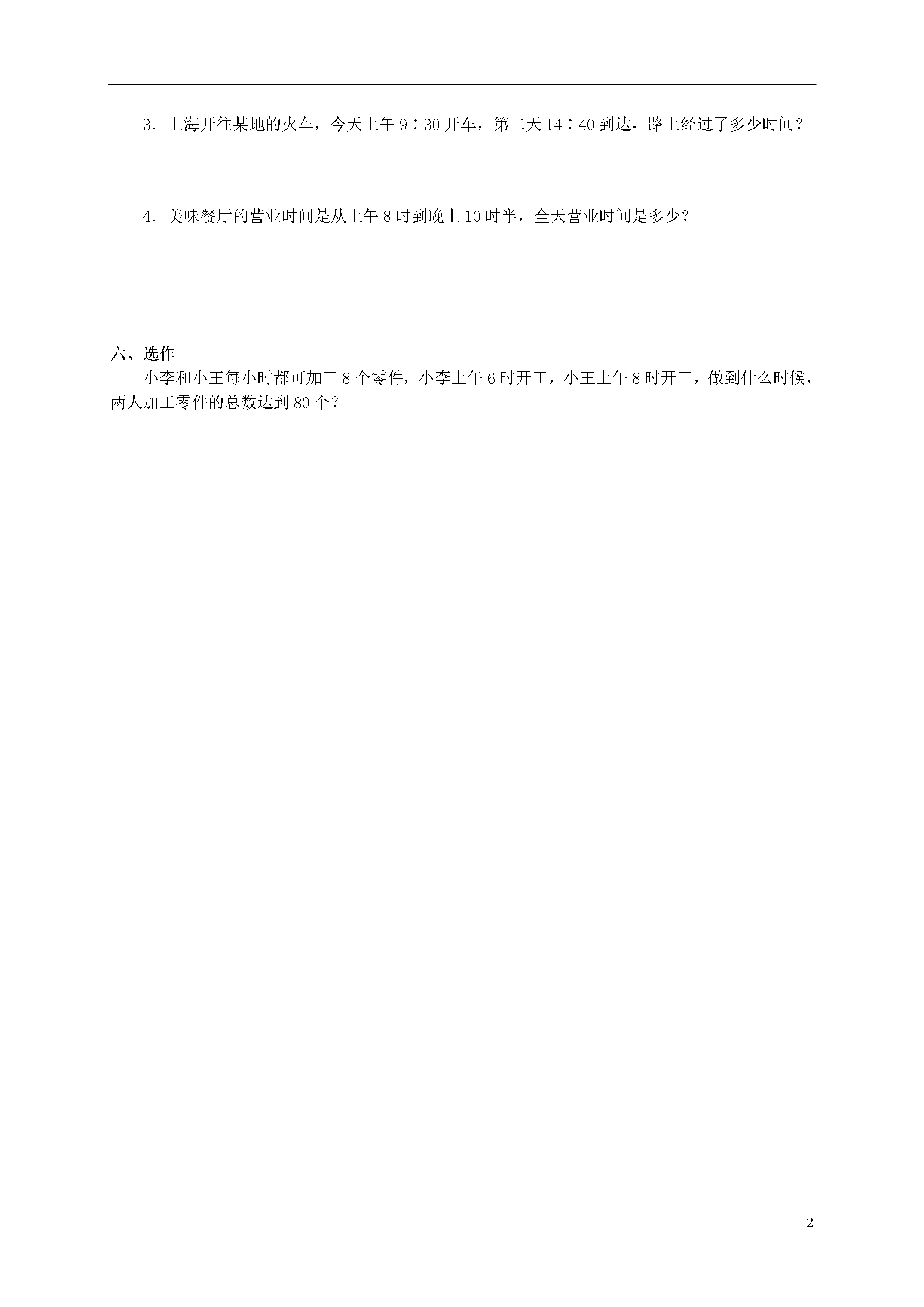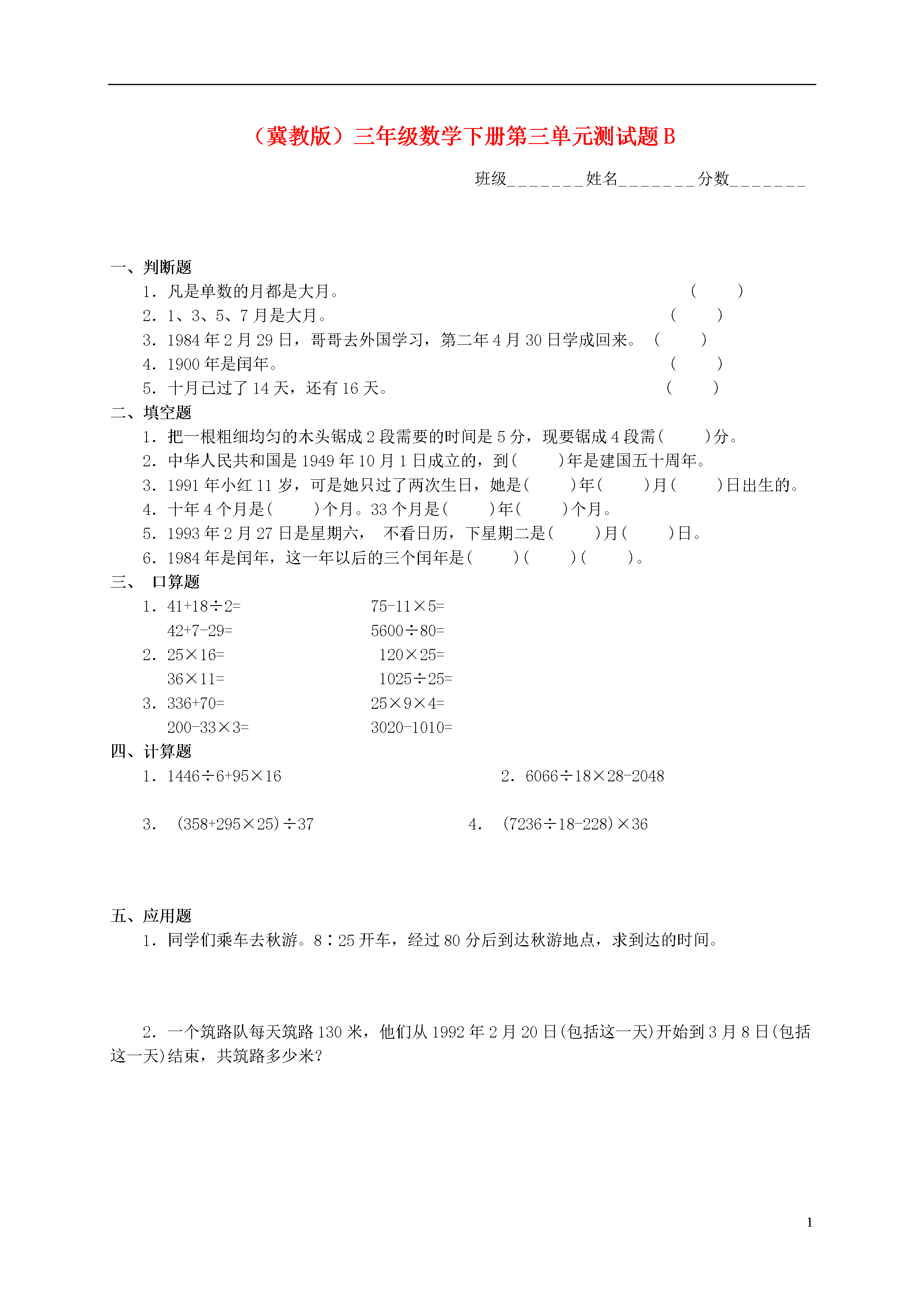 2(冀教版)三年级数学下册第三单元测试题B班级_______姓名_______分数_______一、判断题1.凡是单数的月都是大月。()2.1、3、5、7月是大月。()3.1984年2月29日,哥哥去外国学习,第二年4月30日学成回来。()4.1900年是闰年。()5.十月已过了14天,还有16天。()二、填空题1.把一根粗细均匀的木头锯成2段需要的时间是5分,现要锯成4段需()分。2.中华人民共和国是1949年10月1日成立的,到()年是建国五十周年。3.1991年小红11岁,可是她只过了两次生日,她是()年()月()日出生的。4.十年4个月是()个月。33个月是()年()个月。5.1993年2月27日是星期六,不看日历,下星期二是()月()日。6.1984年是闰年,这一年以后的三个闰年是()()()。三、口算题1.41+18÷2=75-11×5=42+7-29=5600÷80=2.25×16=120×25=36×11=1025÷25=3.336+70=25×9×4=200-33×3=3020-1010=四、计算题1.1446÷6+95×162.6066÷18×28-20483.(358+295×25)÷374.(7236÷18-228)×36五、应用题1.同学们乘车去秋游。8∶25开车,经过80分后到达秋游地点,求到达的时间。2.一个筑路队每天筑路130米,他们从1992年2月20日(包括这一天)开始到3月8日(包括这一天)结束,共筑路多少米?3.上海开往某地的火车,今天上午9∶30开车,第二天14∶40到达,路上经过了多少时间?4.美味餐厅的营业时间是从上午8时到晚上10时半,全天营业时间是多少?六、选作小李和小王每小时都可加工8个零件,小李上午6时开工,小王上午8时开工,做到什么时候,两人加工零件的总数达到80个?