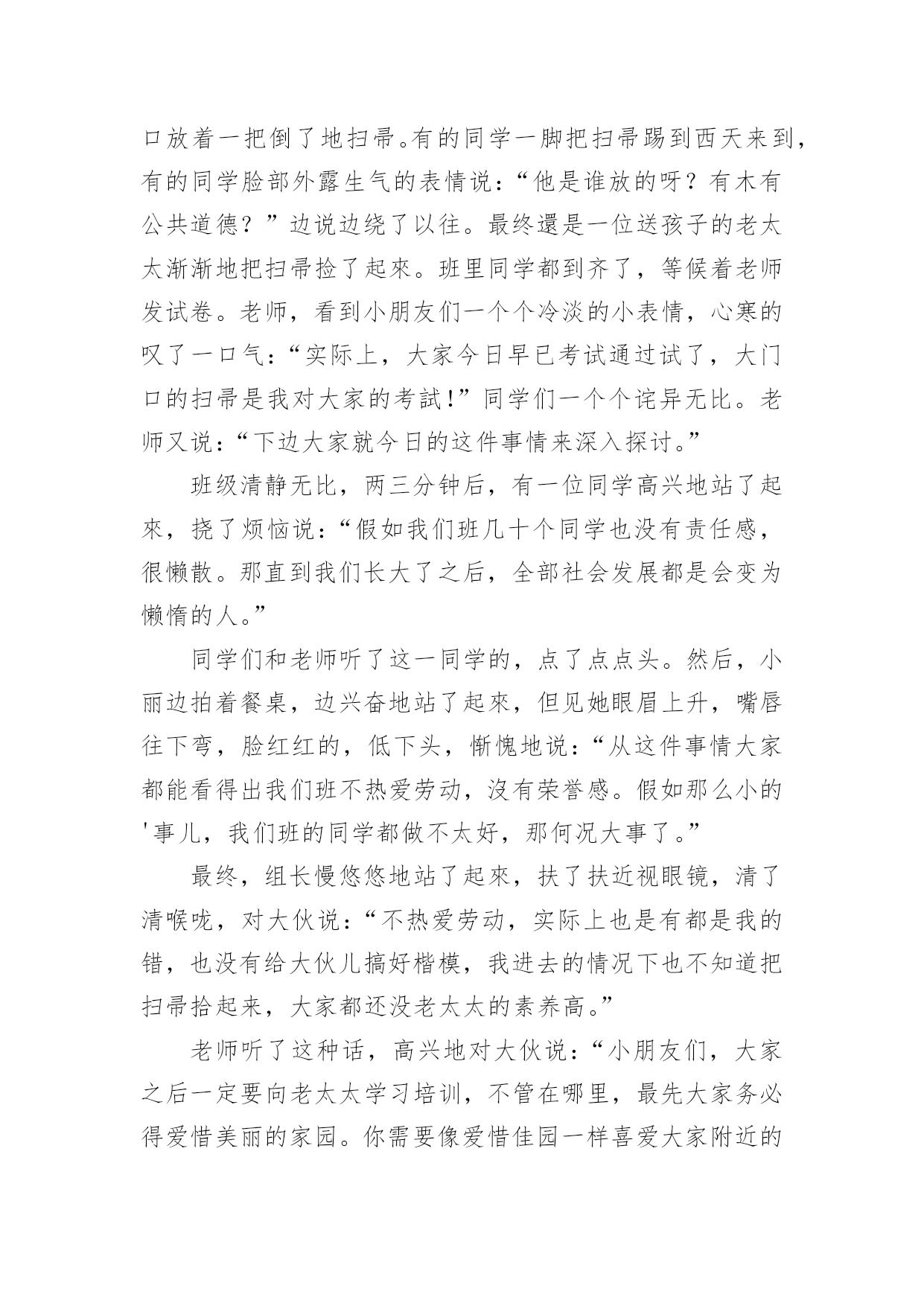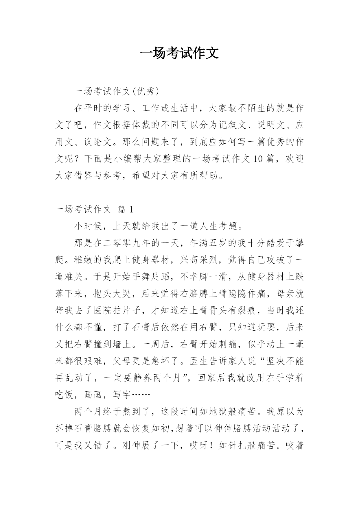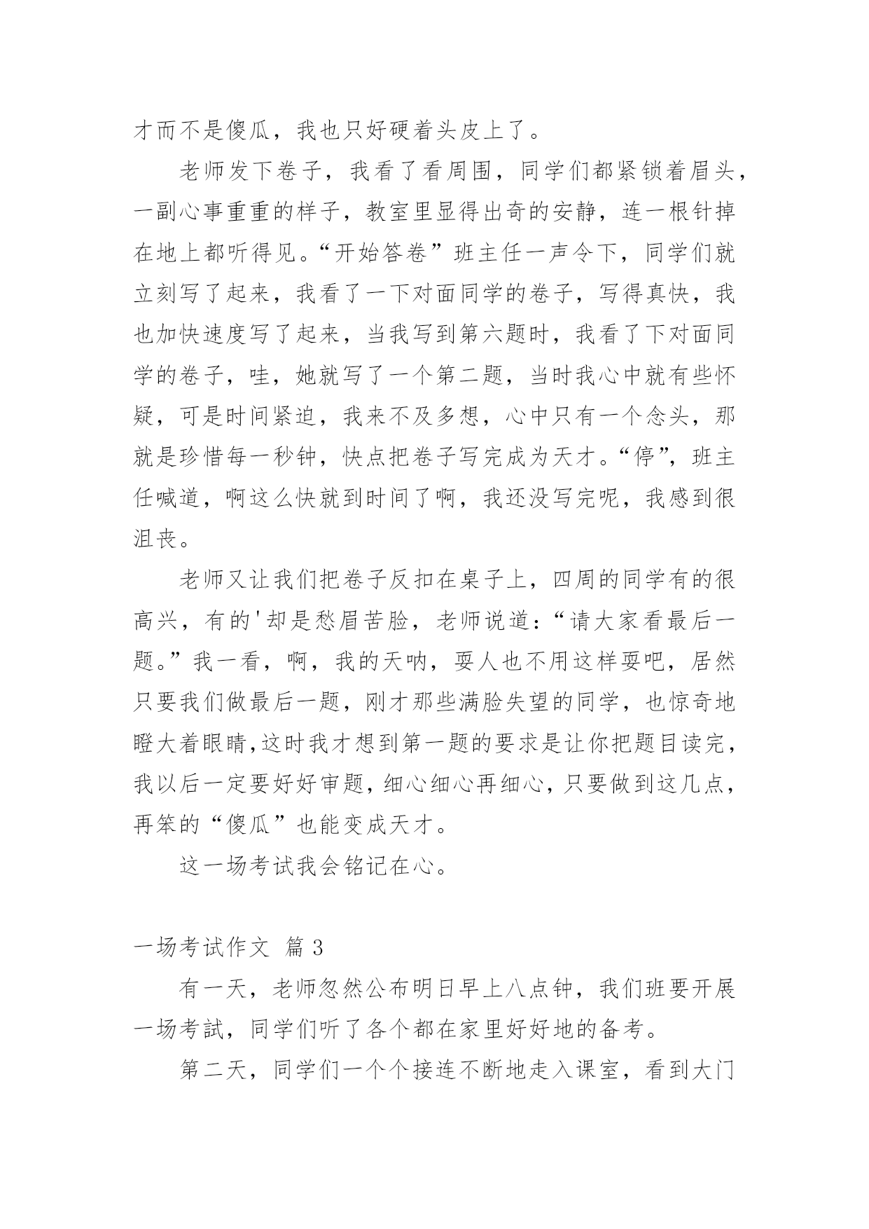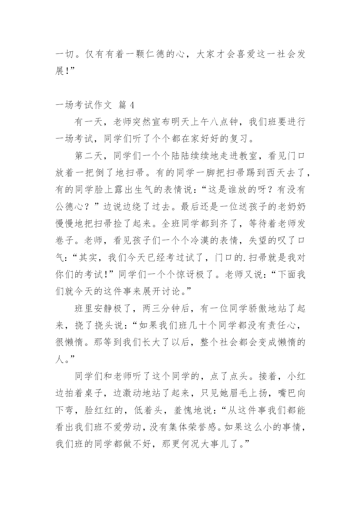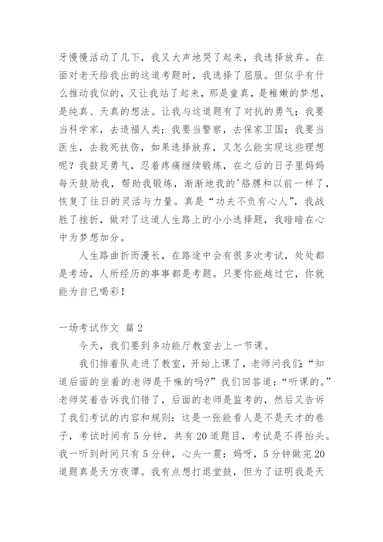 一场考试作文 一场考试作文(优秀)在平时的学习、工作或生活中,大家最不陌生的就是作文了吧,作文根据体裁的不同可以分为记叙文、说明文、应用文、议论文。那么问题来了,到底应如何写一篇优秀的作文呢?下面是小编帮大家整理的一场考试作文10篇,欢迎大家借鉴与参考,希望对大家有所帮助。一场考试作文篇1小时候,上天就给我出了一道人生考题。那是在二零零九年的一天,年满五岁的我十分酷爱于攀爬。稚嫩的我爬上健身器材,兴高采烈,觉得自己攻破了一道难关。于是开始手舞足蹈,不幸脚一滑,从健身器材上跌落下来,抱头大哭,后来觉得右胳膊上臂隐隐作痛,母亲就带我去了医院拍片子,才知道右上臂骨头有裂痕,当时我还什么都不懂,打了石膏后依然在用右臂,只知道玩耍,后来又把右臂撞到墙上。一周后,右臂开始刺痛,似乎动上一毫米都很艰难,父母更是急坏了。医生告诉家人说“坚决不能再乱动了,一定要静养两个月”,回家后我就改用左手学着吃饭,画画,写字……两个月终于熬到了,这段时间如地狱般痛苦。我原以为拆掉石膏胳膊就会恢复如初,想着可以伸伸胳膊活动活动了,可是我又错了。刚伸展了一下,哎呀!如针扎般痛苦。咬着牙慢慢活动了几下,我又大声地哭了起来,我选择放弃。在面对老天给我出的这道考题时,我选择了屈服。但似乎有什么推动我似的,又让我站了起来,那是童真,是稚嫩的梦想,是纯真、天真的想法。让我与这道题有了对抗的勇气;我要当科学家,去造福人类;我要当警察,去保家卫国;我要当医生,去救死扶伤,如果选择放弃,又怎么能实现这些理想呢?我鼓足勇气,忍着疼痛继续锻炼,在之后的日子里妈妈每天鼓励我,帮助我锻炼,渐渐地我的'胳膊和以前一样了,恢复了往日的灵活与力量。真是“功夫不负有心人”,我战胜了挫折,做对了这道人生路上的小小选择题,我暗暗在心中为梦想加分。人生路曲折而漫长,在路途中会有很多次考试,处处都是考场,人所经历的事事都是考题。只要你能越过它,你就能为自己喝彩!一场考试作文篇2今天,我们要到多功能厅教室去上一节课。我们排着队走进了教室,开始上课了,老师问我们:“知道后面的坐着的老师是干嘛的吗?”我们回答道:“听课的。”老师笑着告诉我们错了,后面的老师是监考的,然后又告诉了我们考试的内容和规则:这是一张能看人是不是天才的卷子,考试时间有5分钟,共有20道题目,考试是不得抬头。我一听到时间只有5分钟,心头一震:妈呀,5分钟做完20道题真是天方夜谭。我有点想打退堂鼓,但为了证明我是天才而不是傻瓜,我也只好硬着头皮上了。老师发下卷子,我看了看周围,同学们都紧锁着眉头,一副心事重重的样子,教室里显得出奇的安静,连一根针掉在地上都听得见。“开始答卷”班主任一声令下,同学们就立刻写了起来,我看了一下对面同学的卷子,写得真快,我也加快速度写了起来,当我写到第六题时,我看了下对面同学的卷子,哇,她就写了一个第二题,当时我心中就有些怀疑,可是时间紧迫,我来不及多想,心中只有一个念头,那就是珍惜每一秒钟,快点把卷子写完成为天才。“停”,班主任喊道,啊这么快就到时间了啊,我还没写完呢,我感到很沮丧。老师又让我们把卷子反扣在桌子上,四周的同学有的很高兴,有的'却是愁眉苦脸,老师说道:“请大家看最后一题。”我一看,啊,我的天呐,耍人也不用这样耍吧,居然只要我们做最后一题,刚才那些满脸失望的同学,也惊奇地瞪大着眼睛,这时我才想到第一题的要求是让你把题目读完,我以后一定要好好审题,细心细心再细心,只要做到这几点,再笨的“傻瓜”也能变成天才。这一场考试我会铭记在心。一场考试作文篇3有一天,老师忽然公布明日早上八点钟,我们班要开展一场考試,同学们听了各个都在家里好好地的备考。第二天,同学们一个个接连不断地走入课室,看到大门口放着一把倒了地扫帚。有的同学一脚把扫帚踢到西天来到,有的同学脸部外露生气的表情说:“他是谁放的呀?有木有公共道德?”边说边绕了以往。最终還是一位送孩子的老太太渐渐地把扫帚捡了起來。班里同学都到齐了,等候着老师发试卷。老师,看到小朋友们一个个冷淡的小表情,心寒的叹了一口气:“实际上,大家今日早已考试通过试了,大门口的扫帚是我对大家的考試!”同学们一个个诧异无比。老师又说:“下边大家就今日的这件事情来深入探讨。”班级清静无比,两三分钟后,有一位同学高兴地站了起來,挠了烦恼说:“假如我们班几十个同学也没有责任感,很懒散。那直到我们长大了之后,全部社会发展都是会变为懒惰的人。”同学们和老师听了这一同学的,点了点点头。然后,小丽边拍着餐桌,边兴奋地站了起來,但见她眼眉上升,嘴唇往下弯,脸红红的,低下头,惭愧地说:“从这件事情大家都能看得出我们班不热爱劳动,沒有荣誉感。假如那么小的'事儿,我们班的同学都做不太好,那何况大事了。”最终,组长慢悠悠地站了起來,扶了扶近视眼镜,清了清喉咙,对大伙说:“不热爱劳动,实际上也是有都是我