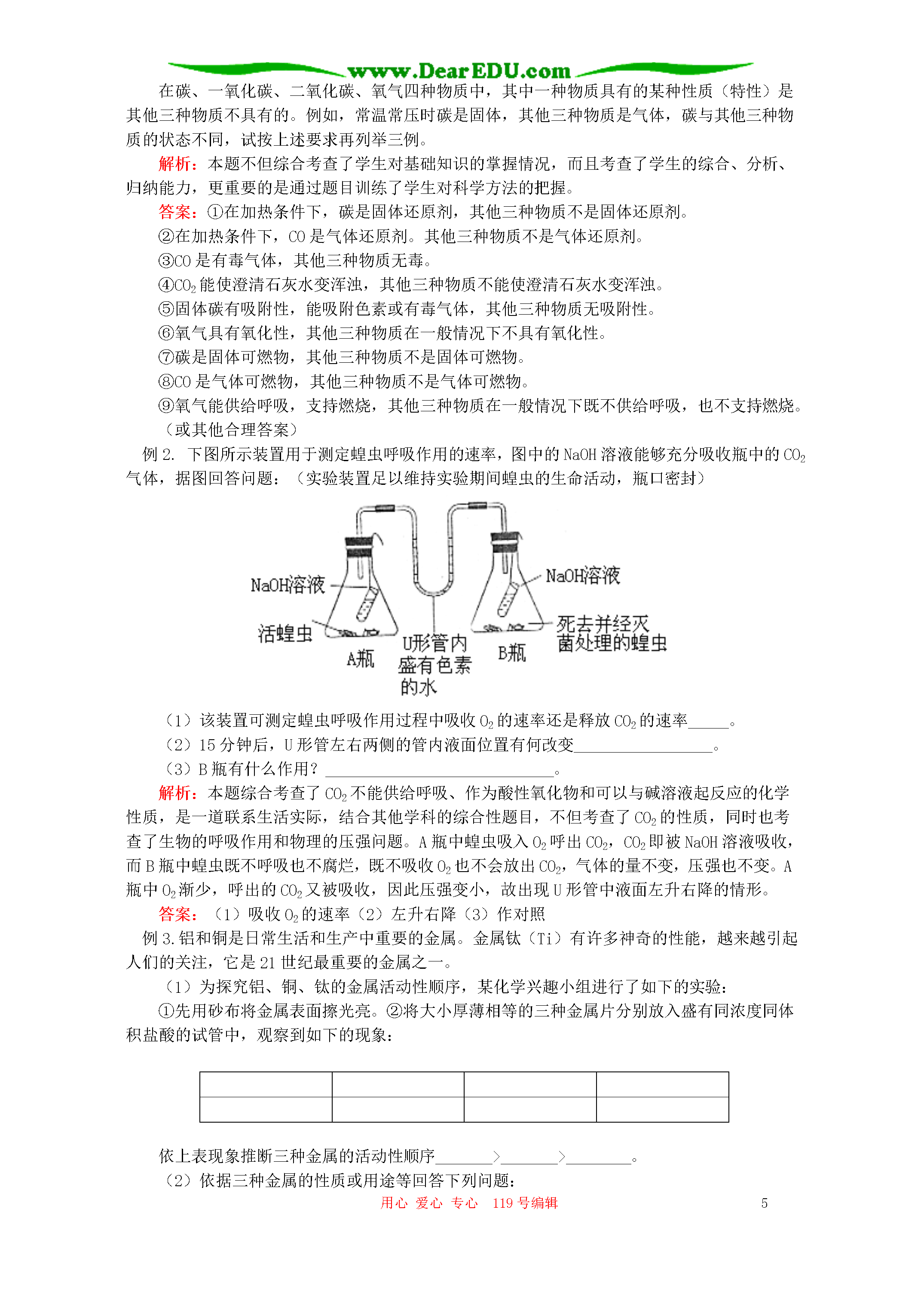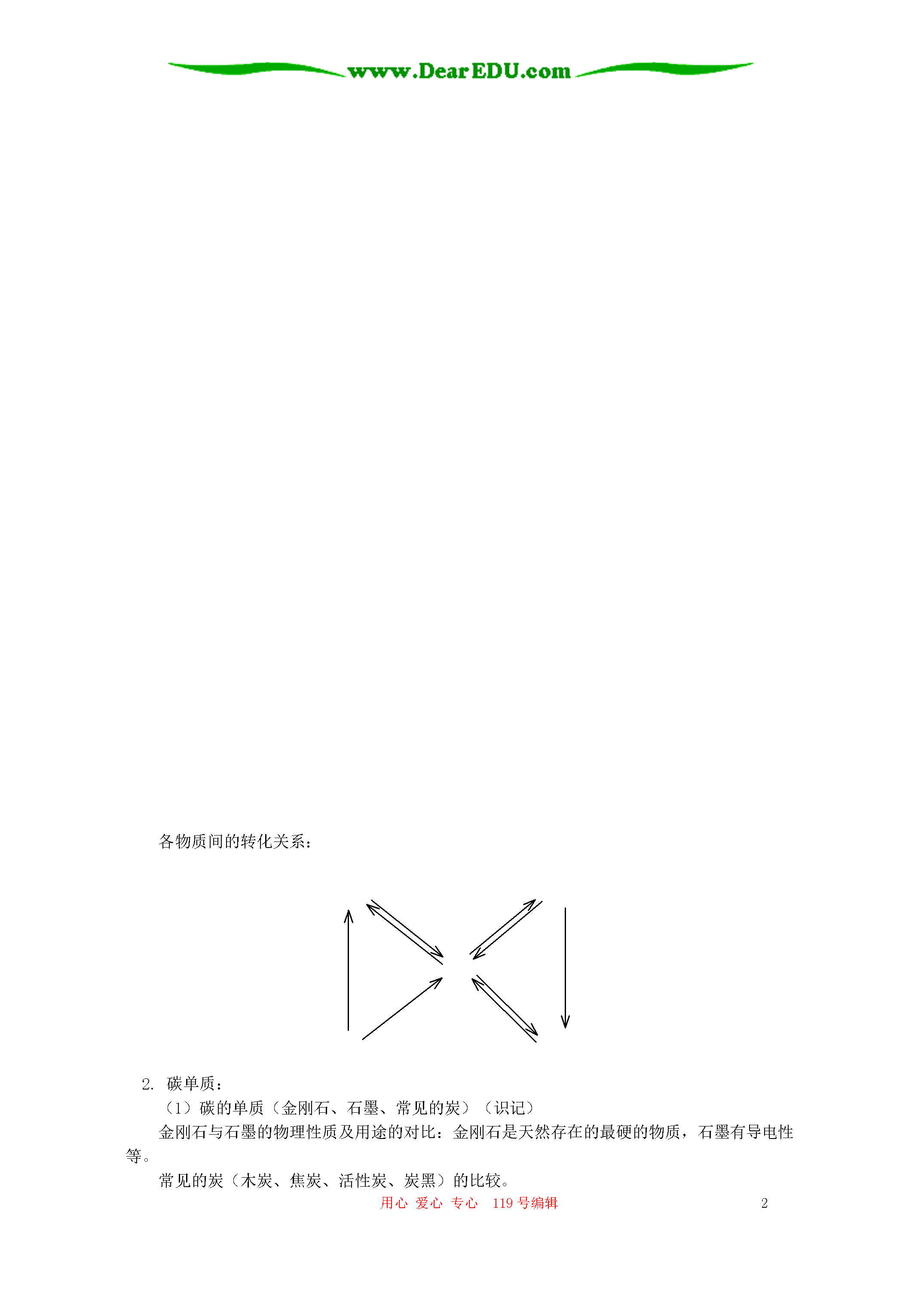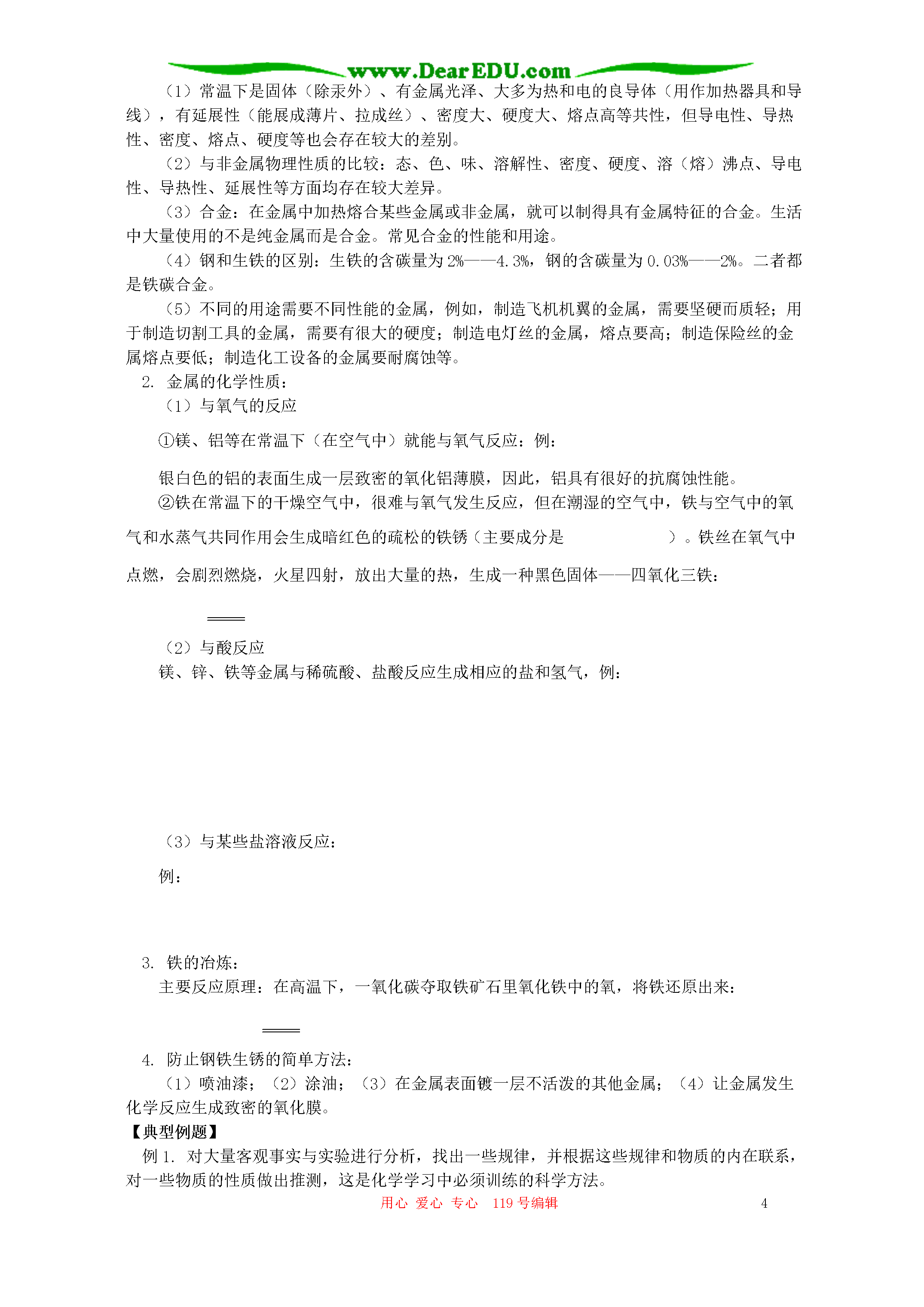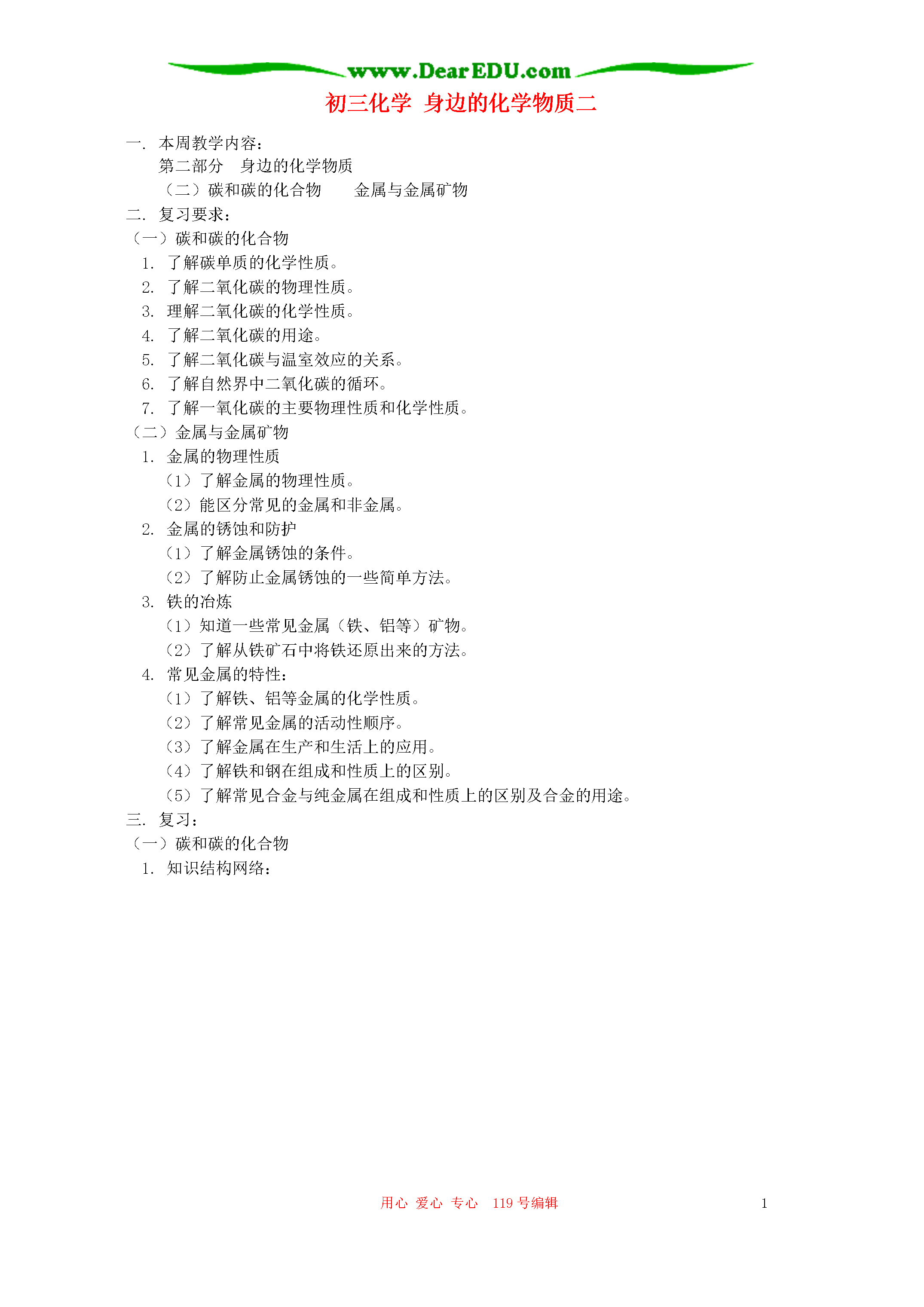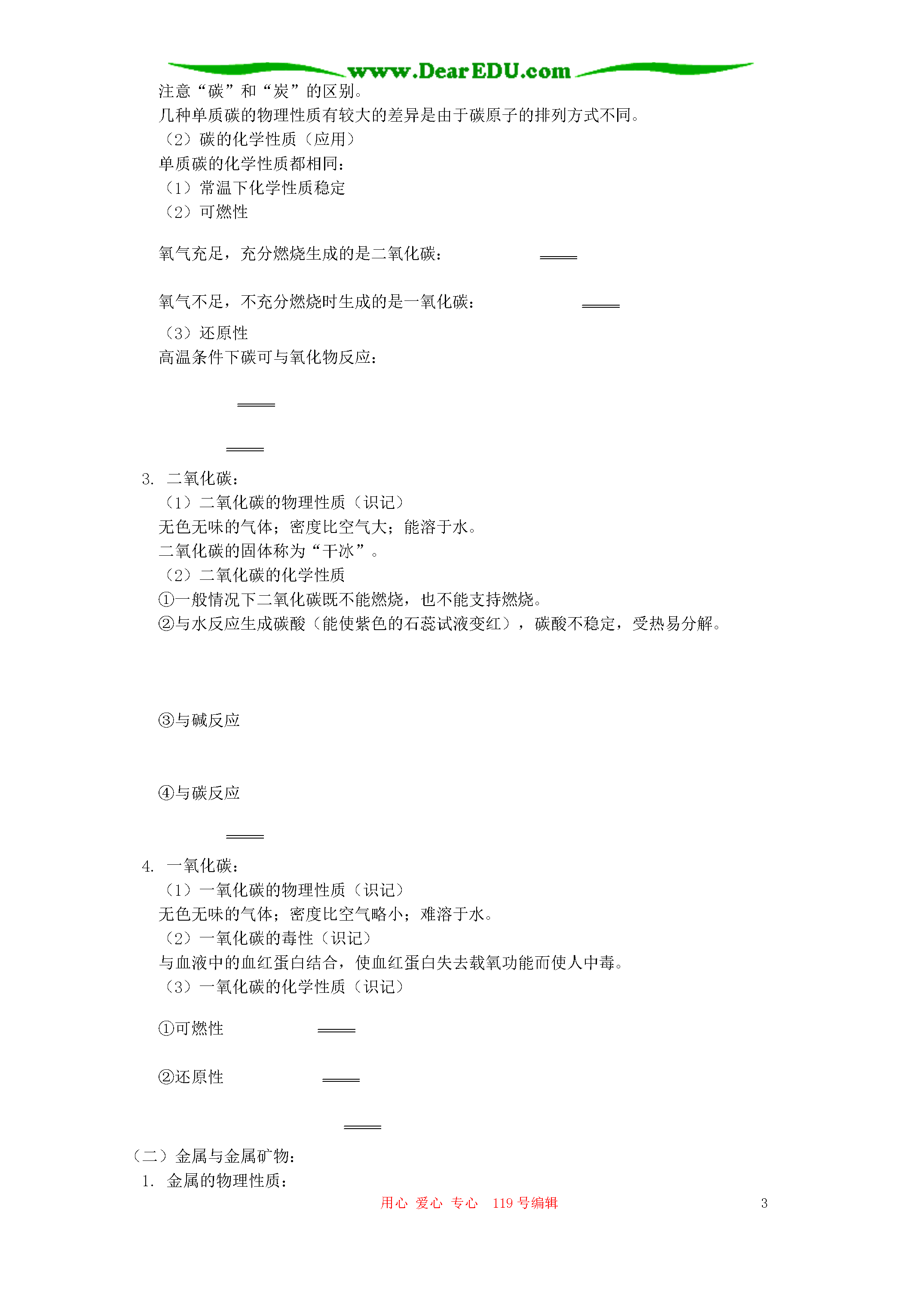 用心爱心专心119号编辑14初三化学身边的化学物质二一.本周教学内容:第二部分身边的化学物质(二)碳和碳的化合物金属与金属矿物二.复习要求:(一)碳和碳的化合物1.了解碳单质的化学性质。2.了解二氧化碳的物理性质。3.理解二氧化碳的化学性质。4.了解二氧化碳的用途。5.了解二氧化碳与温室效应的关系。6.了解自然界中二氧化碳的循环。7.了解一氧化碳的主要物理性质和化学性质。(二)金属与金属矿物1.金属的物理性质(1)了解金属的物理性质。(2)能区分常见的金属和非金属。2.金属的锈蚀和防护(1)了解金属锈蚀的条件。(2)了解防止金属锈蚀的一些简单方法。3.铁的冶炼(1)知道一些常见金属(铁、铝等)矿物。(2)了解从铁矿石中将铁还原出来的方法。4.常见金属的特性:(1)了解铁、铝等金属的化学性质。(2)了解常见金属的活动性顺序。(3)了解金属在生产和生活上的应用。(4)了解铁和钢在组成和性质上的区别。(5)了解常见合金与纯金属在组成和性质上的区别及合金的用途。三.复习:(一)碳和碳的化合物1.知识结构网络:各物质间的转化关系:2.碳单质:(1)碳的单质(金刚石、石墨、常见的炭)(识记)金刚石与石墨的物理性质及用途的对比:金刚石是天然存在的最硬的物质,石墨有导电性等。常见的炭(木炭、焦炭、活性炭、炭黑)的比较。注意“碳”和“炭”的区别。几种单质碳的物理性质有较大的差异是由于碳原子的排列方式不同。(2)碳的化学性质(应用)单质碳的化学性质都相同:(1)常温下化学性质稳定(2)可燃性氧气充足,充分燃烧生成的是二氧化碳:氧气不足,不充分燃烧时生成的是一氧化碳:(3)还原性高温条件下碳可与氧化物反应:3.二氧化碳:(1)二氧化碳的物理性质(识记)无色无味的气体;密度比空气大;能溶于水。二氧化碳的固体称为“干冰”。(2)二氧化碳的化学性质①一般情况下二氧化碳既不能燃烧,也不能支持燃烧。②与水反应生成碳酸(能使紫色的石蕊试液变红),碳酸不稳定,受热易分解。③与碱反应④与碳反应4.一氧化碳:(1)一氧化碳的物理性质(识记)无色无味的气体;密度比空气略小;难溶于水。(2)一氧化碳的毒性(识记)与血液中的血红蛋白结合,使血红蛋白失去载氧功能而使人中毒。(3)一氧化碳的化学性质(识记)①可燃性②还原性(二)金属与金属矿物:1.金属的物理性质:(1)常温下是固体(除汞外)、有金属光泽、大多为热和电的良导体(用作加热器具和导线),有延展性(能展成薄片、拉成丝)、密度大、硬度大、熔点高等共性,但导电性、导热性、密度、熔点、硬度等也会存在较大的差别。(2)与非金属物理性质的比较:态、色、味、溶解性、密度、硬度、溶(熔)沸点、导电性、导热性、延展性等方面均存在较大差异。(3)合金:在金属中加热熔合某些金属或非金属,就可以制得具有金属特征的合金。生活中大量使用的不是纯金属而是合金。常见合金的性能和用途。(4)钢和生铁的区别:生铁的含碳量为2%——4.3%,钢的含碳量为0.03%——2%。二者都是铁碳合金。(5)不同的用途需要不同性能的金属,例如,制造飞机机翼的金属,需要坚硬而质轻;用于制造切割工具的金属,需要有很大的硬度;制造电灯丝的金属,熔点要高;制造保险丝的金属熔点要低;制造化工设备的金属要耐腐蚀等。2.金属的化学性质:(1)与氧气的反应①镁、铝等在常温下(在空气中)就能与氧气反应:例:银白色的铝的表面生成一层致密的氧化铝薄膜,因此,铝具有很好的抗腐蚀性能。②铁在常温下的干燥空气中,很难与氧气发生反应,但在潮湿的空气中,铁与空气中的氧气和水蒸气共同作用会生成暗红色的疏松的铁锈(主要成分是)。铁丝在氧气中点燃,会剧烈燃烧,火星四射,放出大量的热,生成一种黑色固体——四氧化三铁:(2)与酸反应镁、锌、铁等金属与稀硫酸、盐酸反应生成相应的盐和氢气,例:(3)与某些盐溶液反应:例:3.铁的冶炼:主要反应原理:在高温下,一氧化碳夺取铁矿石里氧化铁中的氧,将铁还原出来:4.防止钢铁生锈的简单方法:(1)喷油漆;(2)涂油;(3)在金属表面镀一层不活泼的其他金属;(4)让金属发生化学反应生成致密的氧化膜。【典型例题】例1.对大量客观事实与实验进行分析,找出一些规律,并根据这些规律和物质的内在联系,对一些物质的性质做出推测,这是化学学习中必须训练的科学方法。在碳、一氧化碳、二氧化碳、氧气四种物质中,其中一种物质具有的某种性质(特性)是其他三种物质不具有的。例如,常温常压时碳是固体,其他三种物质是气体,碳与其他三种物质的状态不同,试按上述要求再列举三例。解析:本题不但综合考查了学生对基础知识的掌握情况,而且考查了学生的综合、分析、归纳能力,更重要的是通过题目训练了学生对科学方法的把握。答案:①在加热条件下,碳是固体还原剂,其他三种物质不是固体还原剂。②在加热条件下,CO是气体还原