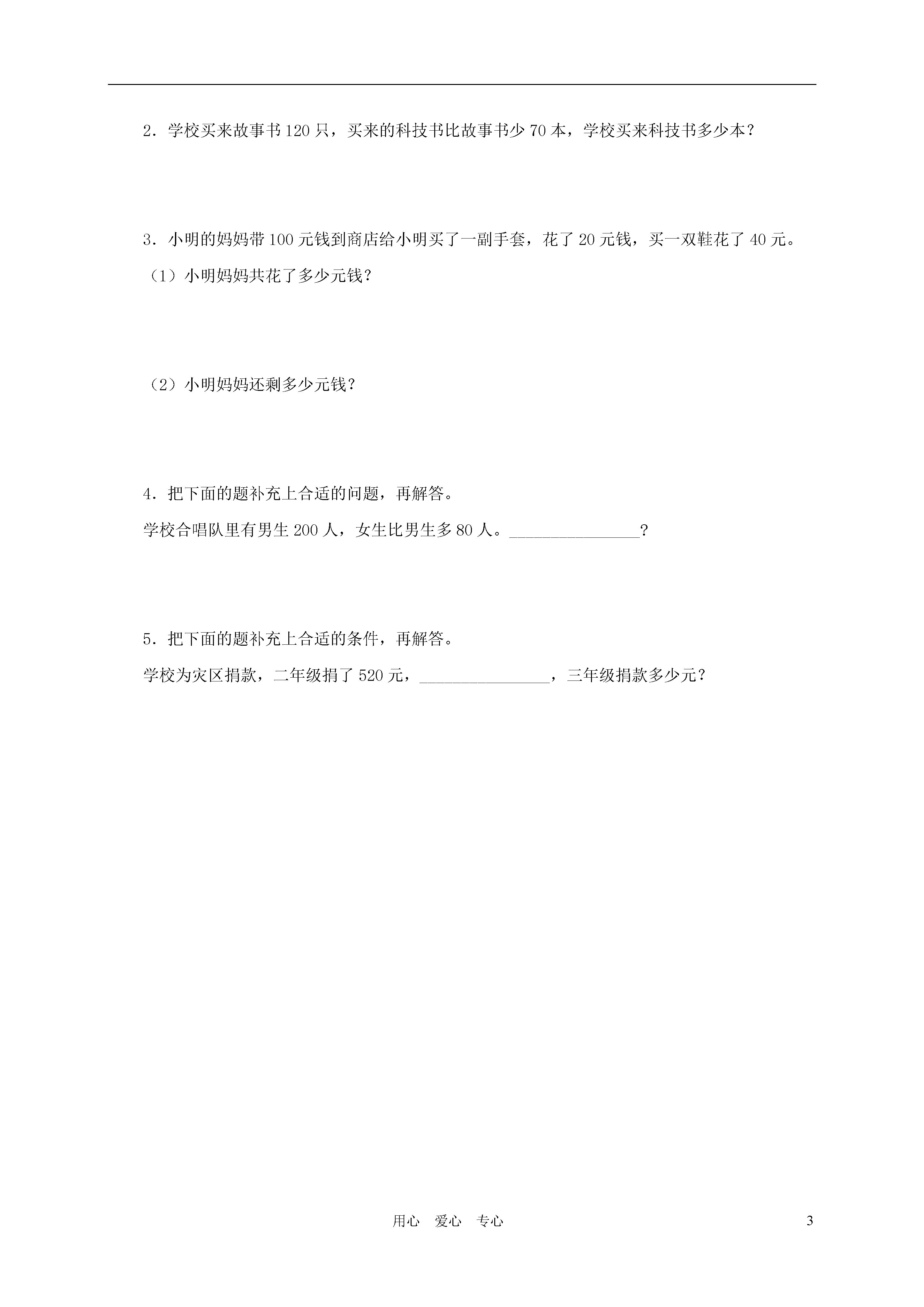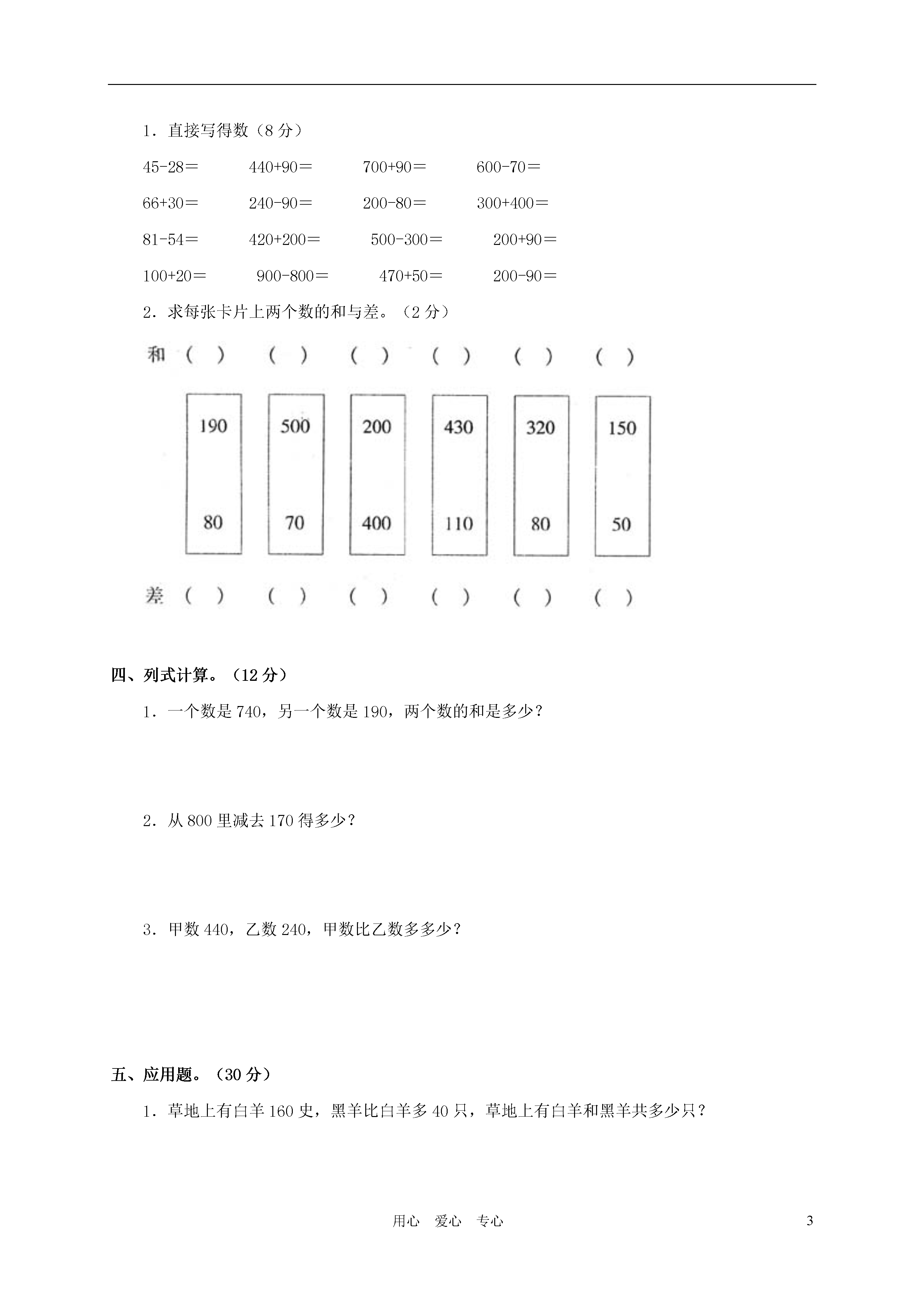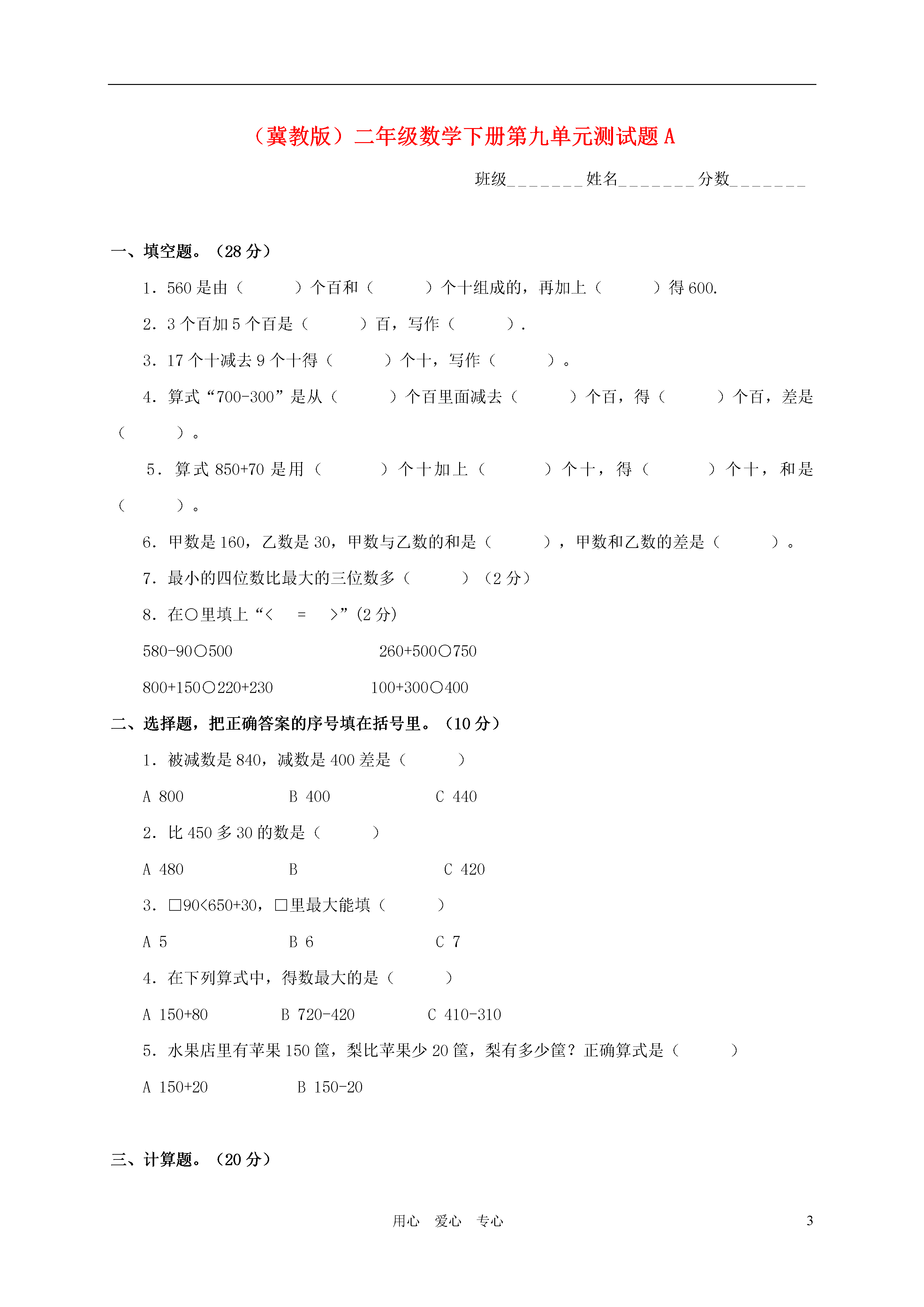 3用心爱心专心(冀教版)二年级数学下册第九单元测试题A班级_______姓名_______分数_______一、填空题。(28分)1.560是由()个百和()个十组成的,再加上()得600.2.3个百加5个百是()百,写作().3.17个十减去9个十得()个十,写作()。4.算式“700-300”是从()个百里面减去()个百,得()个百,差是()。5.算式850+70是用()个十加上()个十,得()个十,和是()。6.甲数是160,乙数是30,甲数与乙数的和是(),甲数和乙数的差是()。7.最小的四位数比最大的三位数多()(2分)8.在○里填上“<=>”(2分)580-90○500260+500○750800+150○220+230100+300○400二、选择题,把正确答案的序号填在括号里。(10分)1.被减数是840,减数是400差是()A800B400C4402.比450多30的数是()A480BC4203.□90<650+30,□里最大能填()A5B6C74.在下列算式中,得数最大的是()A150+80B720-420C410-3105.水果店里有苹果150筐,梨比苹果少20筐,梨有多少筐?正确算式是()A150+20B150-20三、计算题。(20分)1.直接写得数(8分)45-28=440+90=700+90=600-70=66+30=240-90=200-80=300+400=81-54=420+200=500-300=200+90=100+20=900-800=470+50=200-90=2.求每张卡片上两个数的和与差。(2分)四、列式计算。(12分)1.一个数是740,另一个数是190,两个数的和是多少?2.从800里减去170得多少?3.甲数440,乙数240,甲数比乙数多多少?五、应用题。(30分)1.草地上有白羊160史,黑羊比白羊多40只,草地上有白羊和黑羊共多少只?2.学校买来故事书120只,买来的科技书比故事书少70本,学校买来科技书多少本?3.小明的妈妈带100元钱到商店给小明买了一副手套,花了20元钱,买一双鞋花了40元。(1)小明妈妈共花了多少元钱?(2)小明妈妈还剩多少元钱?4.把下面的题补充上合适的问题,再解答。学校合唱队里有男生200人,女生比男生多80人。________________?5.把下面的题补充上合适的条件,再解答。学校为灾区捐款,二年级捐了520元,________________,三年级捐款多少元?