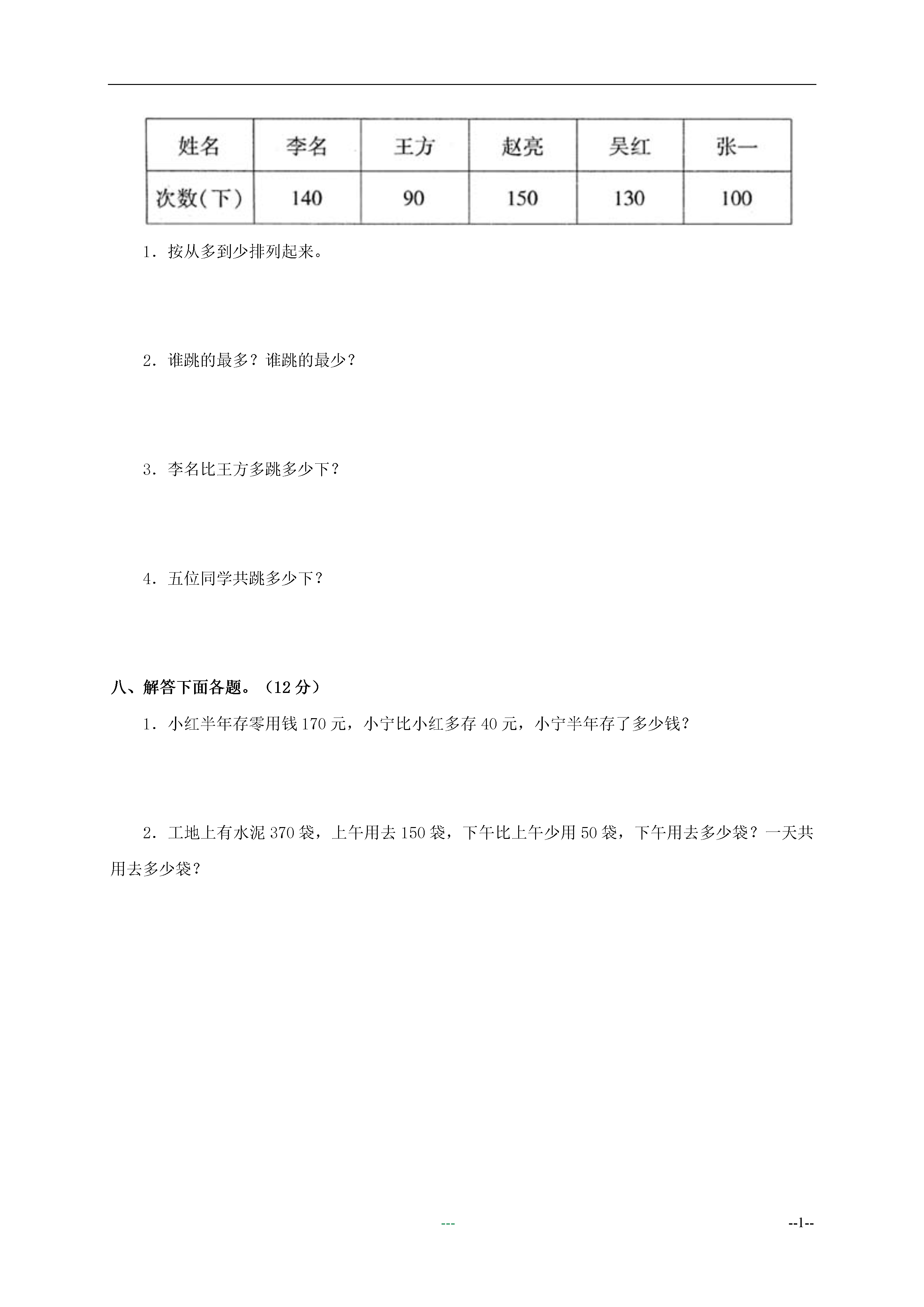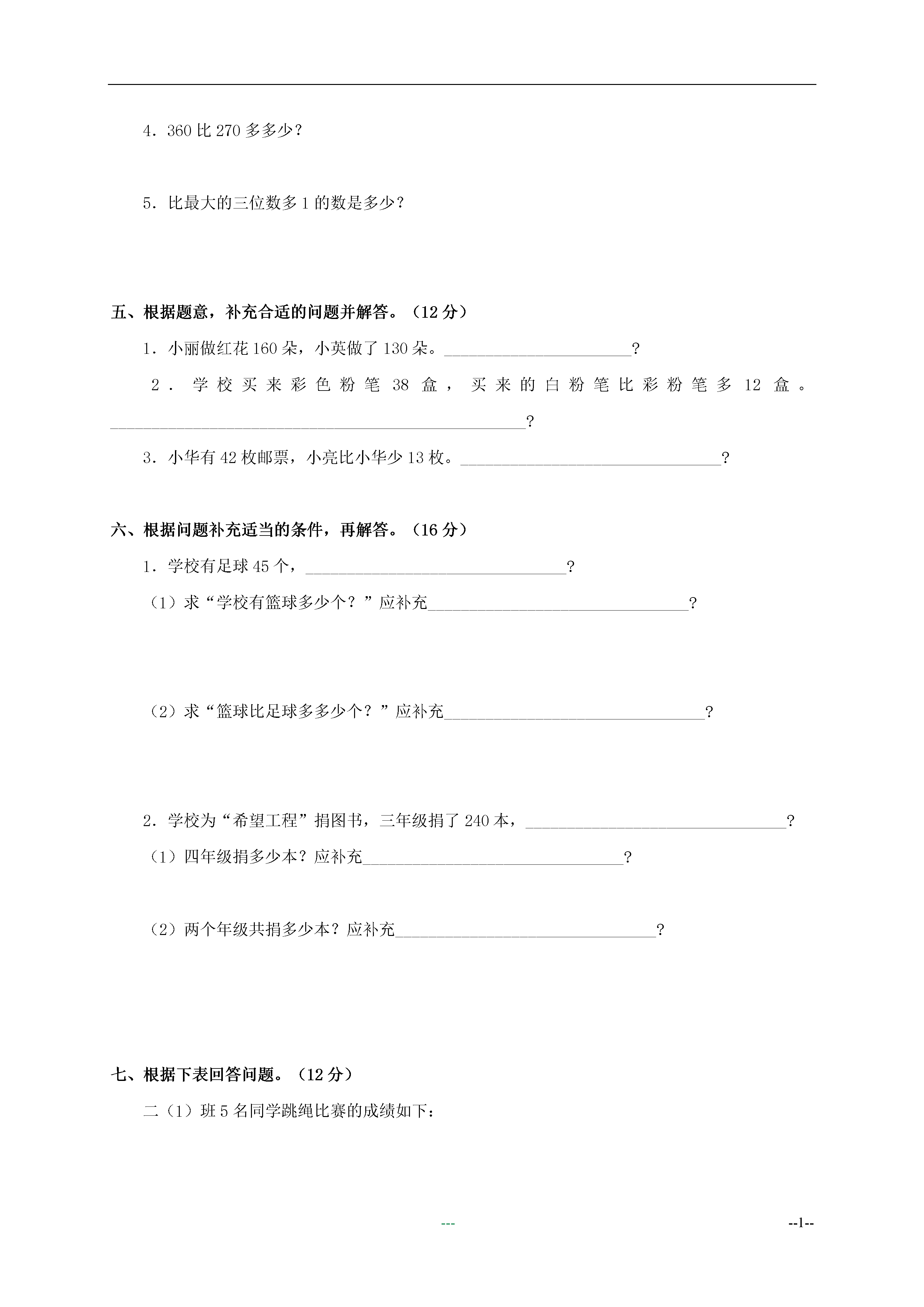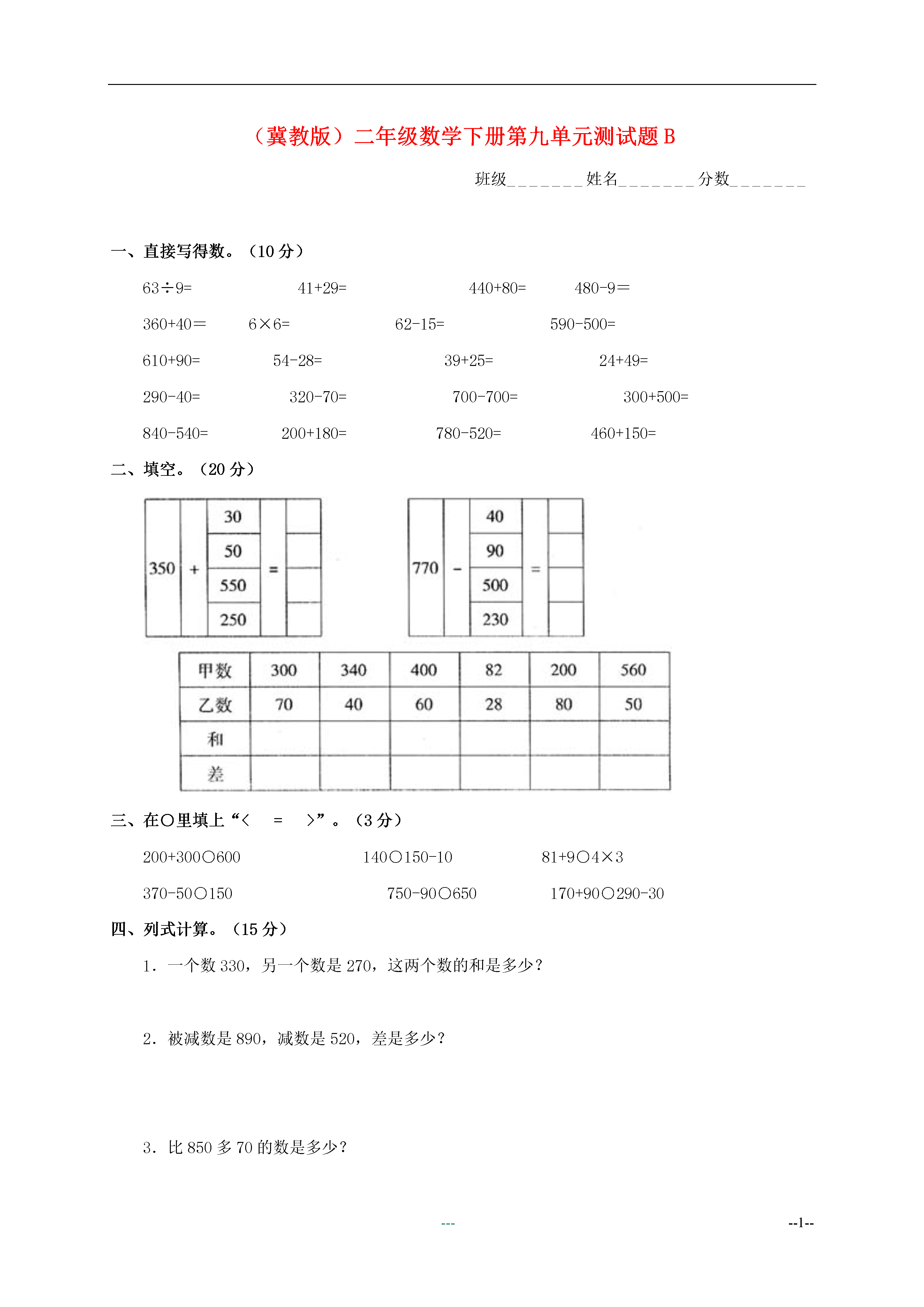 --1-----(冀教版)二年级数学下册第九单元测试题B班级_______姓名_______分数_______一、直接写得数。(10分)63÷9=41+29=440+80=480-9=360+40=6×6=62-15=590-500=610+90=54-28=39+25=24+49=290-40=320-70=700-700=300+500=840-540=200+180=780-520=460+150=二、填空。(20分)三、在○里填上“<=>”。(3分)200+300○600140○150-1081+9○4×3370-50○150750-90○650170+90○290-30四、列式计算。(15分)1.一个数330,另一个数是270,这两个数的和是多少?2.被减数是890,减数是520,差是多少?3.比850多70的数是多少?4.360比270多多少?5.比最大的三位数多1的数是多少?五、根据题意,补充合适的问题并解答。(12分)1.小丽做红花160朵,小英做了130朵。_______________________?2.学校买来彩色粉笔38盒,买来的白粉笔比彩粉笔多12盒。___________________________________________________?3.小华有42枚邮票,小亮比小华少13枚。________________________________?六、根据问题补充适当的条件,再解答。(16分)1.学校有足球45个,________________________________?(1)求“学校有篮球多少个?”应补充________________________________?(2)求“篮球比足球多多少个?”应补充________________________________?2.学校为“希望工程”捐图书,三年级捐了240本,________________________________?(1)四年级捐多少本?应补充________________________________?(2)两个年级共捐多少本?应补充________________________________?七、根据下表回答问题。(12分)二(1)班5名同学跳绳比赛的成绩如下:1.按从多到少排列起来。2.谁跳的最多?谁跳的最少?3.李名比王方多跳多少下?4.五位同学共跳多少下?八、解答下面各题。(12分)1.小红半年存零用钱170元,小宁比小红多存40元,小宁半年存了多少钱?2.工地上有水泥370袋,上午用去150袋,下午比上午少用50袋,下午用去多少袋?一天共用去多少袋?