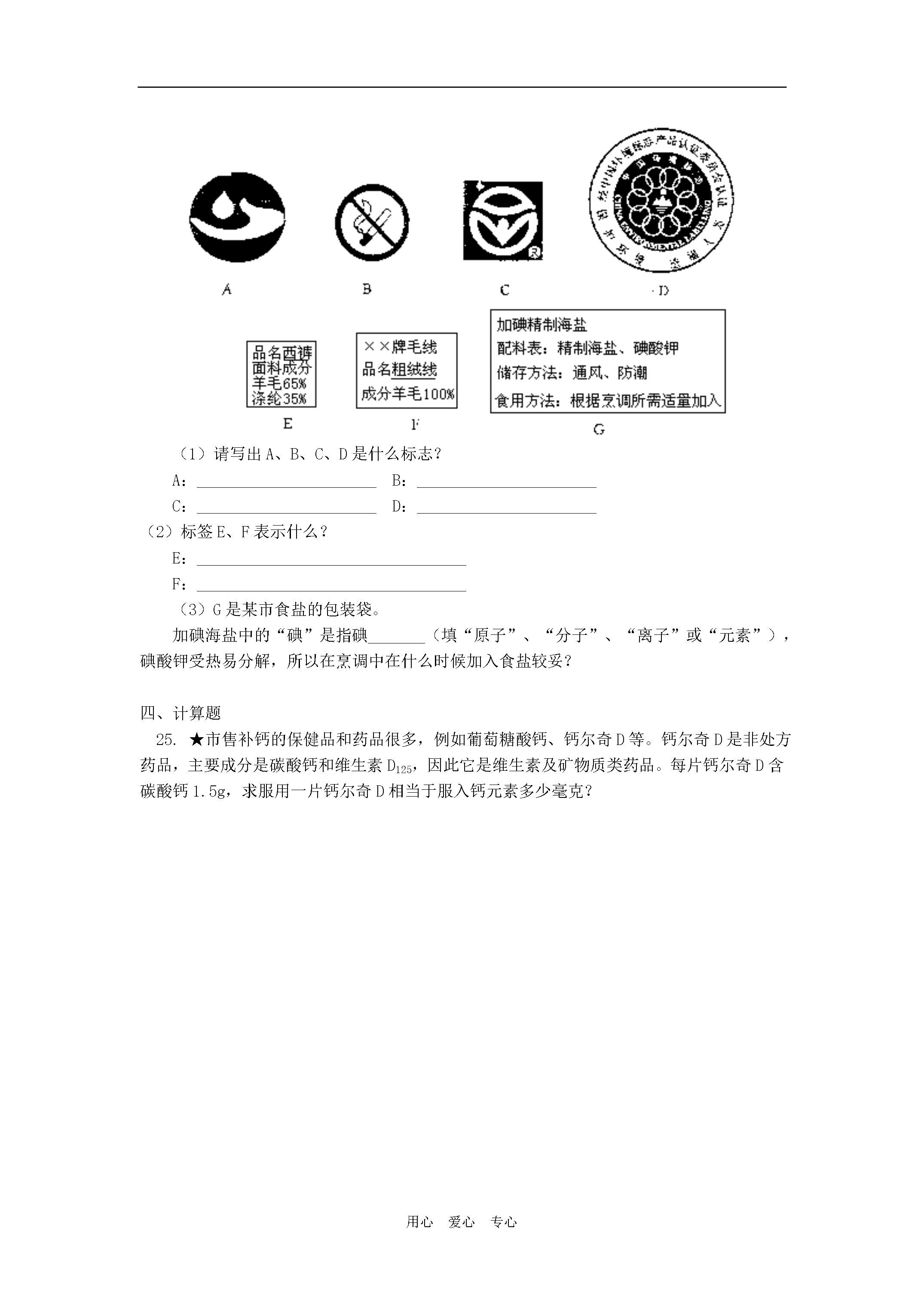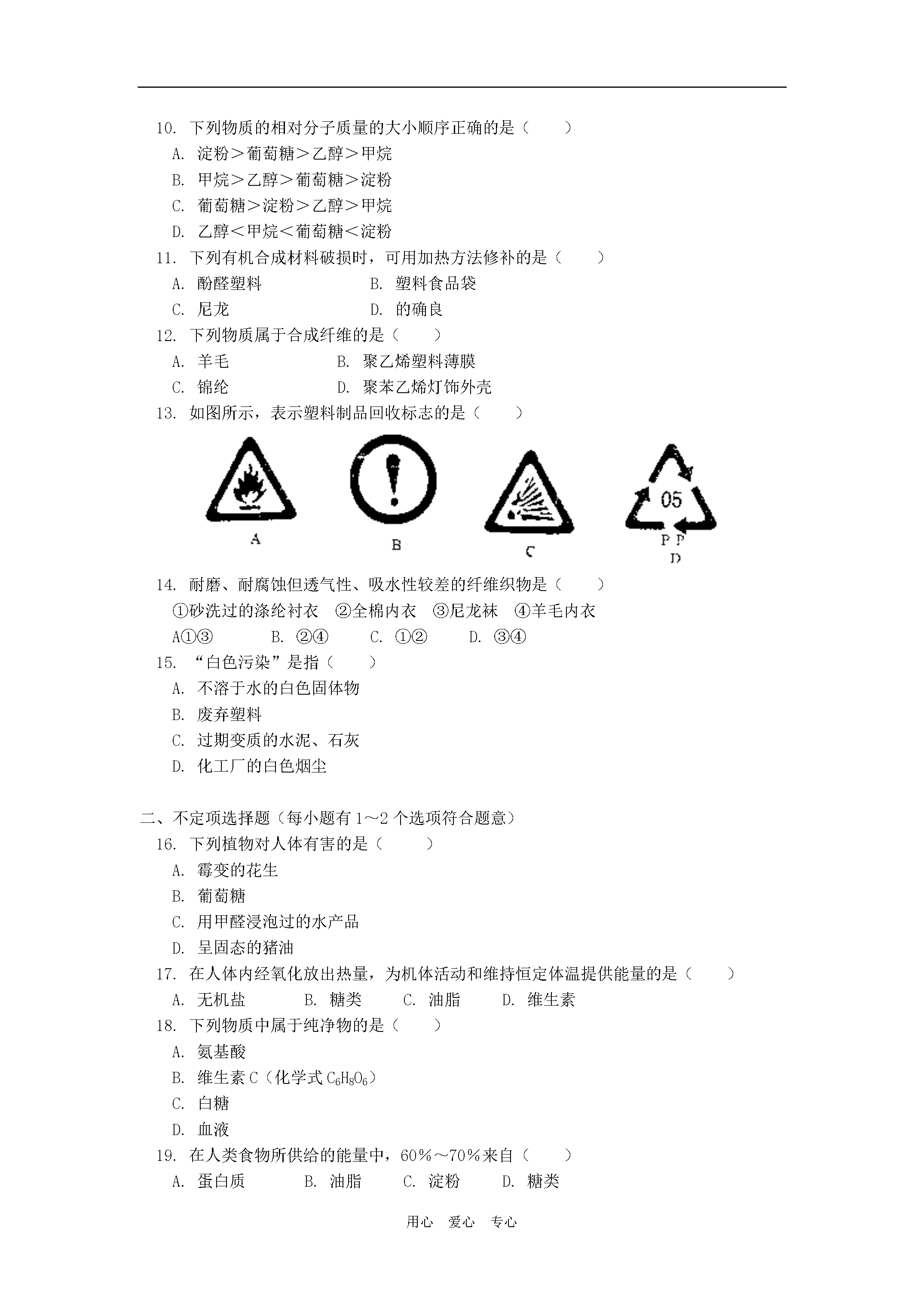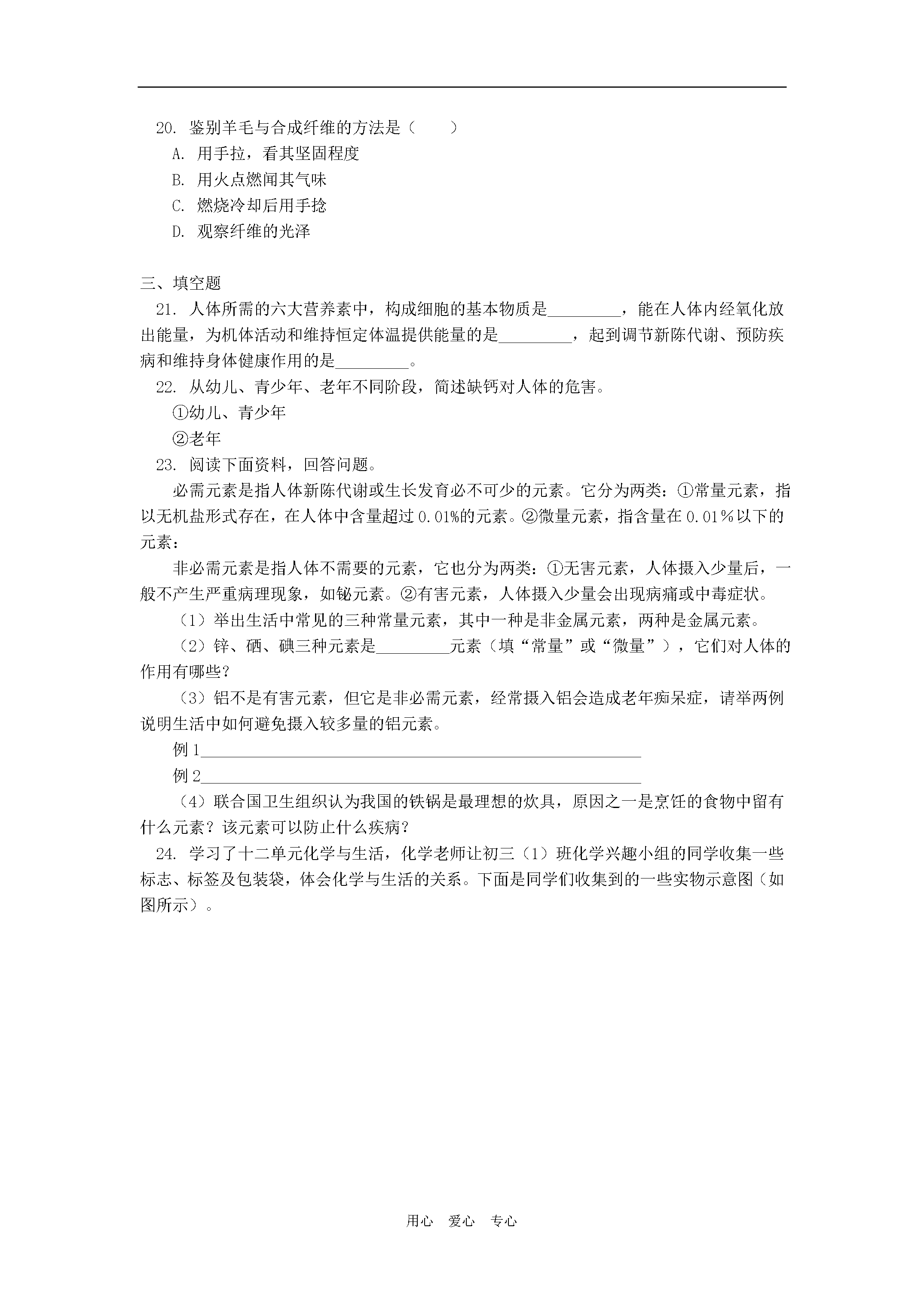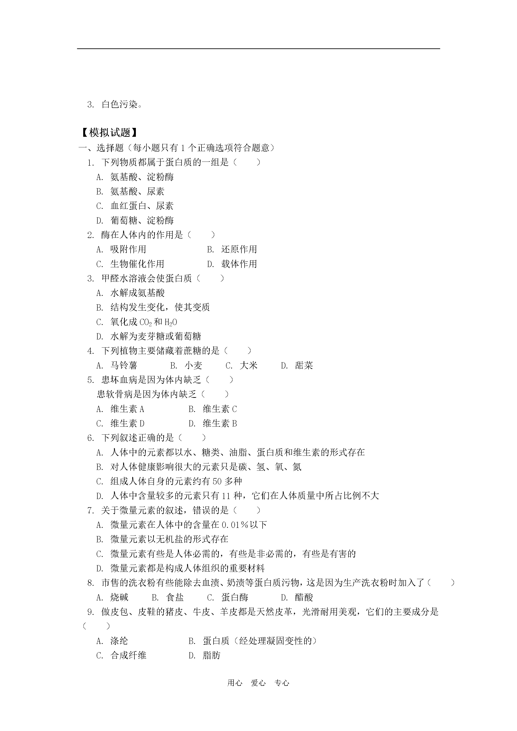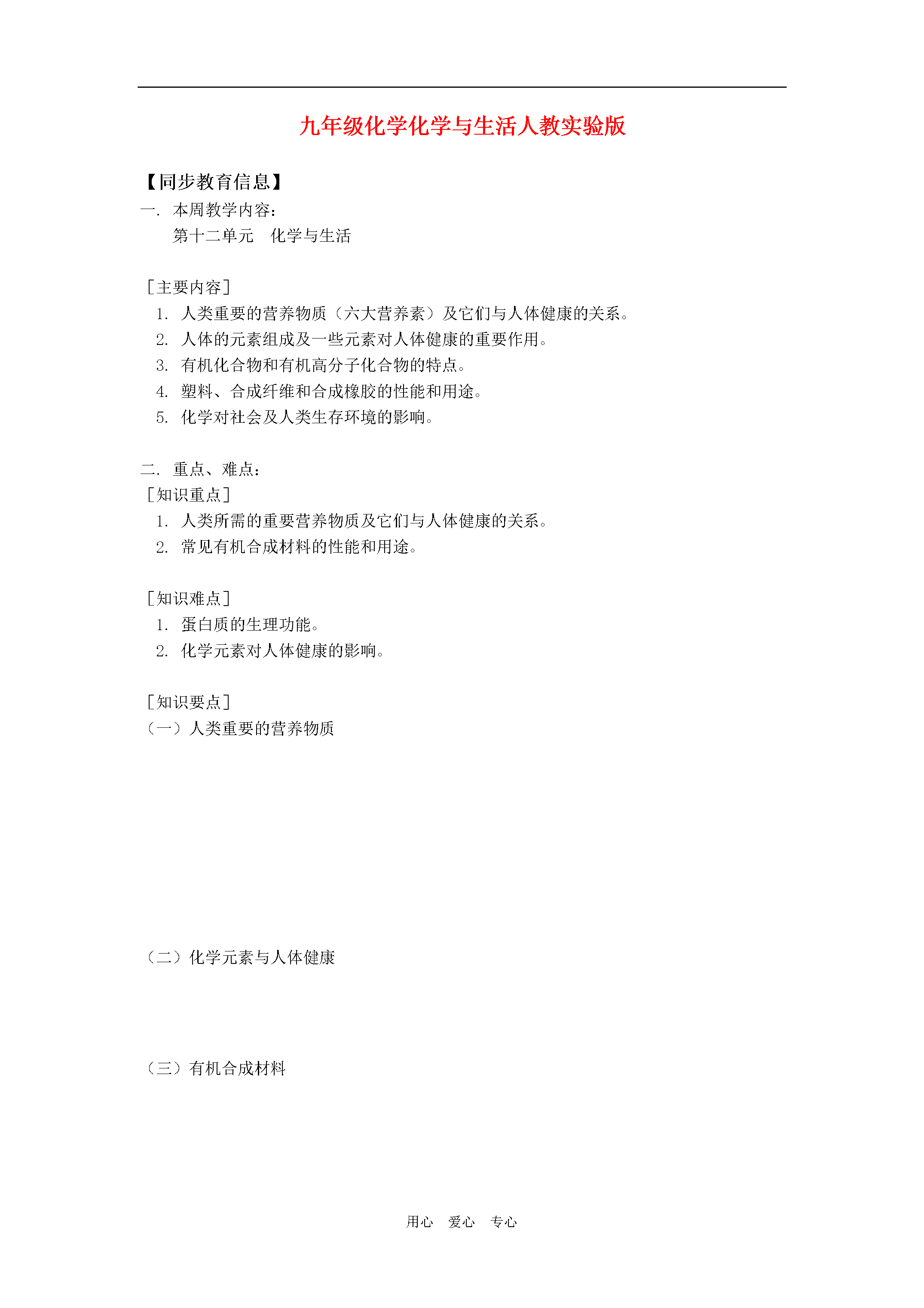 用心爱心专心九年级化学化学与生活人教实验版【同步教育信息】一.本周教学内容:第十二单元化学与生活[主要内容]1.人类重要的营养物质(六大营养素)及它们与人体健康的关系。2.人体的元素组成及一些元素对人体健康的重要作用。3.有机化合物和有机高分子化合物的特点。4.塑料、合成纤维和合成橡胶的性能和用途。5.化学对社会及人类生存环境的影响。二.重点、难点:[知识重点]1.人类所需的重要营养物质及它们与人体健康的关系。2.常见有机合成材料的性能和用途。[知识难点]1.蛋白质的生理功能。2.化学元素对人体健康的影响。[知识要点](一)人类重要的营养物质(二)化学元素与人体健康(三)有机合成材料3.白色污染。【模拟试题】一、选择题(每小题只有1个正确选项符合题意)1.下列物质都属于蛋白质的一组是()A.氨基酸、淀粉酶B.氨基酸、尿素C.血红蛋白、尿素D.葡萄糖、淀粉酶2.酶在人体内的作用是()A.吸附作用B.还原作用C.生物催化作用D.载体作用3.甲醛水溶液会使蛋白质()A.水解成氨基酸B.结构发生变化,使其变质C.氧化成CO2和H2OD.水解为麦芽糖或葡萄糖4.下列植物主要储藏着蔗糖的是()A.马铃薯B.小麦C.大米D.甜菜5.患坏血病是因为体内缺乏()患软骨病是因为体内缺乏()A.维生素AB.维生素CC.维生素DD.维生素B6.下列叙述正确的是()A.人体中的元素都以水、糖类、油脂、蛋白质和维生素的形式存在B.对人体健康影响很大的元素只是碳、氢、氧、氮C.组成人体自身的元素约有50多种D.人体中含量较多的元素只有11种,它们在人体质量中所占比例不大7.关于微量元素的叙述,错误的是()A.微量元素在人体中的含量在0.01%以下B.微量元素以无机盐的形式存在C.微量元素有些是人体必需的,有些是非必需的,有些是有害的D.微量元素都是构成人体组织的重要材料8.市售的洗衣粉有些能除去血渍、奶渍等蛋白质污物,这是因为生产洗衣粉时加入了()A.烧碱B.食盐C.蛋白酶D.醋酸9.做皮包、皮鞋的猪皮、牛皮、羊皮都是天然皮革,光滑耐用美观,它们的主要成分是()A.涤纶B.蛋白质(经处理凝固变性的)C.合成纤维D.脂肪10.下列物质的相对分子质量的大小顺序正确的是()A.淀粉>葡萄糖>乙醇>甲烷B.甲烷>乙醇>葡萄糖>淀粉C.葡萄糖>淀粉>乙醇>甲烷D.乙醇<甲烷<葡萄糖<淀粉11.下列有机合成材料破损时,可用加热方法修补的是()A.酚醛塑料B.塑料食品袋C.尼龙D.的确良12.下列物质属于合成纤维的是()A.羊毛B.聚乙烯塑料薄膜C.锦纶D.聚苯乙烯灯饰外壳13.如图所示,表示塑料制品回收标志的是()14.耐磨、耐腐蚀但透气性、吸水性较差的纤维织物是()①砂洗过的涤纶衬衣②全棉内衣③尼龙袜④羊毛内衣A①③B.②④C.①②D.③④15.“白色污染”是指()A.不溶于水的白色固体物B.废弃塑料C.过期变质的水泥、石灰D.化工厂的白色烟尘二、不定项选择题(每小题有1~2个选项符合题意)16.下列植物对人体有害的是()A.霉变的花生B.葡萄糖C.用甲醛浸泡过的水产品D.呈固态的猪油17.在人体内经氧化放出热量,为机体活动和维持恒定体温提供能量的是()A.无机盐B.糖类C.油脂D.维生素18.下列物质中属于纯净物的是()A.氨基酸B.维生素C(化学式C6H8O6)C.白糖D.血液19.在人类食物所供给的能量中,60%~70%来自()A.蛋白质B.油脂C.淀粉D.糖类20.鉴别羊毛与合成纤维的方法是()A.用手拉,看其坚固程度B.用火点燃闻其气味C.燃烧冷却后用手捻D.观察纤维的光泽三、填空题21.人体所需的六大营养素中,构成细胞的基本物质是_________,能在人体内经氧化放出能量,为机体活动和维持恒定体温提供能量的是_________,起到调节新陈代谢、预防疾病和维持身体健康作用的是_________。22.从幼儿、青少年、老年不同阶段,简述缺钙对人体的危害。①幼儿、青少年②老年23.阅读下面资料,回答问题。必需元素是指人体新陈代谢或生长发育必不可少的元素。它分为两类:①常量元素,指以无机盐形式存在,在人体中含量超过0.01%的元素。②微量元素,指含量在0.01%以下的元素:非必需元素是指人体不需要的元素,它也分为两类:①无害元素,人体摄入少量后,一般不产生严重病理现象,如铋元素。②有害元素,人体摄入少量会出现病痛或中毒症状。(1)举出生活中常见的三种常量元素,其中一种是非金属元素,两种是金属元素。(2)锌、硒、碘三种元素是_________元素(填“常量”或“微量”),它们对人体的作用有哪些?(3)铝不是有害元素,但它是非必需元素,经常摄入铝会造成老年痴呆症,请举两例说明生活中如何避免摄入较多量的铝元素。例1_________________________